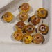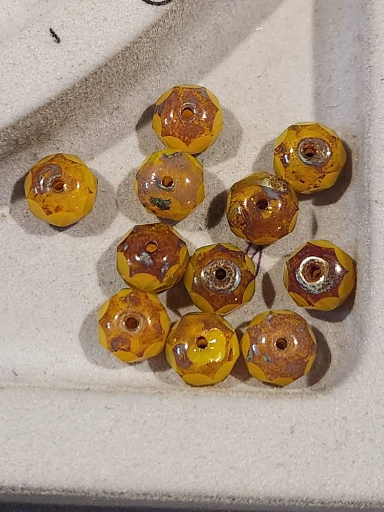 Yellow opaline glass mix with an earthy brown Picasso finish. Super crisp fire polished facets.