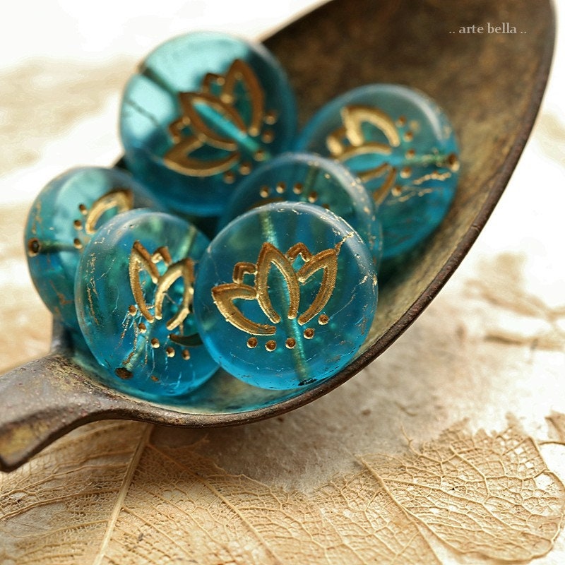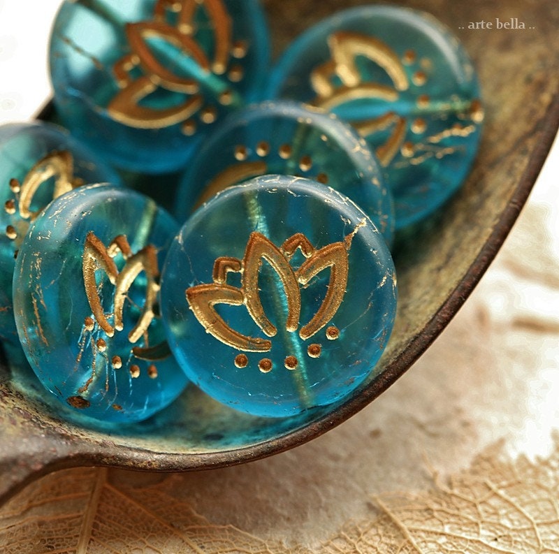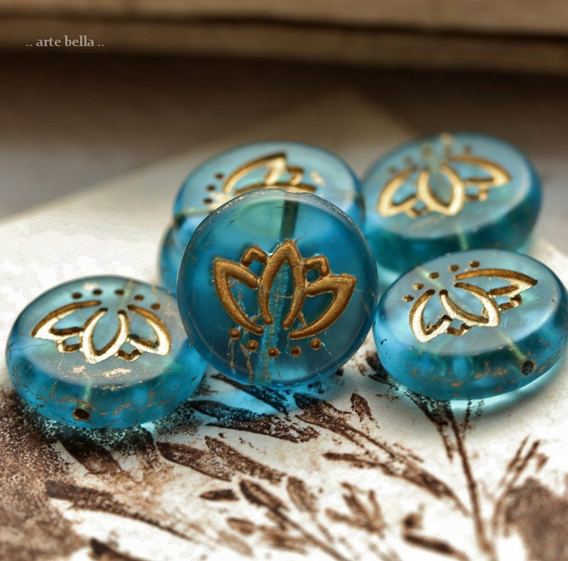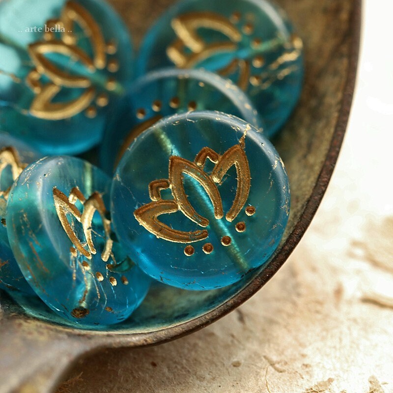 GOLDEN AQUA LOTUS Blooms .. 6 Premium Czech Matte Glass Lotus Coin Beads 14mm (8883-6) .. jewelry supplies