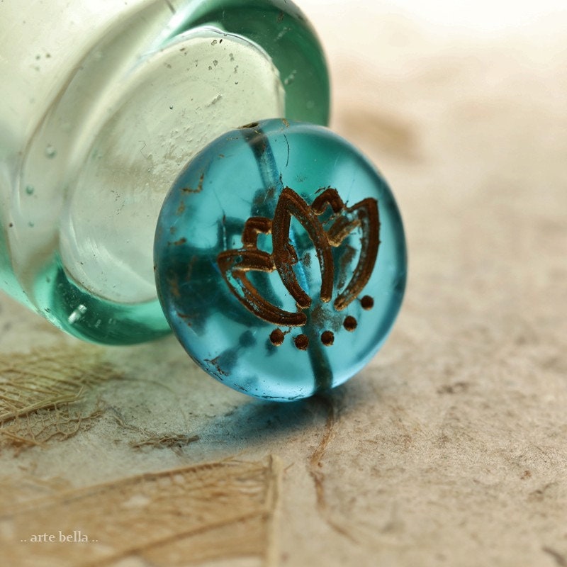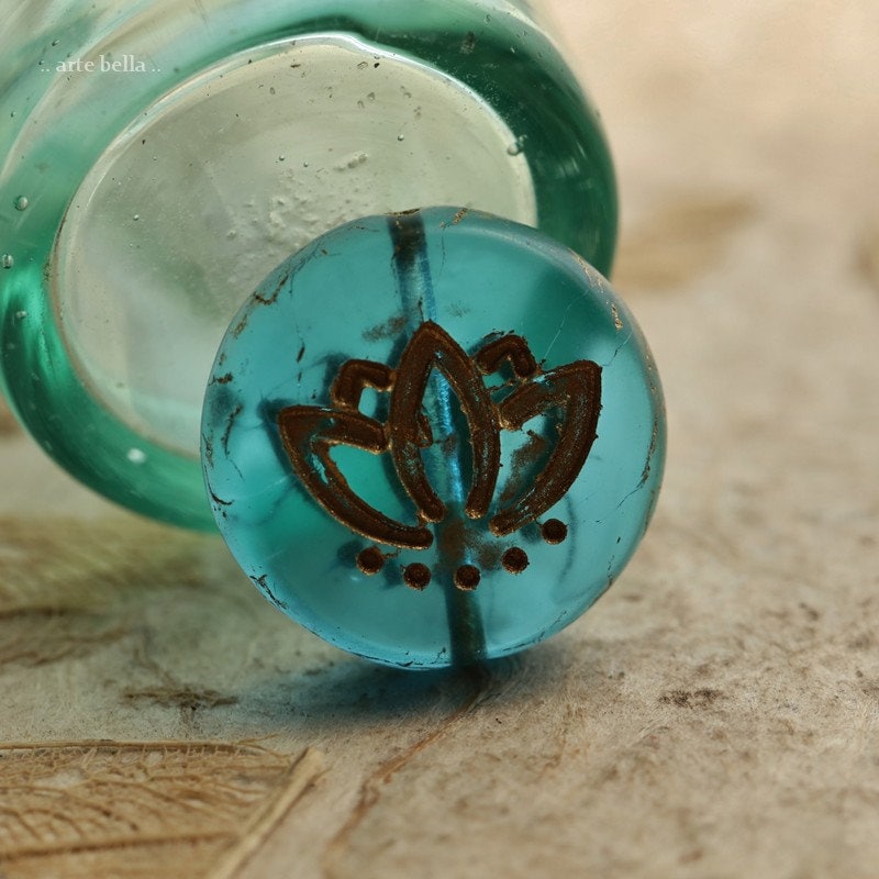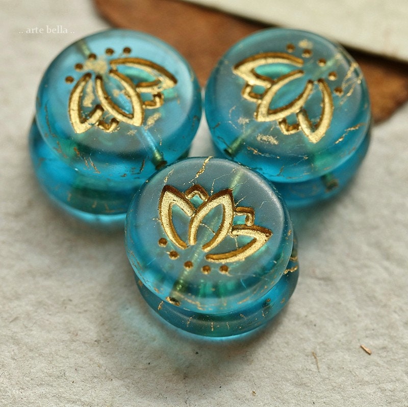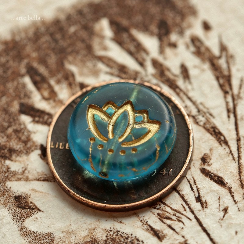 Petite carved lotus coin beads in a matte dark aqua blue glass with a golden metallic wash.
