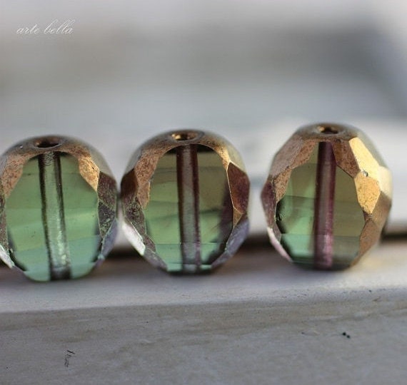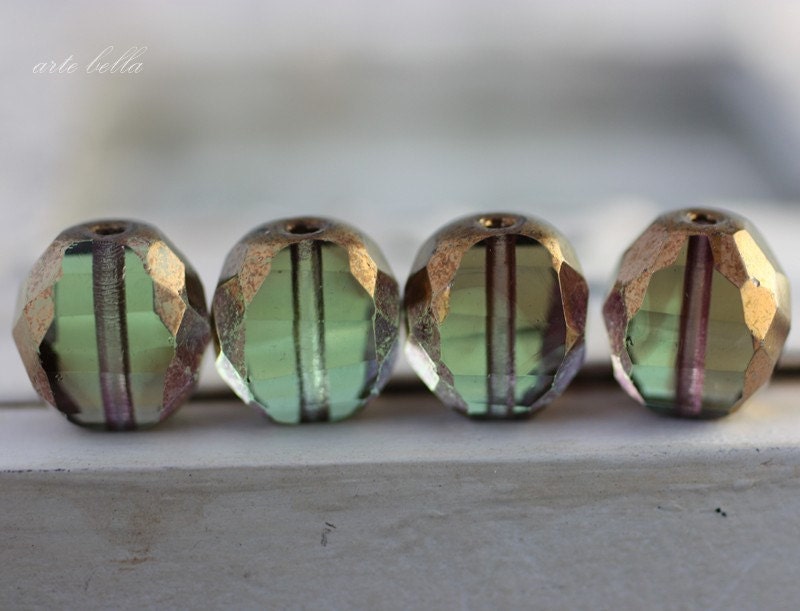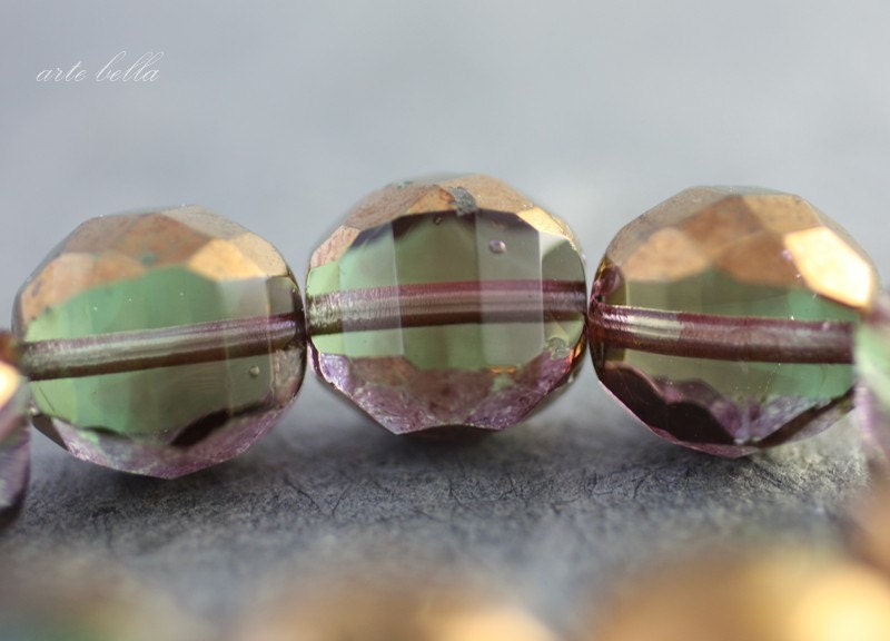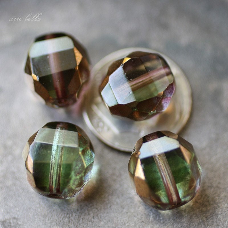 Gorgeous wintergreen and muted plum glass with bronze plum metallic luster Picasso finish, super crisp facets give these lots of sparkle. If you look closely at my pictures, you can see the subtle color variations, gorgeous!!!!