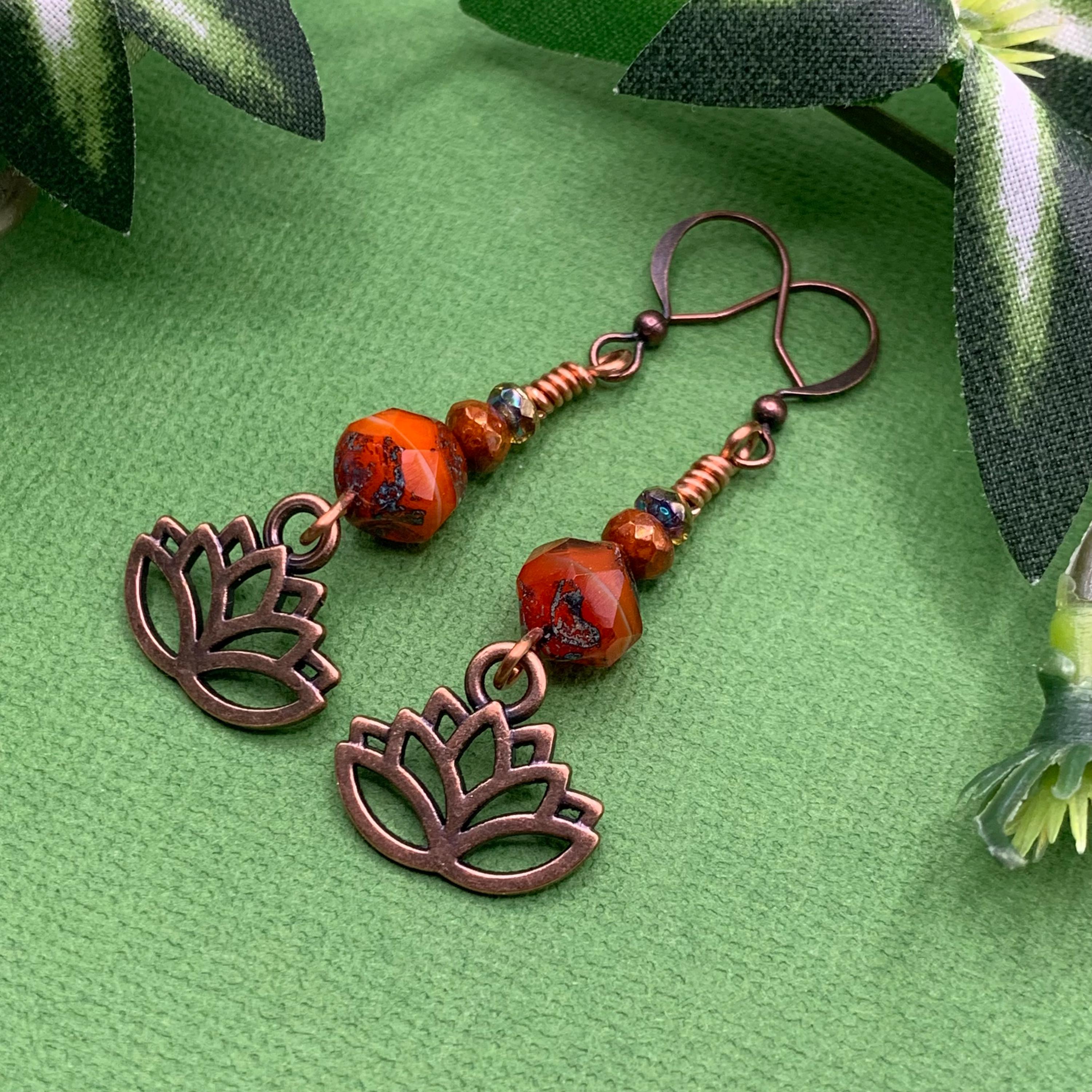 Gorgeous translucent deep orange red and opaque white glass mix with an earthy Picasso finish, fire polished facets.