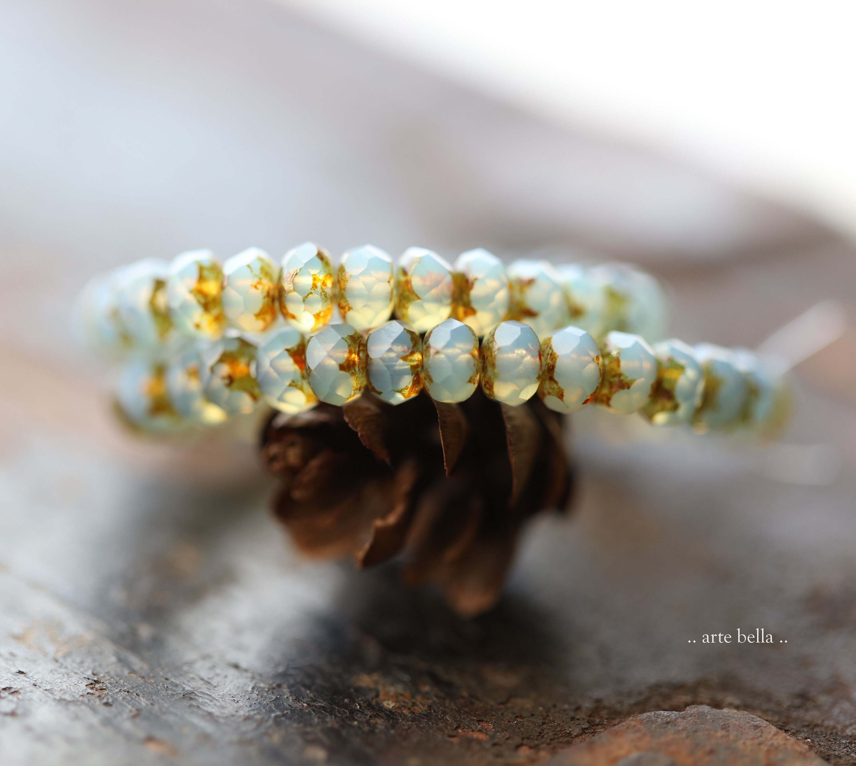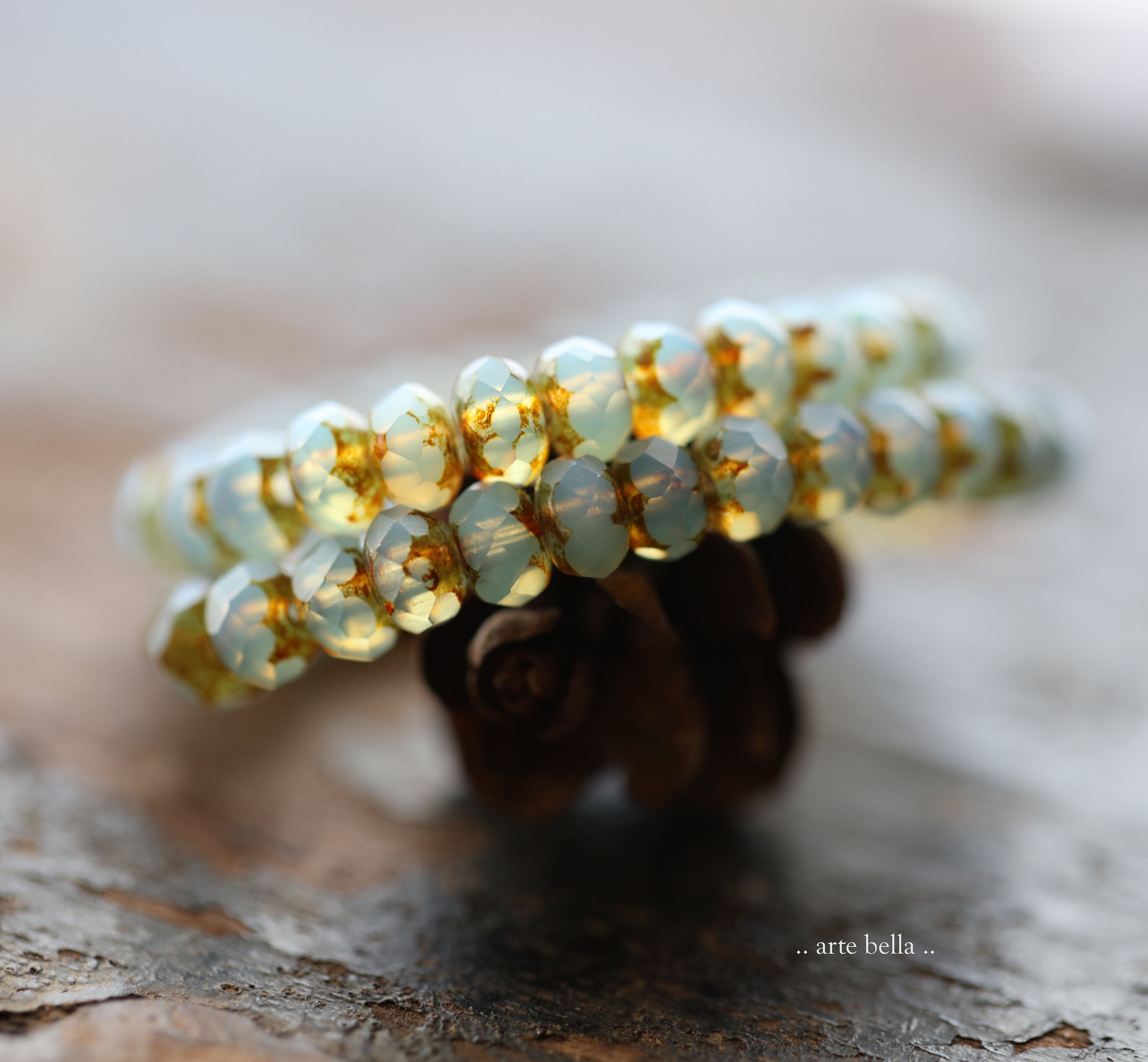 Matte milky light blue opaline glass with an earthy Picasso finish and crisp facets that transmit light beautifully.
