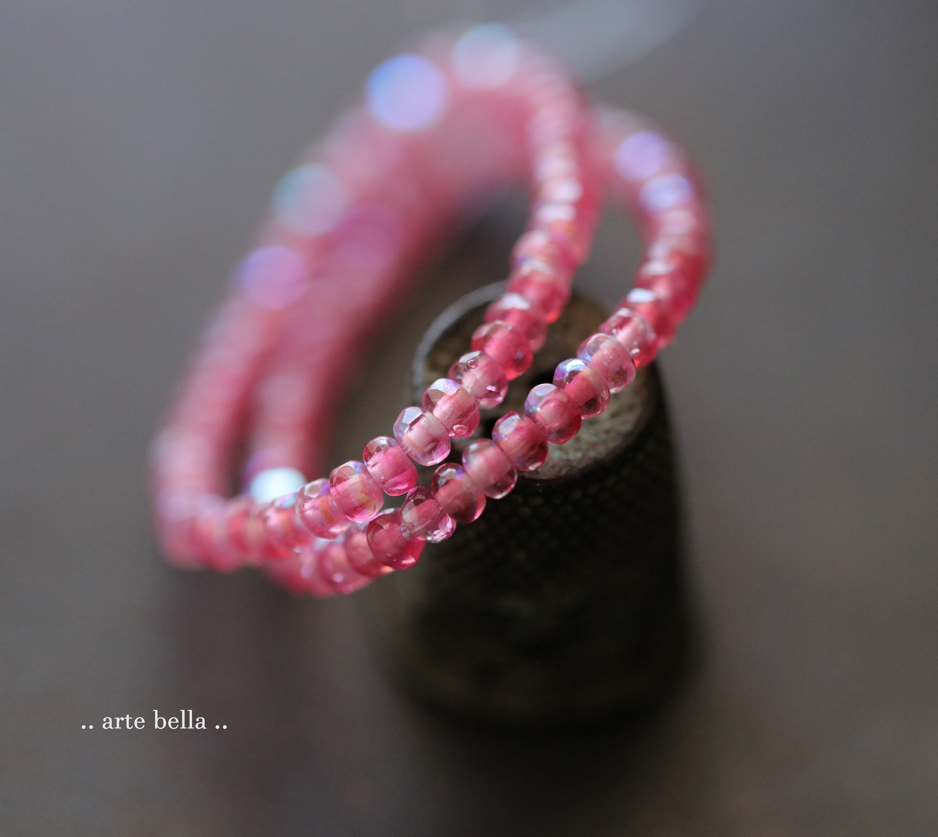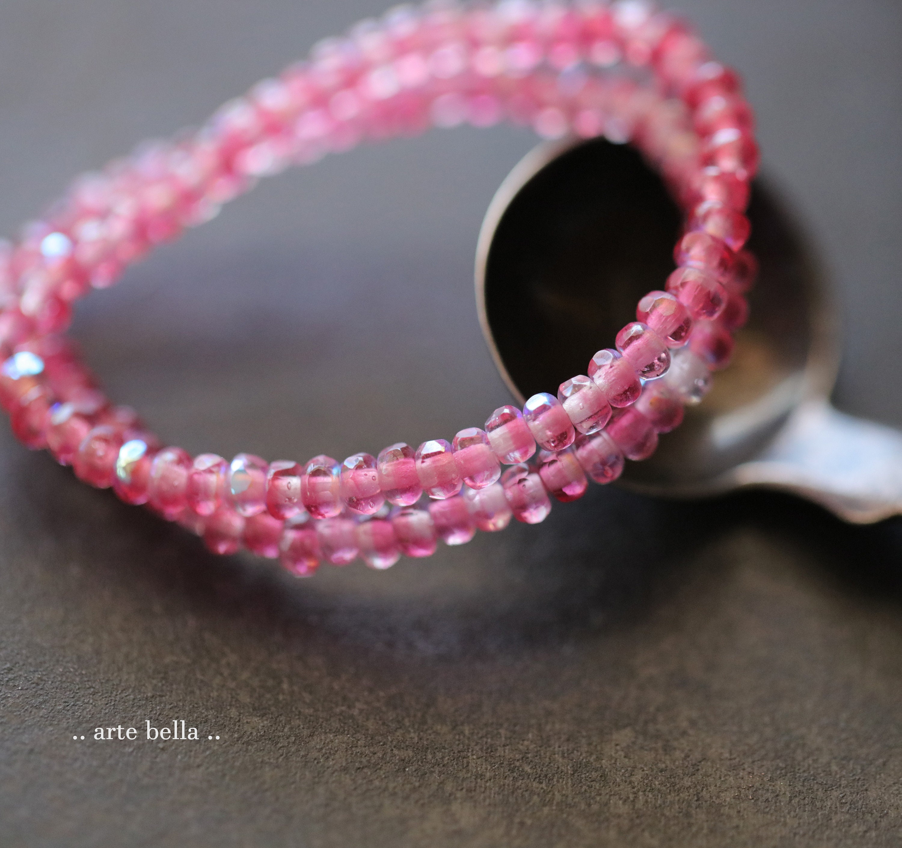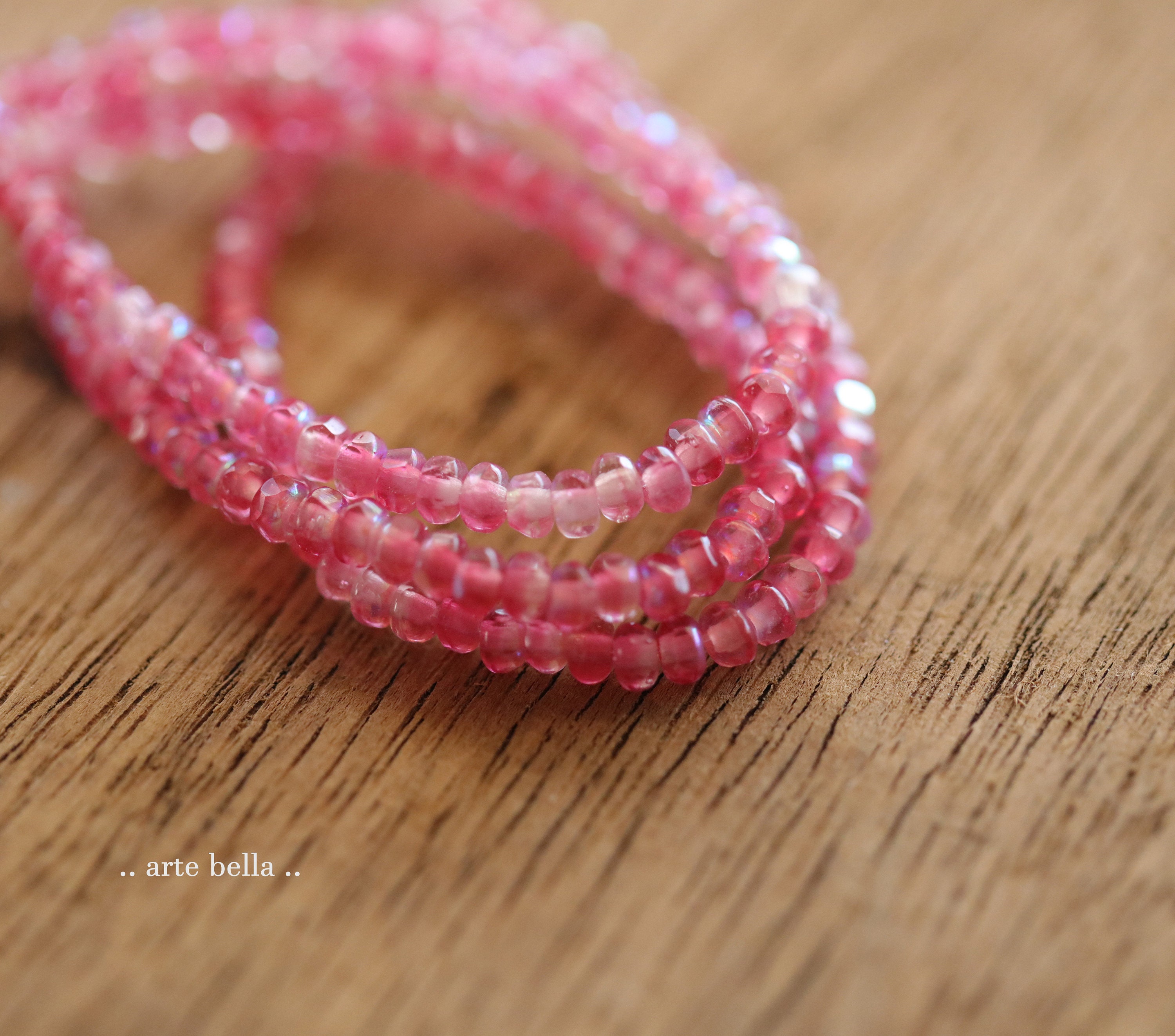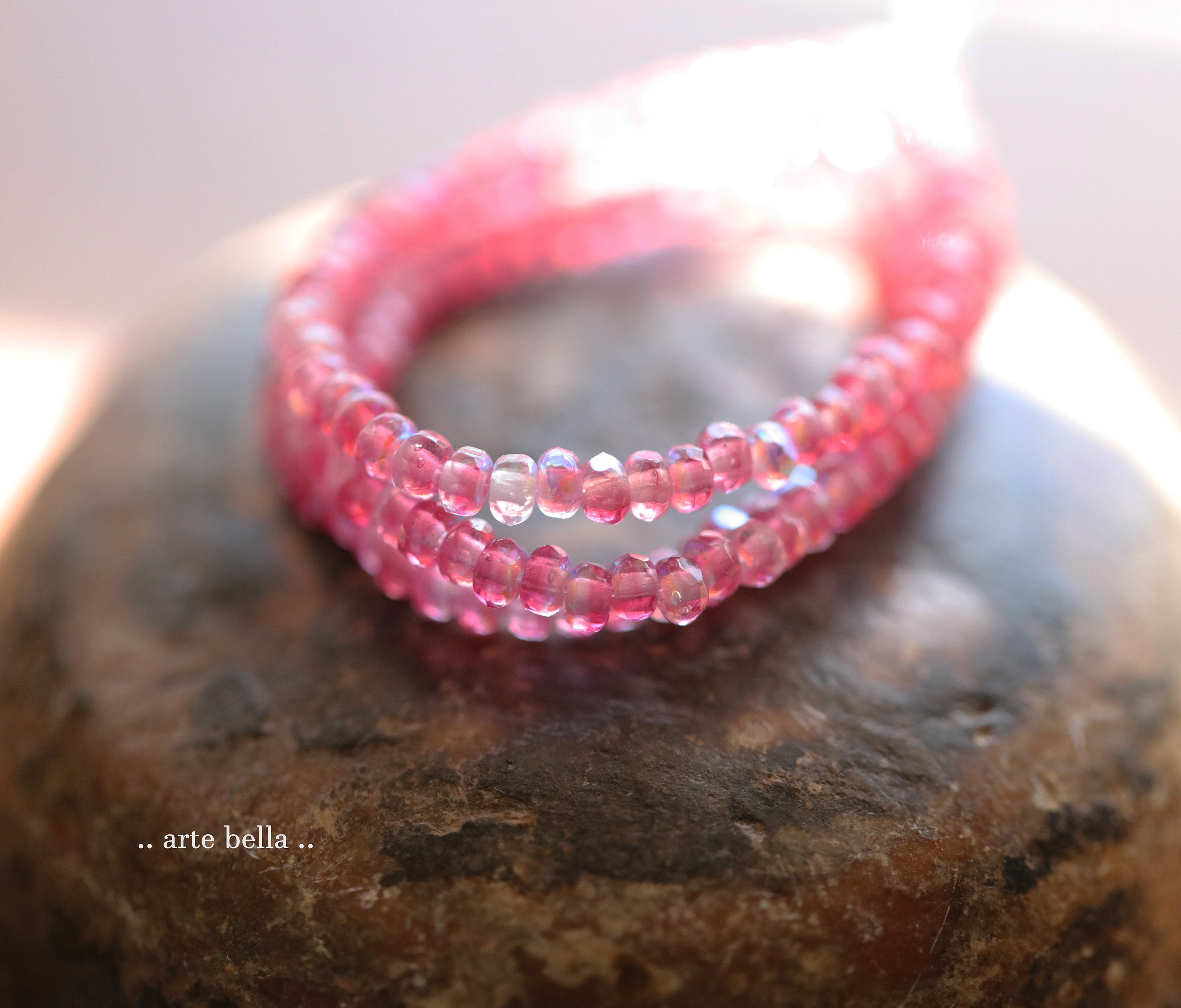 Tiny micro spacers in a fuchsia pink and clear glass mix with a rainbow Aurora Borealis finish. Super crisp gemstone cut facets give these lots of sparkle. Great for a little pop of color!