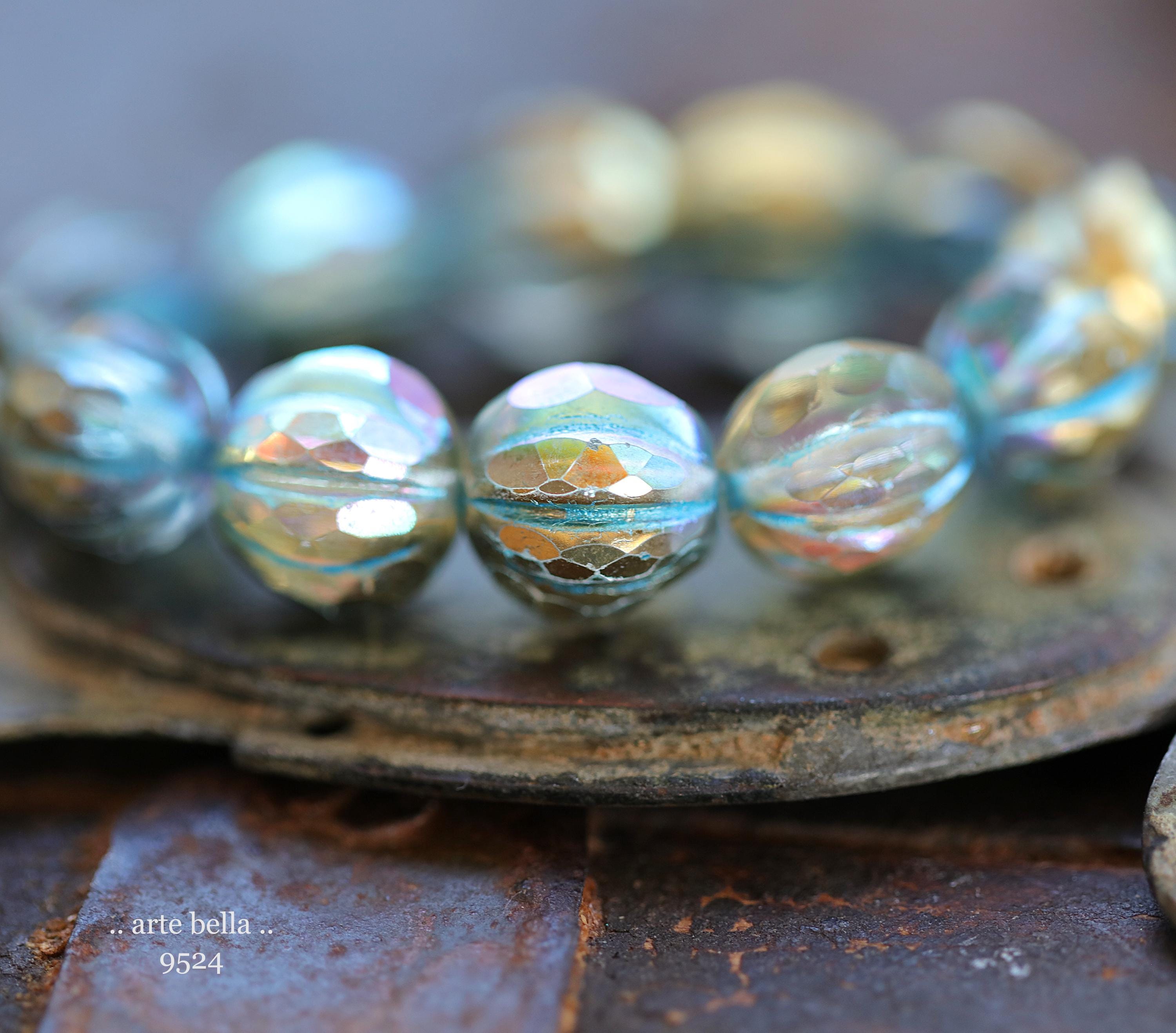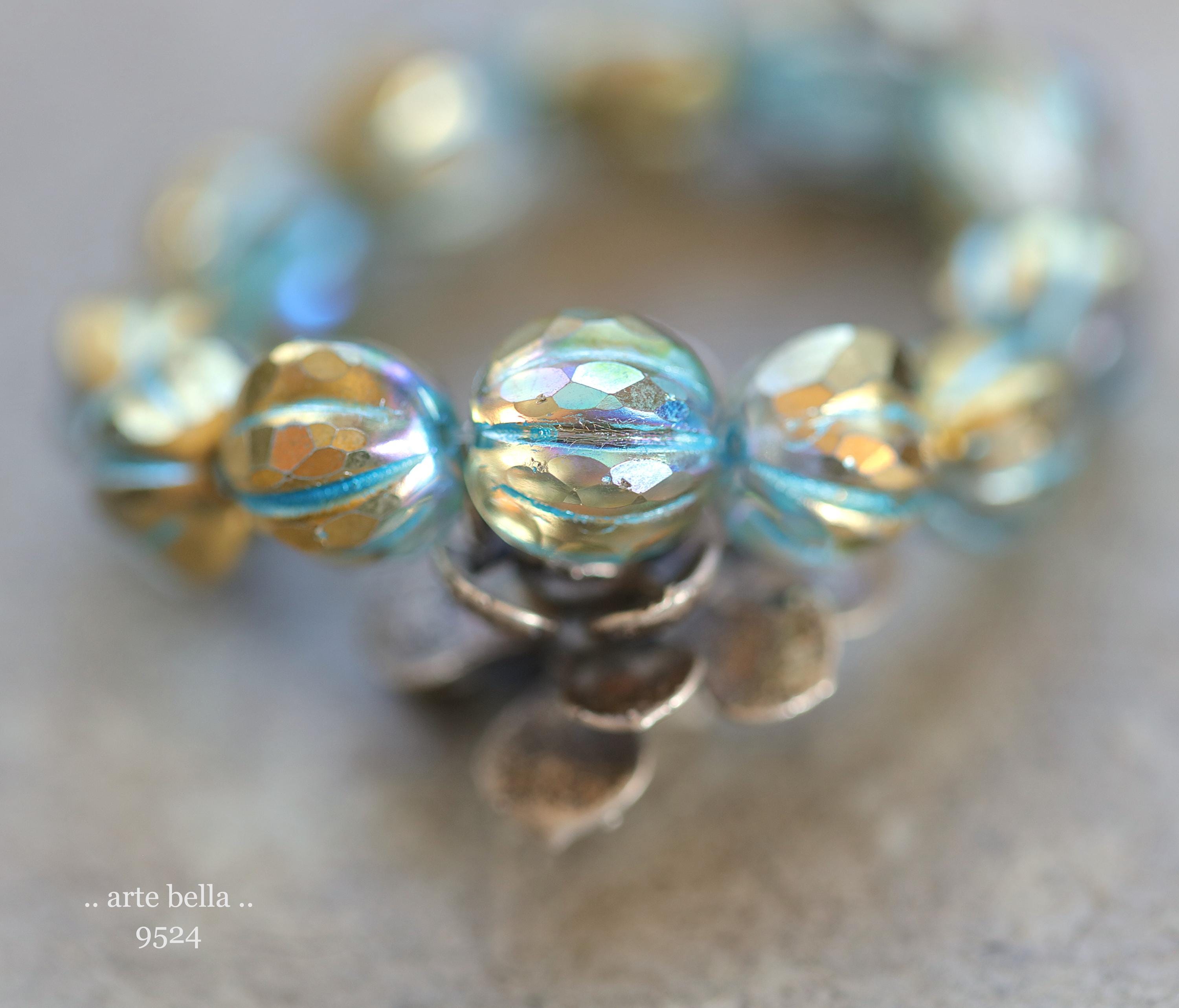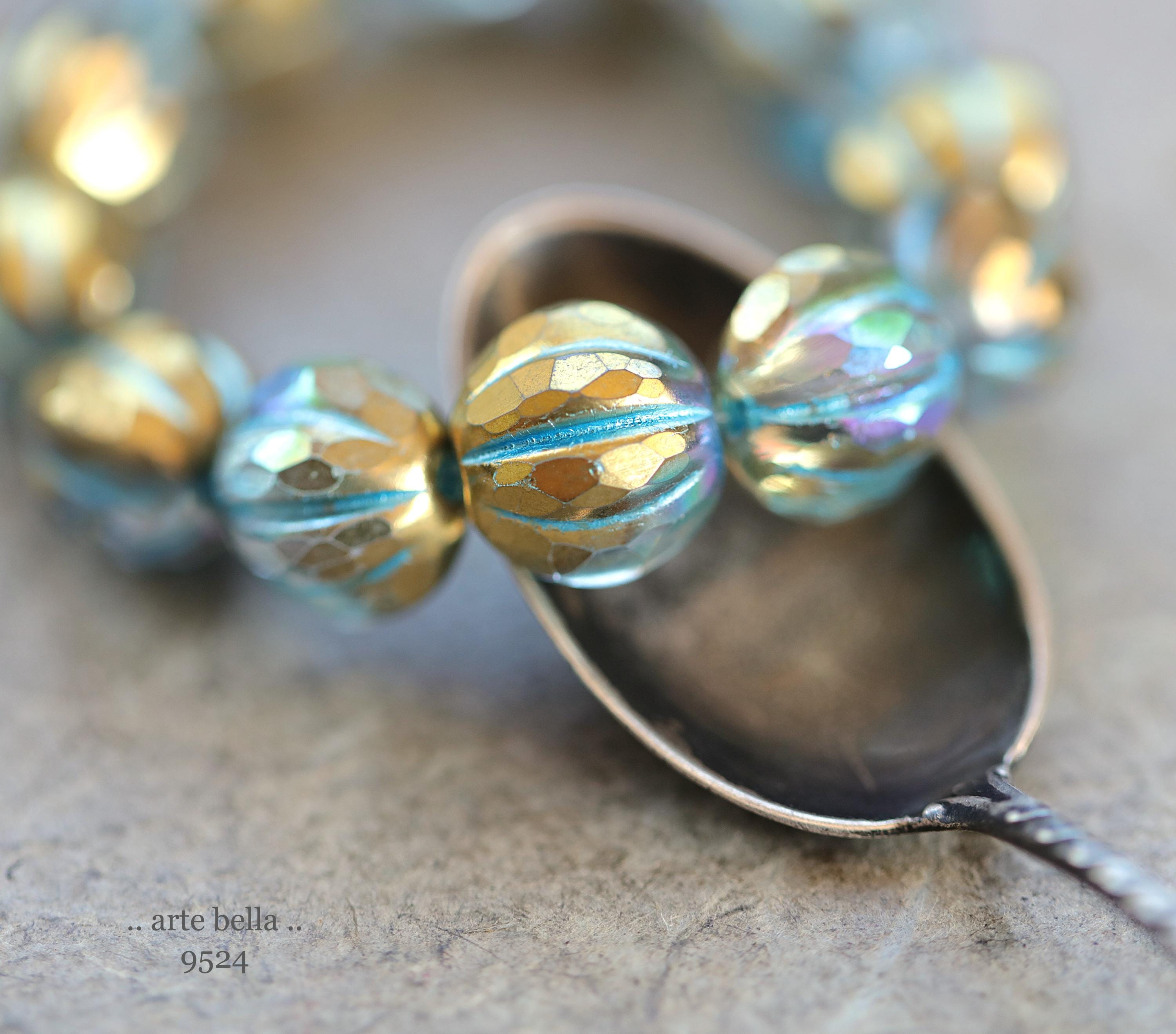 Gorgeous faceted melon beads in clear glass with a gold metallic luster, turquoise metallic wash and light Aurora Borealis rainbow finish. PLEASE NOTE: These are not perfectly manufactured beads .. they are hand faceted and are not perfectly round as seen in my pictures. These have a vintage vibe going on.