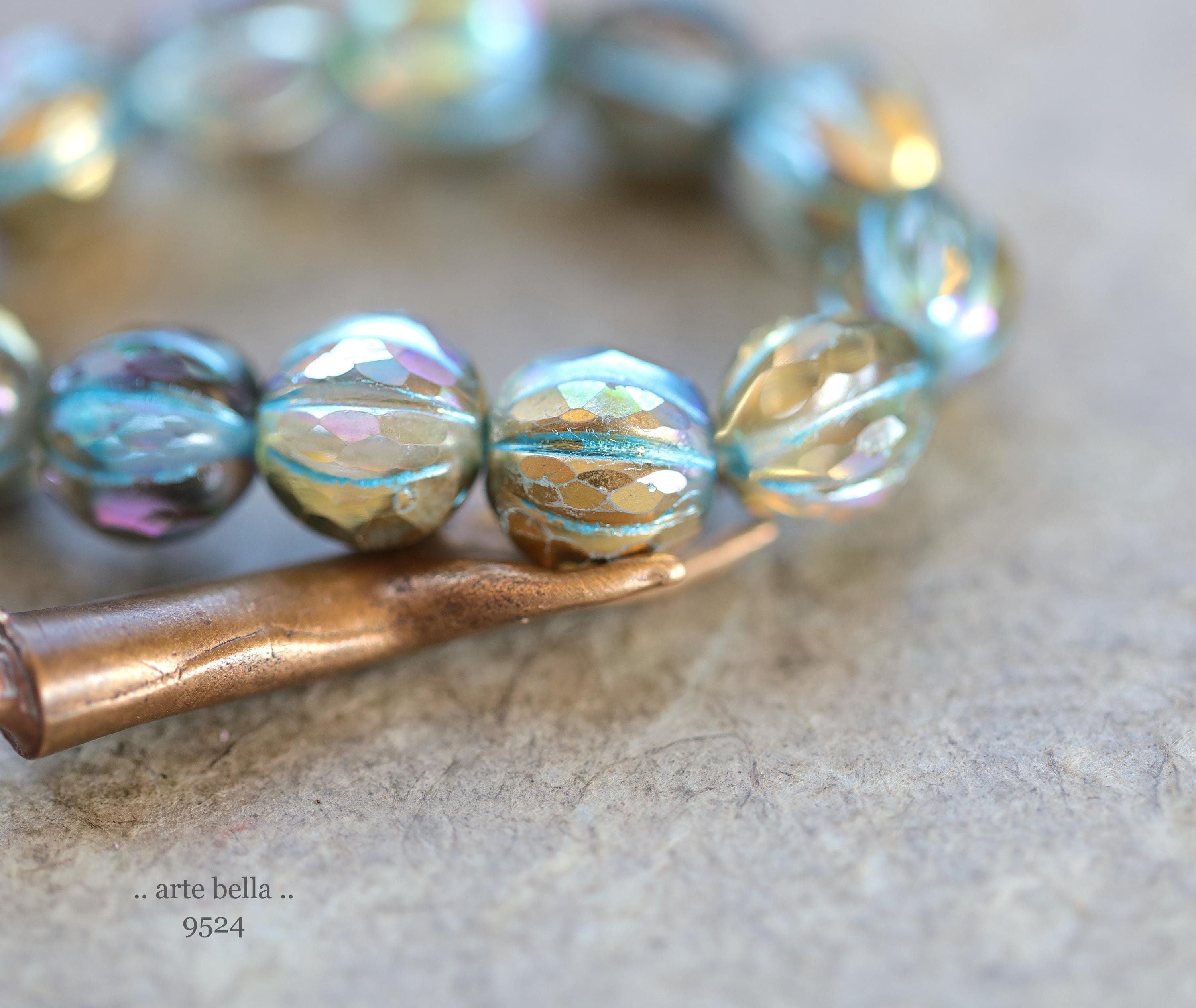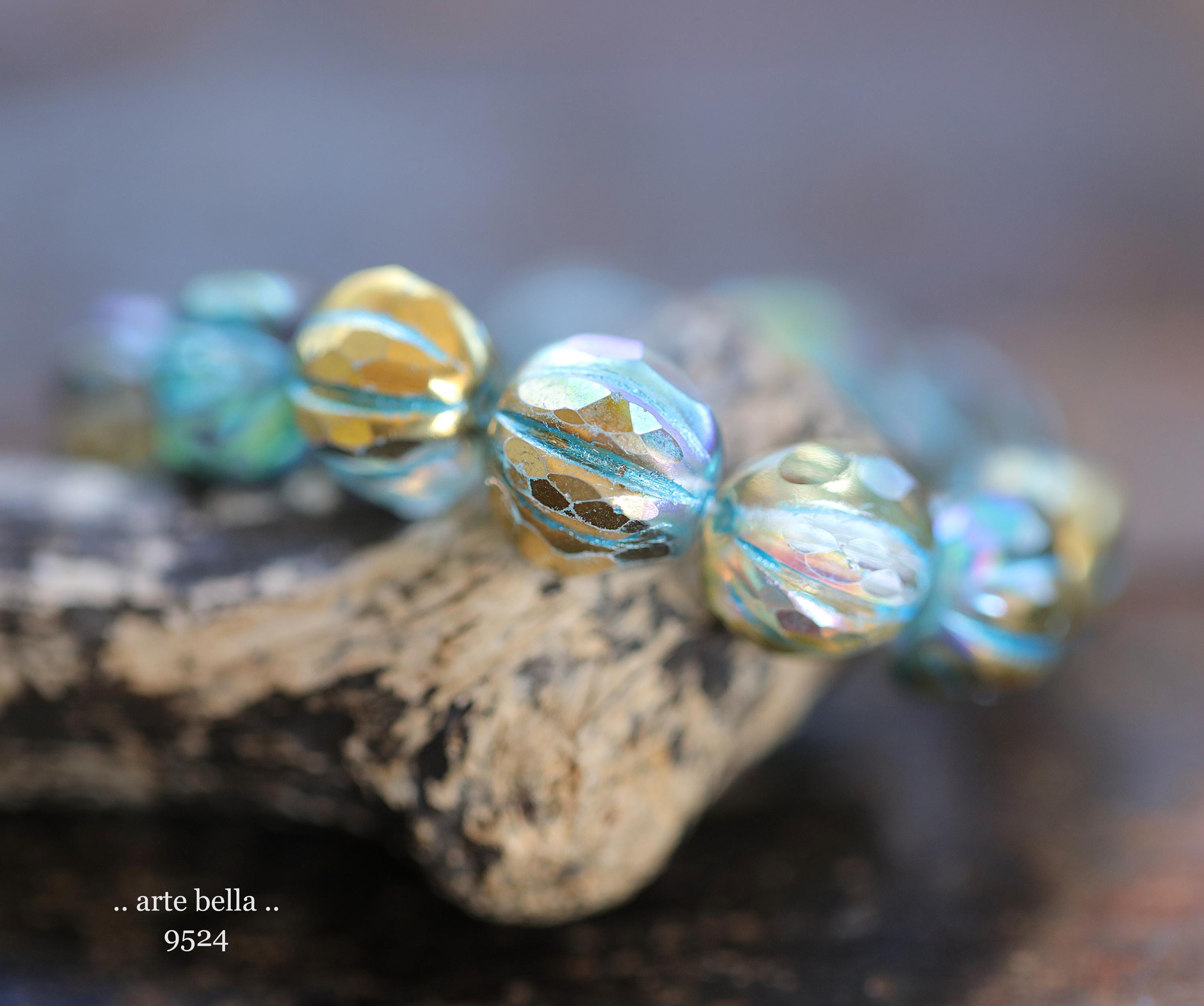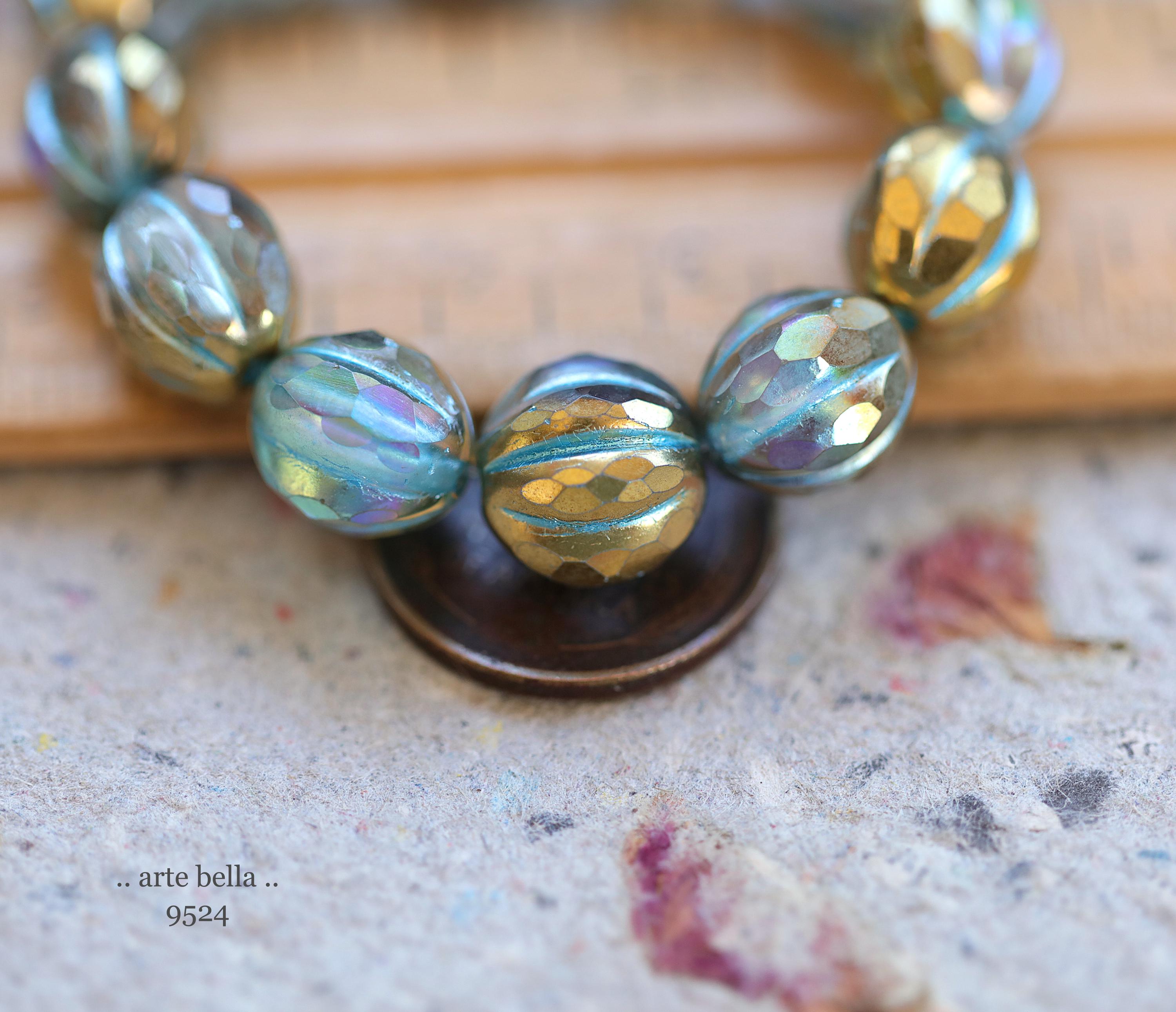 Gorgeous faceted melon beads in clear glass with a gold metallic luster, turquoise metallic wash and light Aurora Borealis rainbow finish. PLEASE NOTE: These are not perfectly manufactured beads .. they are hand faceted and are not perfectly round as seen in my pictures. These have a vintage vibe going on.