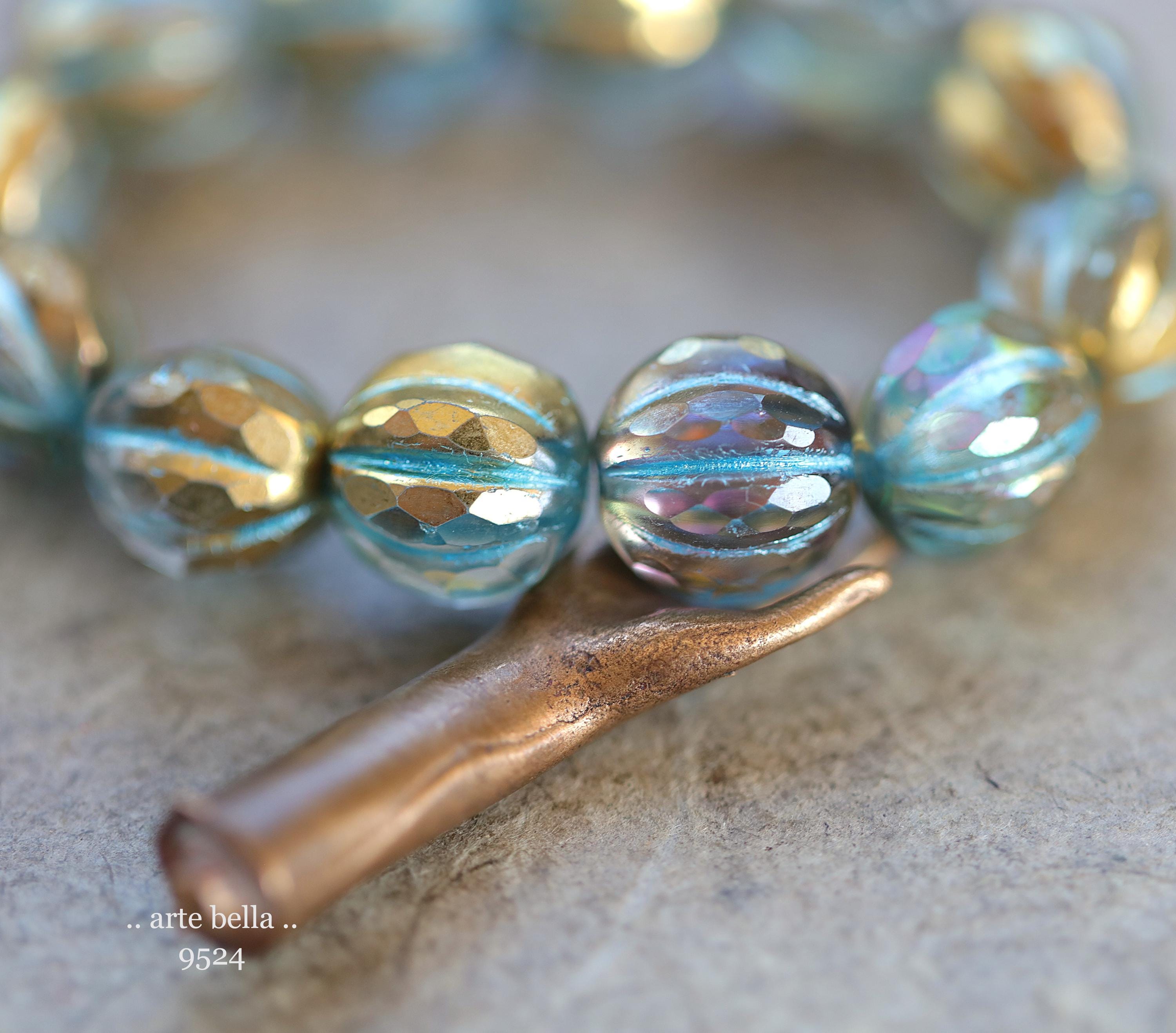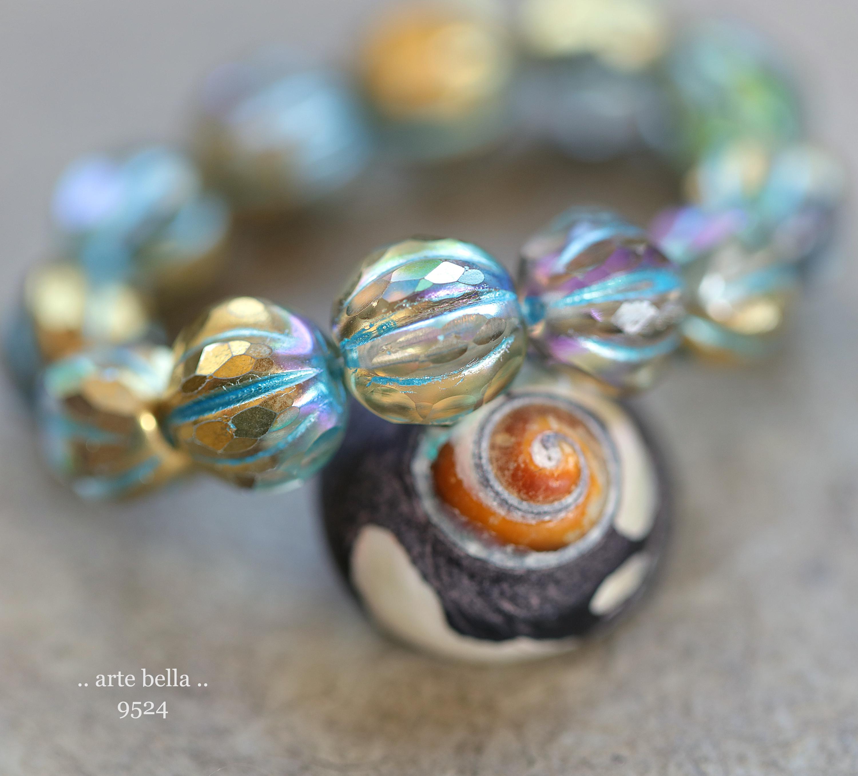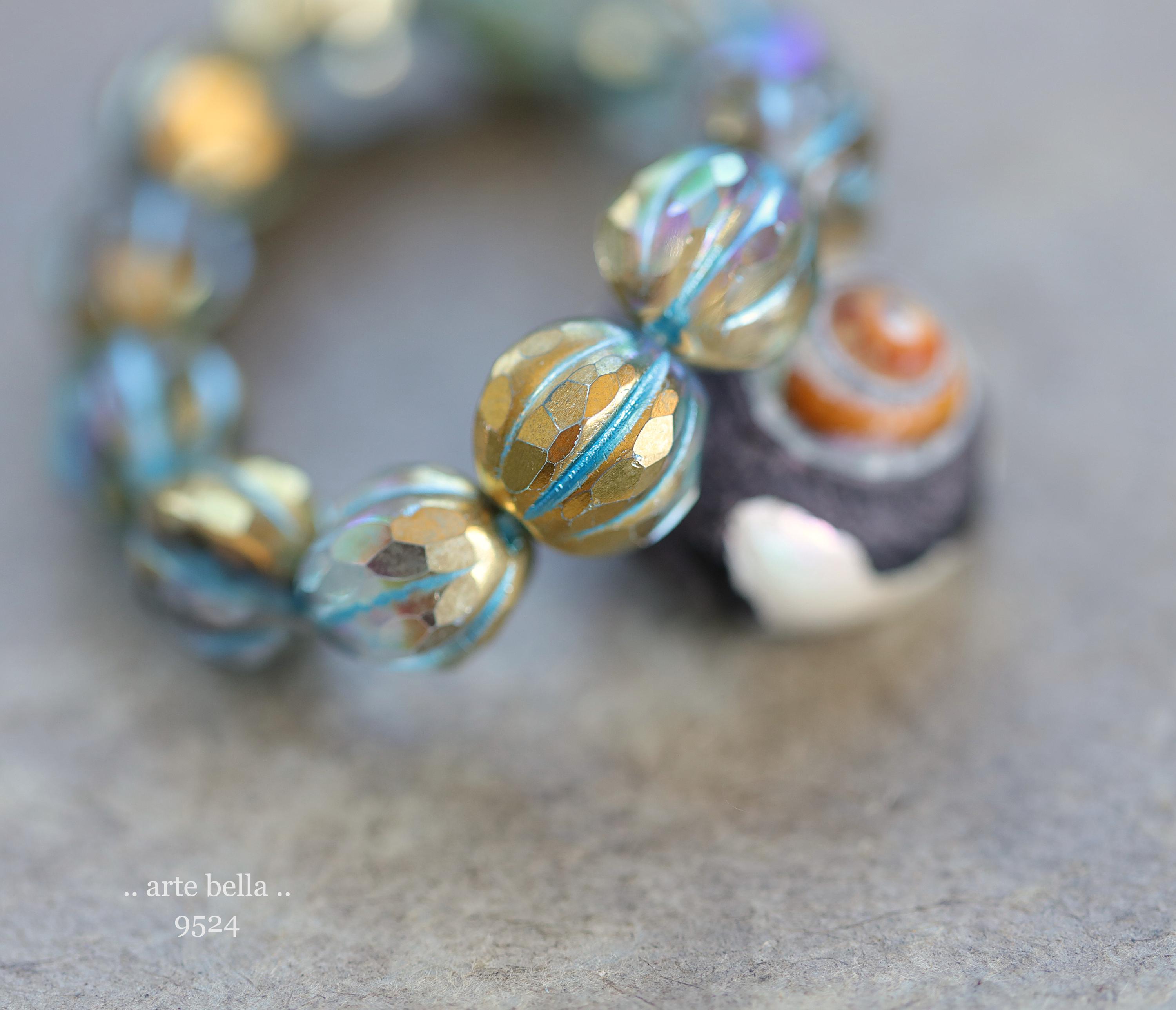 premium glass beads .. GOLDEN MYSTIC BLUE Glitz .. 12 Czech Glass Faceted Melon Beads 10mm (9524-st) .. jewelry making supplies
