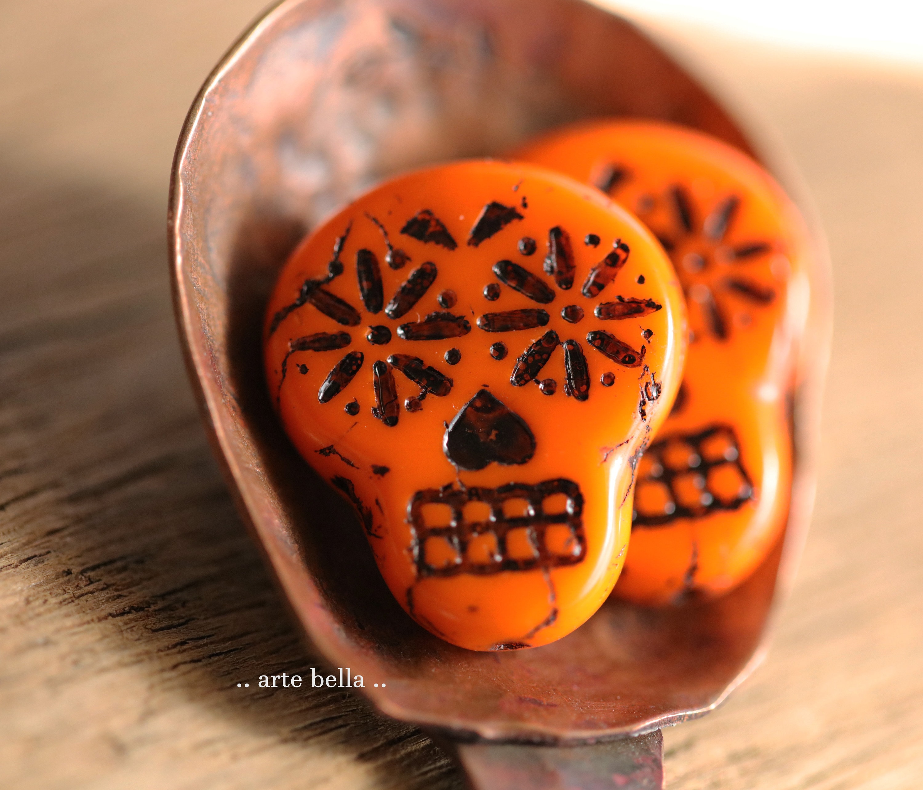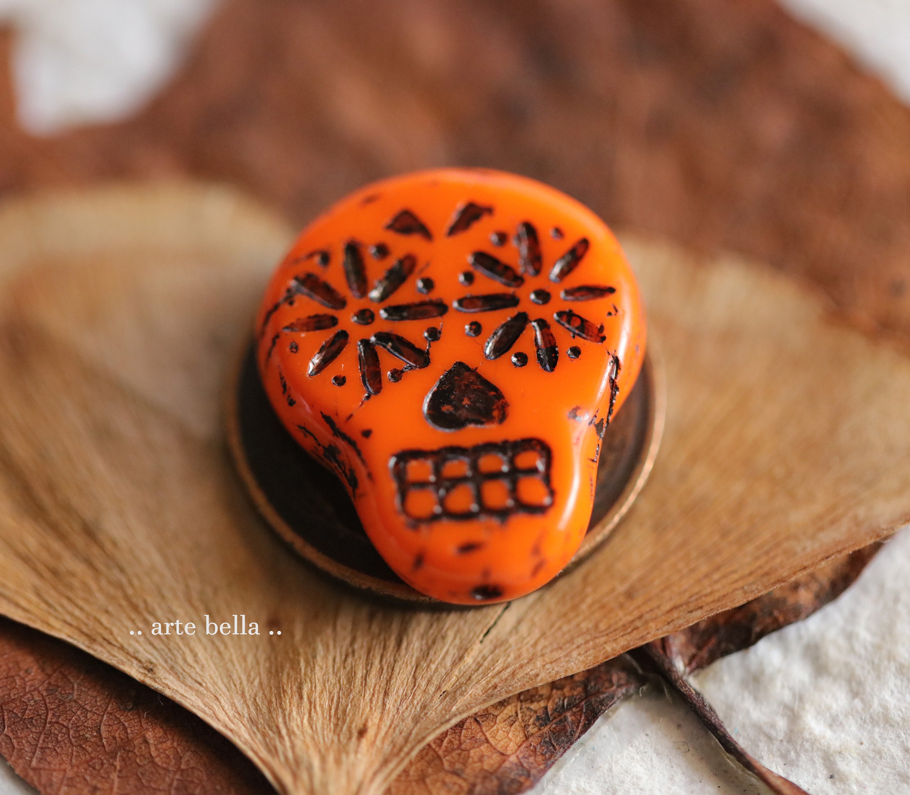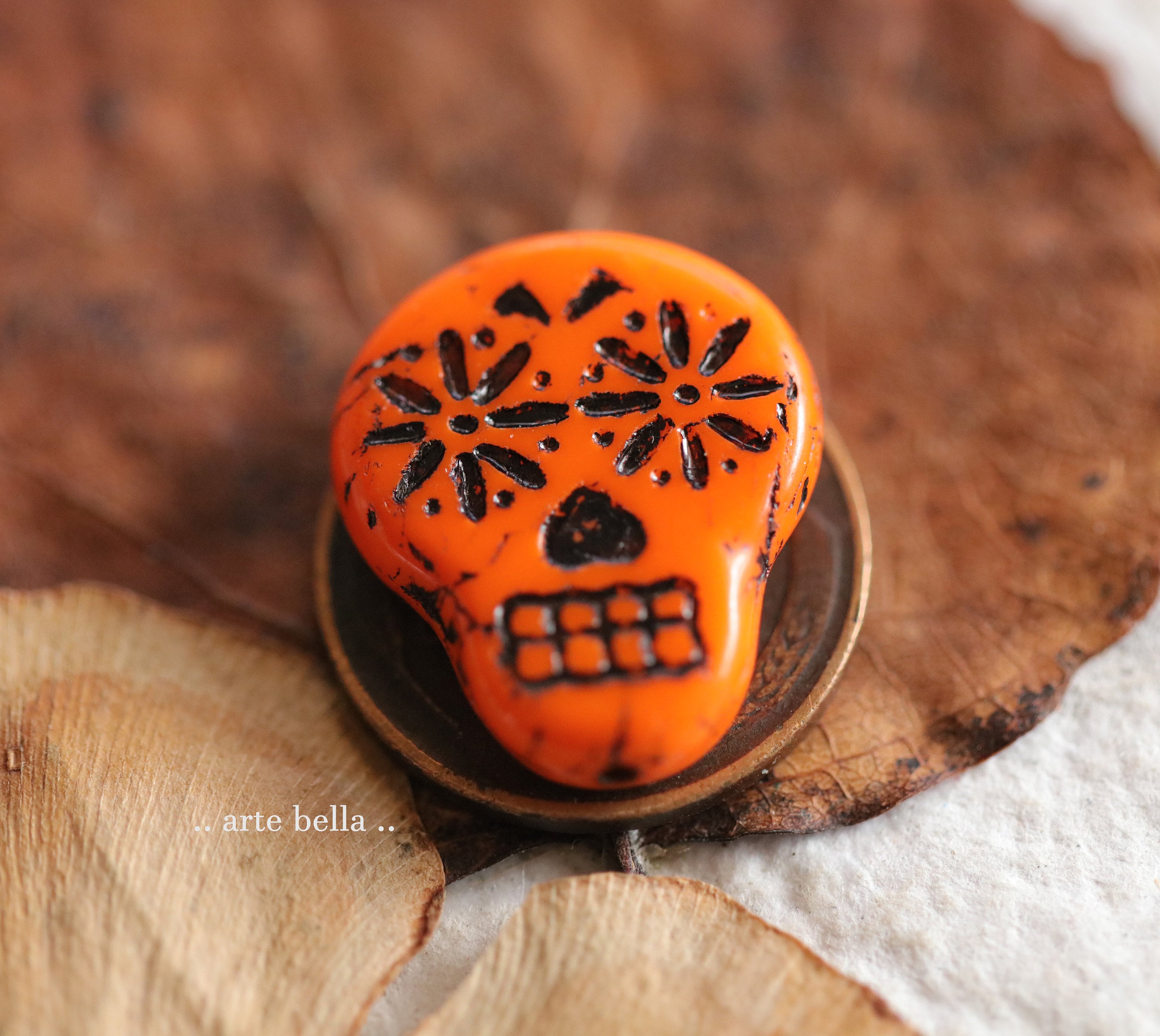 last ones .. BLACKENED ORANGE SKULLS .. 6 Premium Czech Glass Sugar Skull Beads 20x17mm (9564-6) .. jewelry supplies