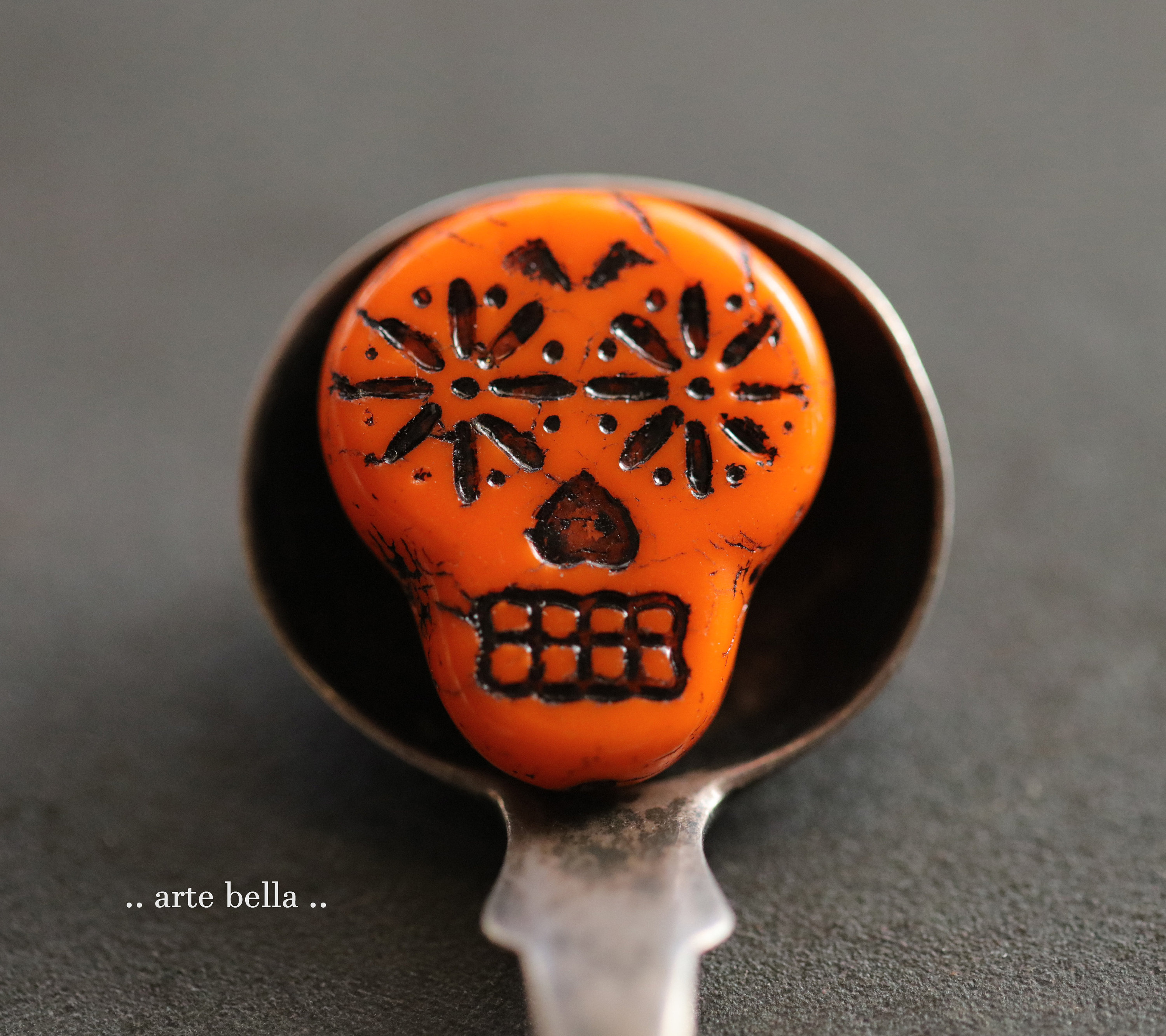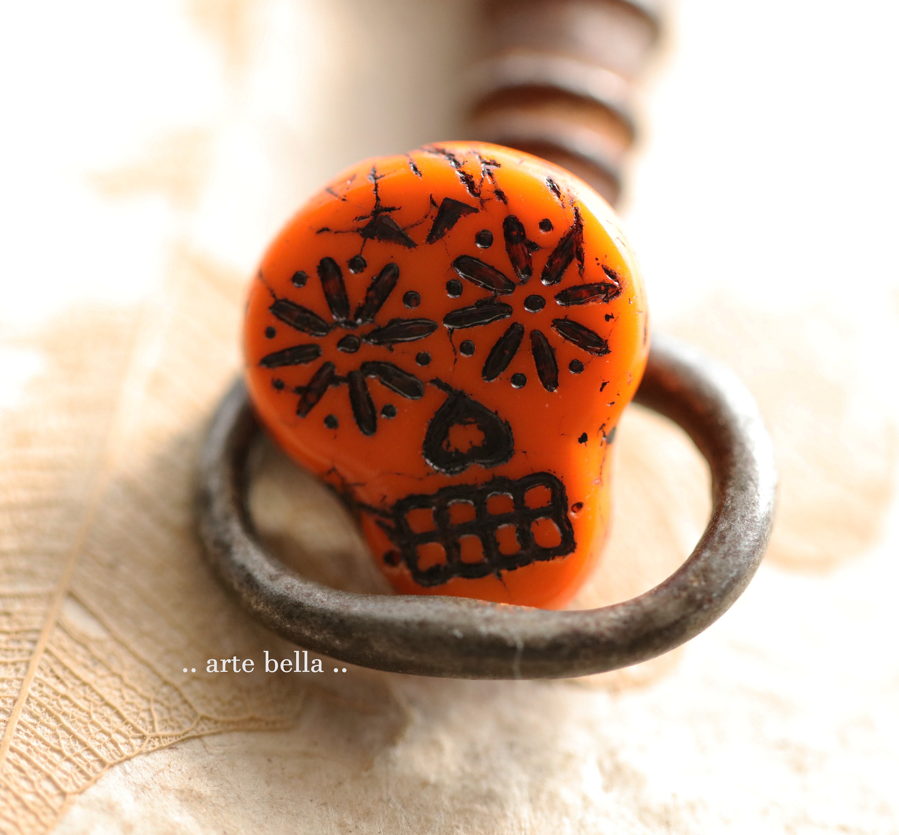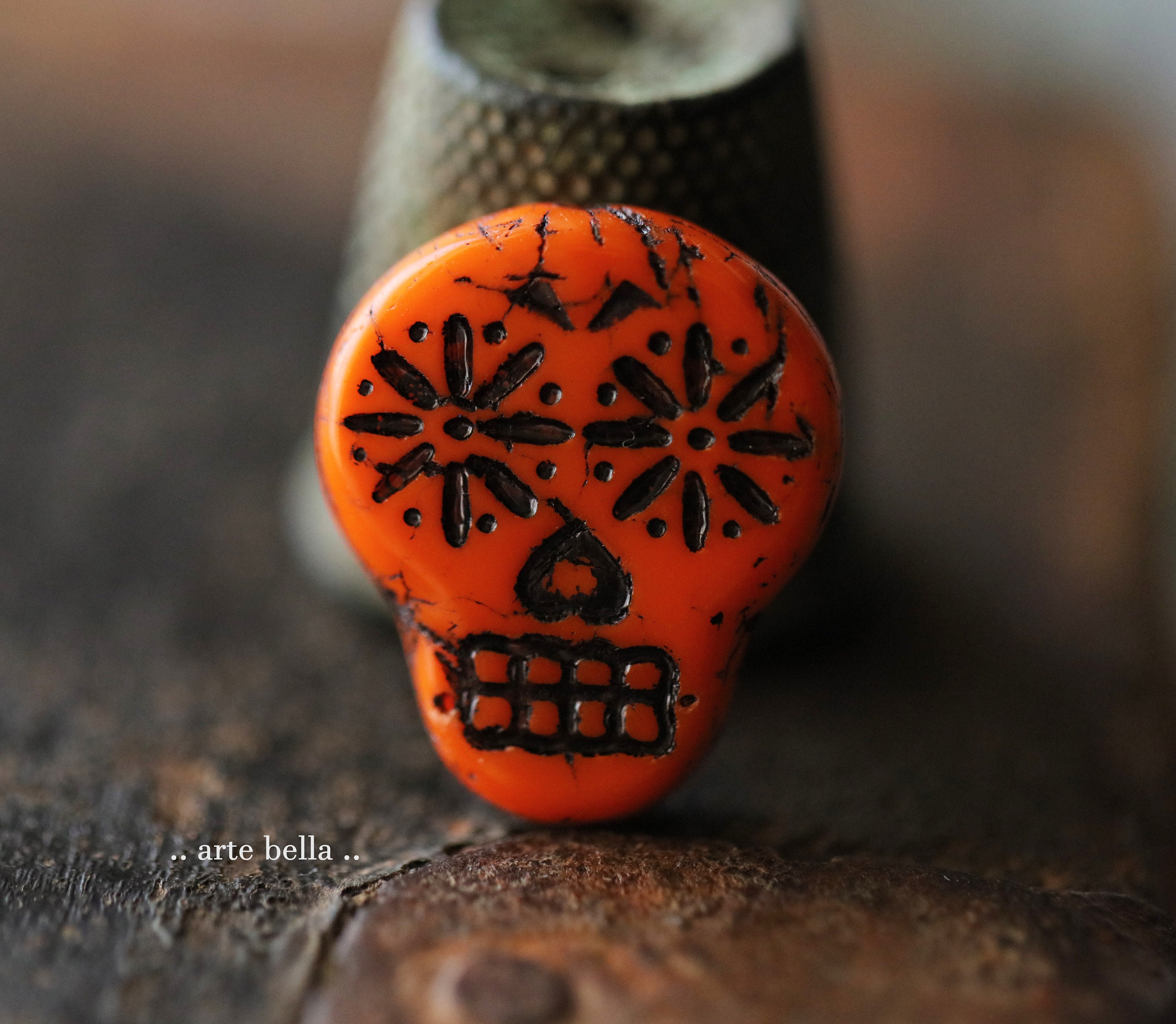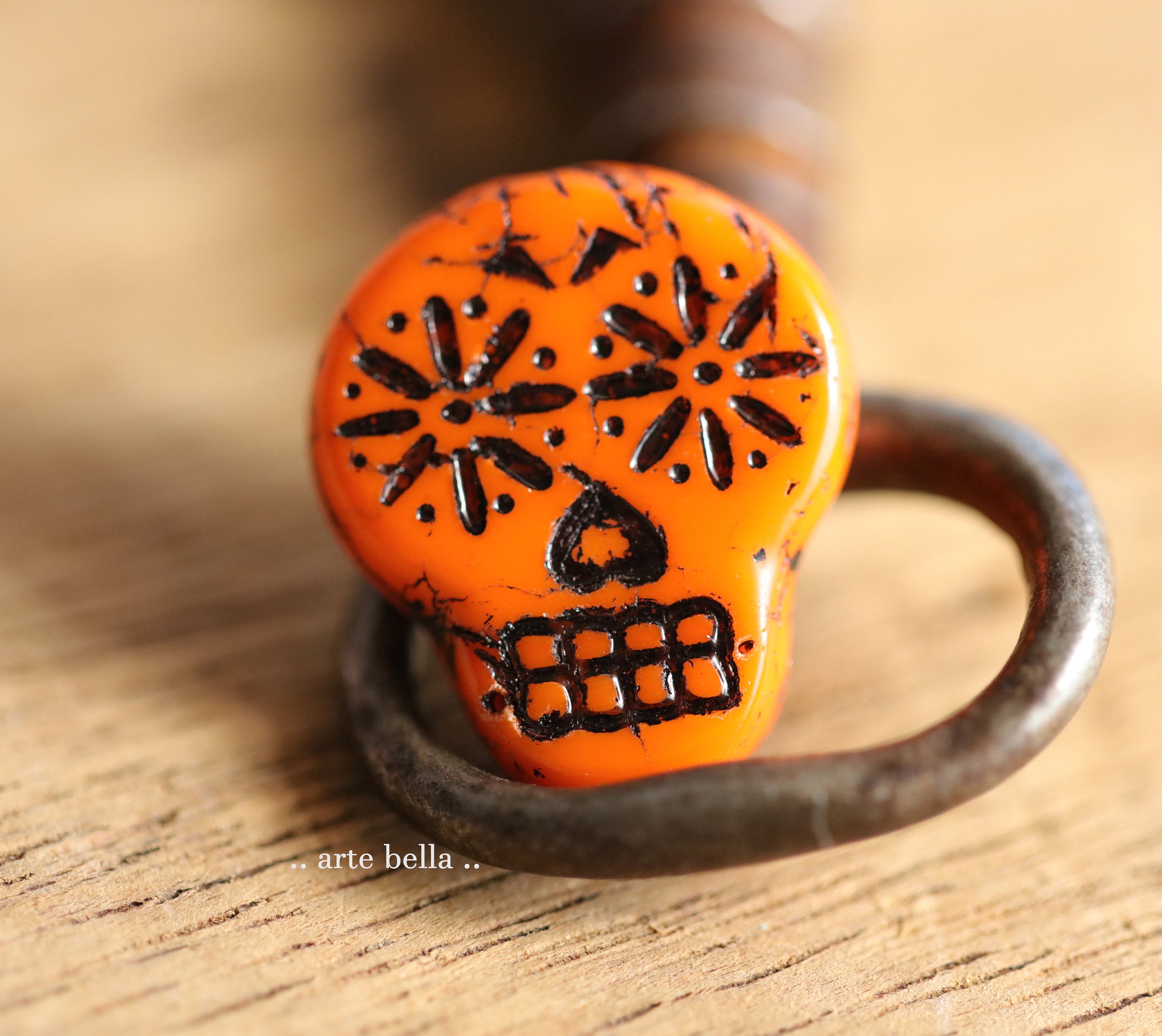 last ones .. BLACKENED ORANGE SKULLS .. 6 Premium Czech Glass Sugar Skull Beads 20x17mm (9564-6) .. jewelry supplies