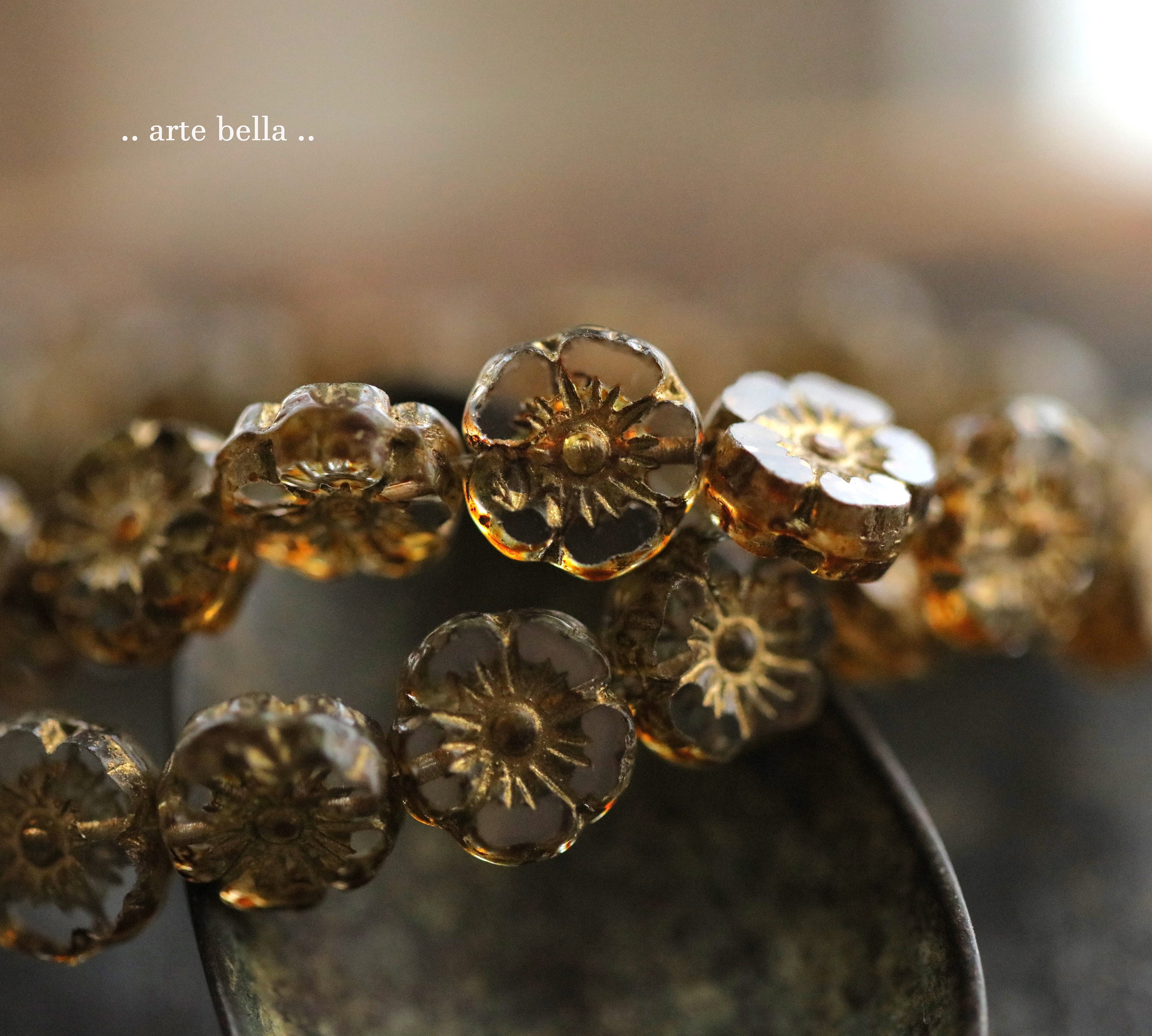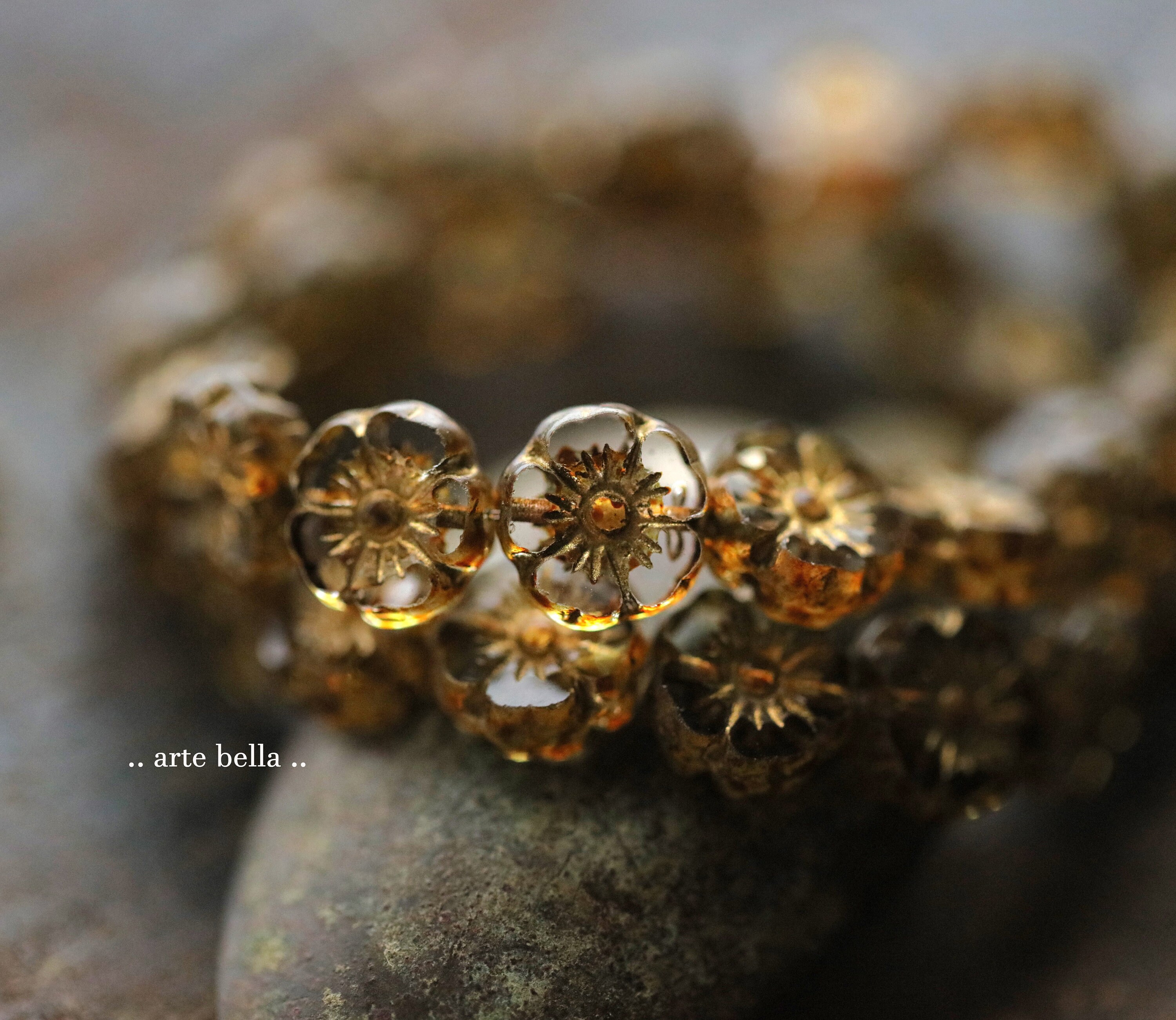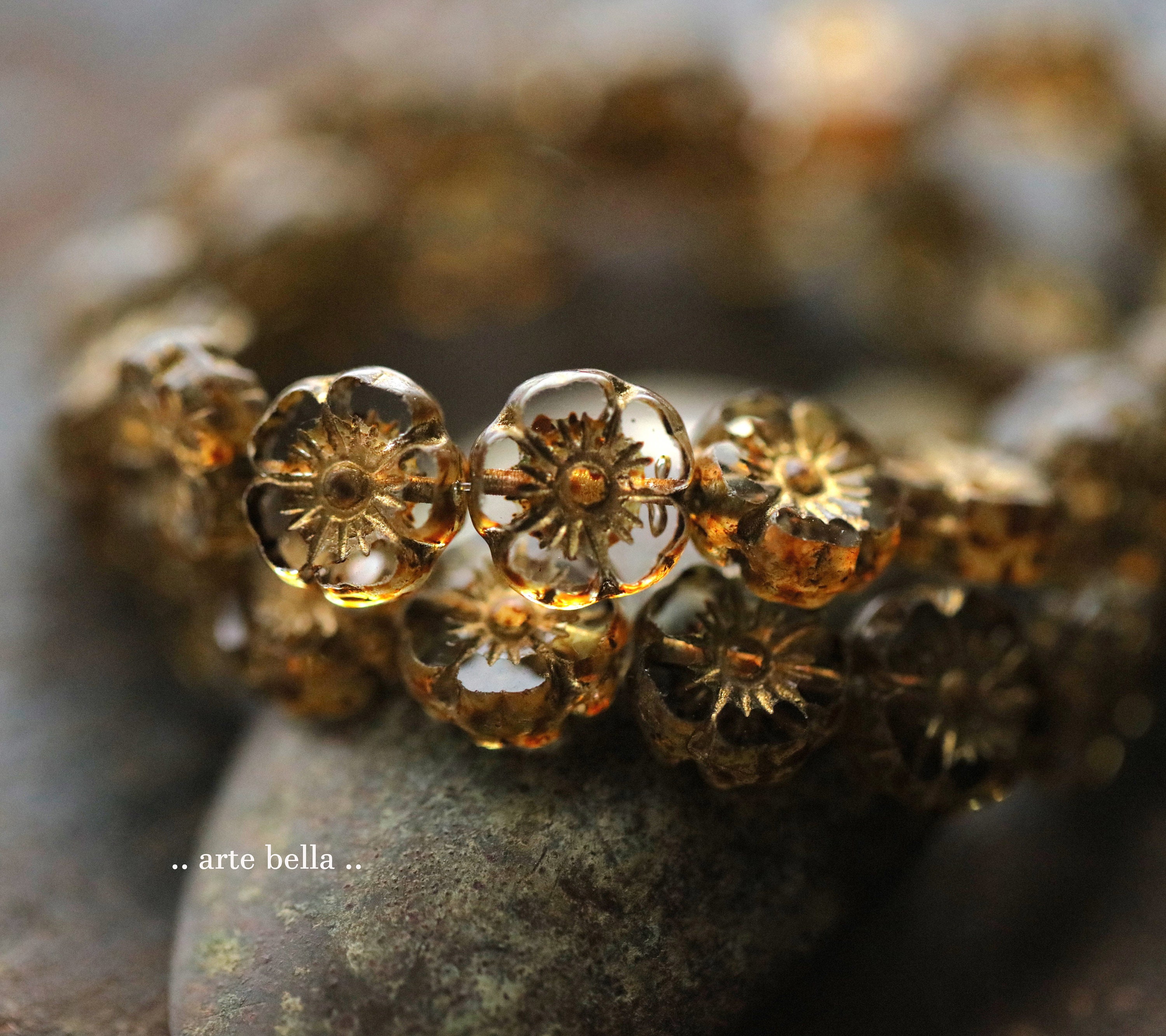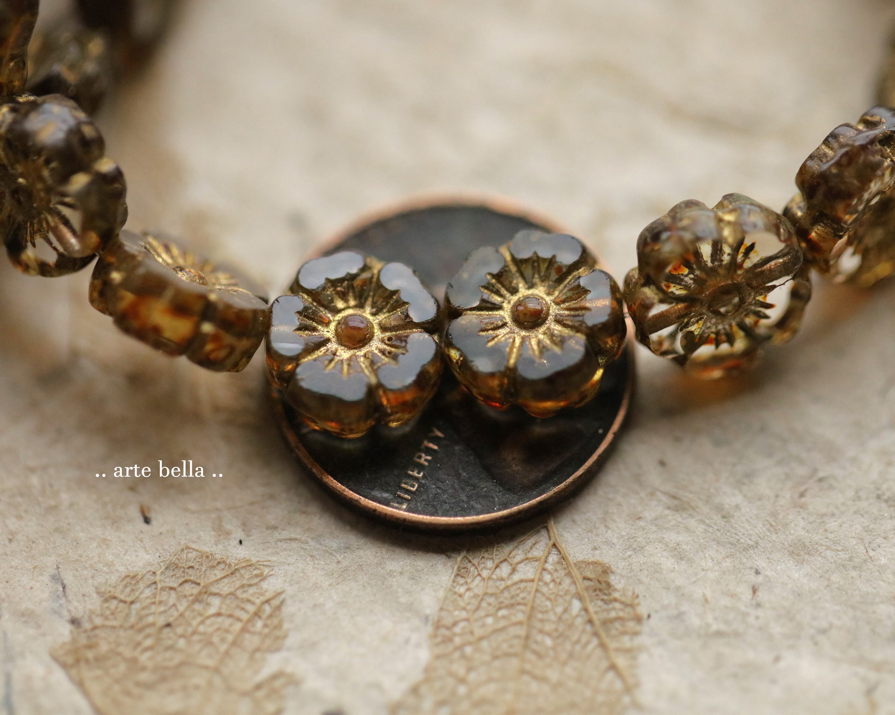 GOLDEN WHISPER BLOOMS .. 16 Premium Picasso Czech Glass Hibiscus Flower Beads 10mm (9682-st) .. jewelry supplies