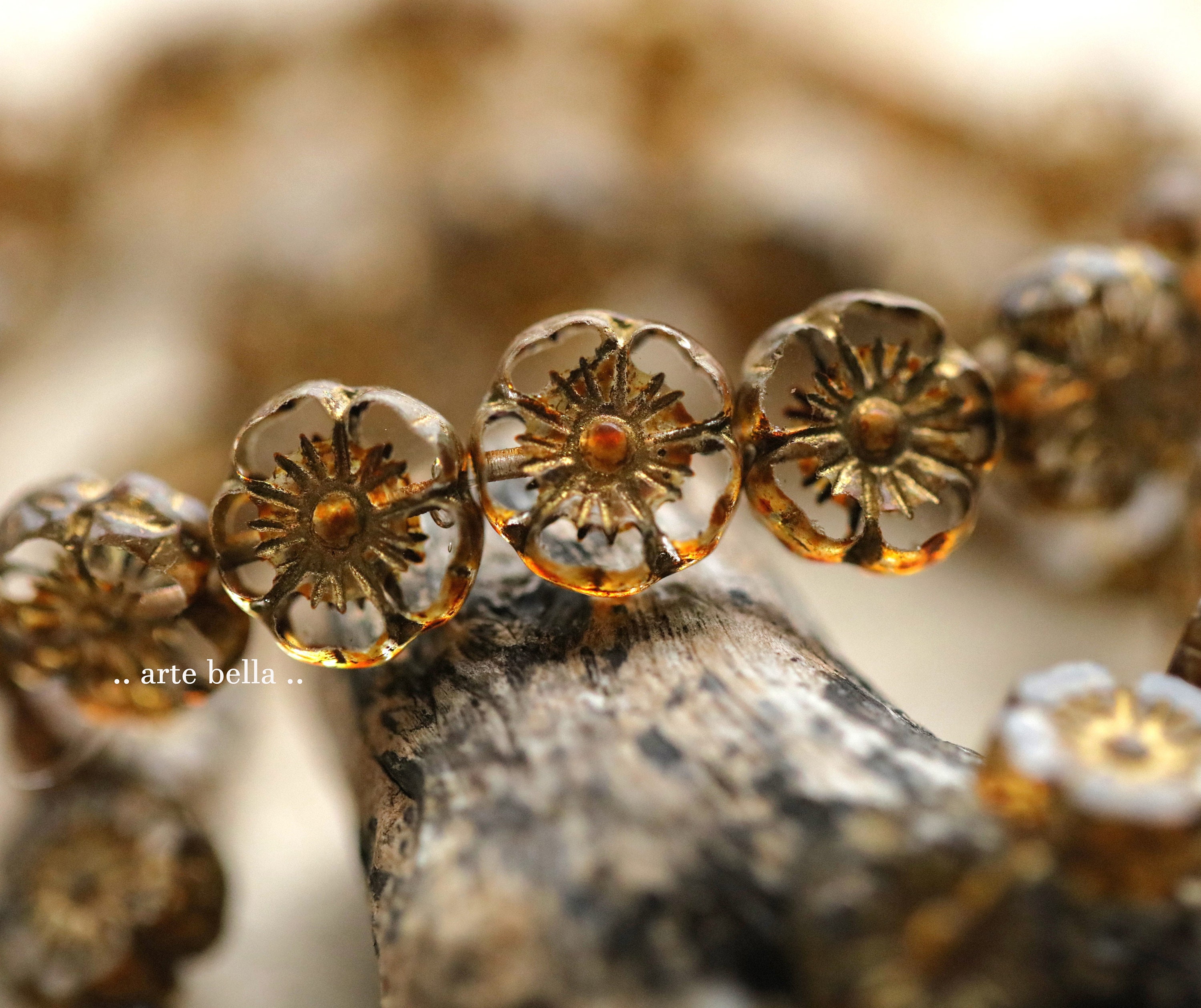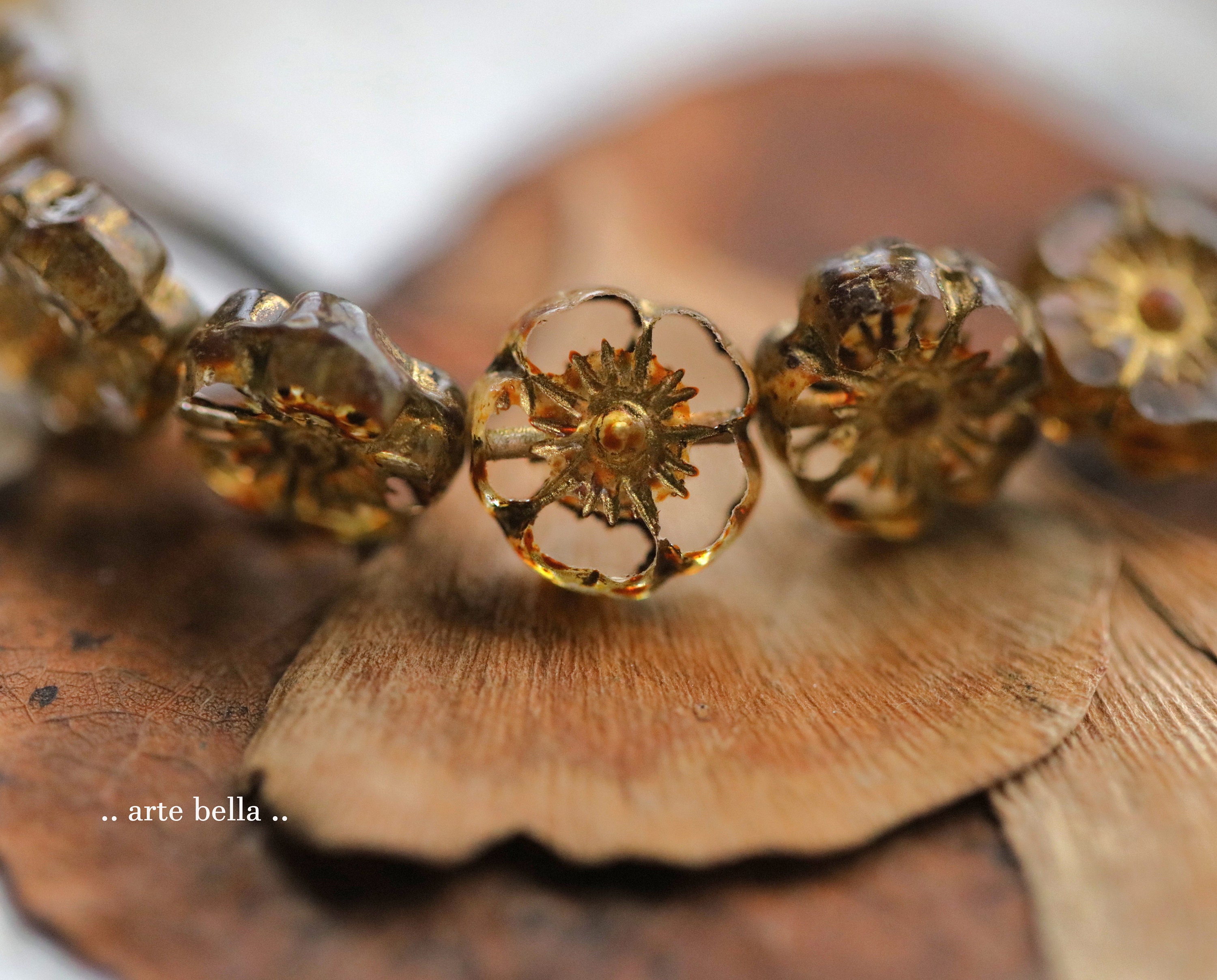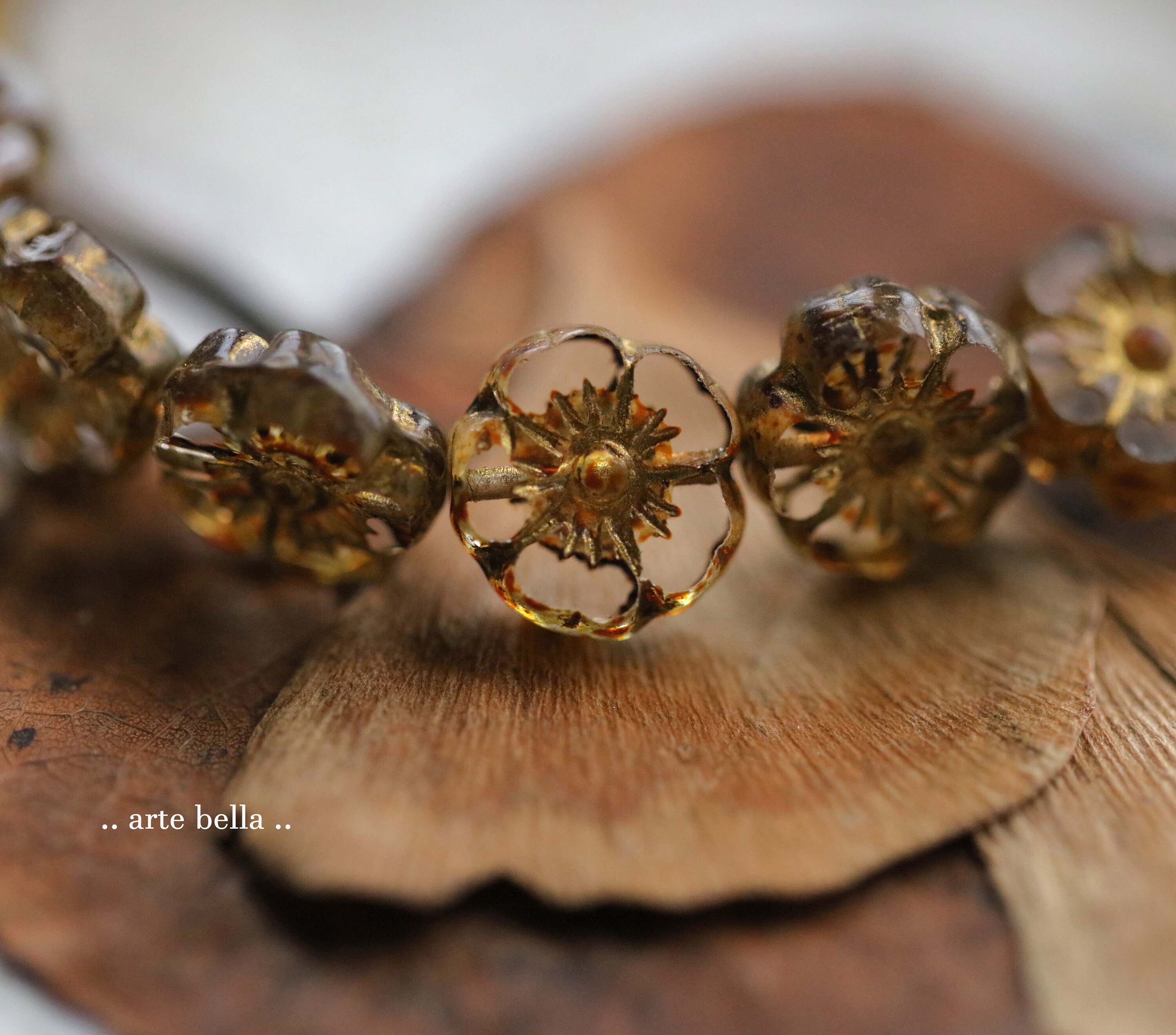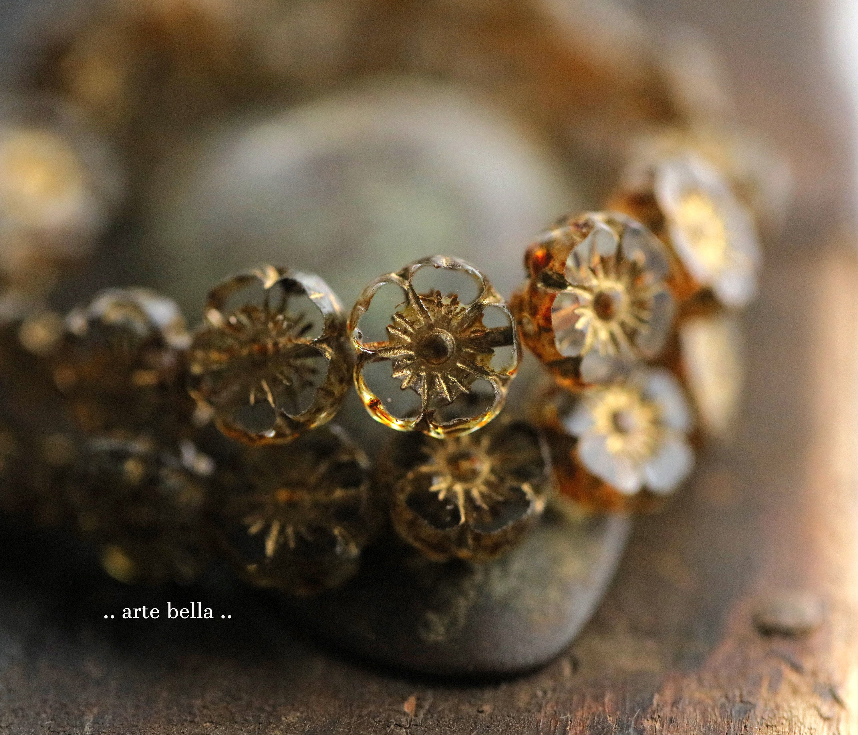 GOLDEN WHISPER BLOOMS .. 16 Premium Picasso Czech Glass Hibiscus Flower Beads 10mm (9682-st) .. jewelry supplies
