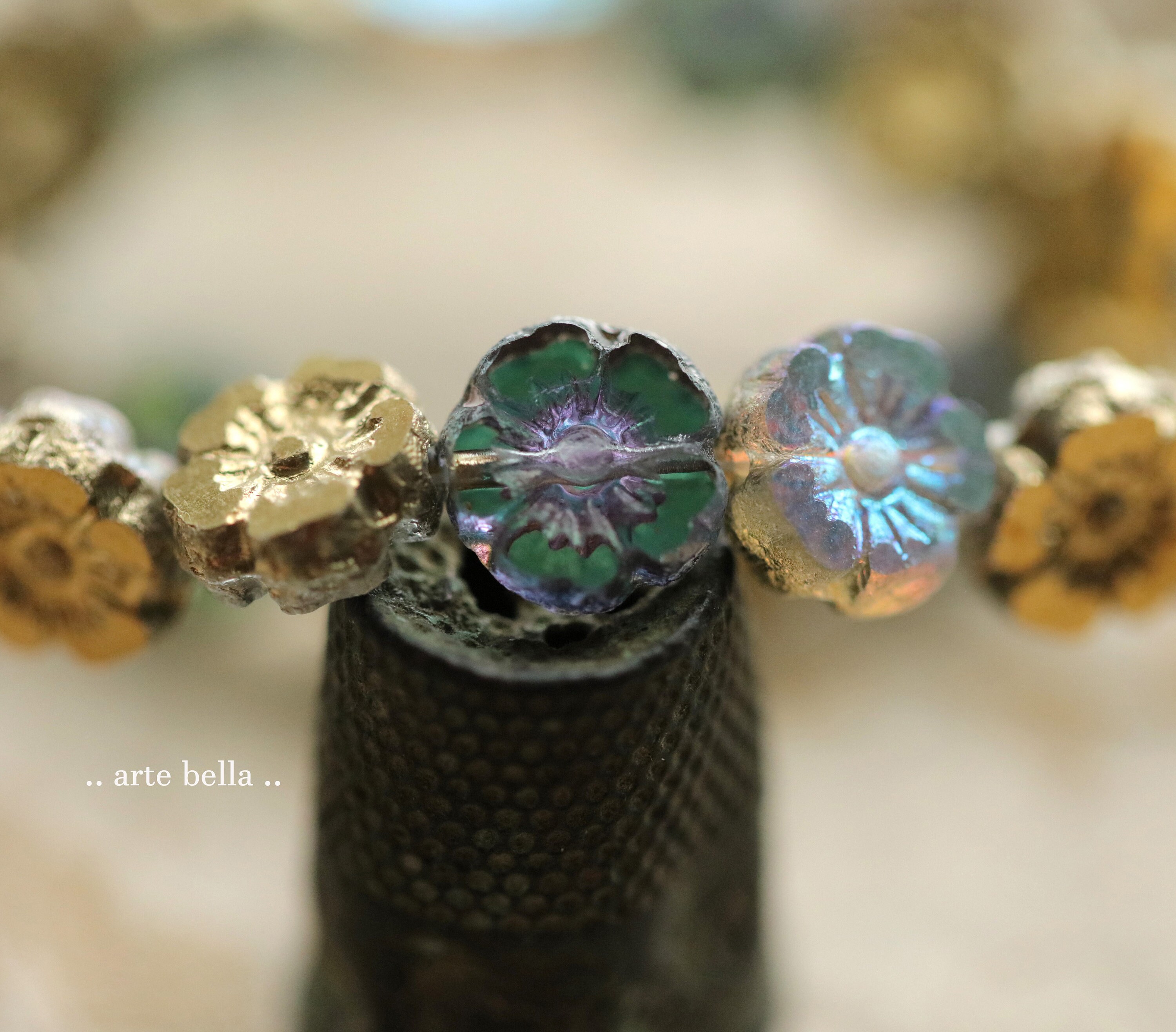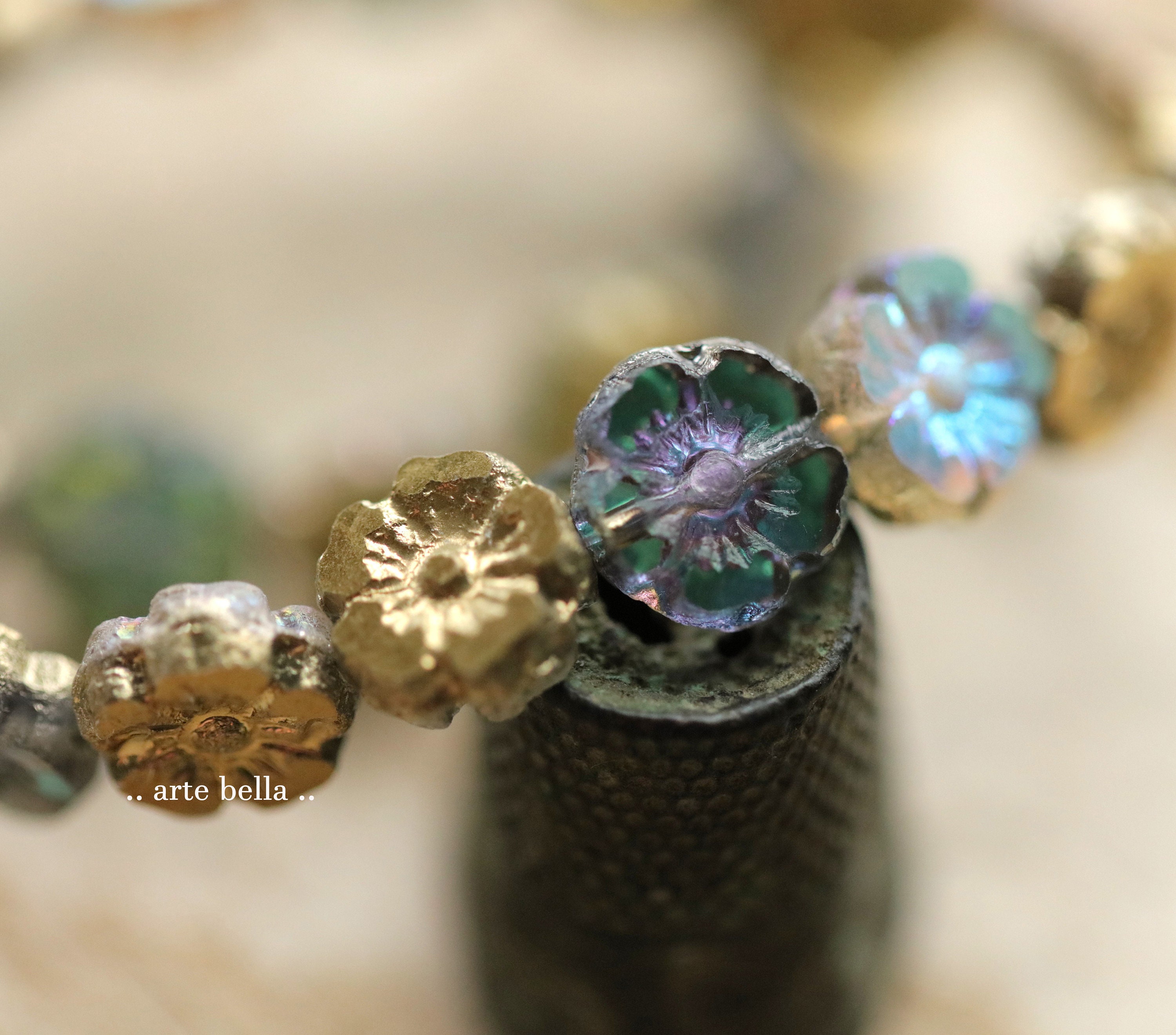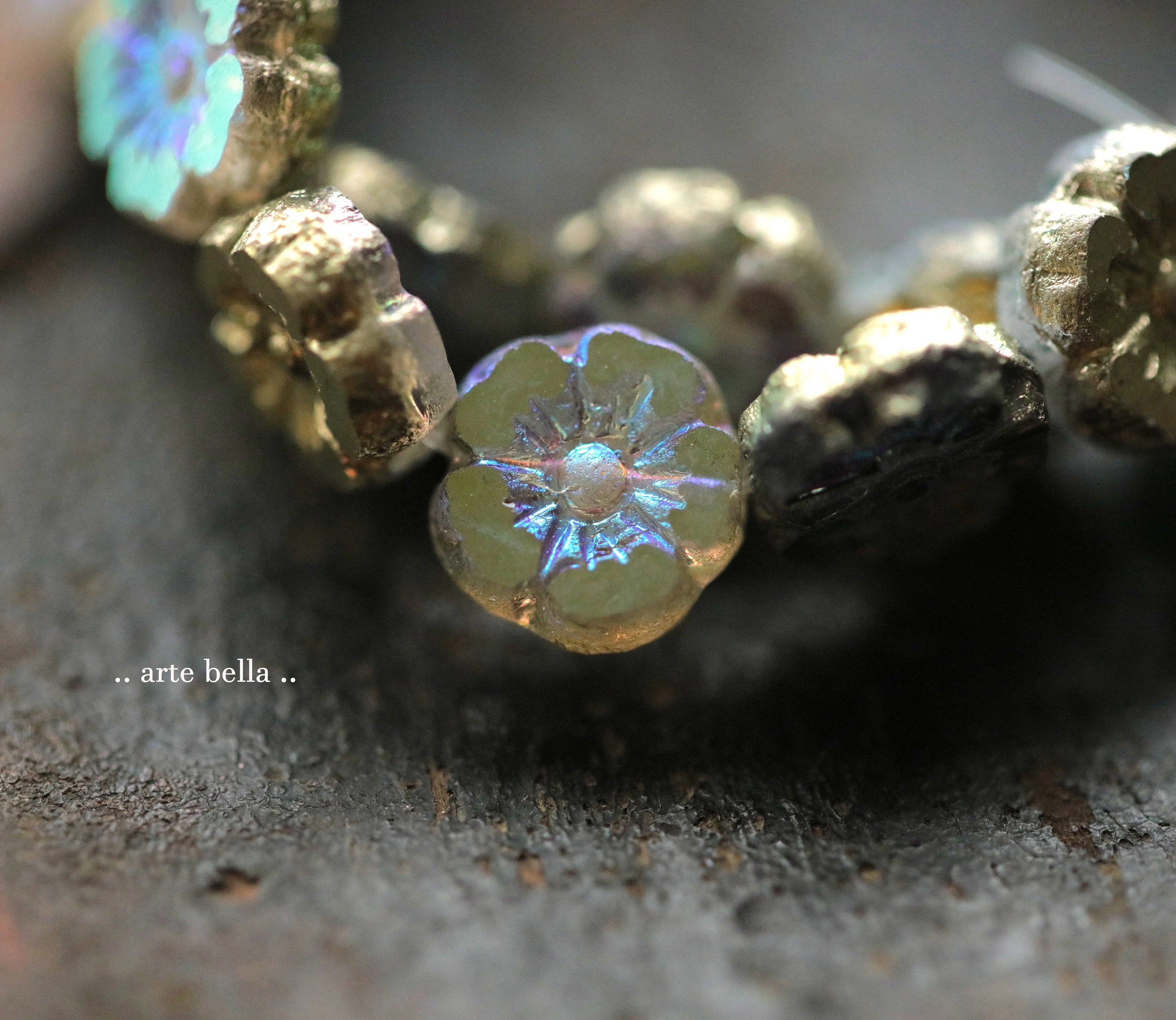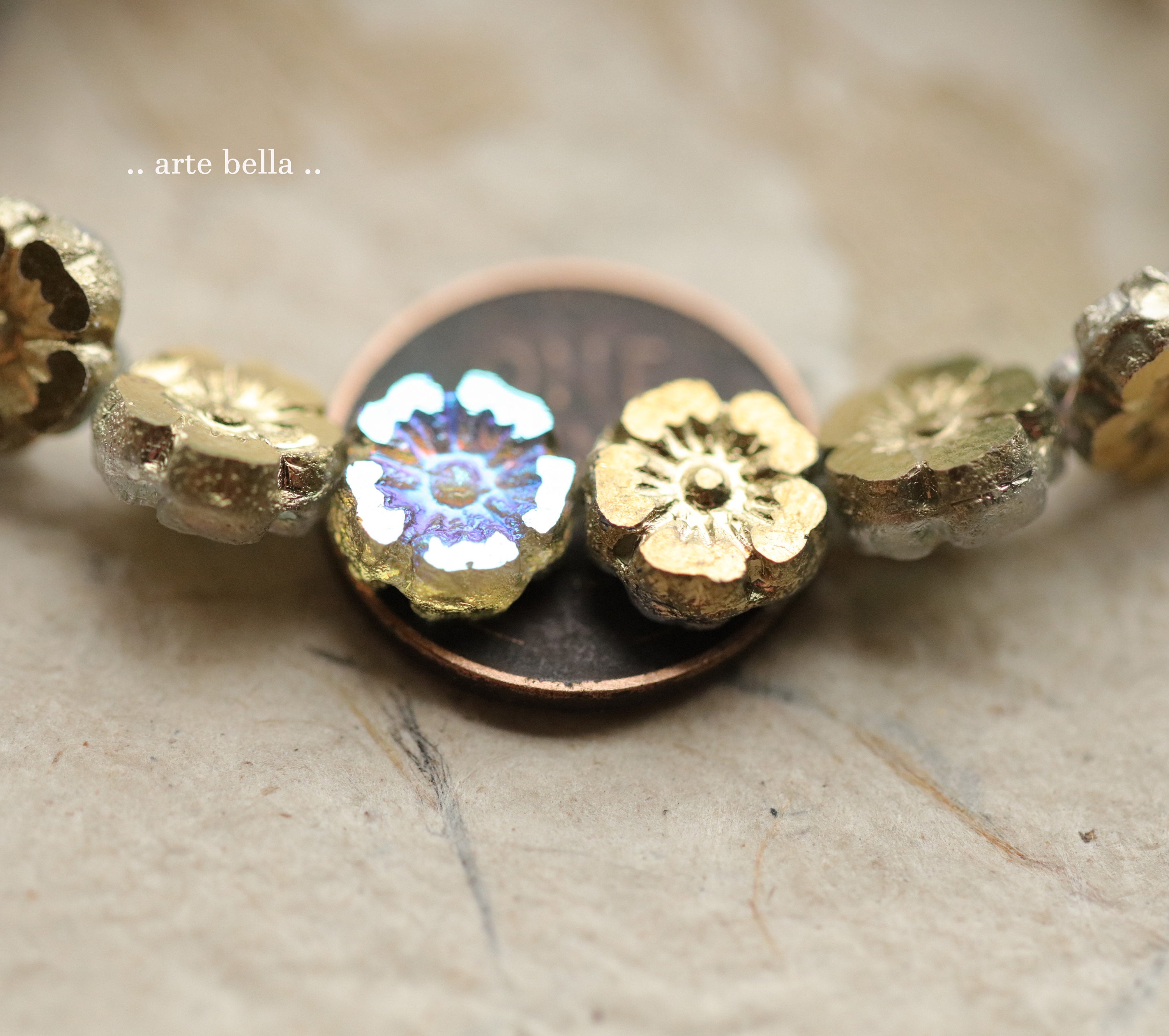 last ones .. MYSTIC GOLD BLOOMS .. 16 Premium Czech Glass Hibiscus Flower Beads 10mm (9691-st) .. jewelry supplies