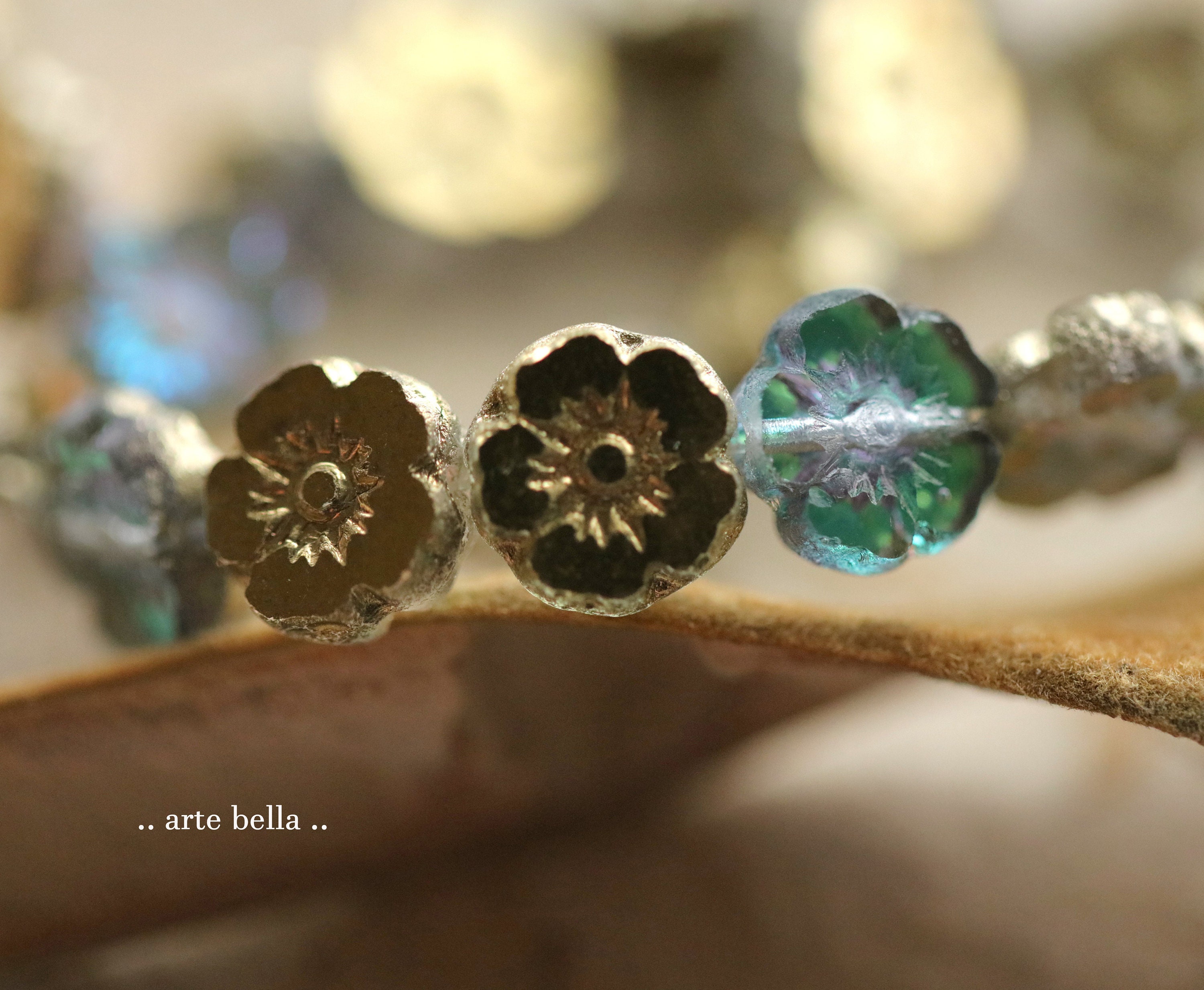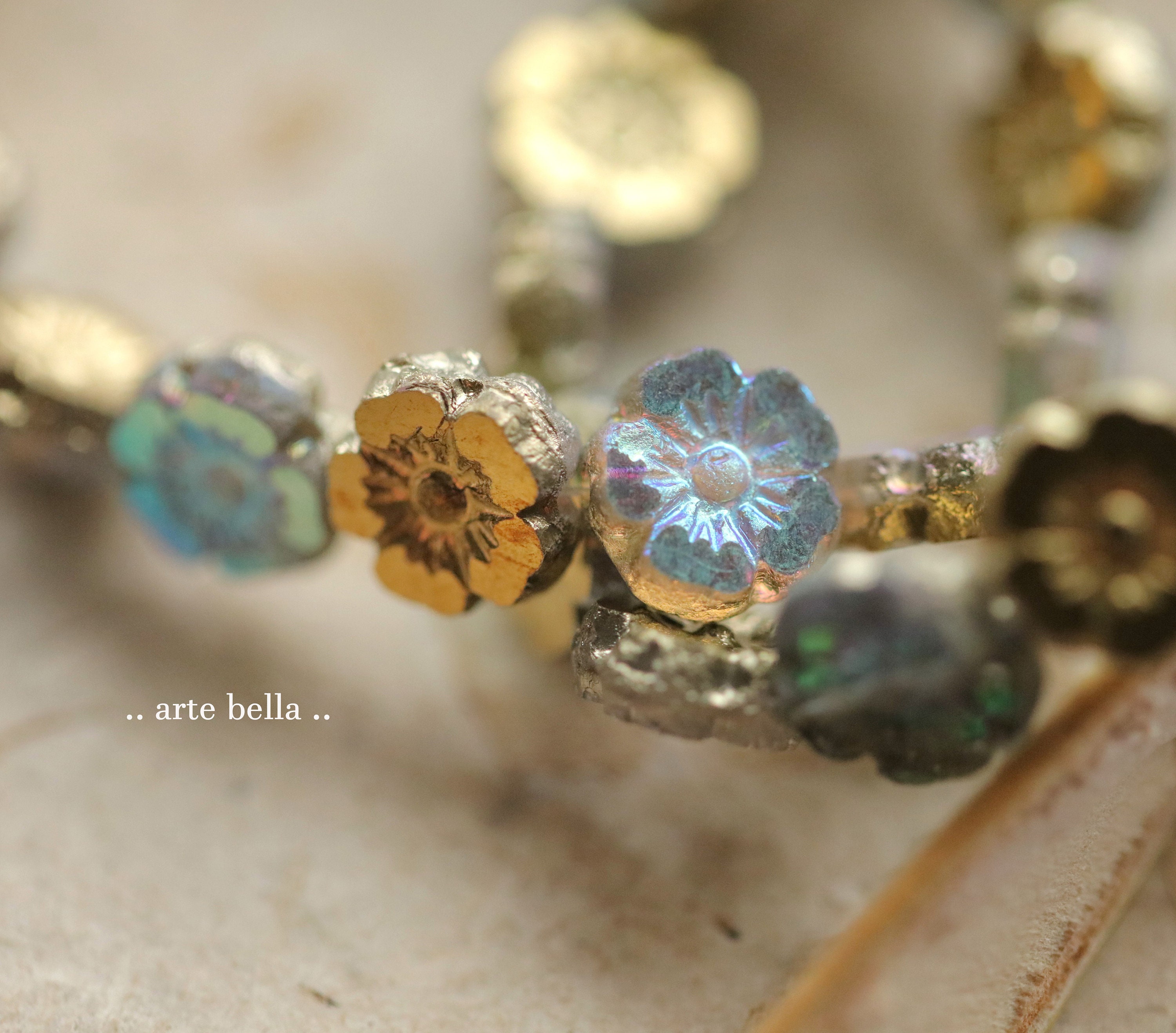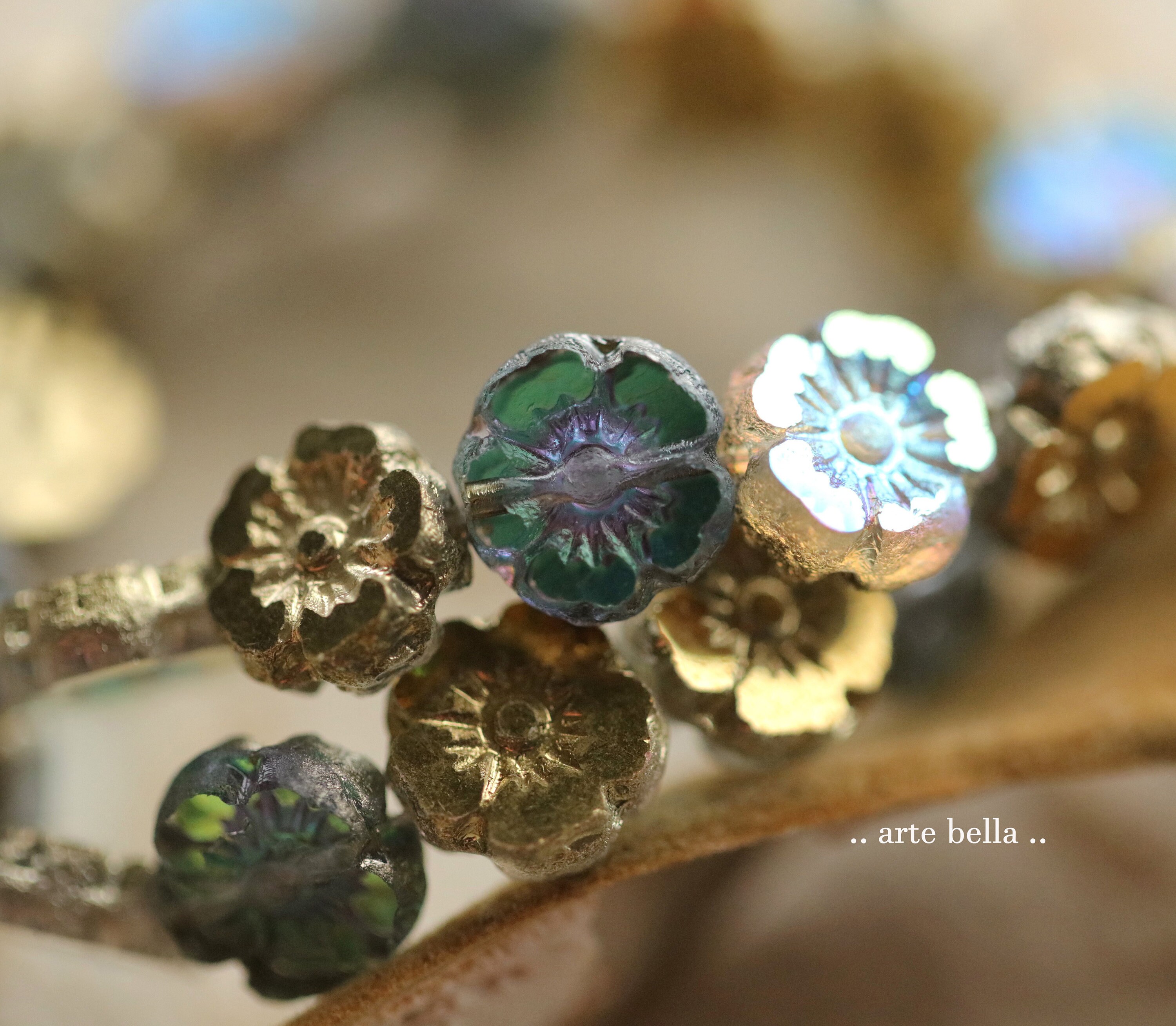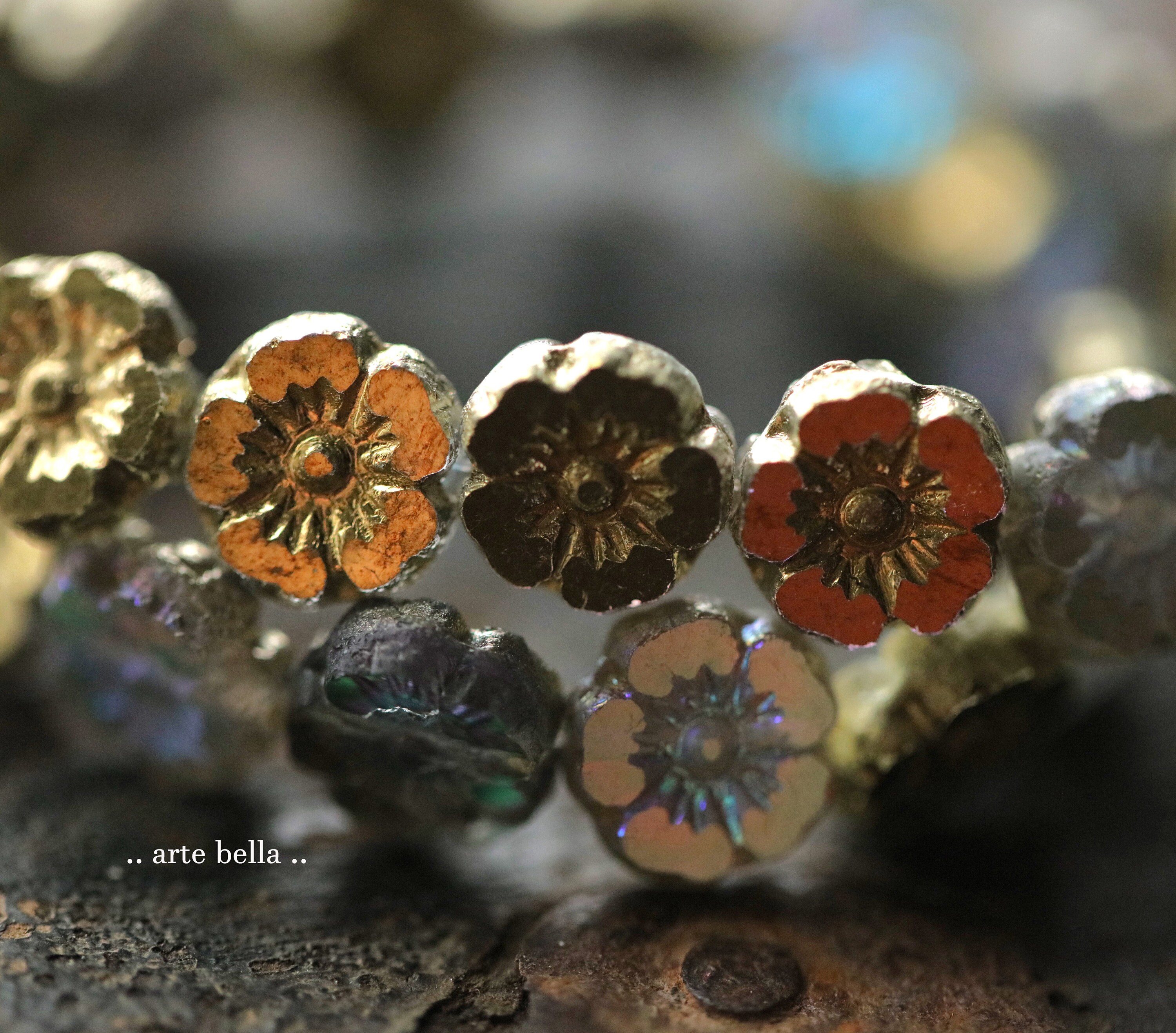 last ones .. MYSTIC GOLD BLOOMS .. 16 Premium Czech Glass Hibiscus Flower Beads 10mm (9691-st) .. jewelry supplies