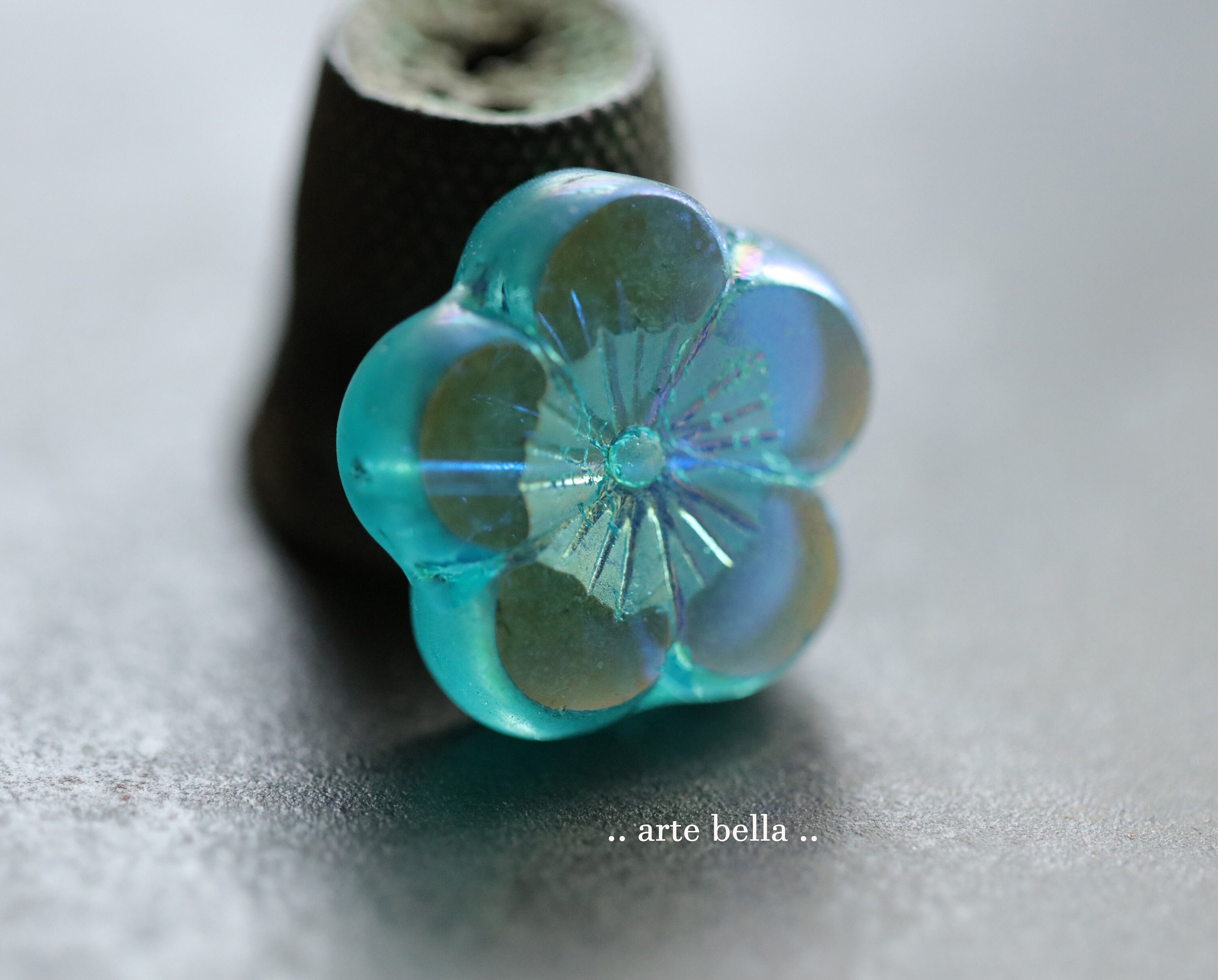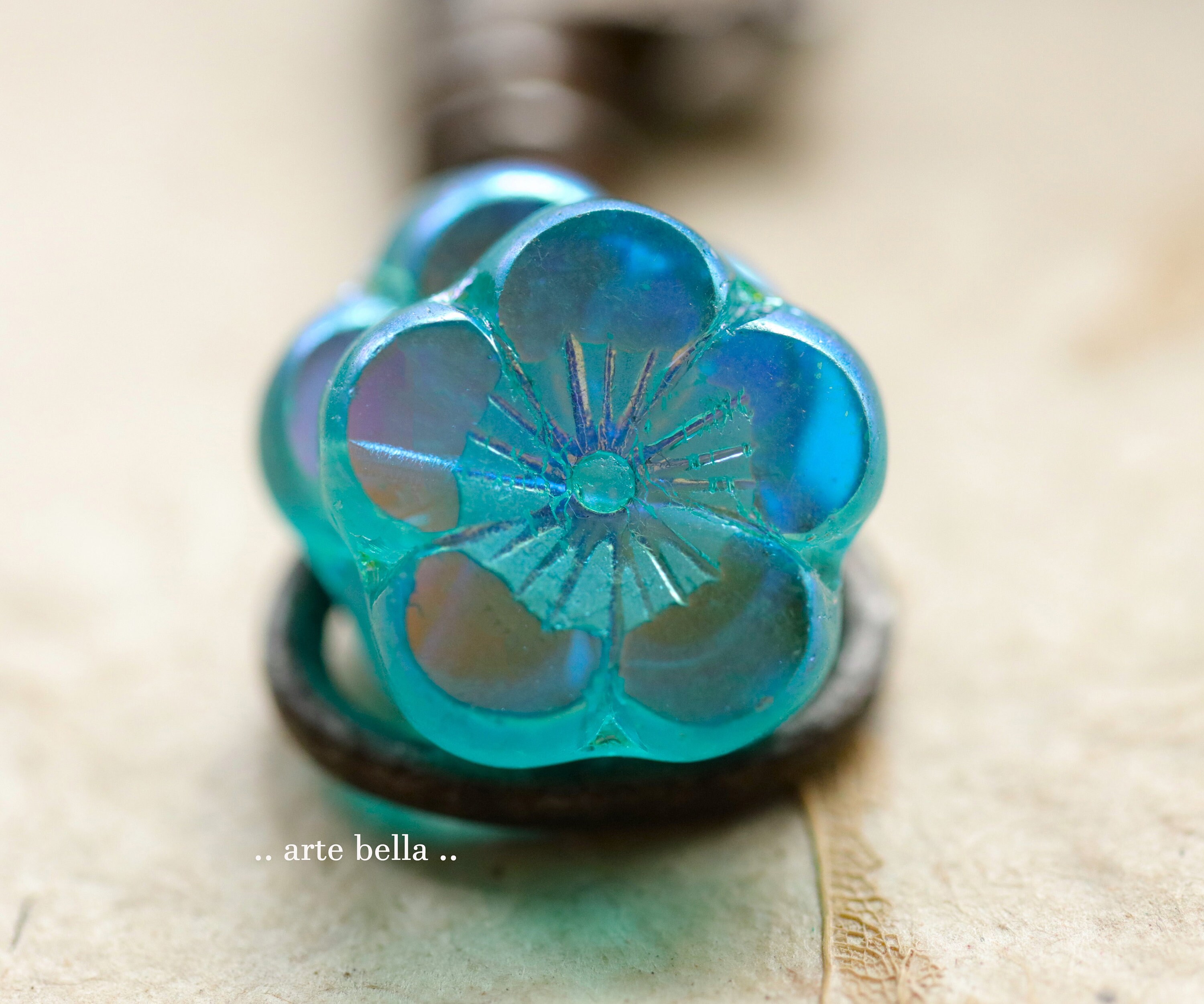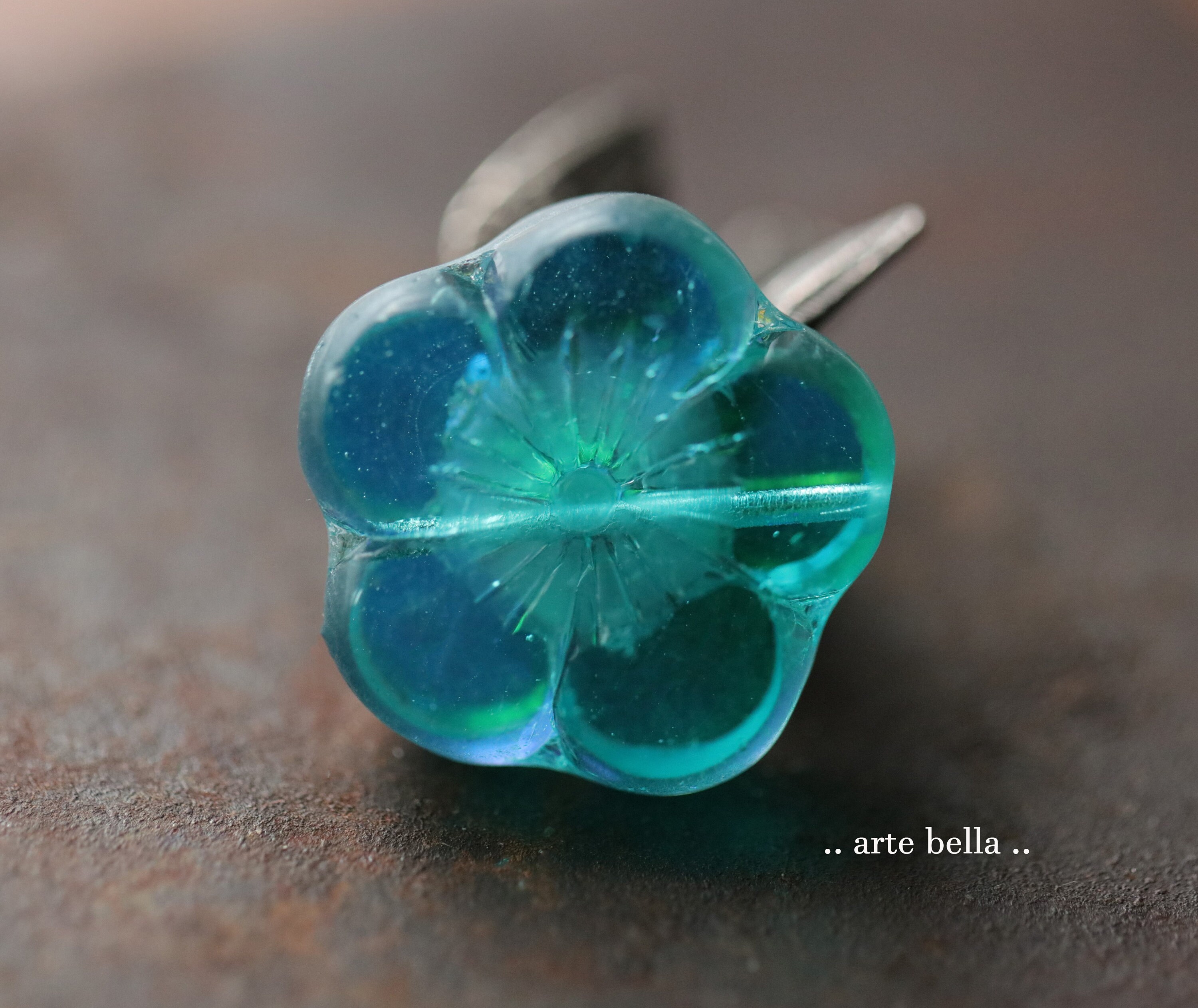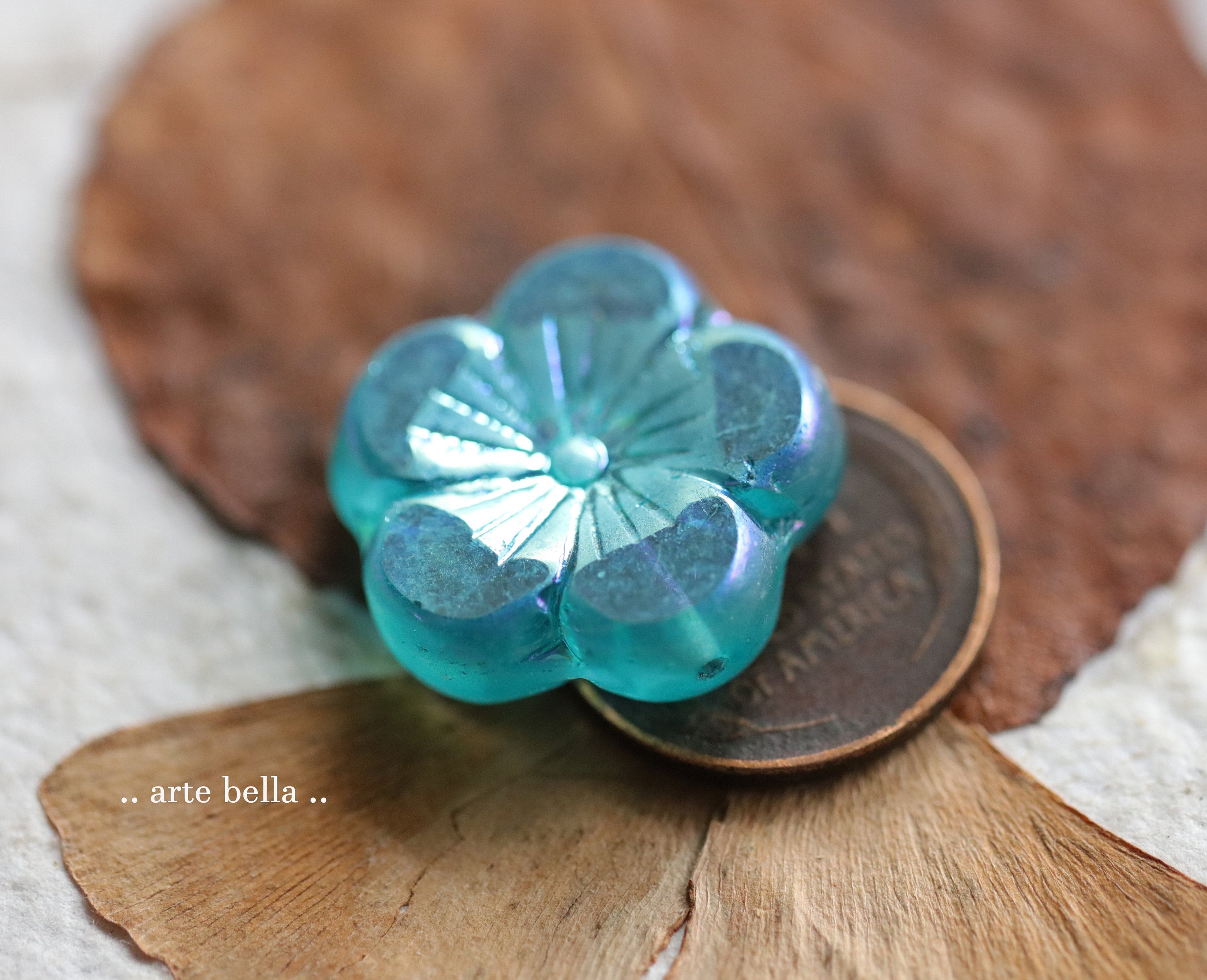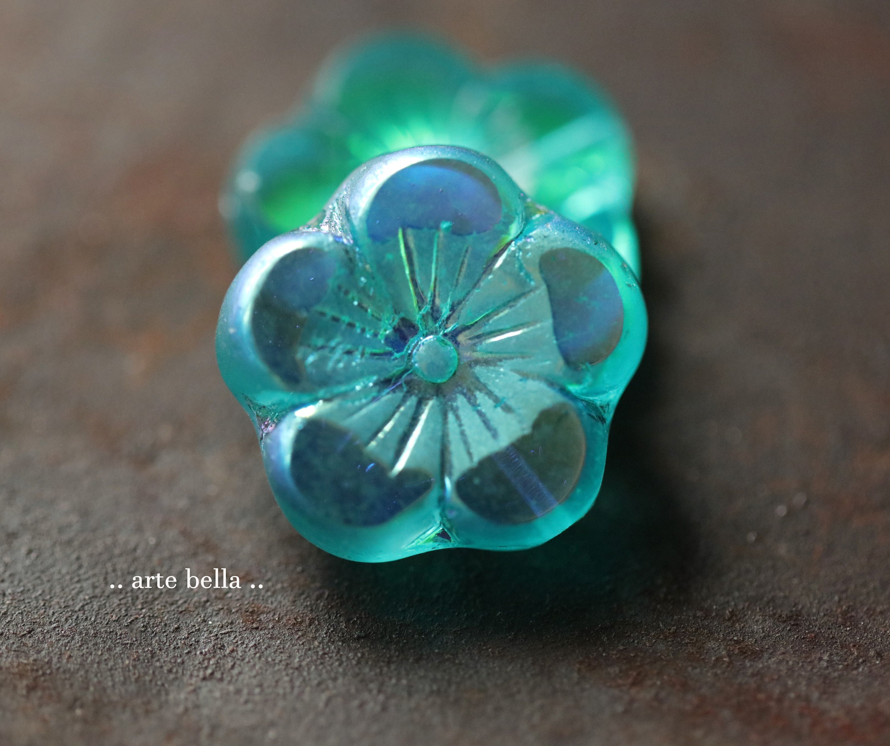 Translucent aqua teal glass with one side being mystic rainbow metallic Aurora Borealis and fire polished on the other. PLEASE NOTE: Beads are rustic in nature, with beads having chips along the edge and scratches as seen in my pictures. Also, each and every bead is unique in color and finish, you "WILL NOT" receive matching pairs.