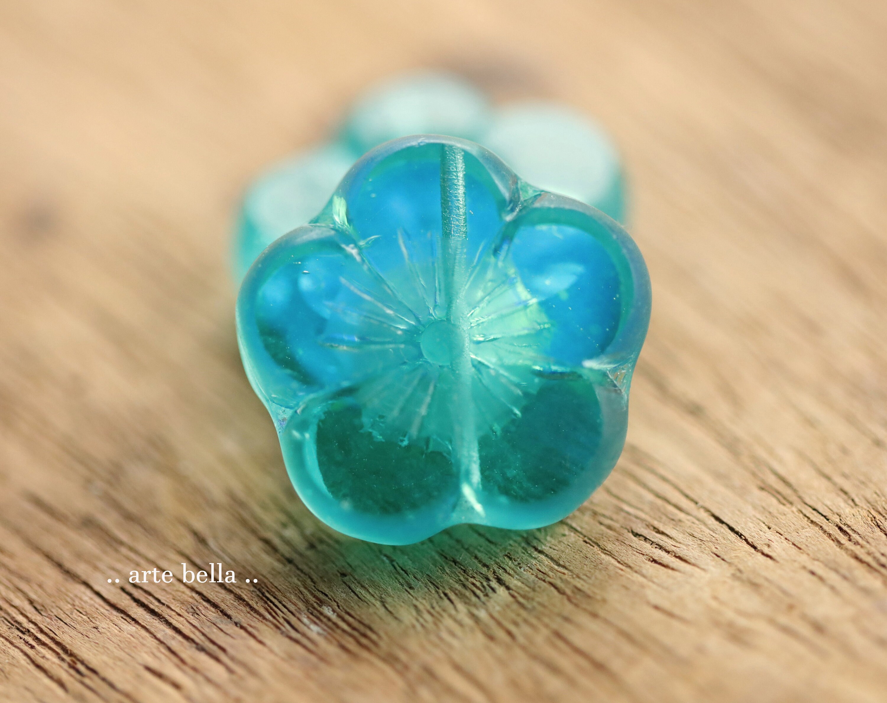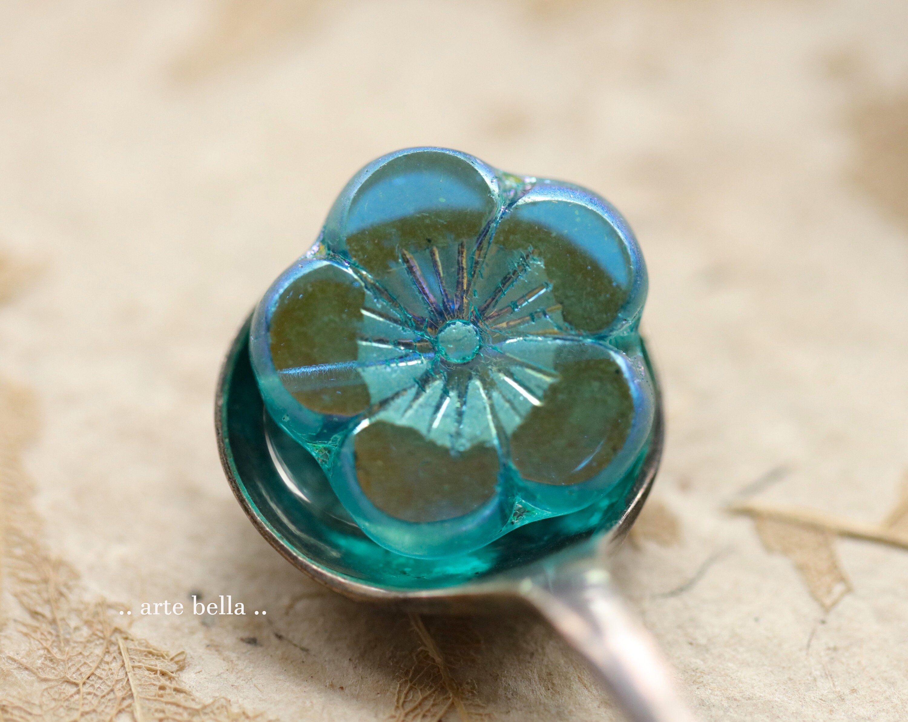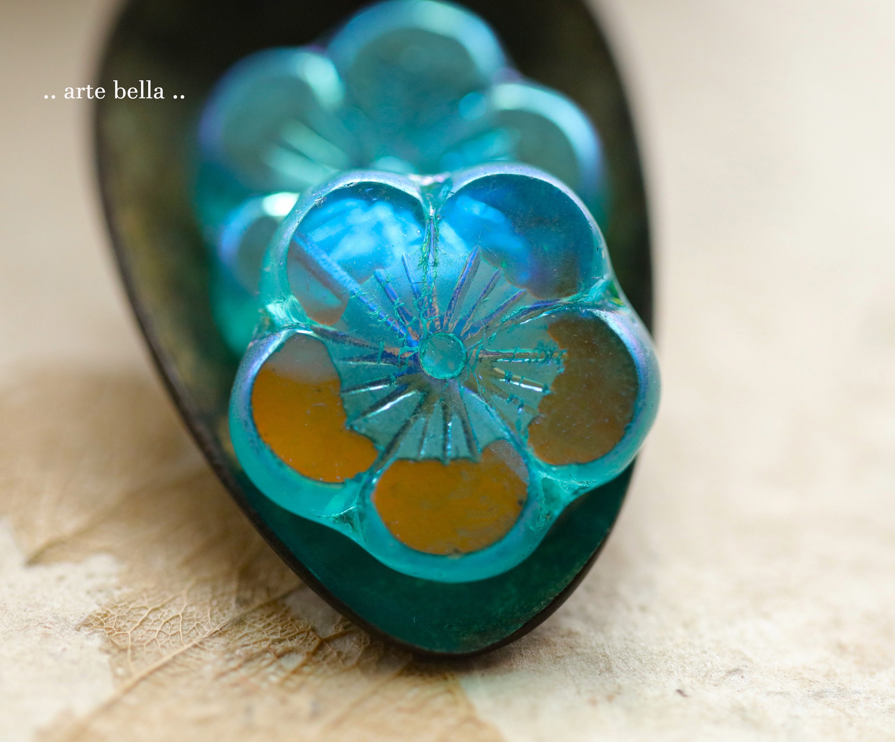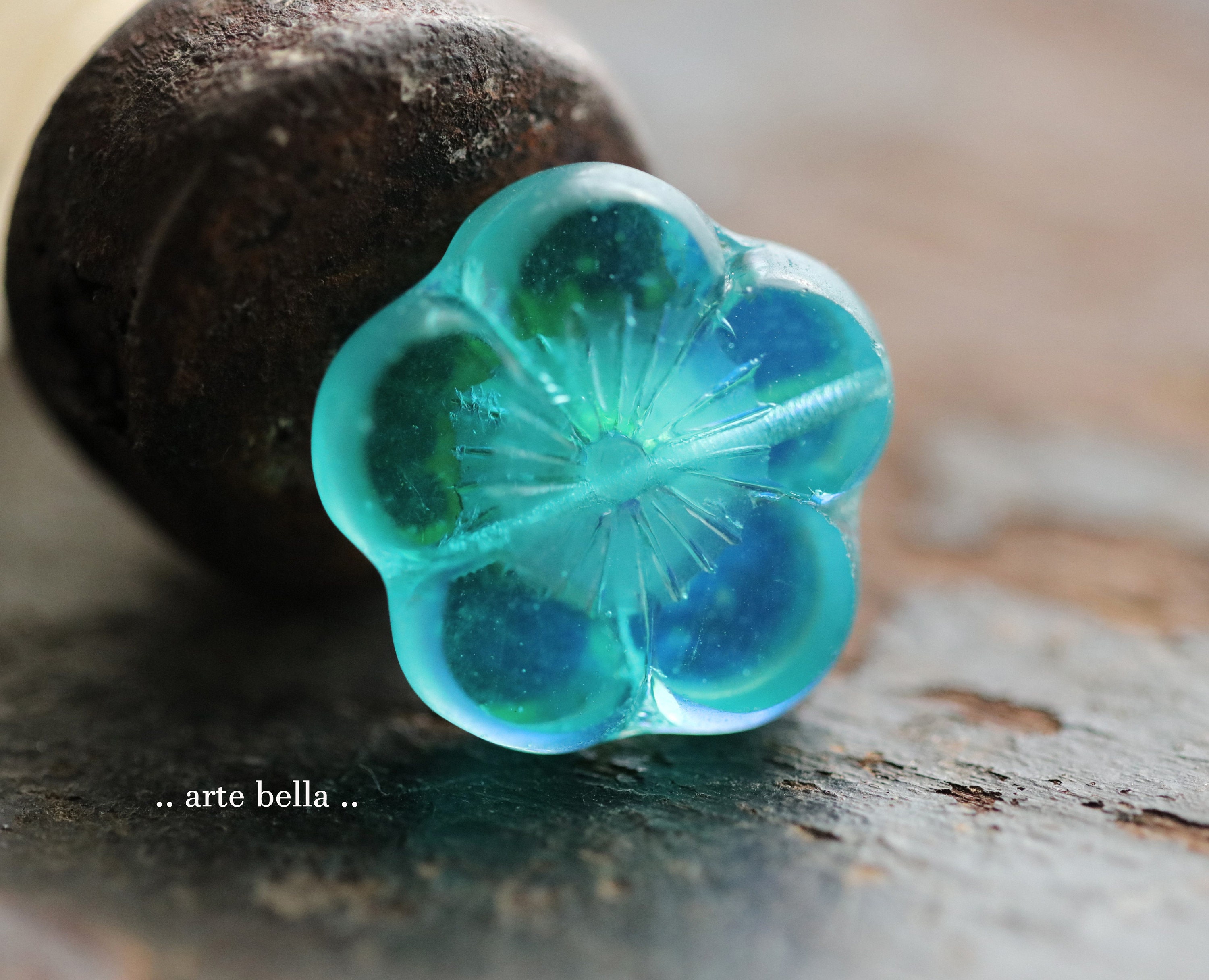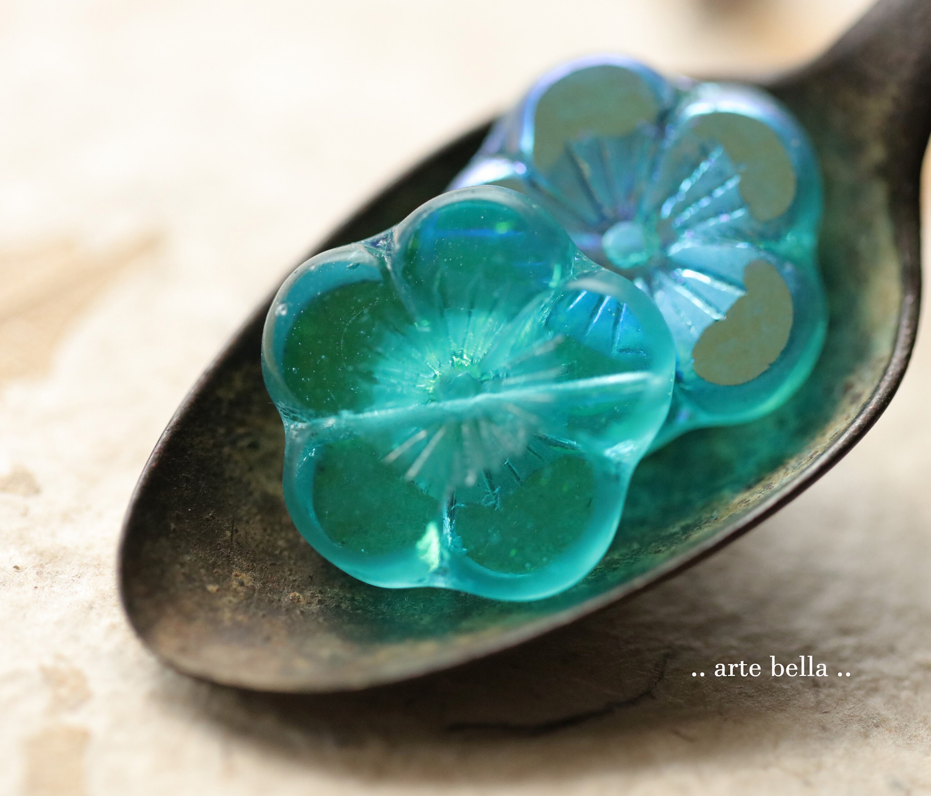 Translucent aqua teal glass with one side being mystic rainbow metallic Aurora Borealis and fire polished on the other. PLEASE NOTE: Beads are rustic in nature, with beads having chips along the edge and scratches as seen in my pictures. Also, each and every bead is unique in color and finish, you "WILL NOT" receive matching pairs.