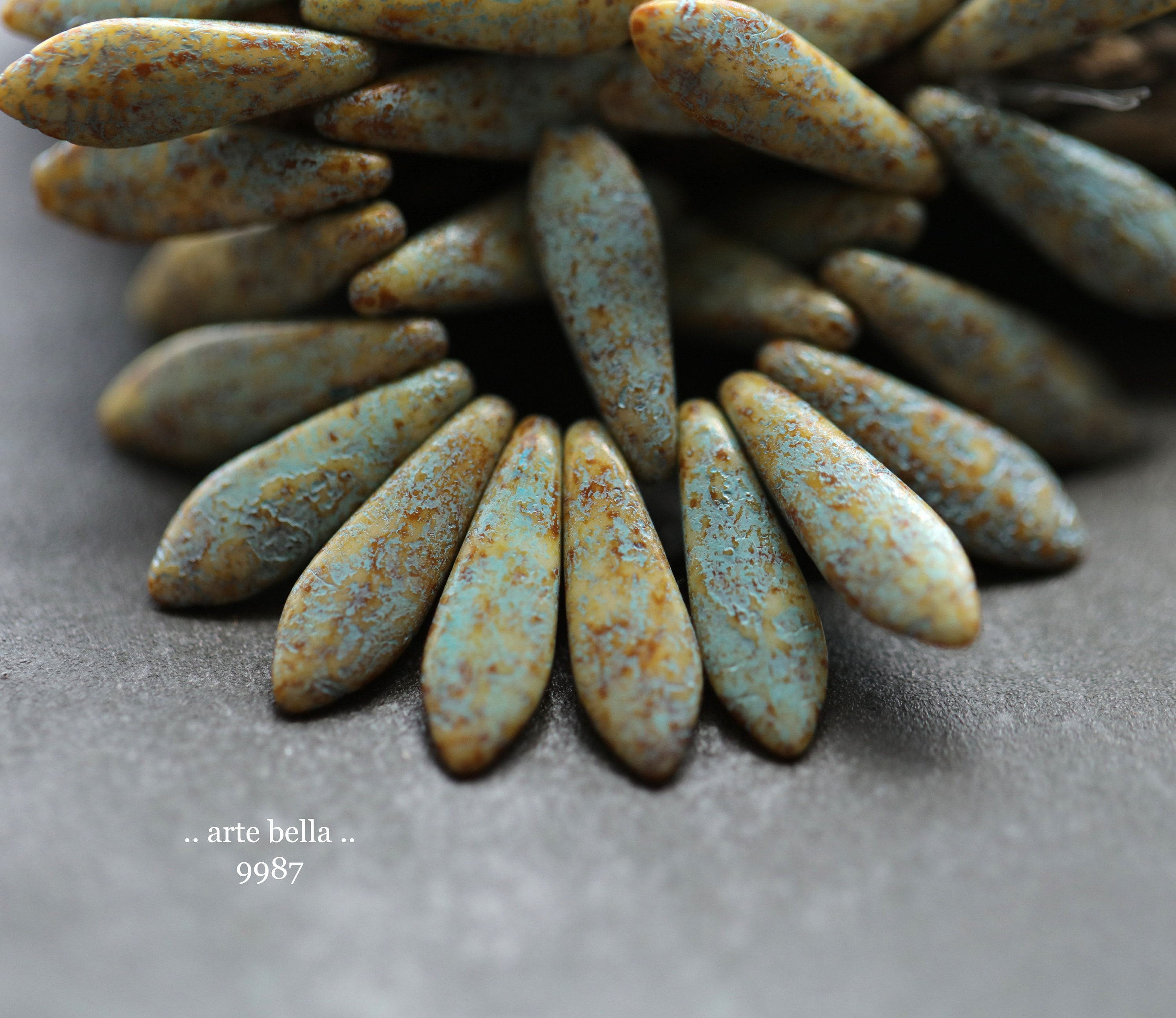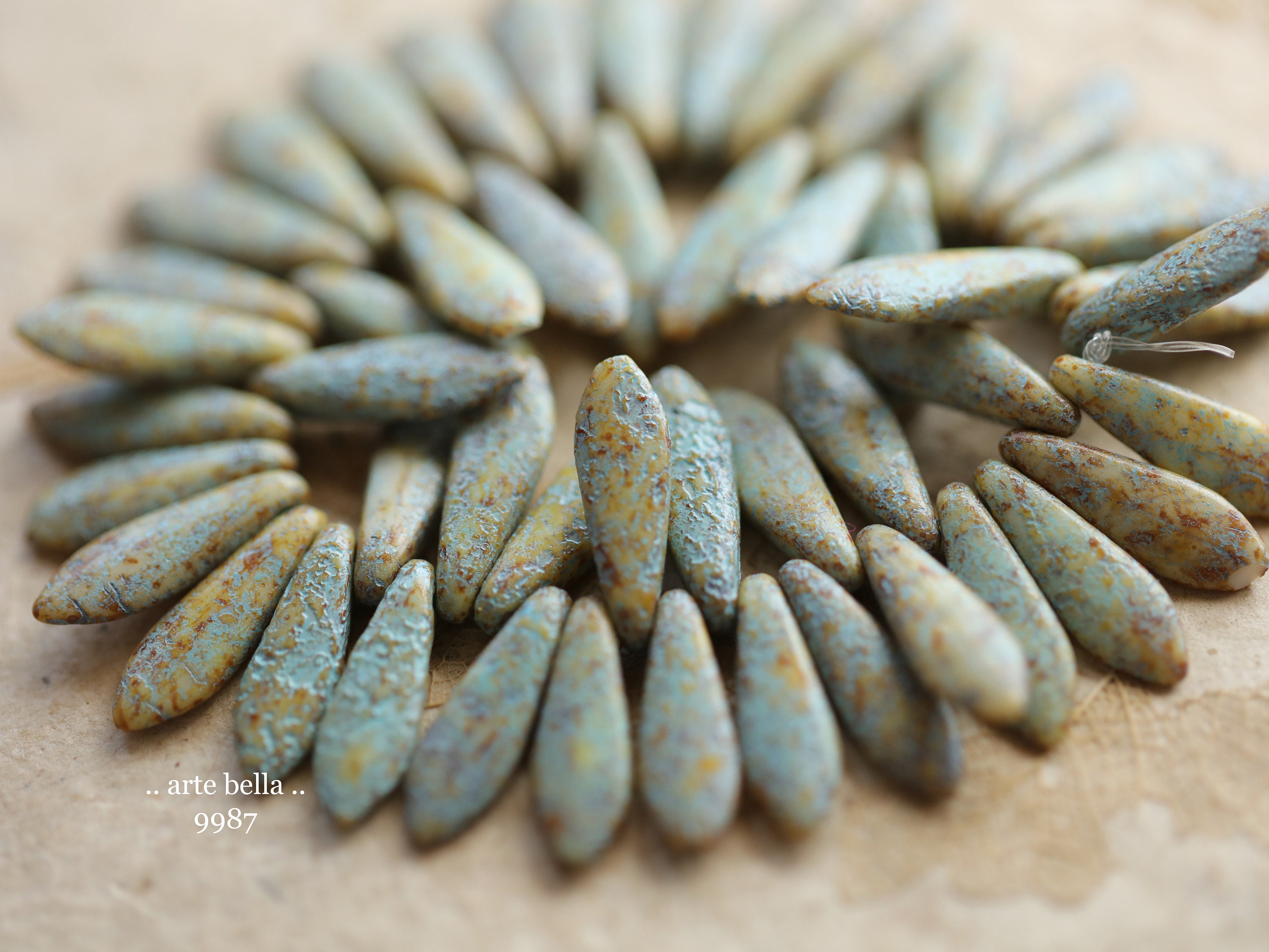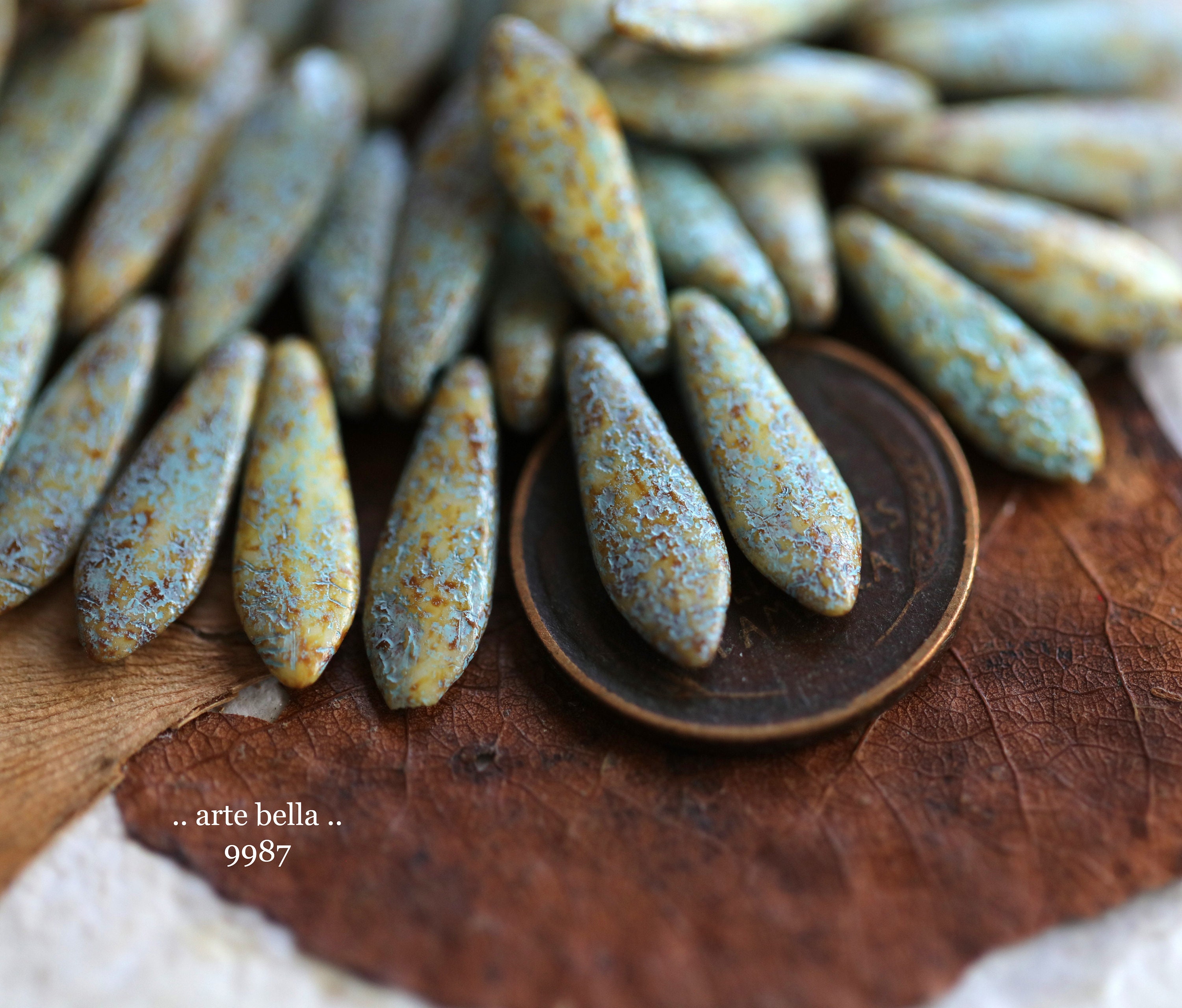 back in stock .. BLUE SAND DAGGERS .. 50 Premium Rustic Etched Picasso Czech Glass Dagger Beads 5x16mm (9987-st) .. jewelry supplies