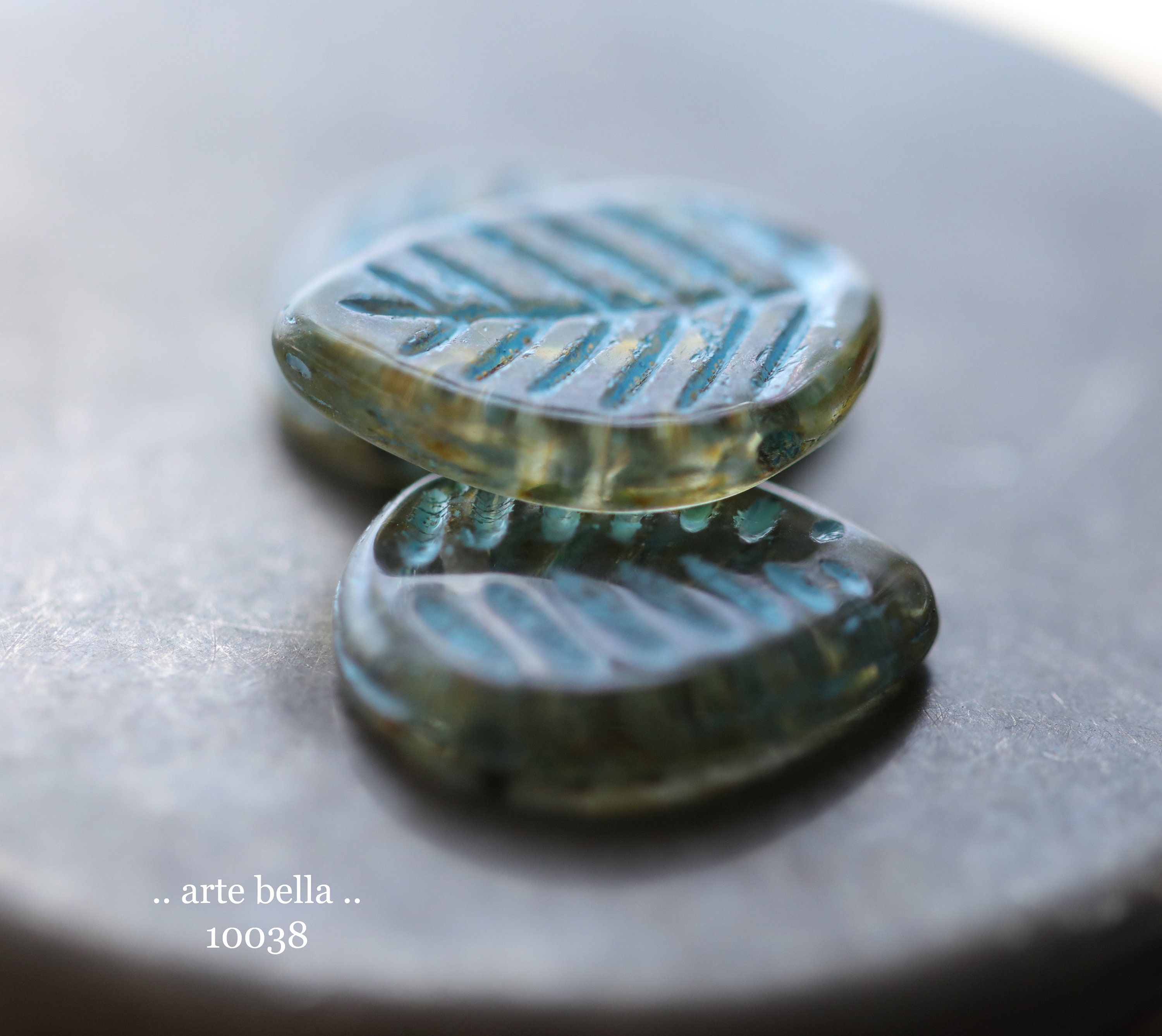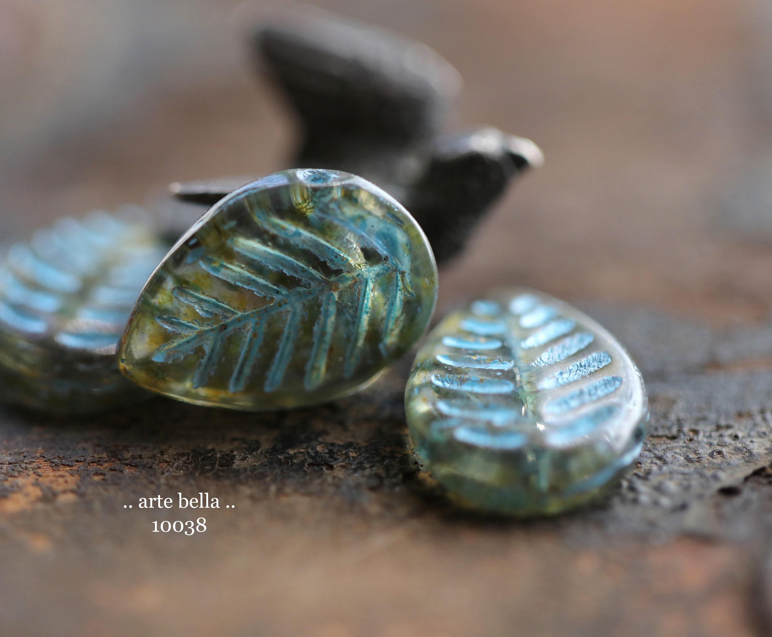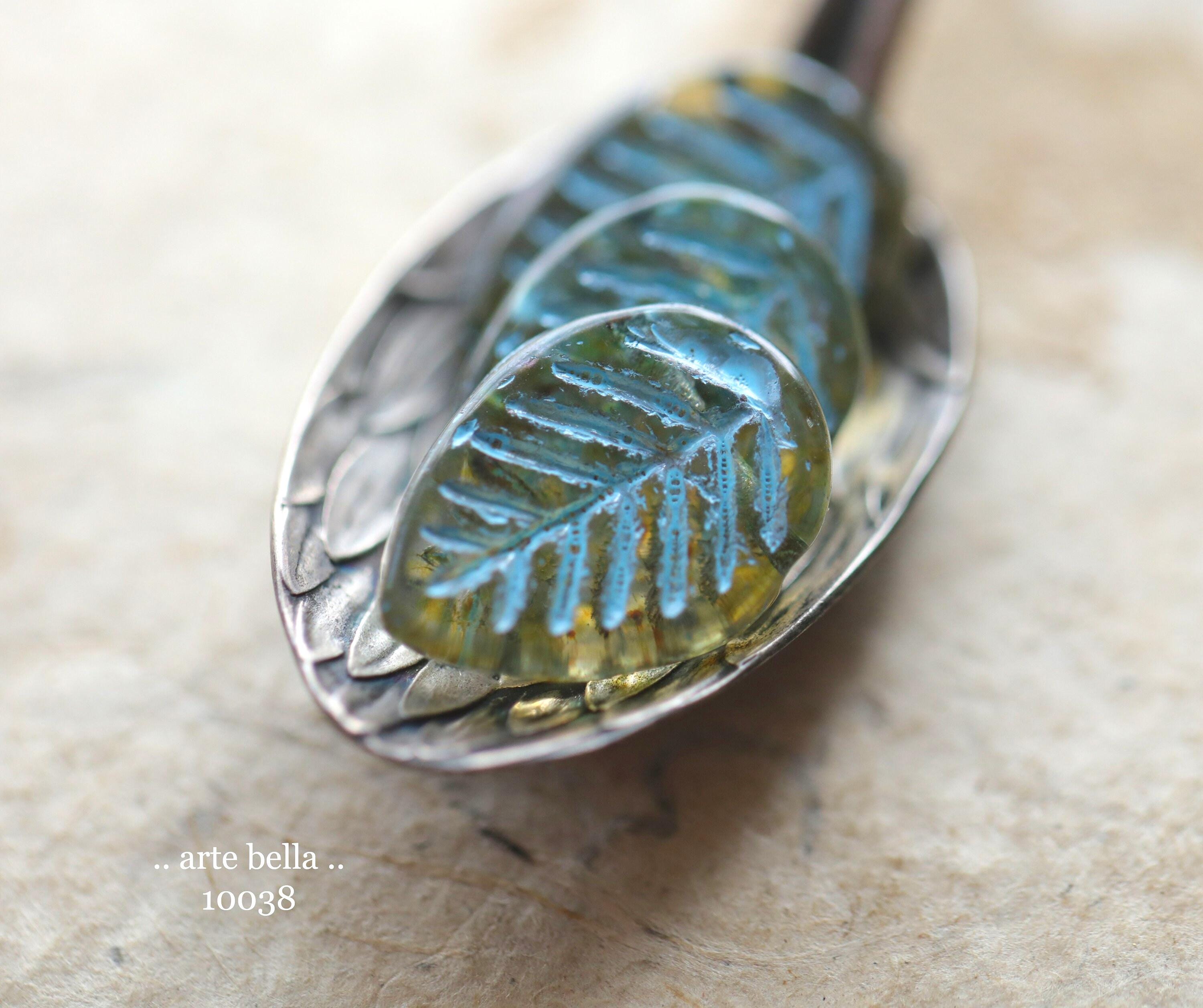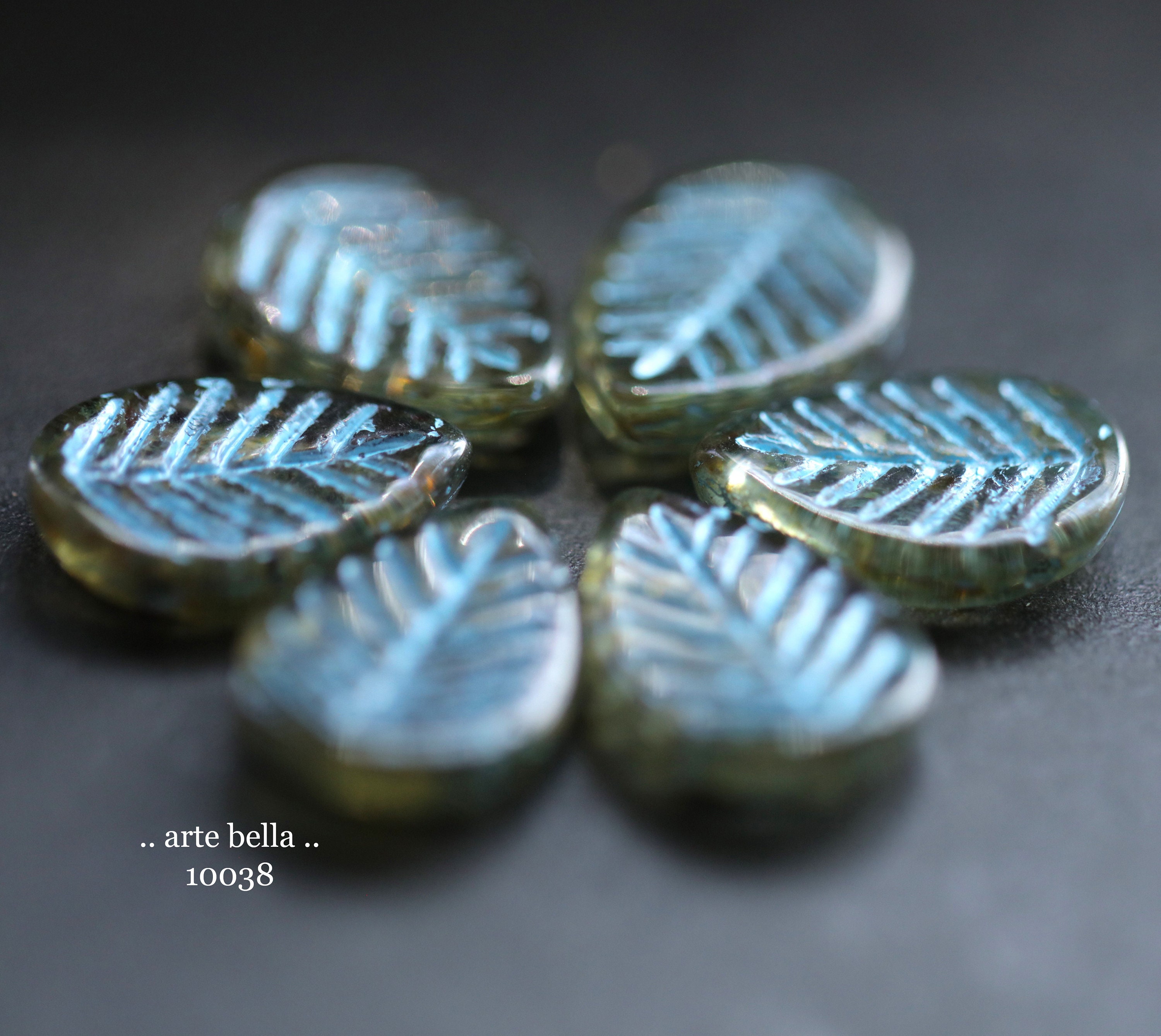 back in stock .. BLUE HONEY LEAVES .. 8 Premium Picasso Czech Glass Dogwood Leaf Beads 12x16mm (10038-8) .. jewelry supplies