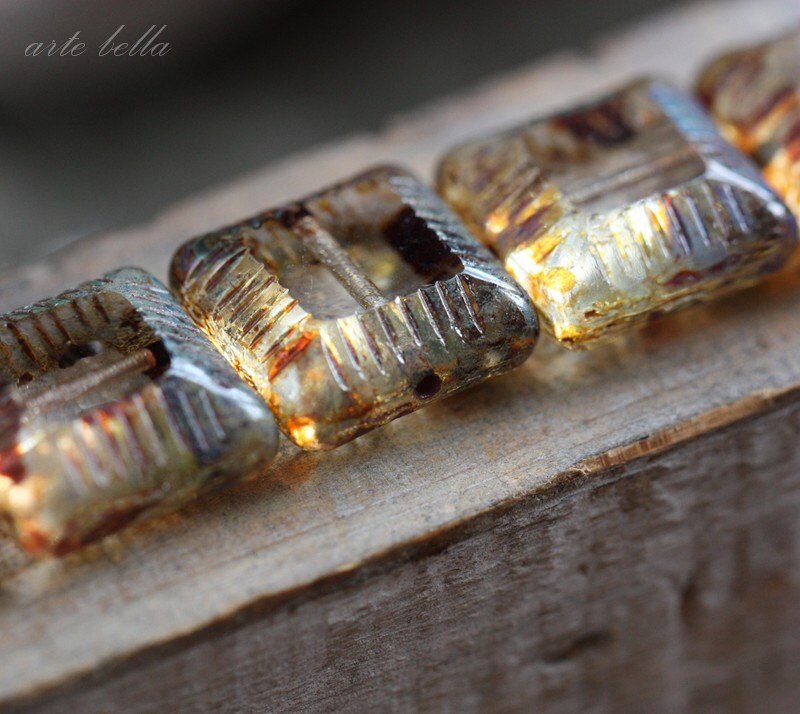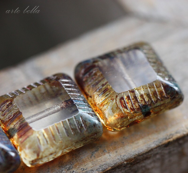 SLICK .. 6 Premium Picasso Czech Glass Chunky Square Beads 13.5x6mm (3560-6) .. jewelry supplies