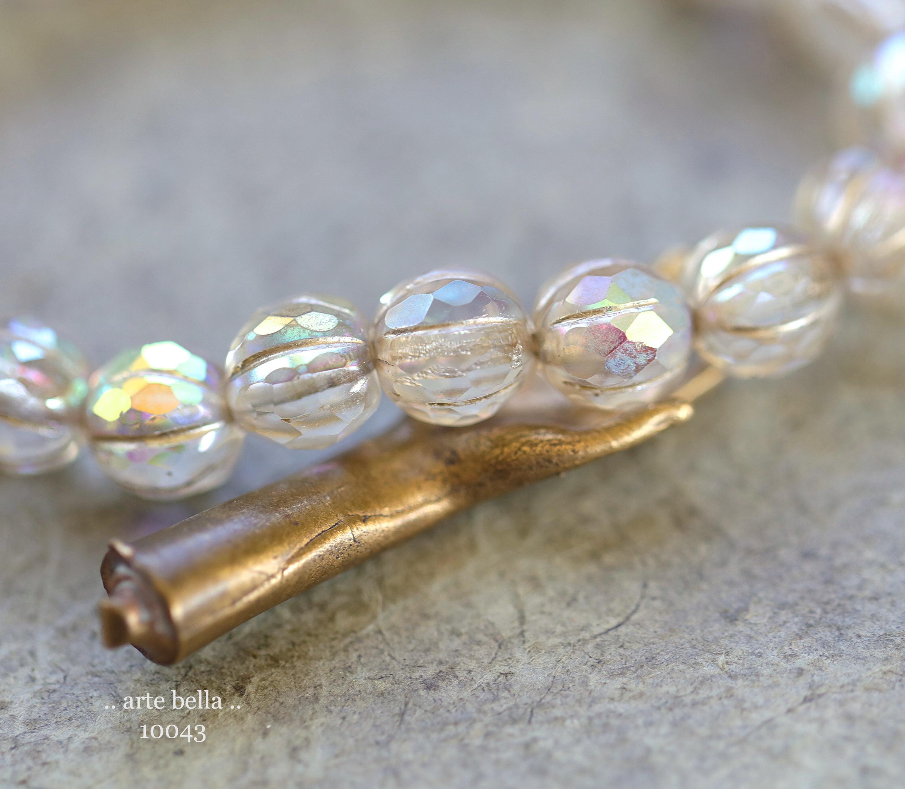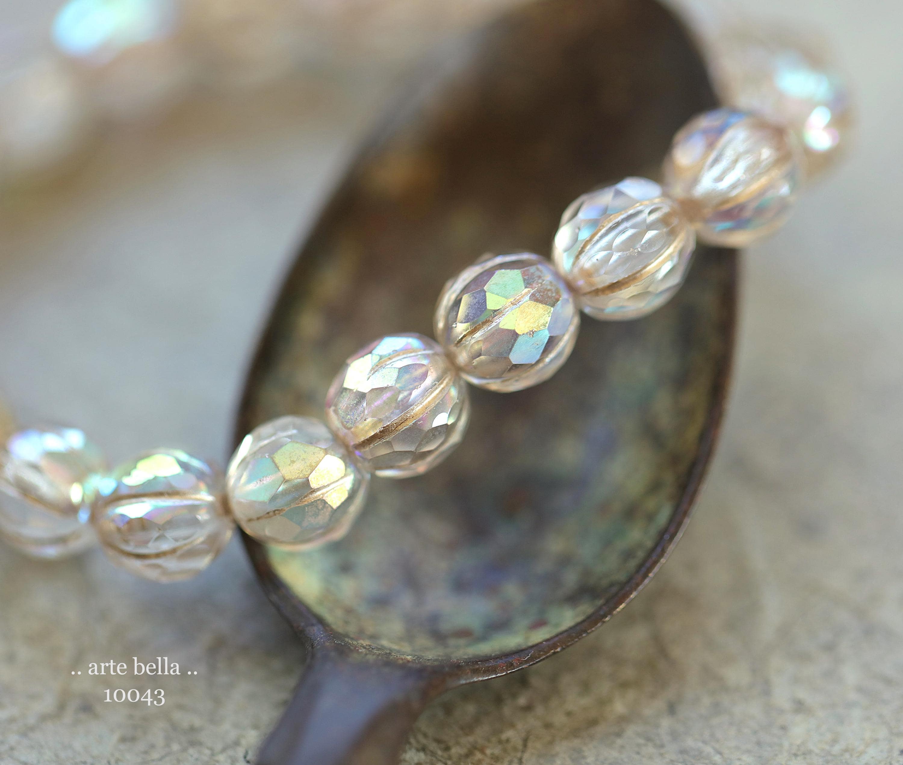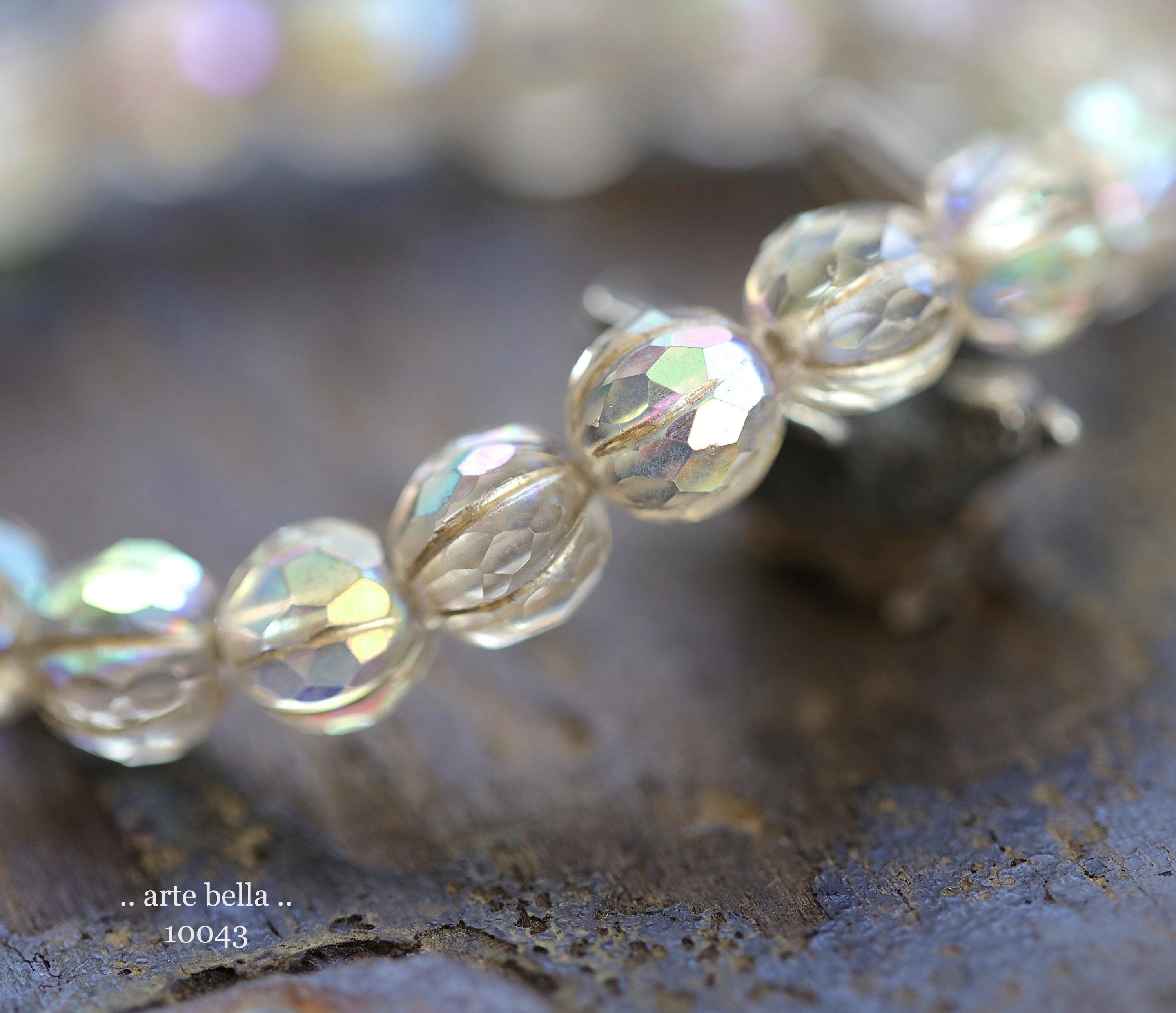 Gorgeous faceted melon beads in clear glass with a light silver beige metallic wash, Aurora Borealis and fire polished finish. PLEASE NOTE: These are not perfectly manufactured beads .. they are hand faceted and are not perfectly round as seen in my pictures. These have a vintage vibe going on.