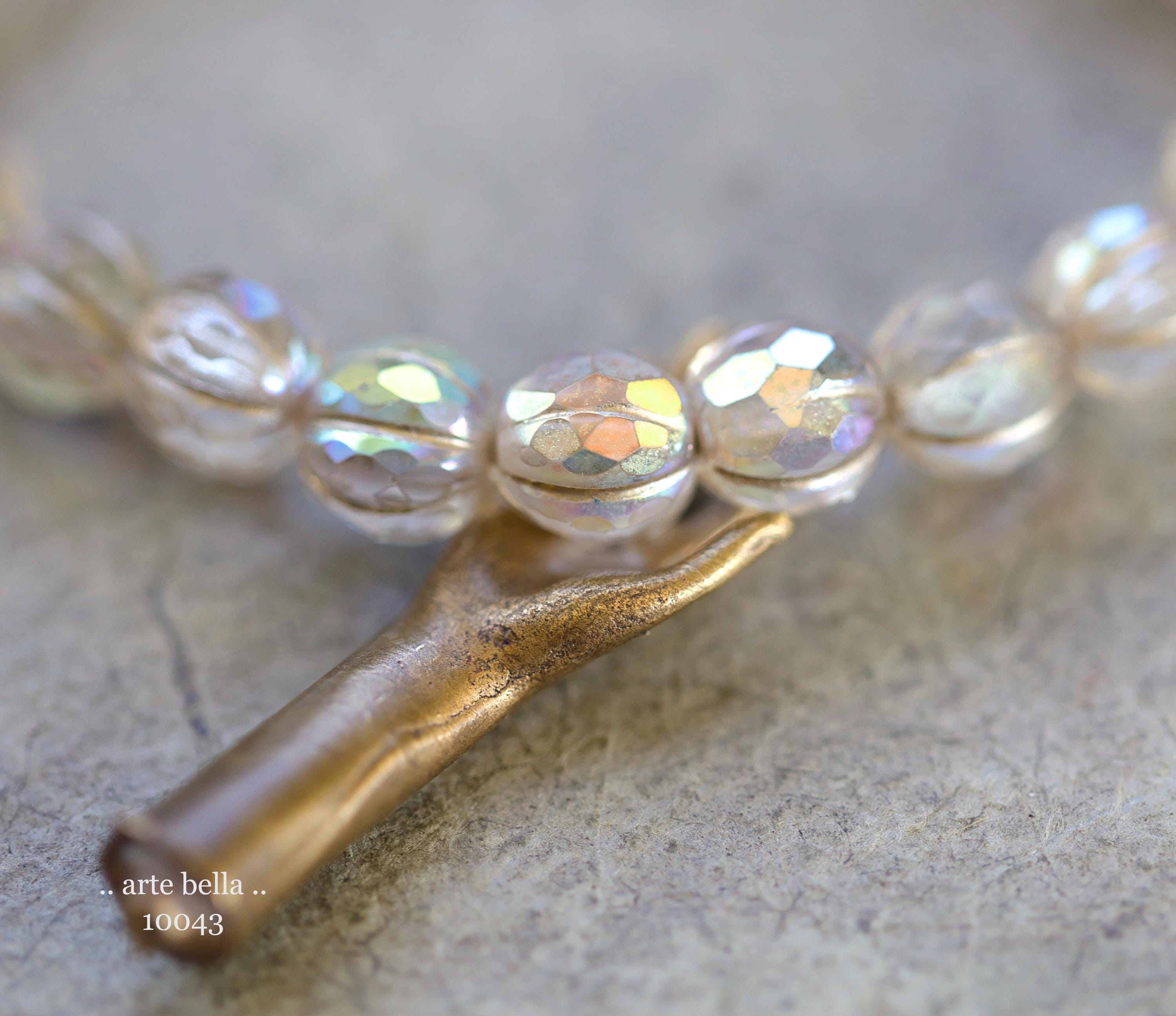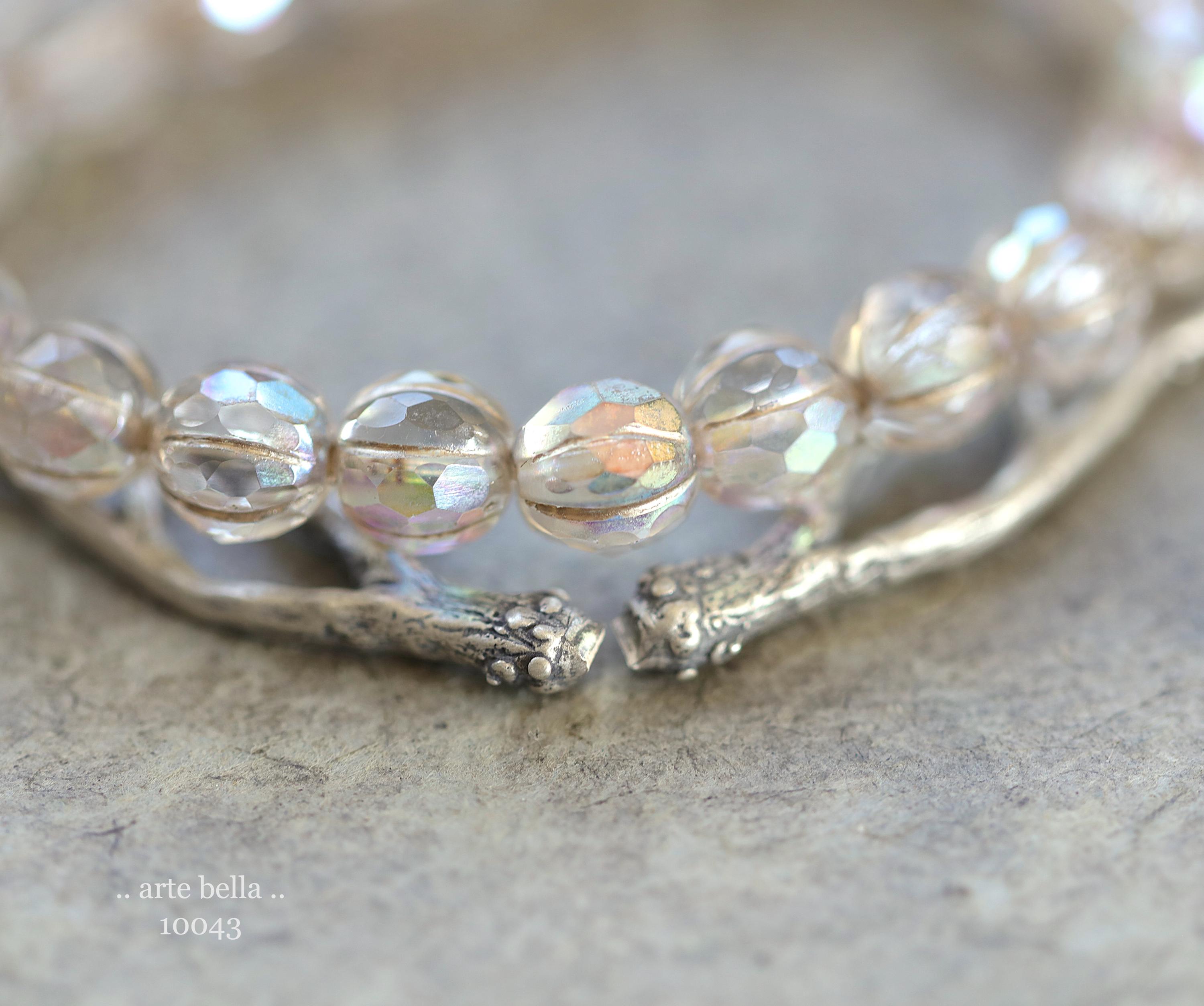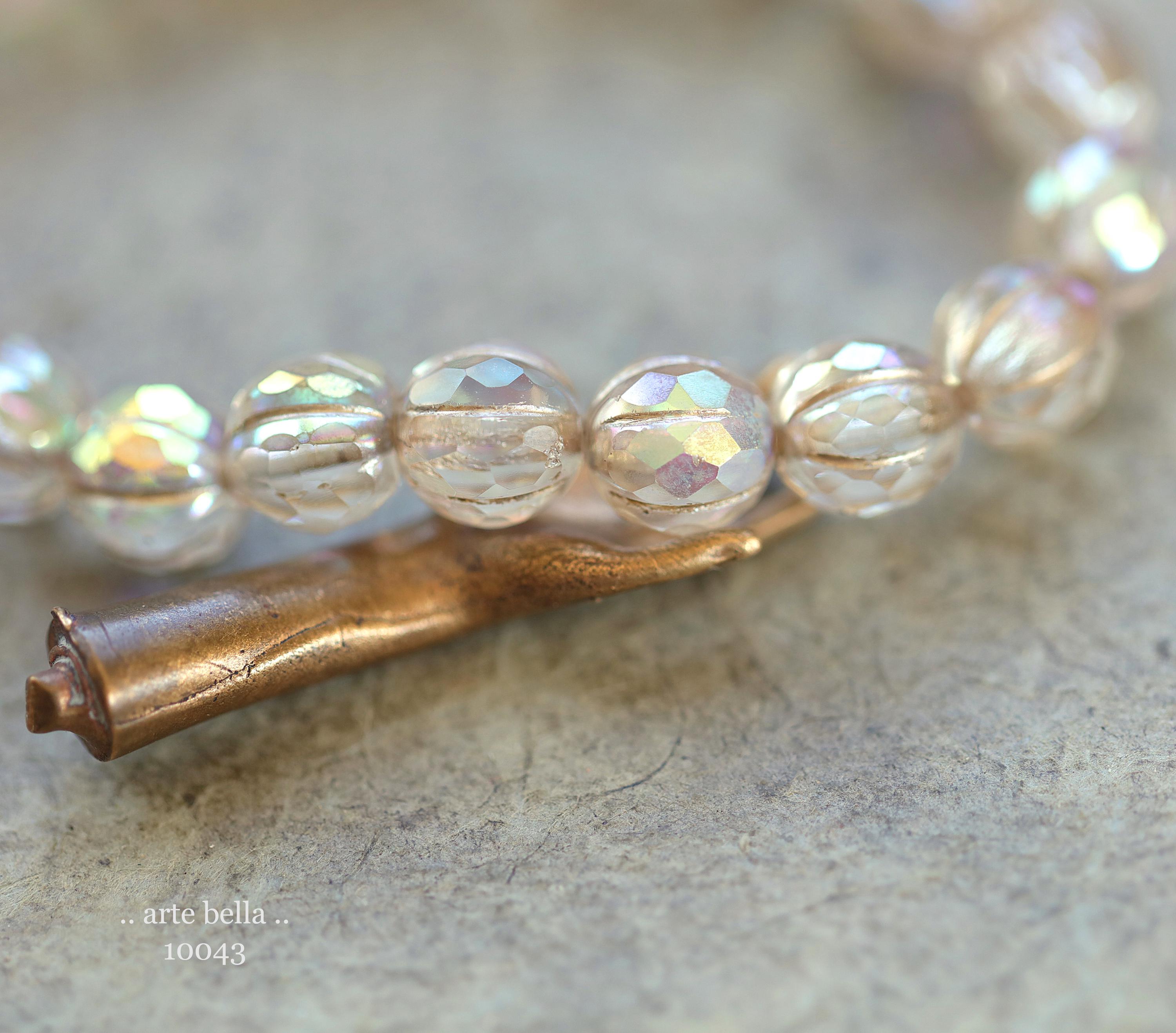 Gorgeous faceted melon beads in clear glass with a light silver beige metallic wash, Aurora Borealis and fire polished finish. PLEASE NOTE: These are not perfectly manufactured beads .. they are hand faceted and are not perfectly round as seen in my pictures. These have a vintage vibe going on.