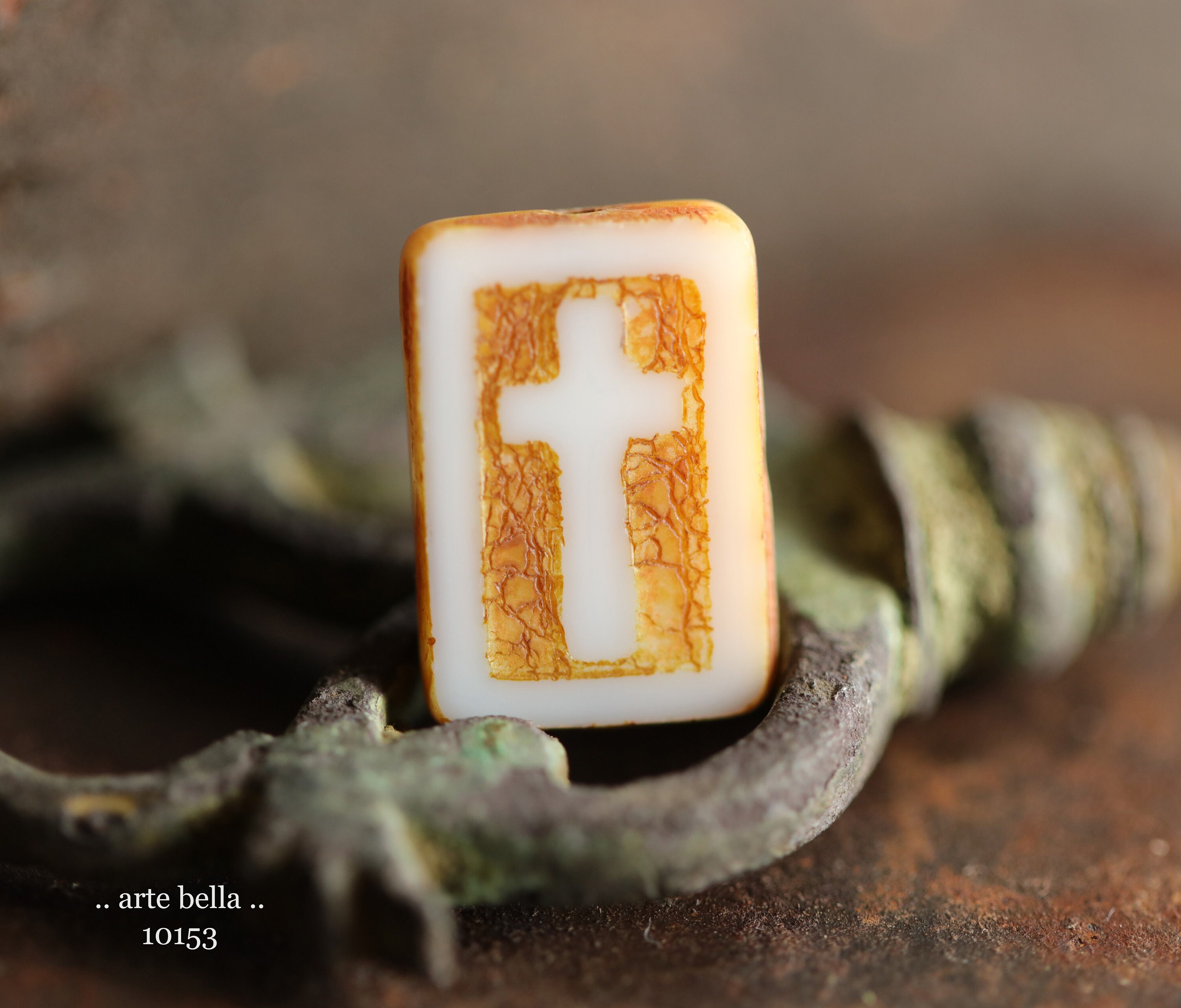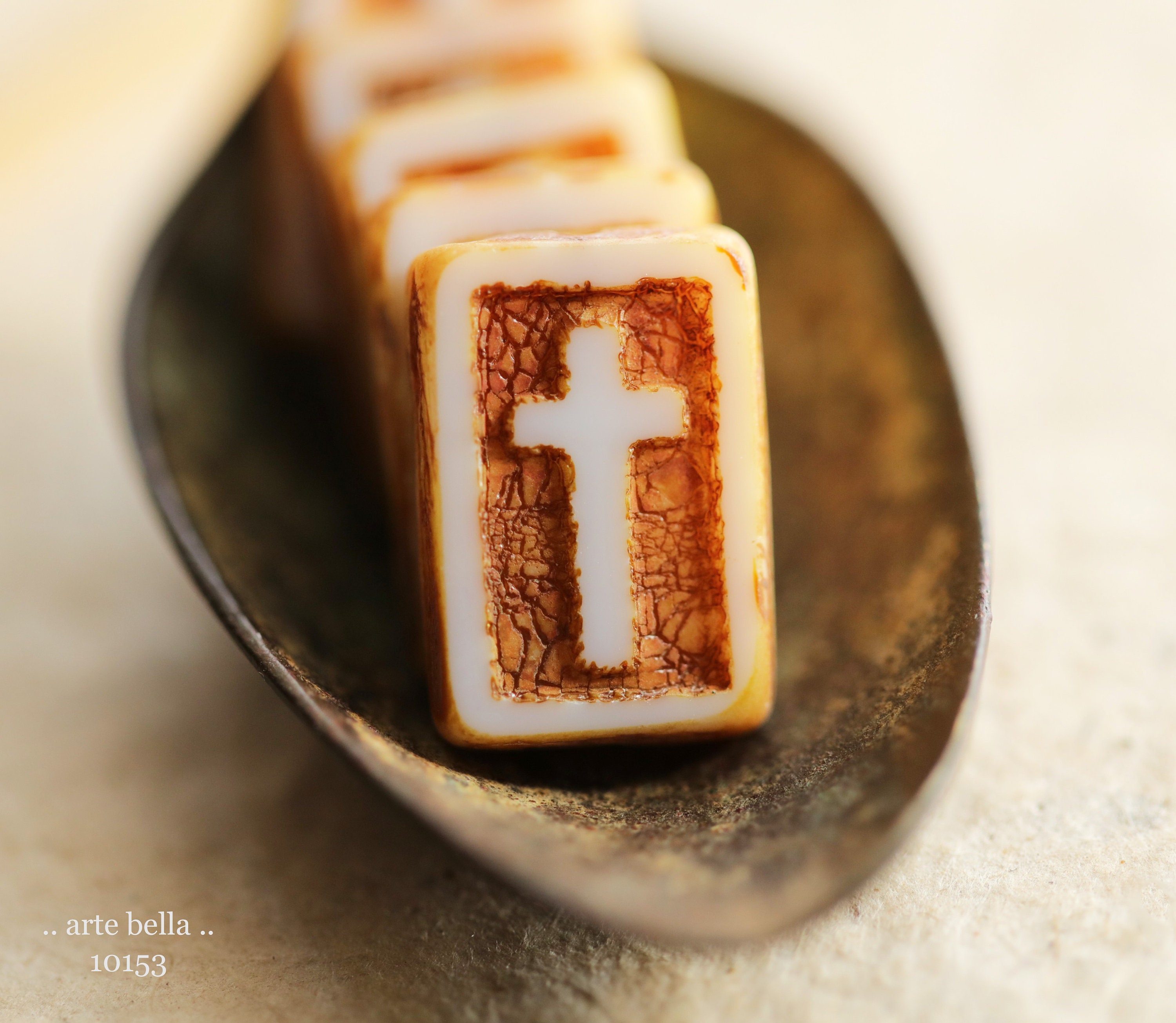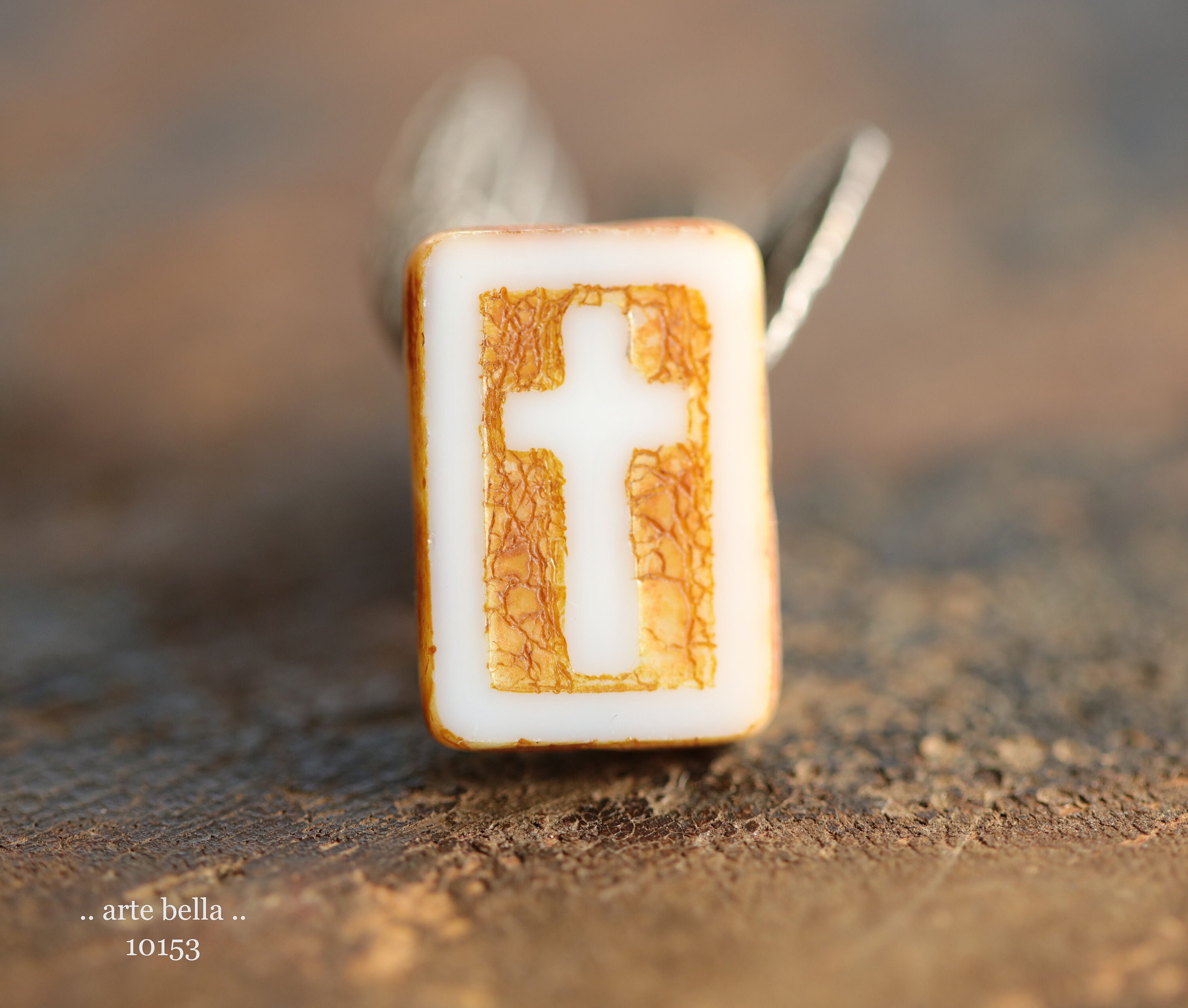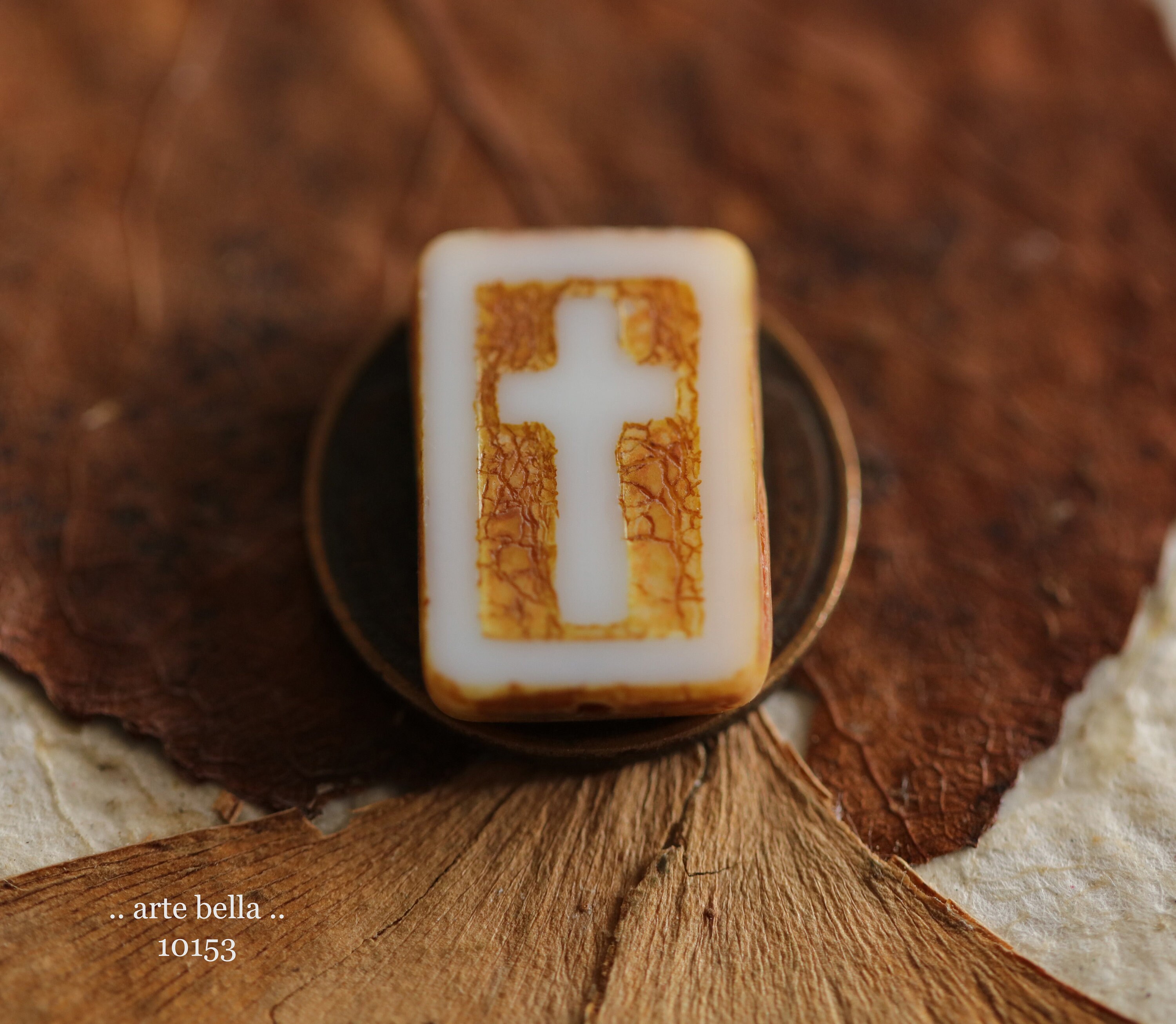 last ones .. SAFFRON WHITE CROSSES .. 9 Premium Picasso Czech Glass Rectangle Cross Beads 17x12mm (10153-9) .. jewelry supplies