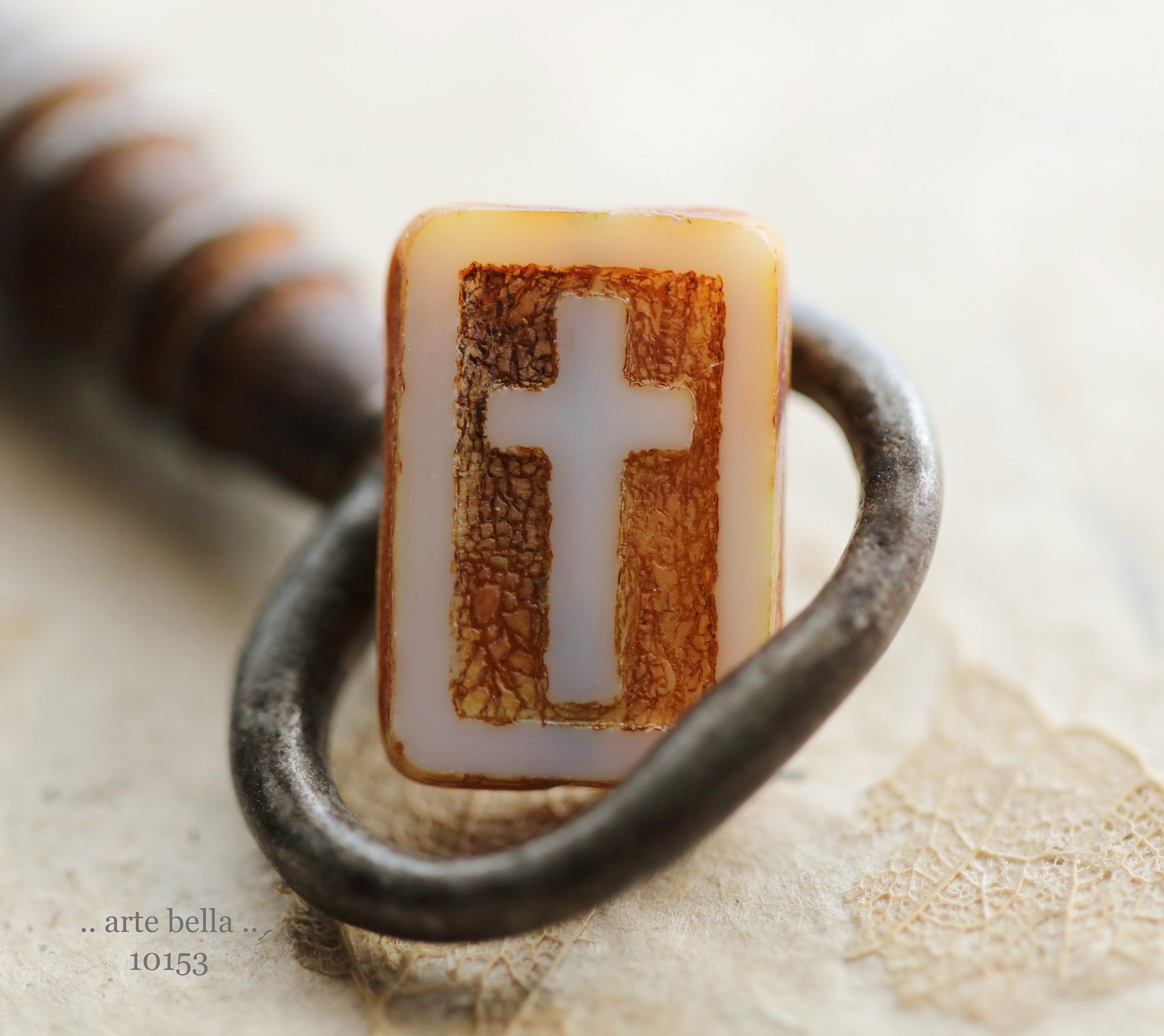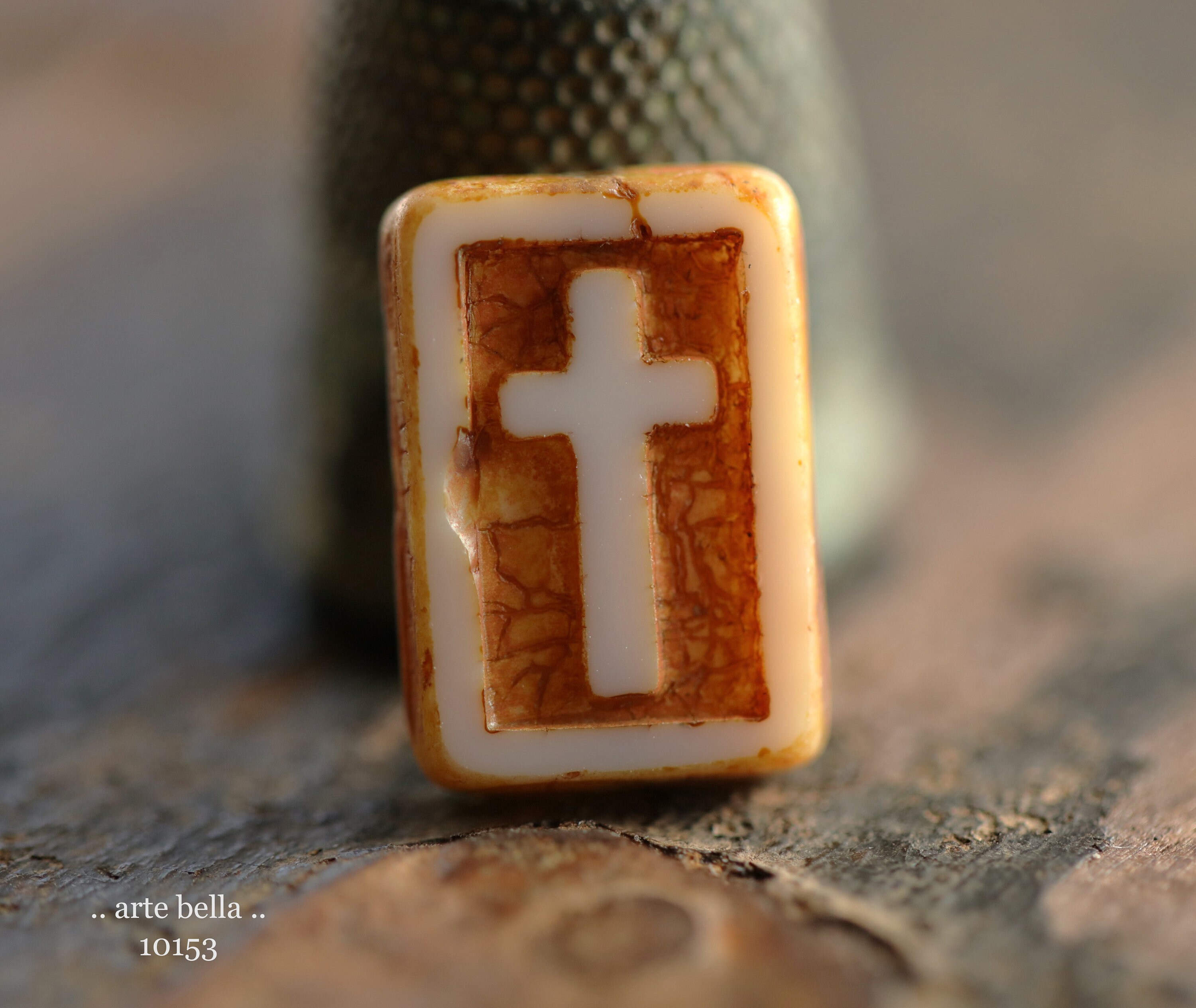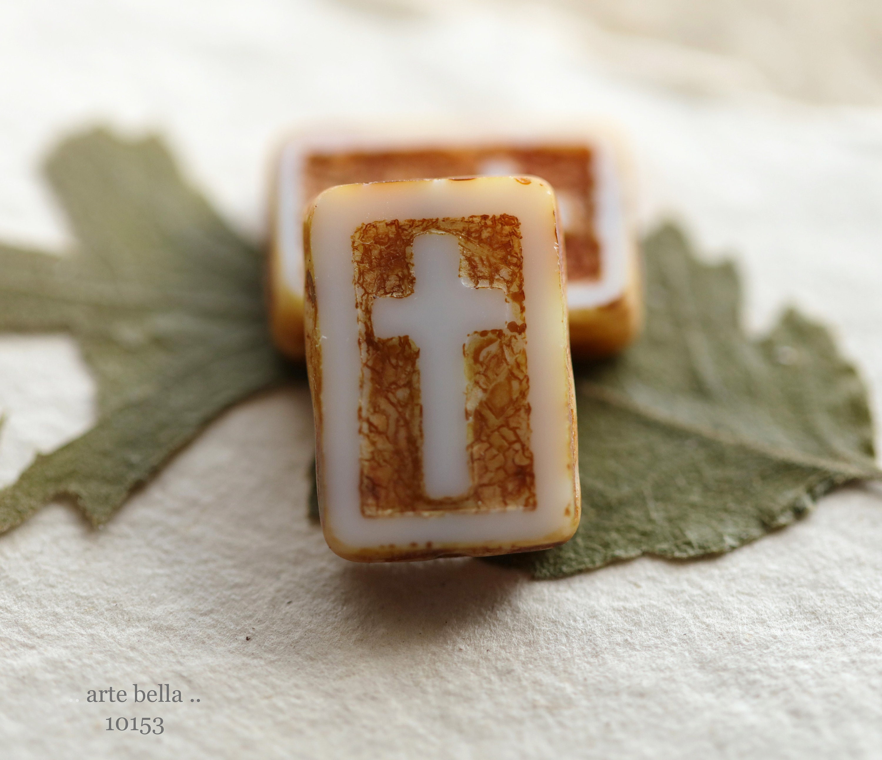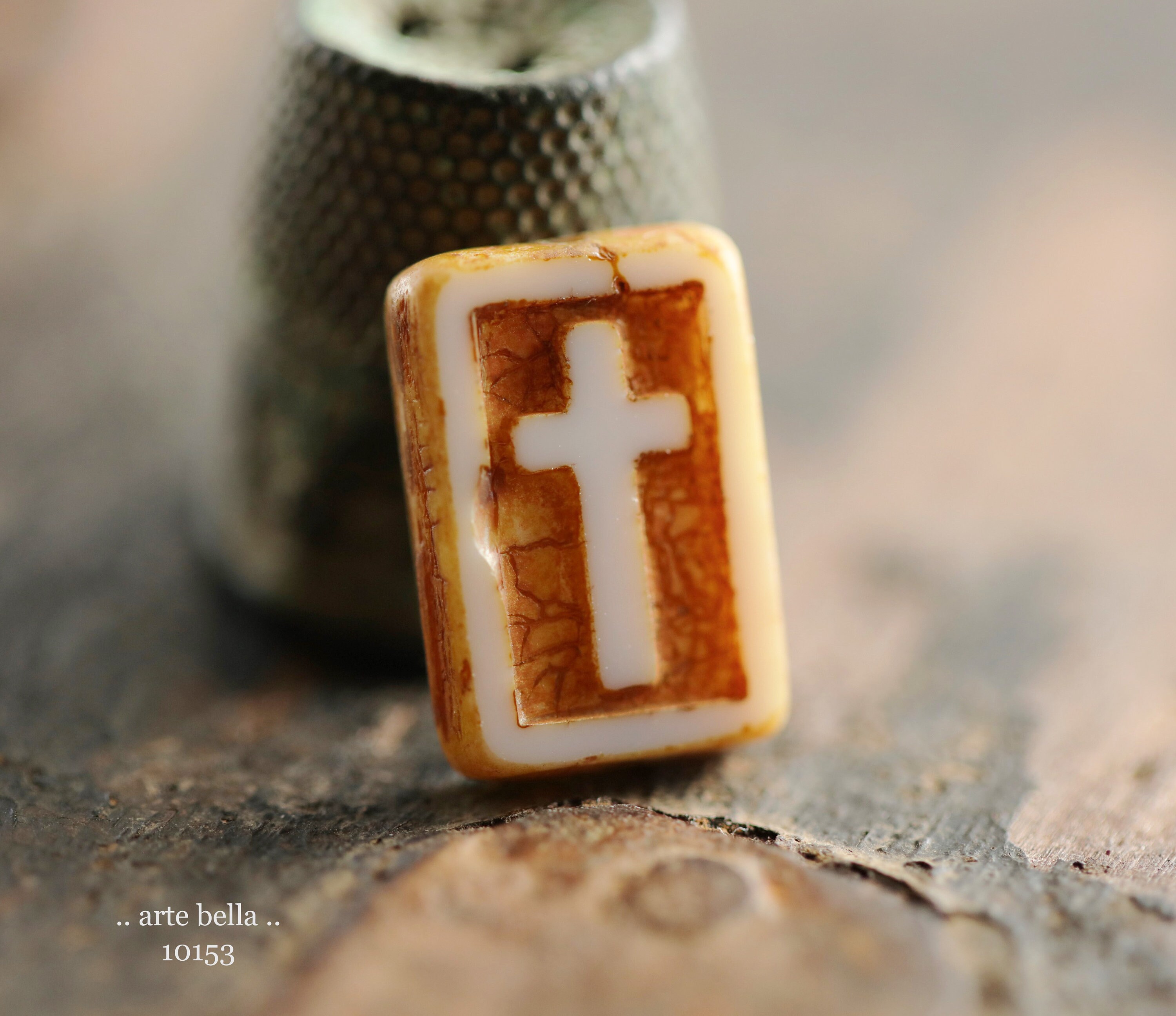 last ones .. SAFFRON WHITE CROSSES .. 9 Premium Picasso Czech Glass Rectangle Cross Beads 17x12mm (10153-9) .. jewelry supplies