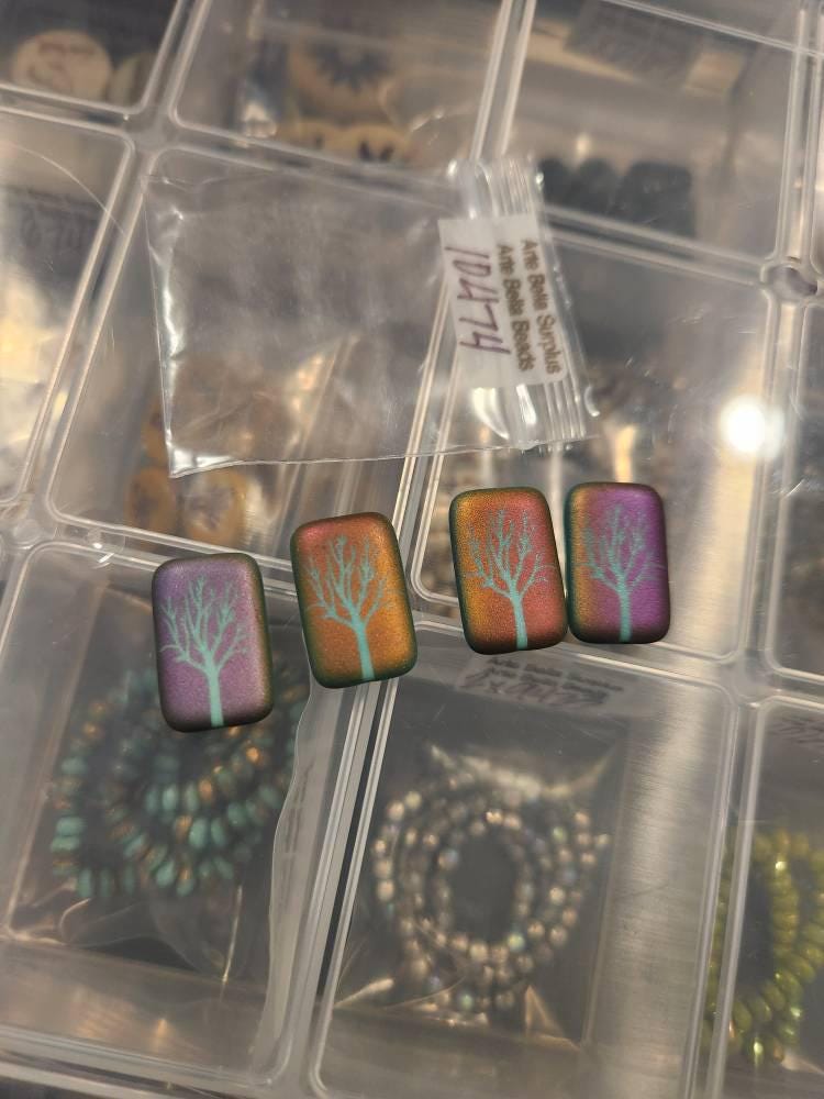 Matte/etched opaque turquoise blue glass with a laser etched autumn/fall tree in a rainbow Aurora Borealis metallic finish. **PLEASE NOTE: As seen in my pictures each bead is unique and one of a kind. You will receive 4 random beads.**