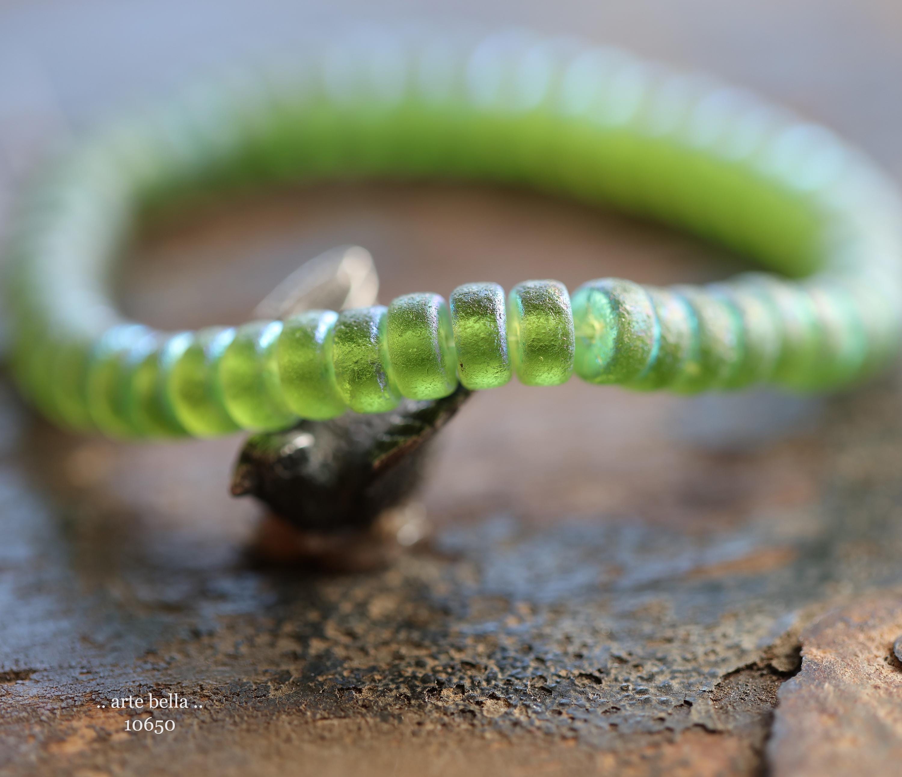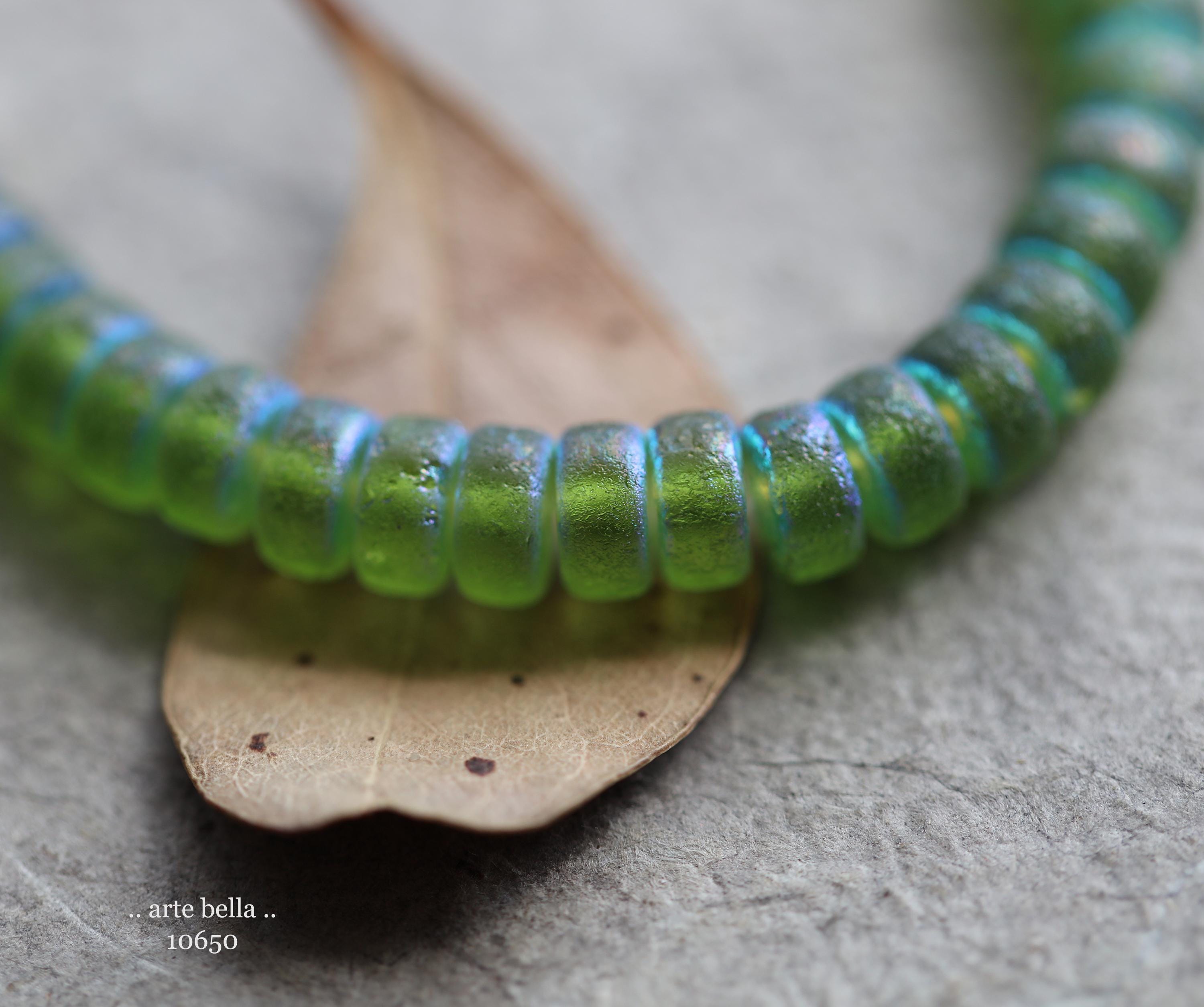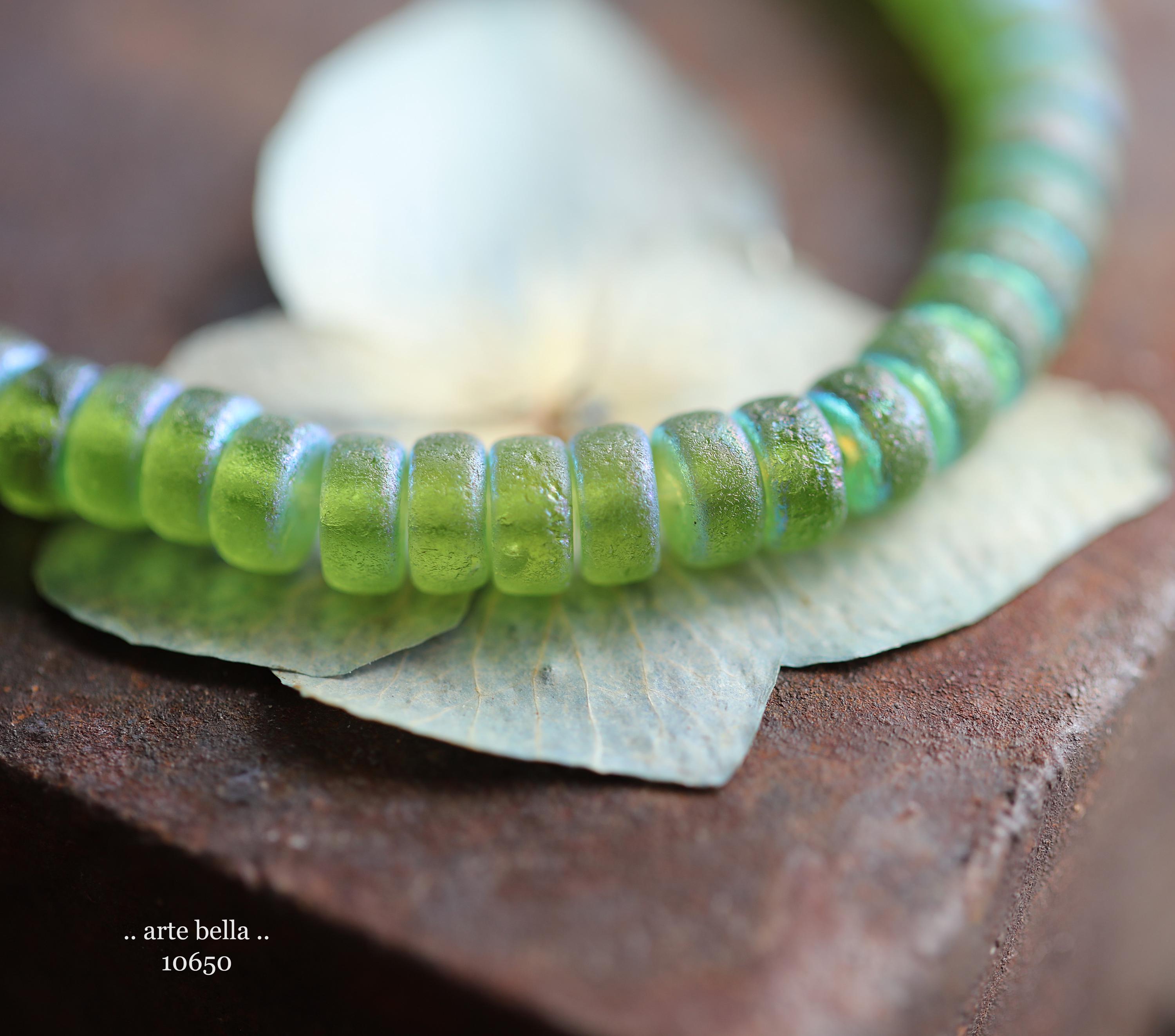 Etched rustic translucent peridot green glass with Aurora Borealis rainbow finish around the bead hole.