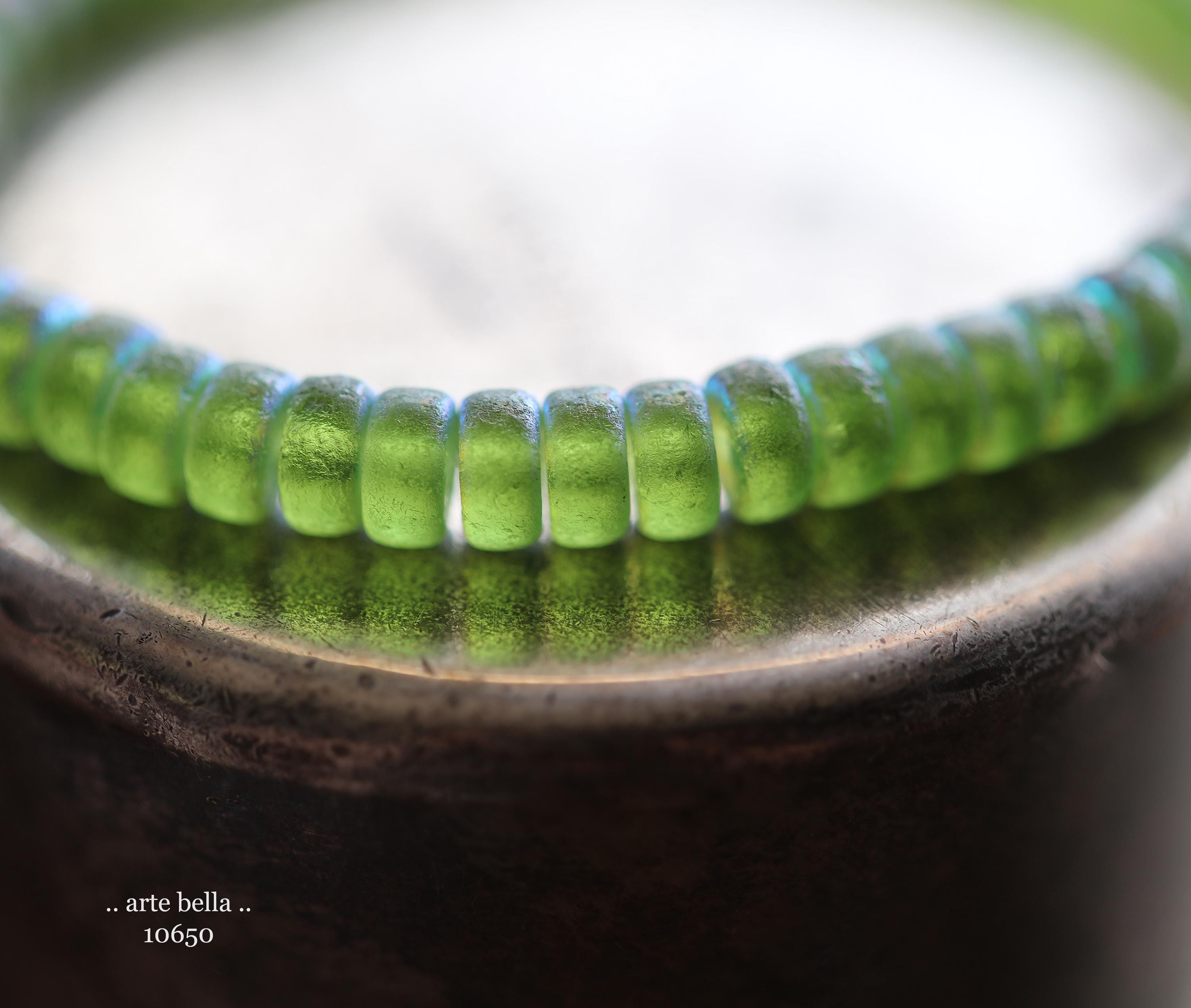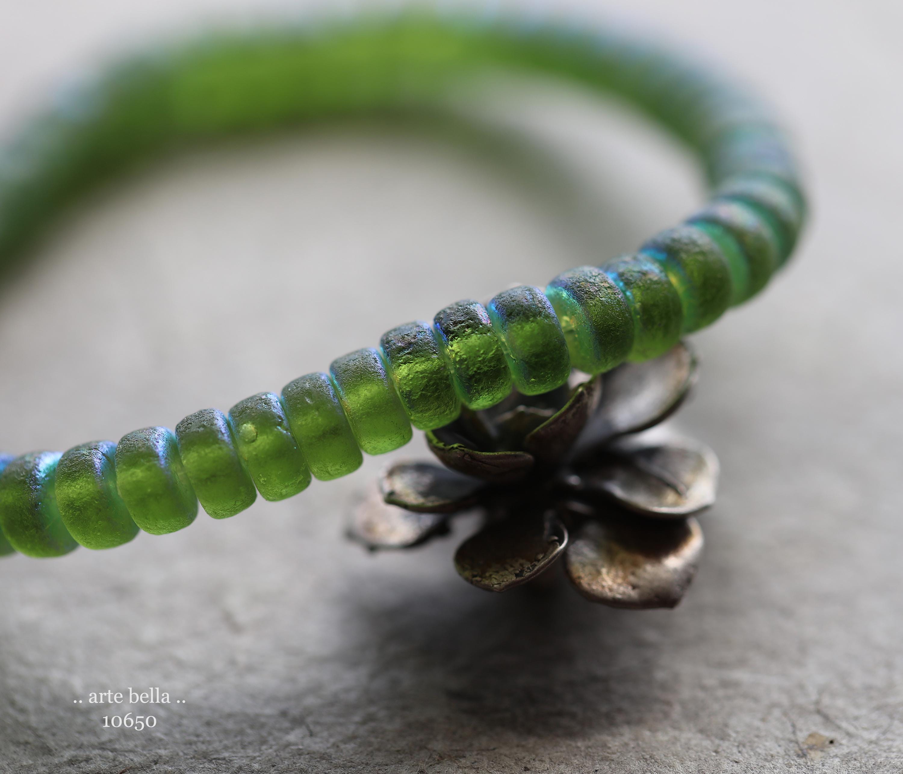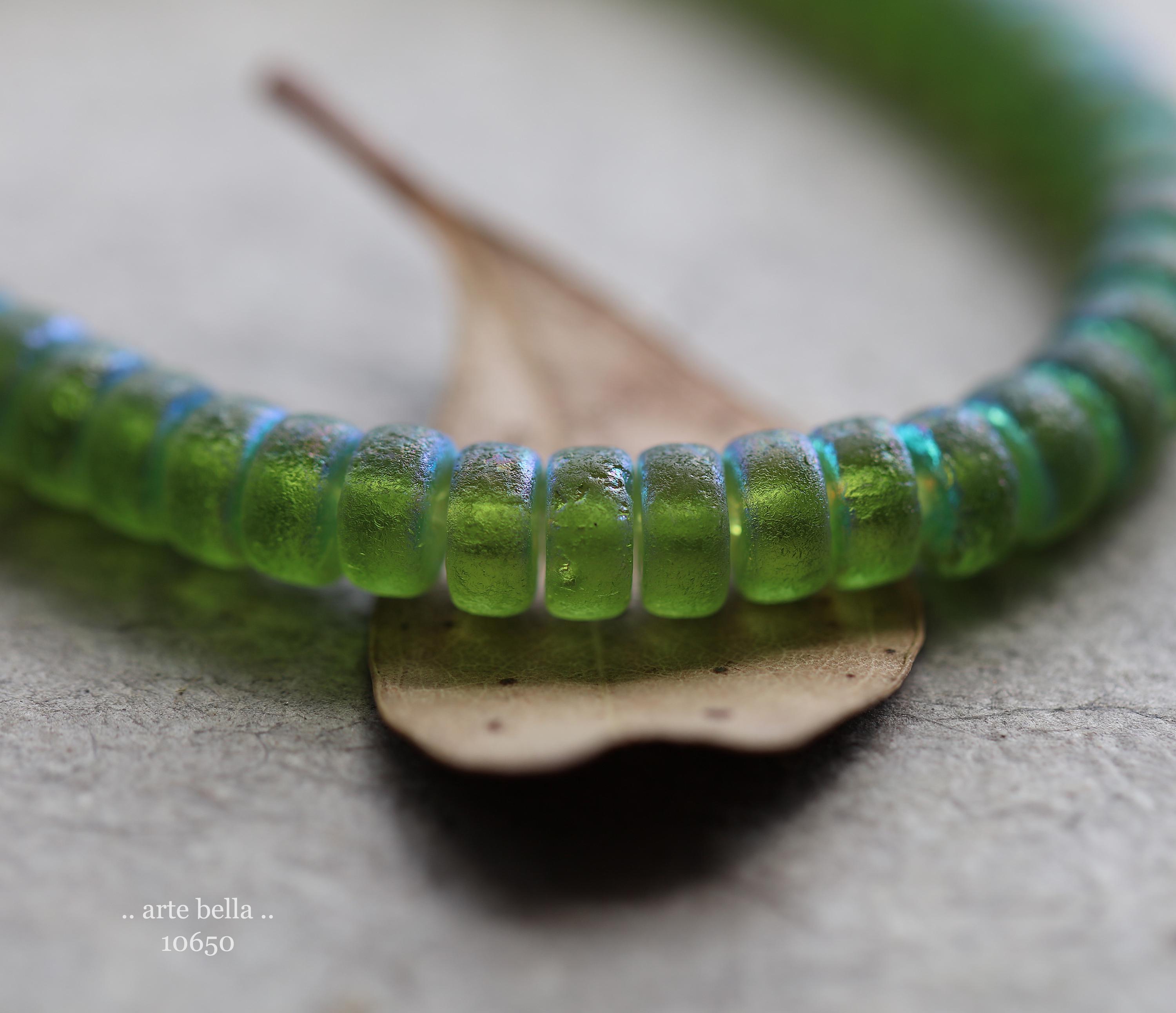 Etched rustic translucent peridot green glass with Aurora Borealis rainbow finish around the bead hole.