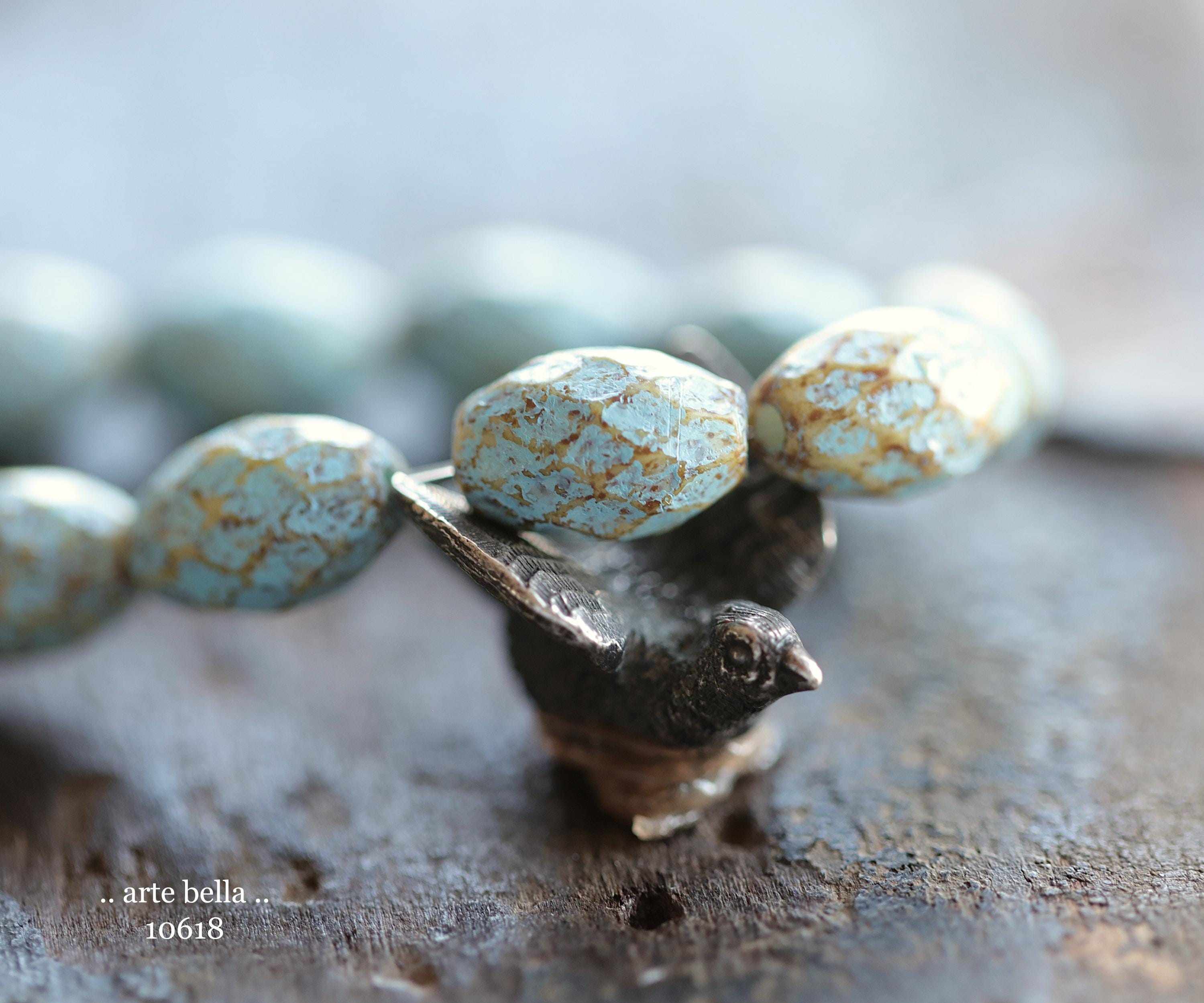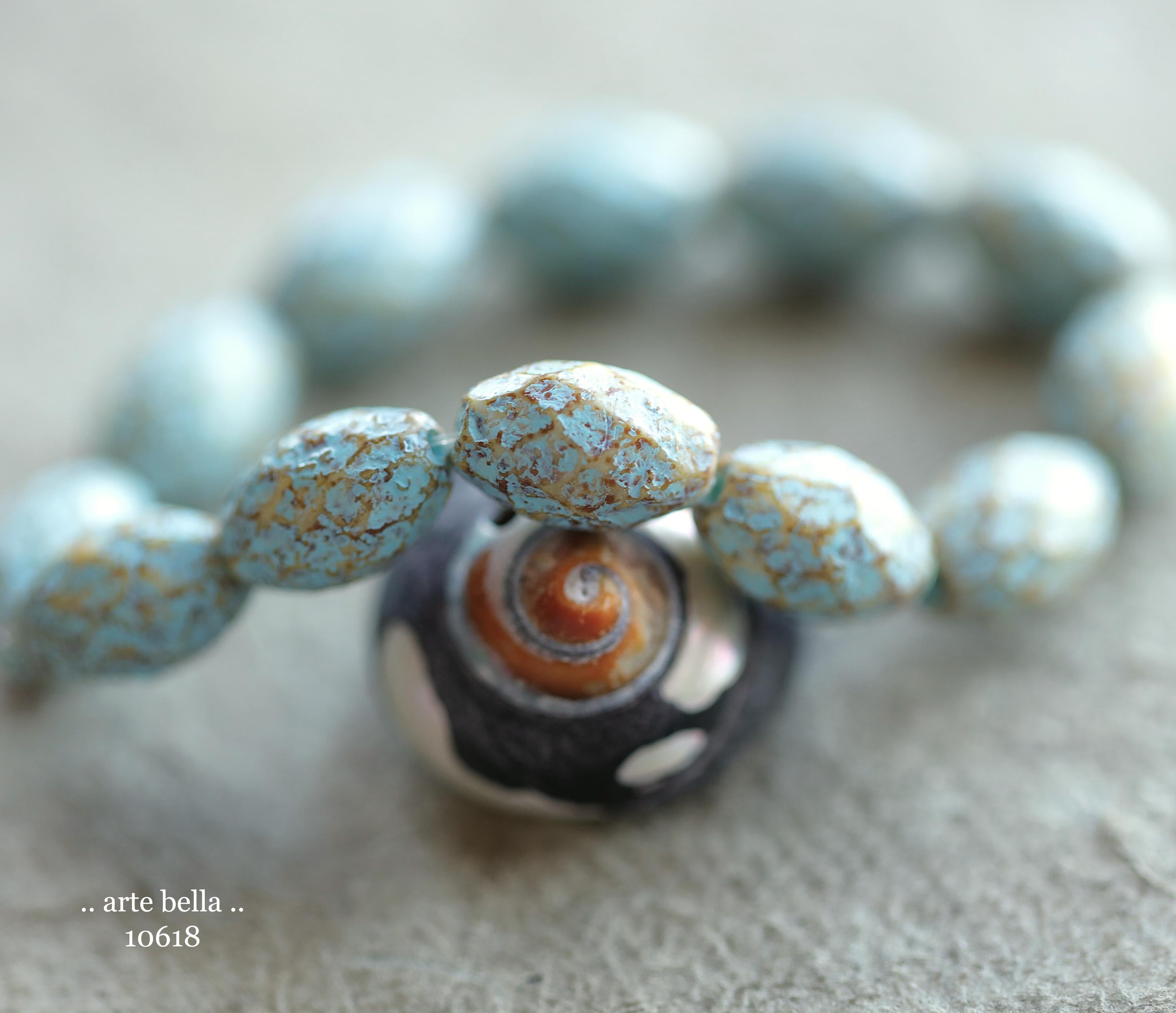 Beautiful etched opaque cream glass with an earthy brown amber Picasso and matte blue wash. **PLEASE NOTE: Beads do vary as seen in my pictures.**