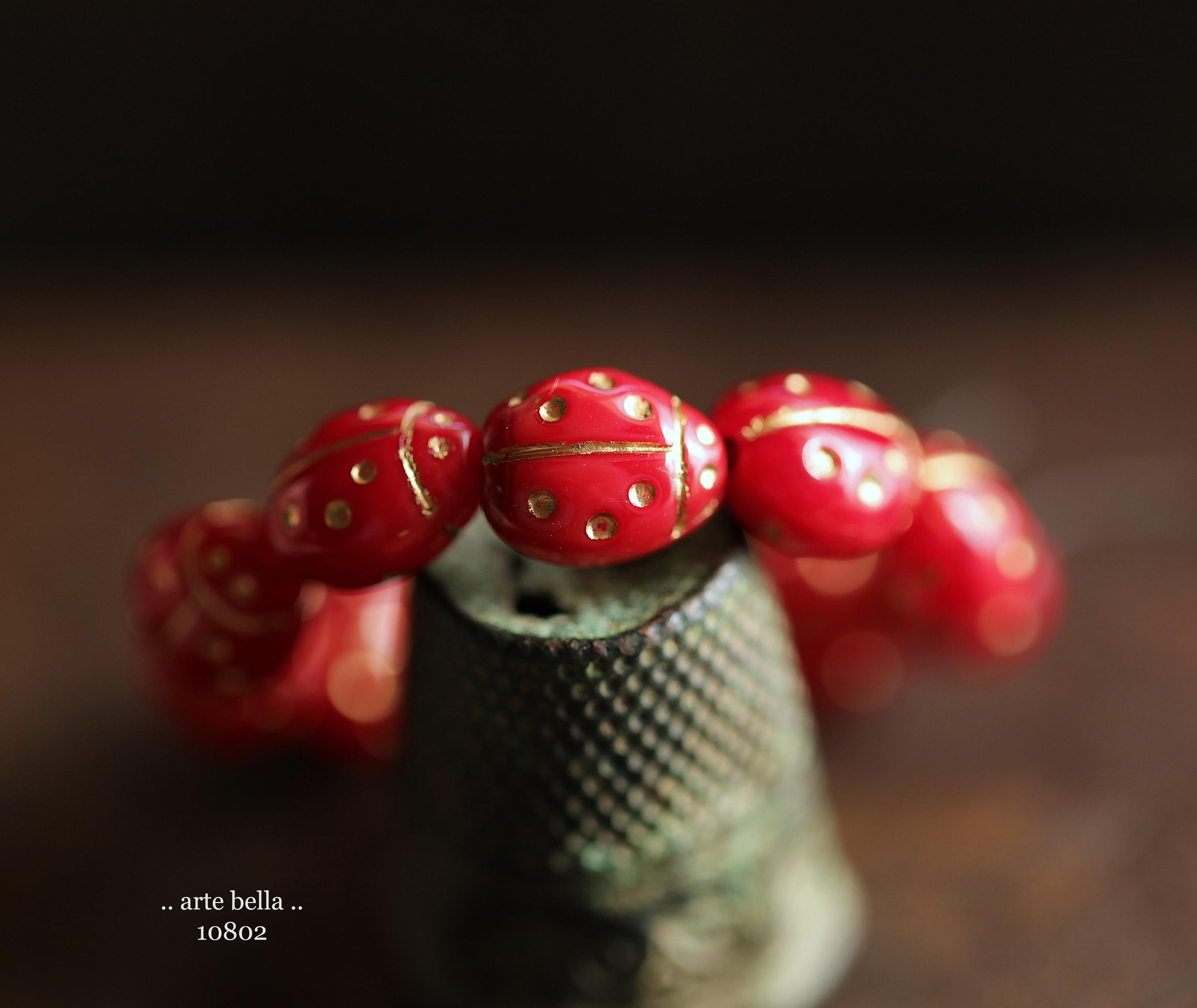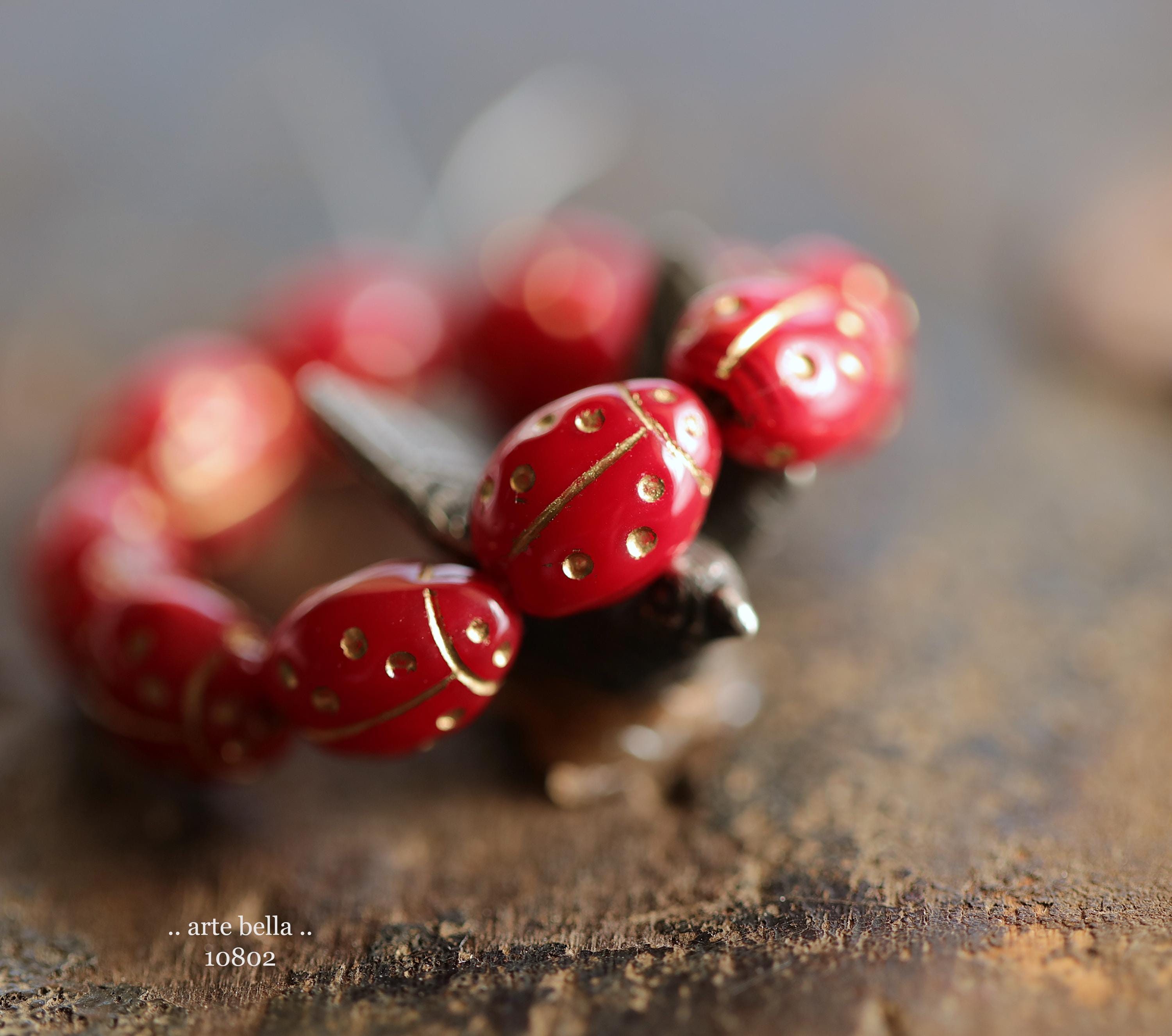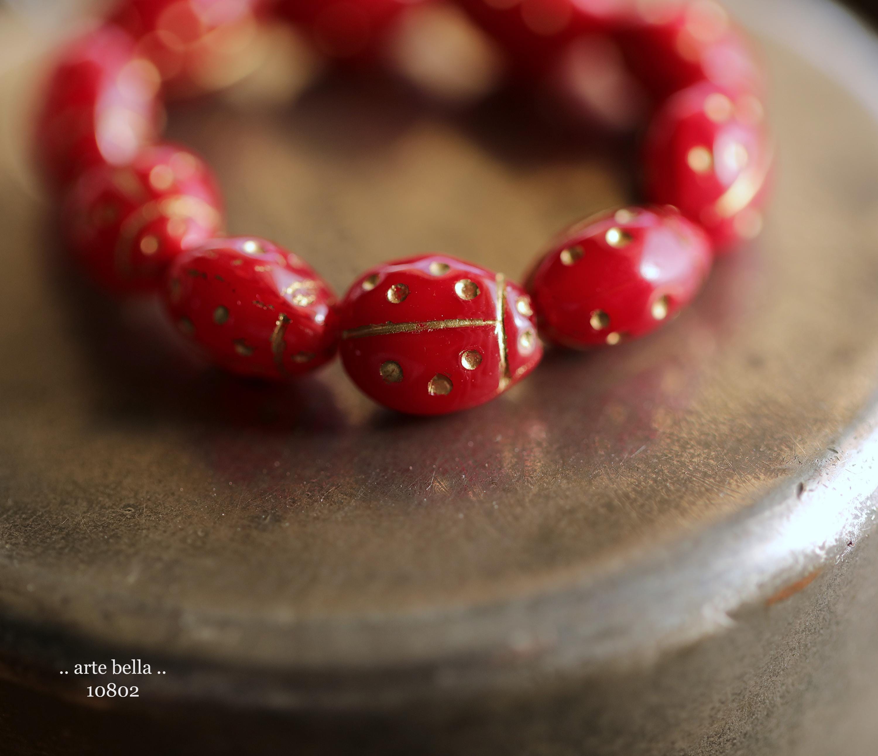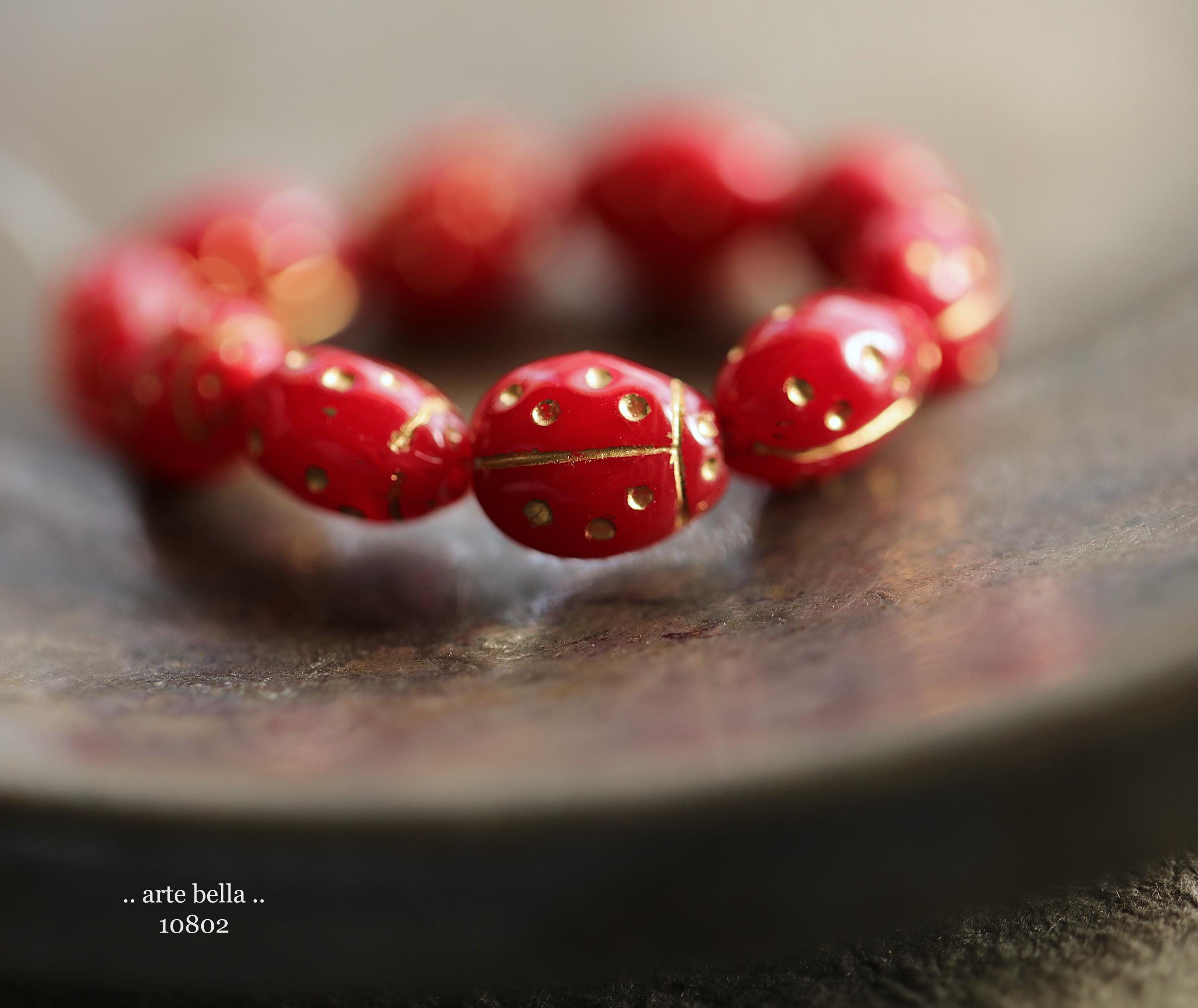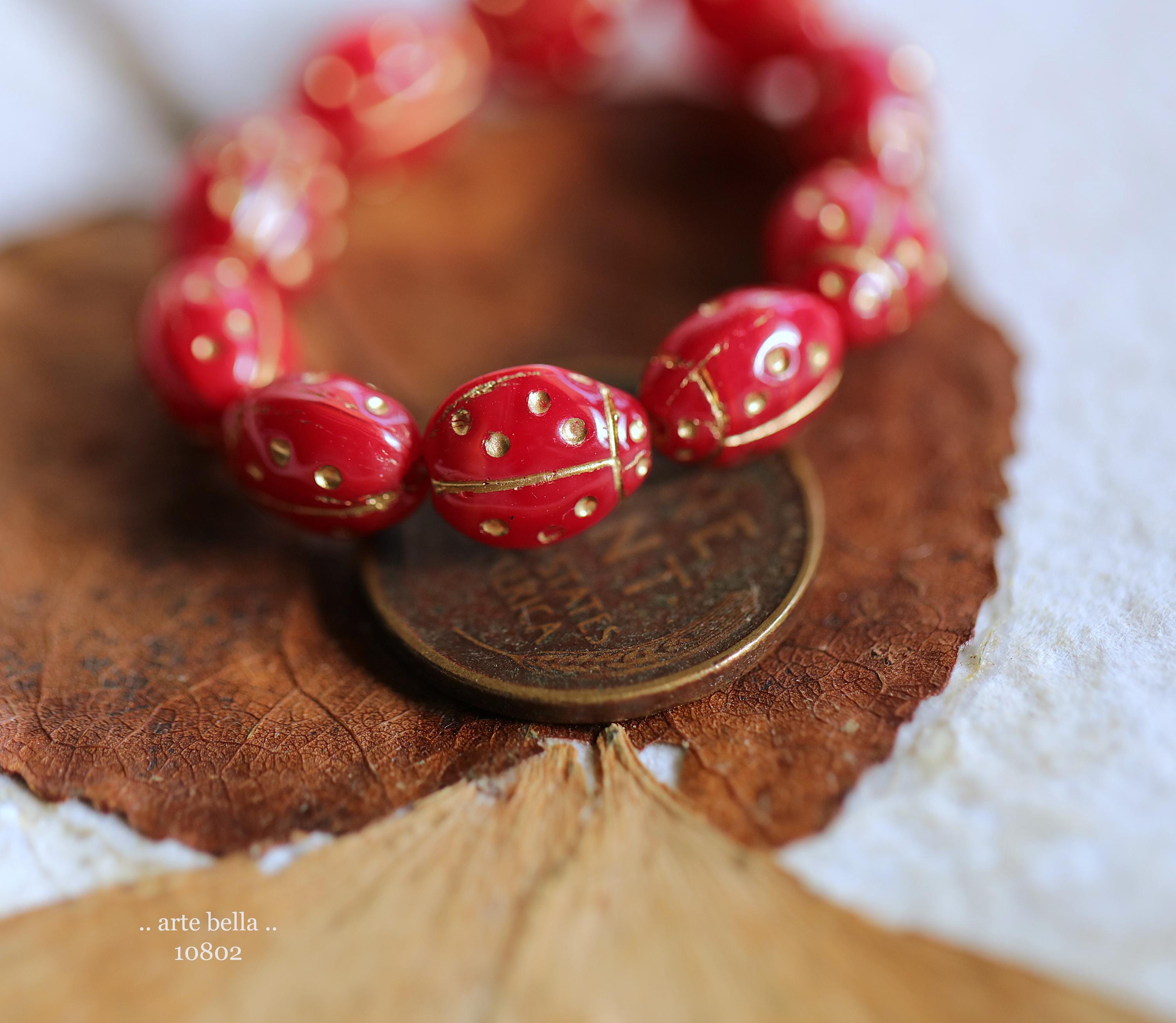 GOLDEN RED LADYBUGS .. New 10 Premium Czech Glass Ladybug Beads 10x7mm (10802-st) .. jewelry supplies