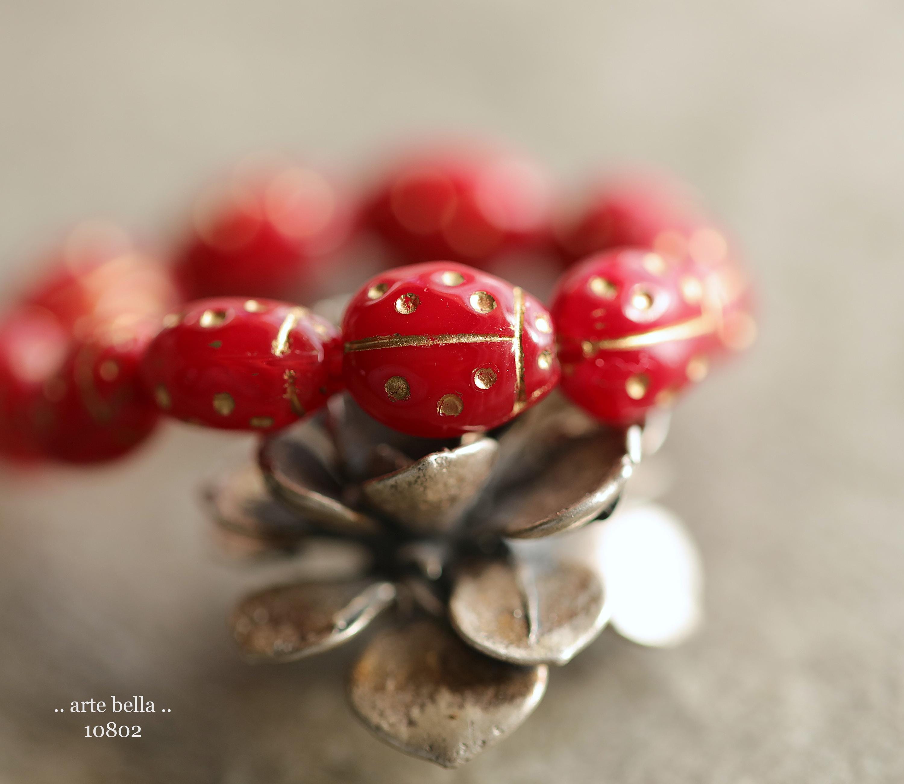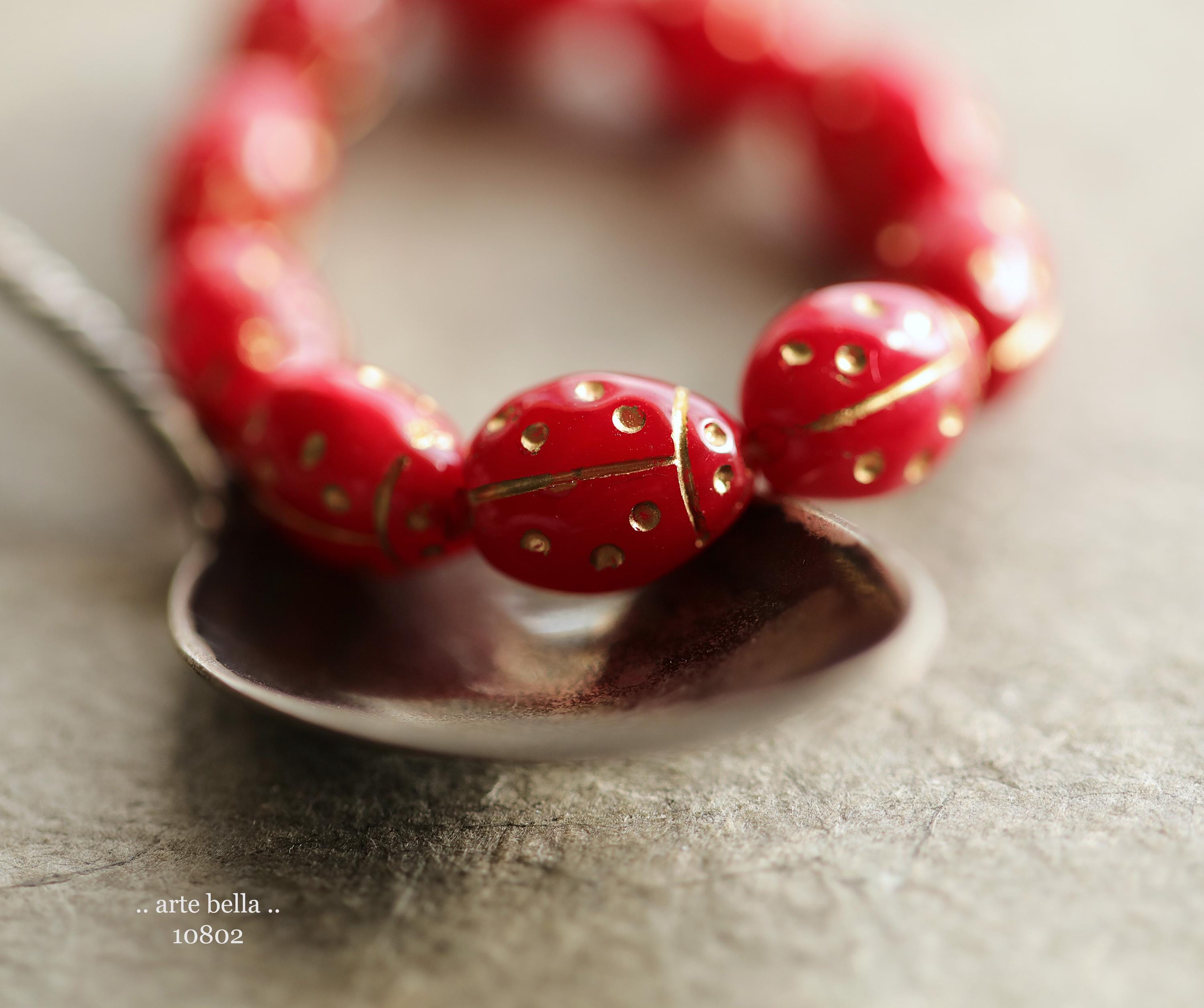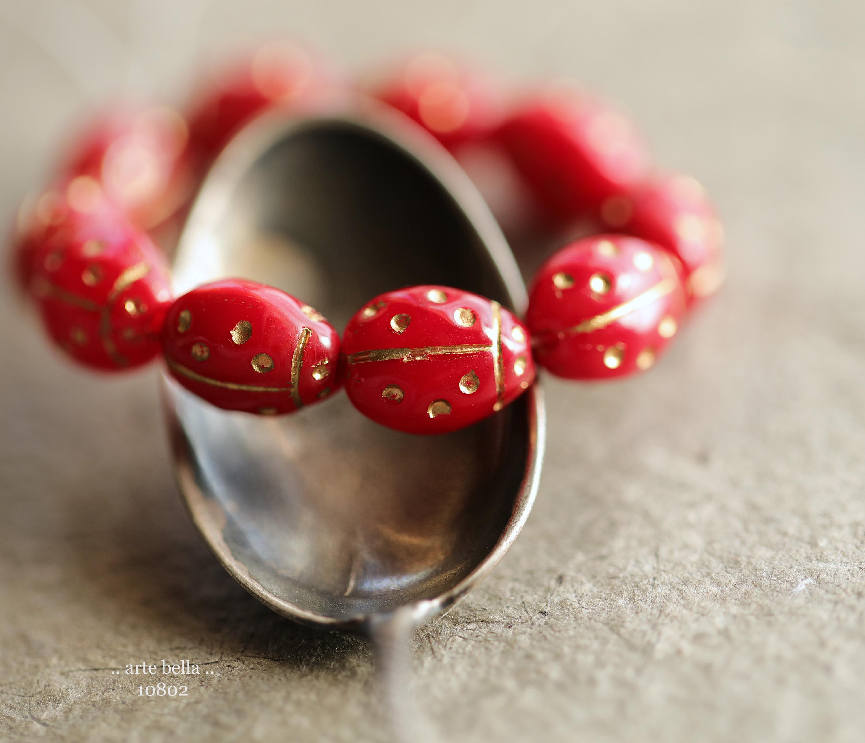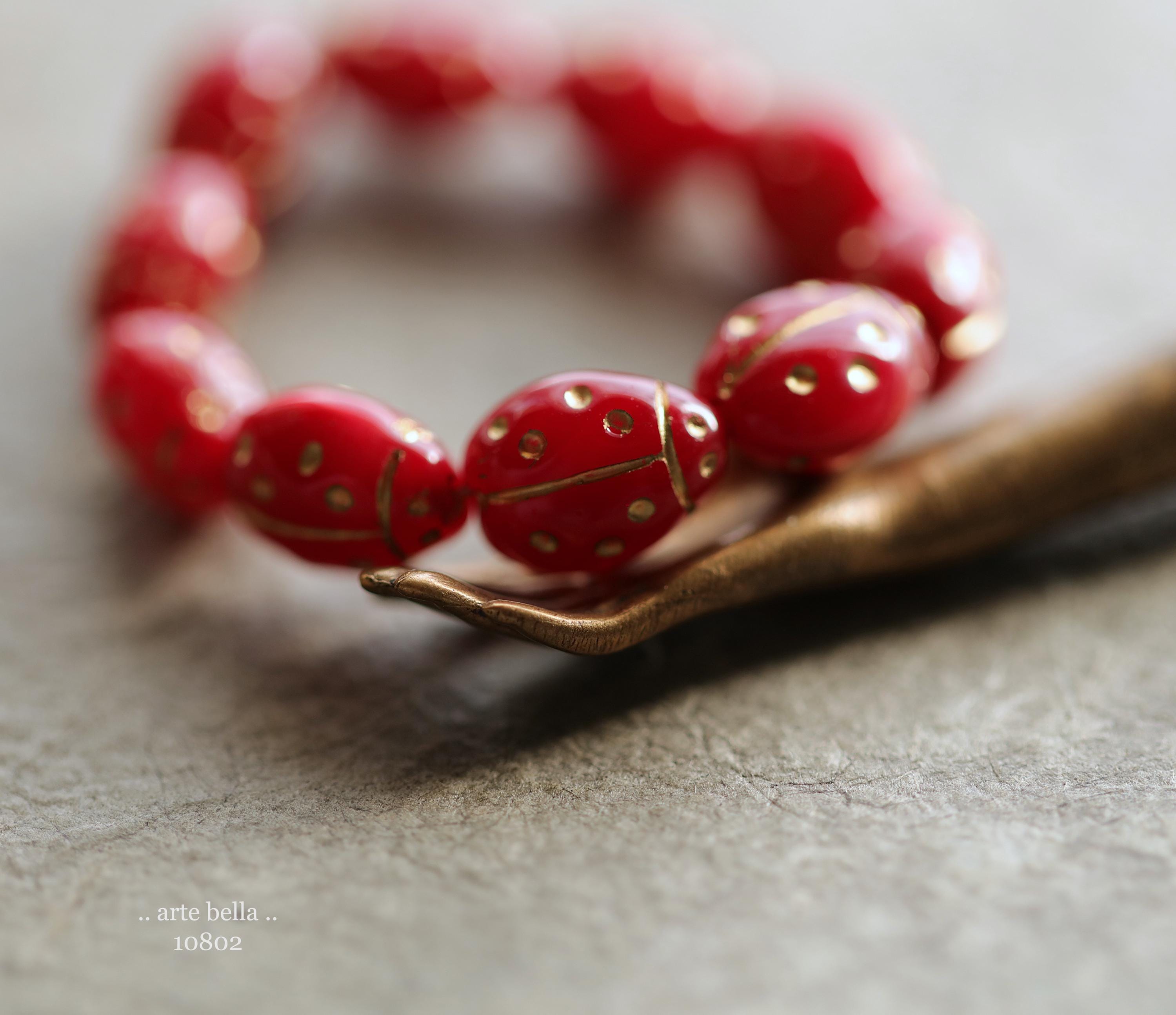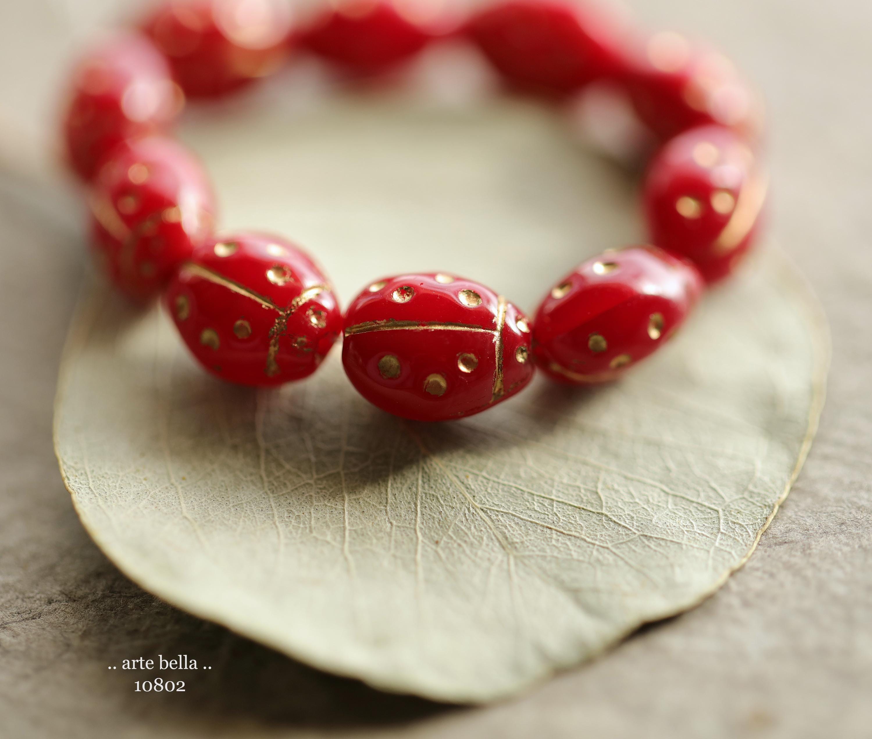 GOLDEN RED LADYBUGS .. New 10 Premium Czech Glass Ladybug Beads 10x7mm (10802-st) .. jewelry supplies