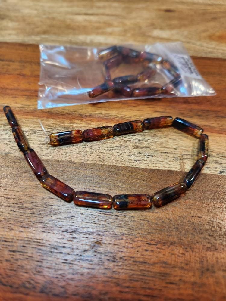 last ones .. EARTHY TORTOISE STICK Mix .. 14 Premium Picasso Czech Glass Rectangle Tube Beads 15x5mm (10812-st) .. jewelry supplies