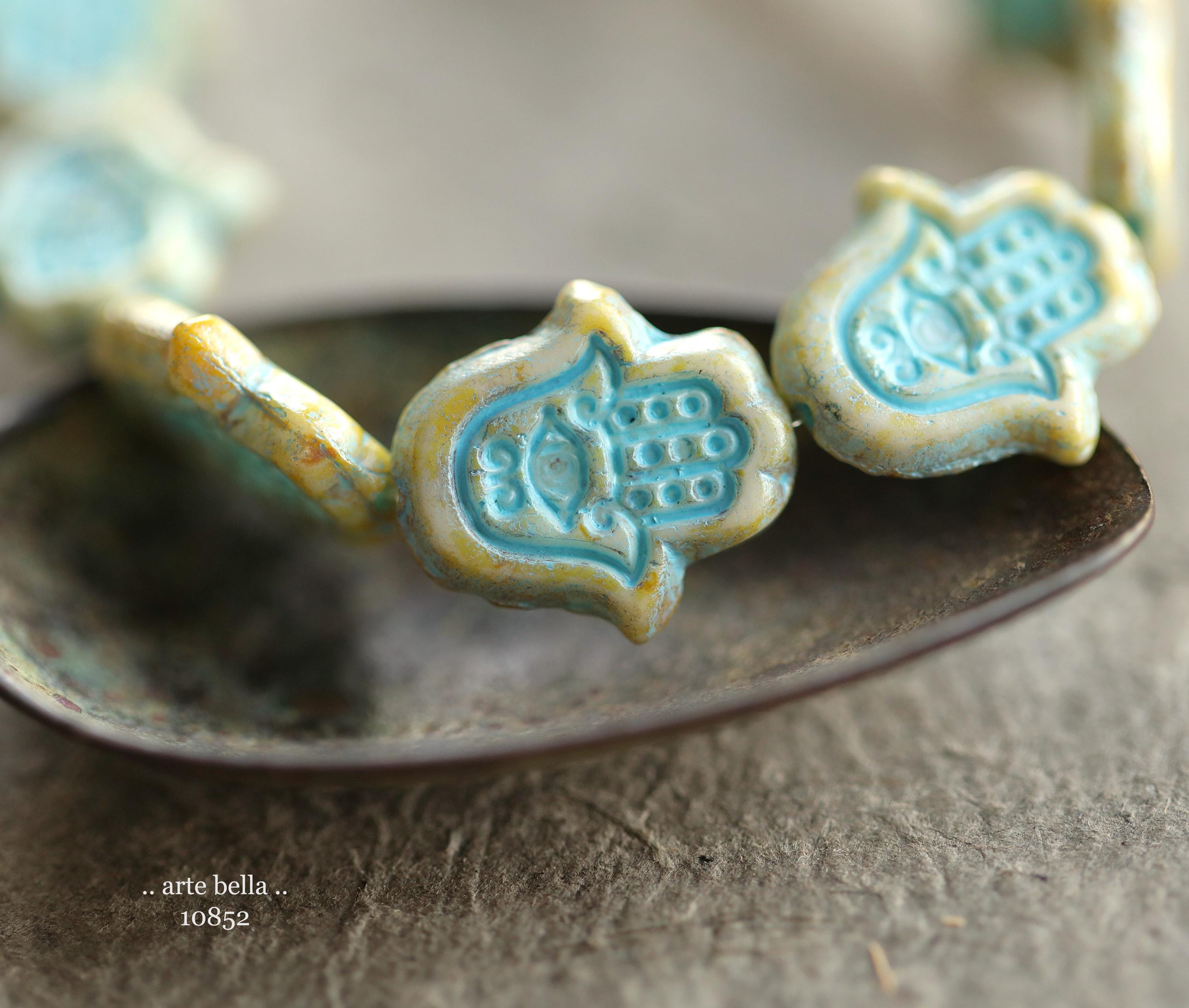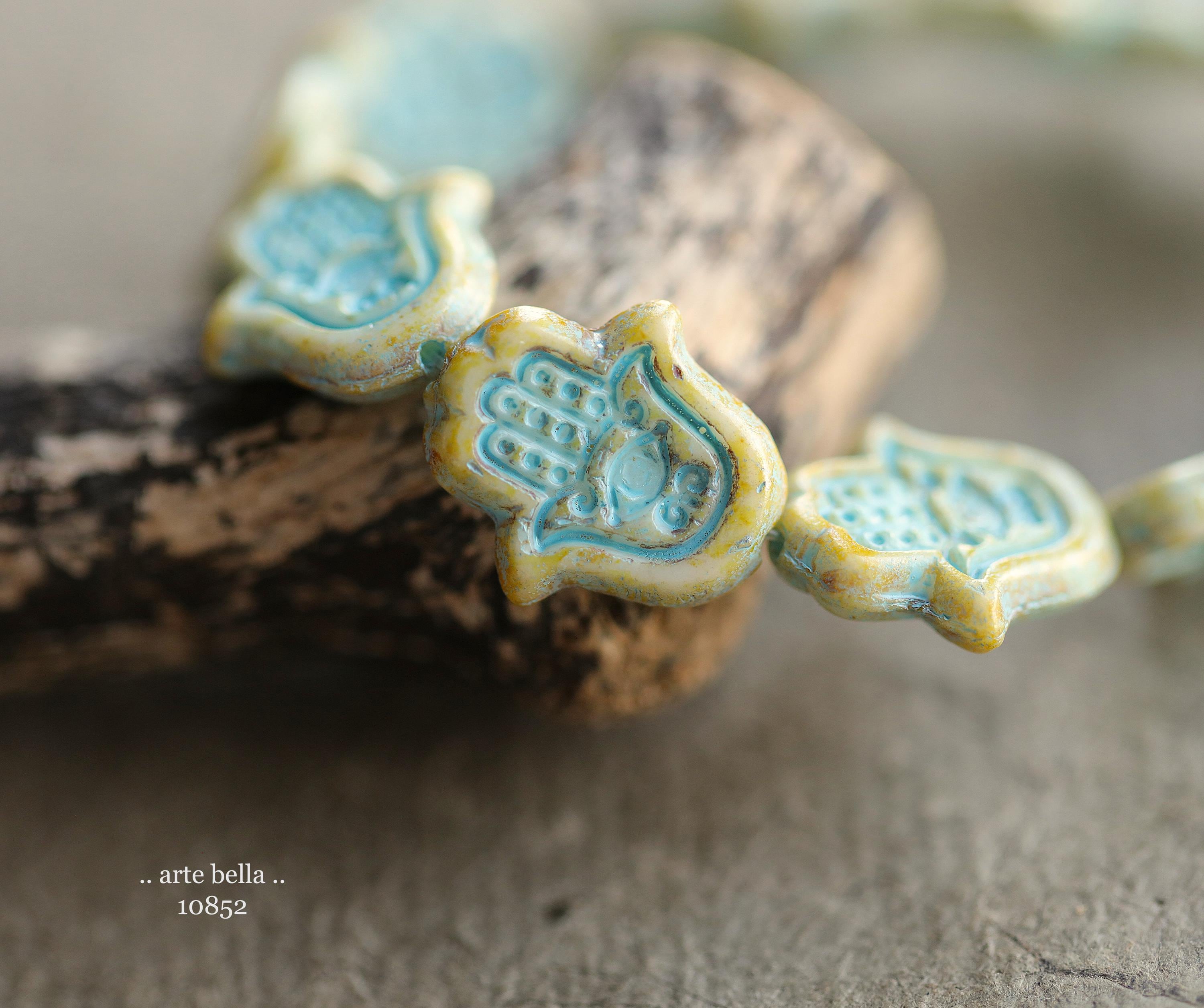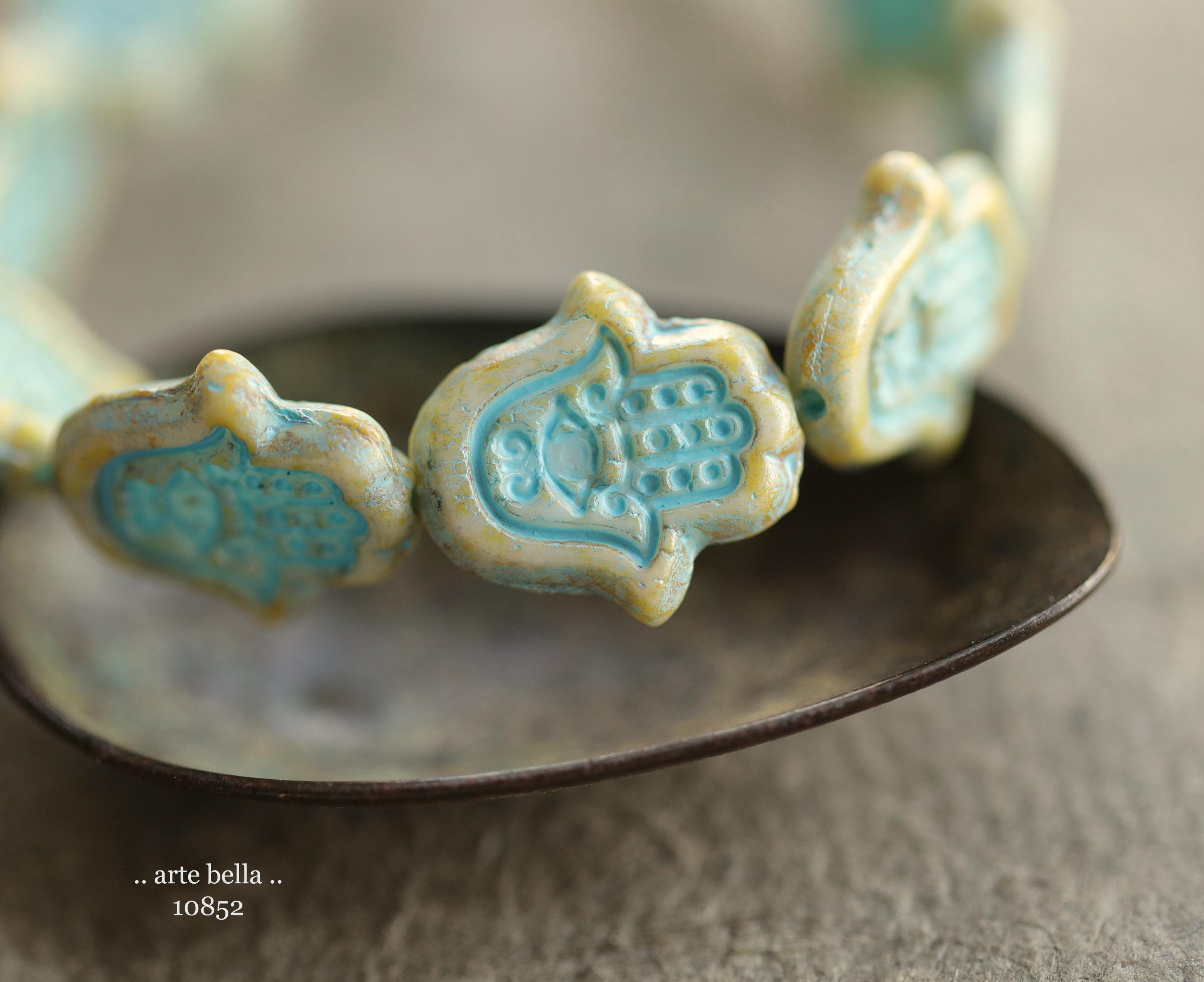 back in stock .. BLUE IVORY HAMSA Hand .. 10 Picasso Czech Glass Hamsa Beads 15x10mm (10852-st) .. jewelry supplies