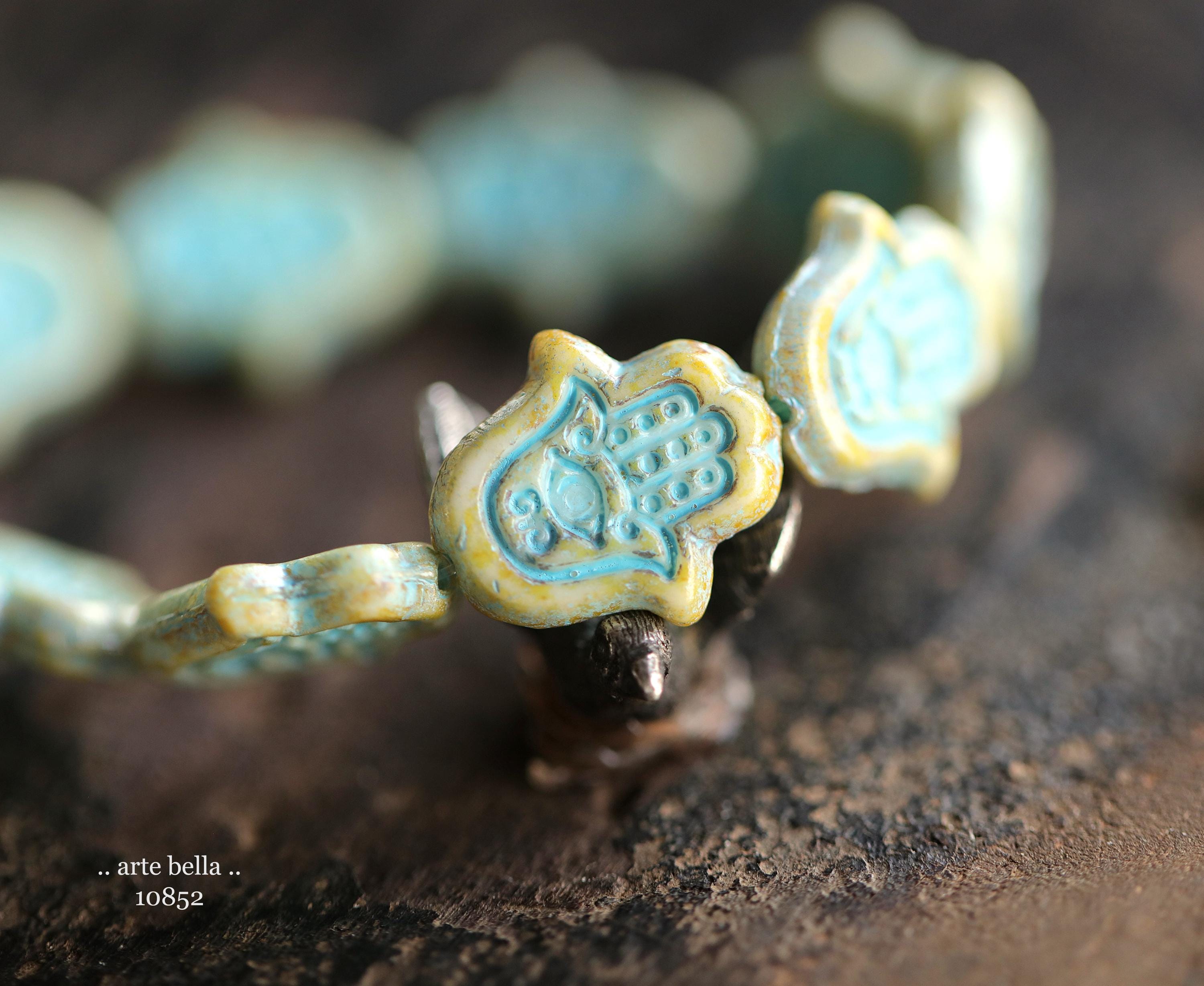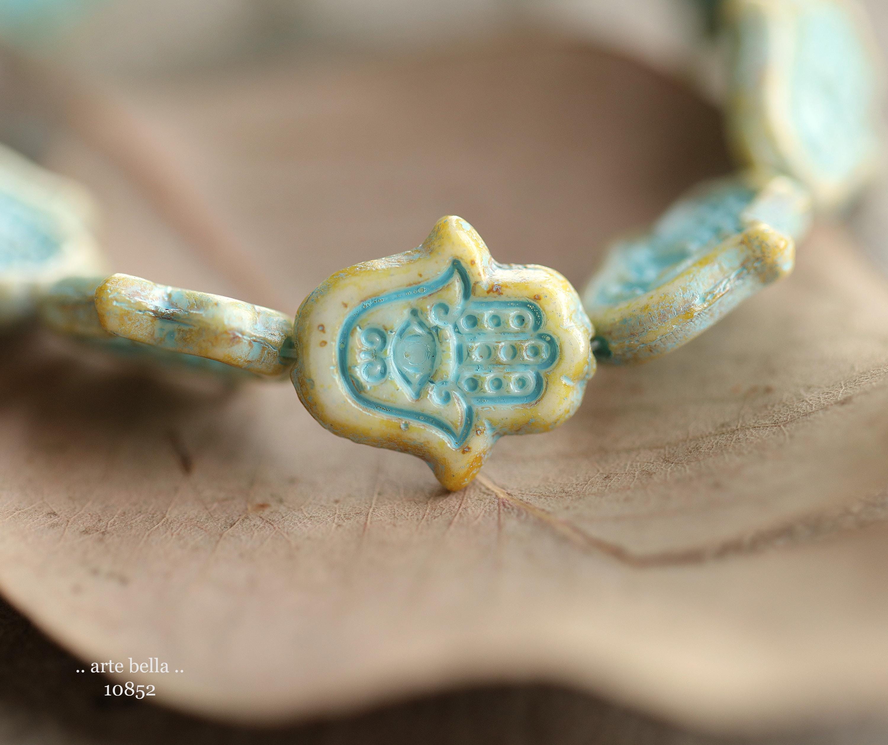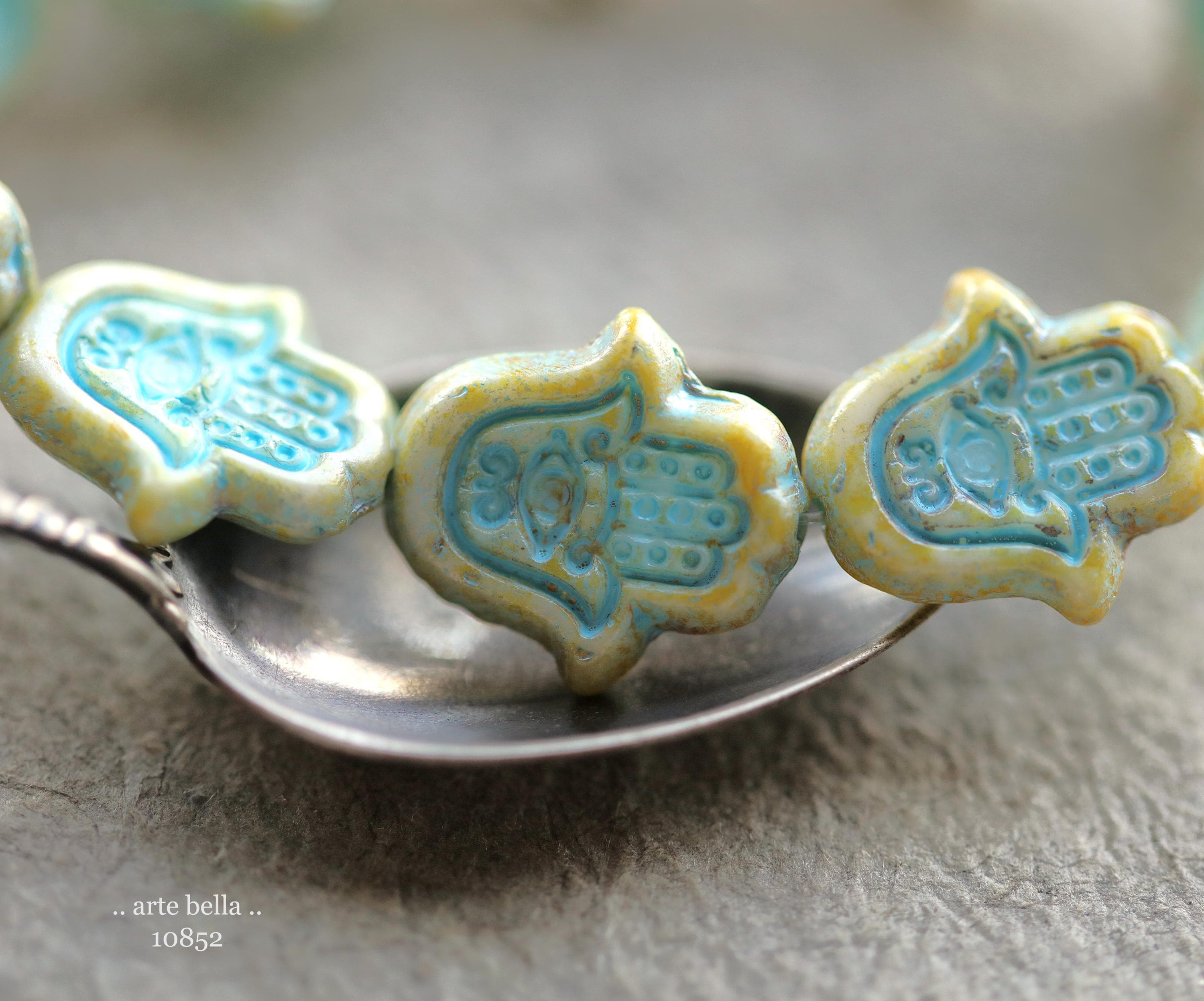 back in stock .. BLUE IVORY HAMSA Hand .. 10 Picasso Czech Glass Hamsa Beads 15x10mm (10852-st) .. jewelry supplies