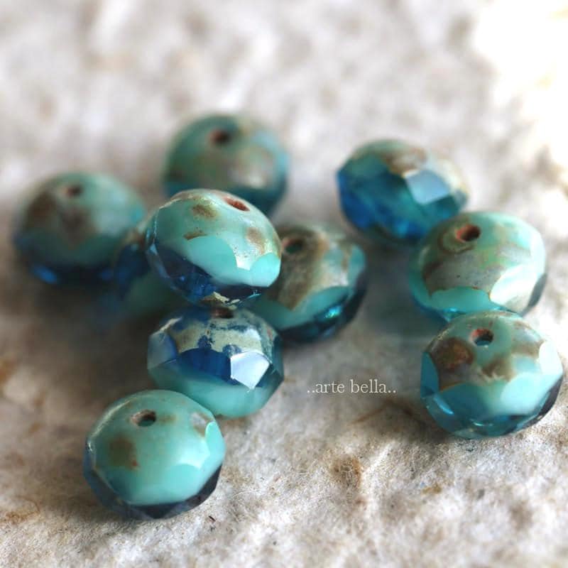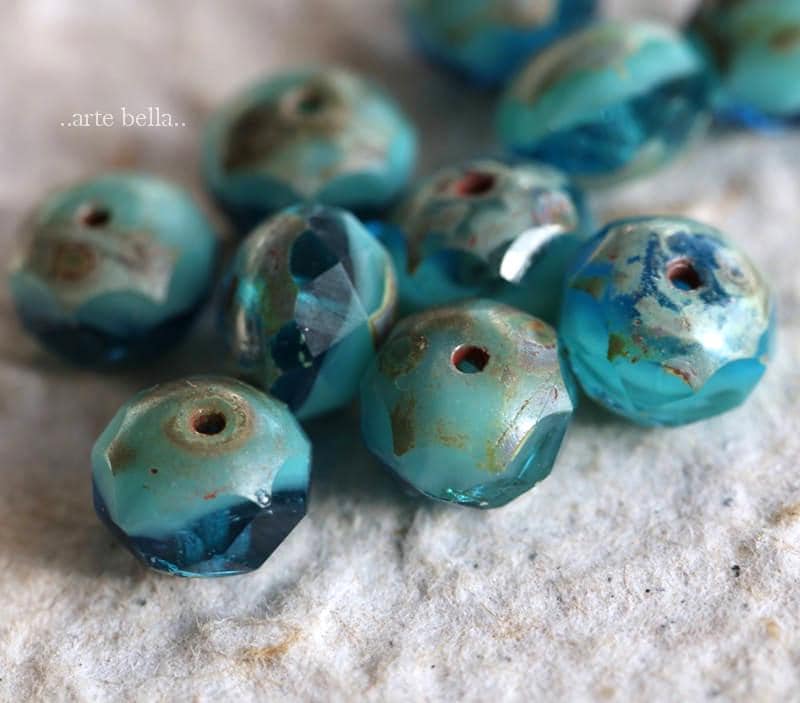 Opaque turquoise and translucent aqua teal blue glass mix make these gorgeous and bright beauties .. lightly coated with Picasso finish, crisp fire polished facets.