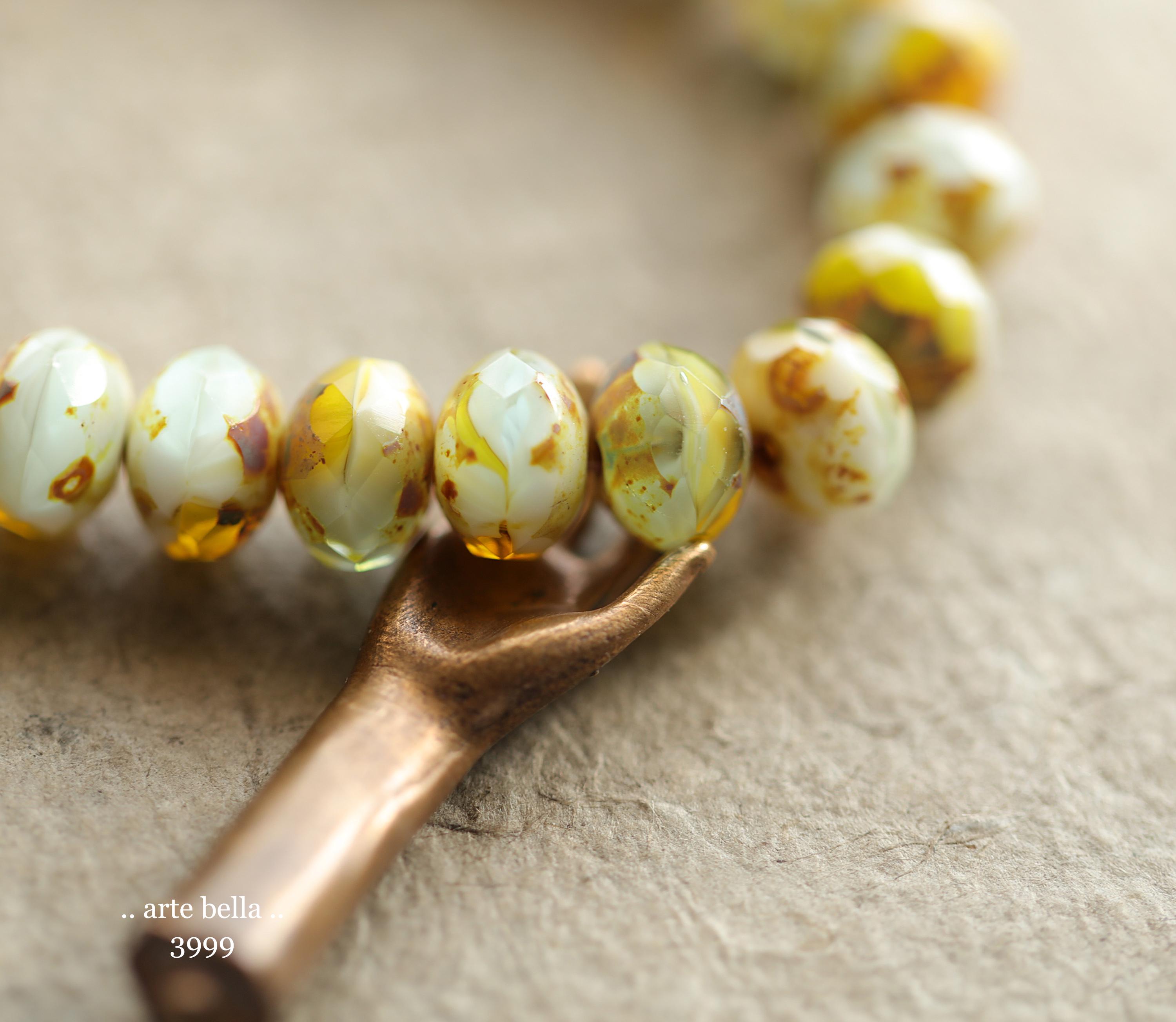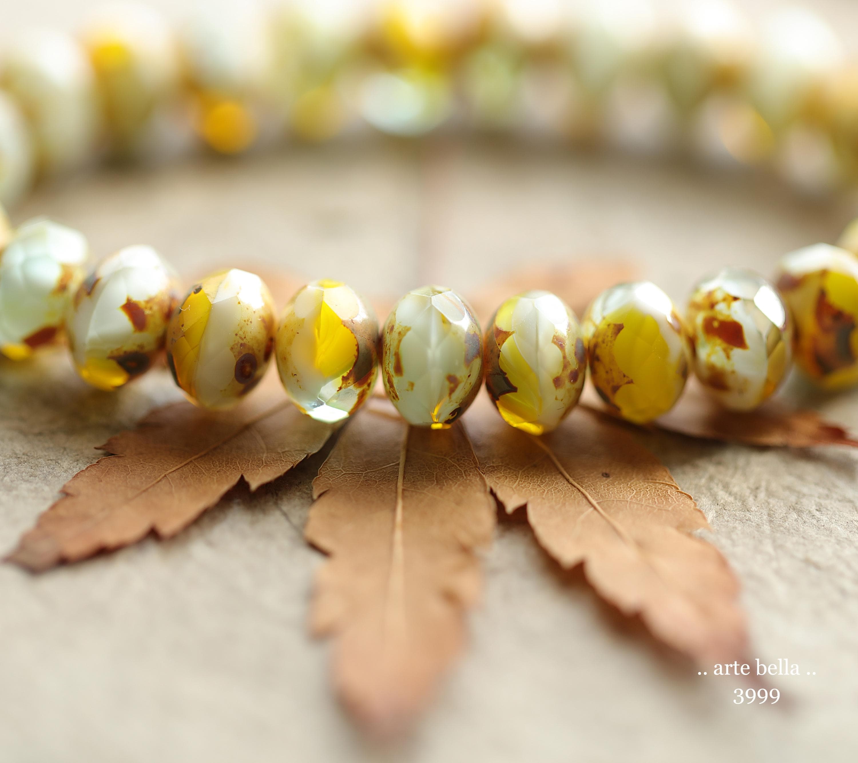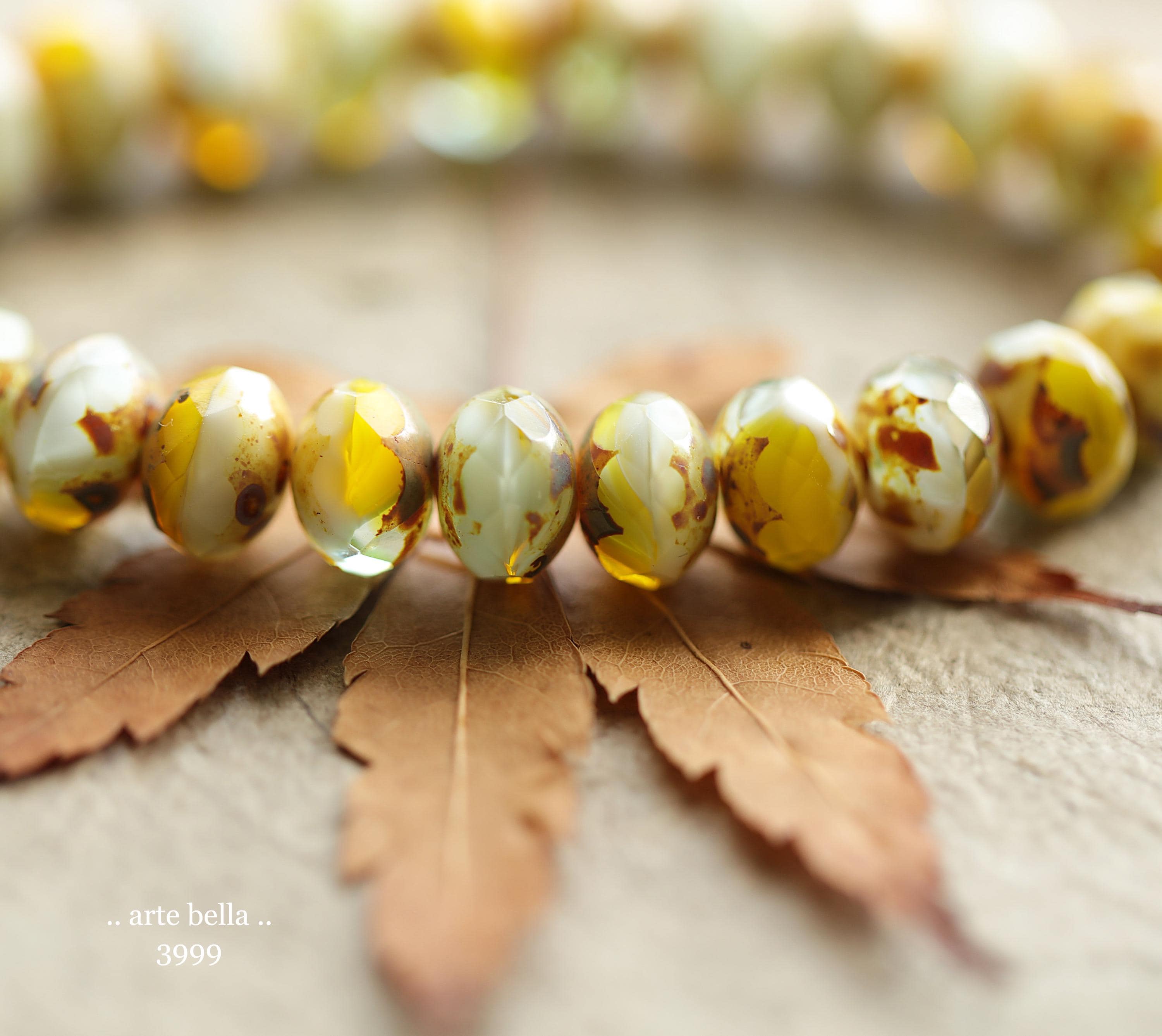 Pretty bright yellow opaline, opaque white and translucent lightest blue glass with golden sandy brown Picasso finish .. super crisp gemstone facets. **PLEASE NOTE: As with all mixed glass beads, no two are alike.**