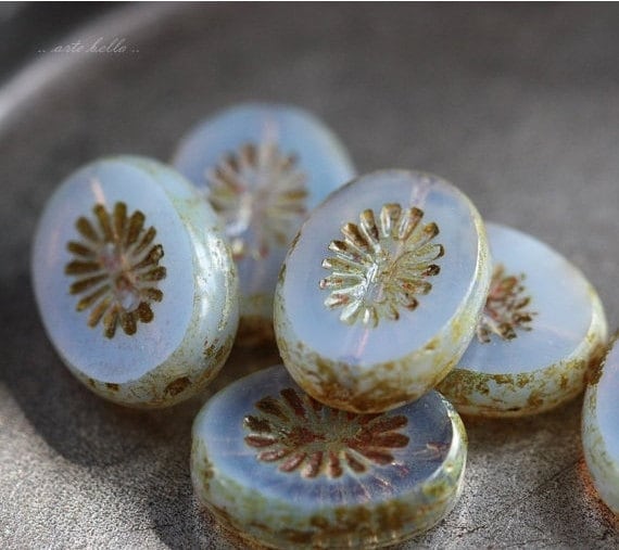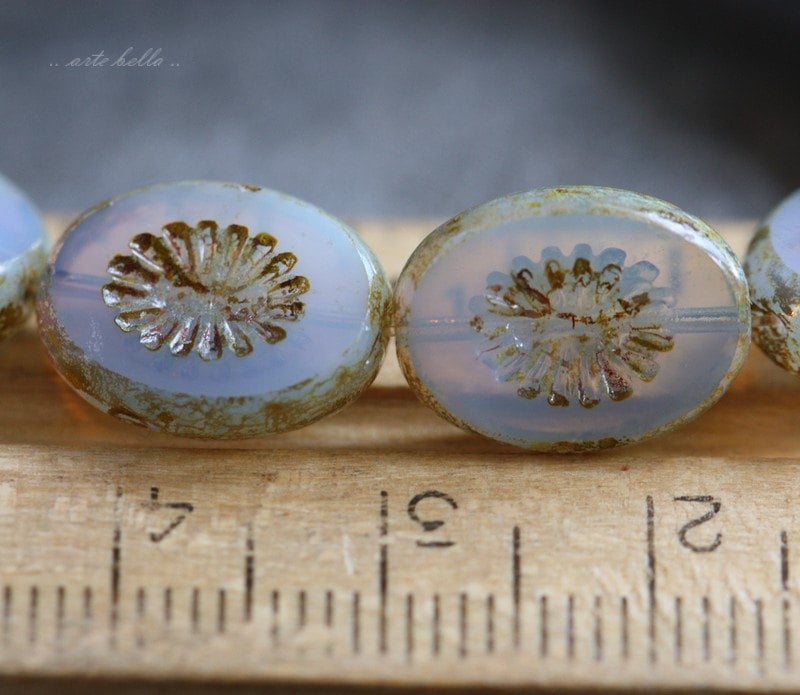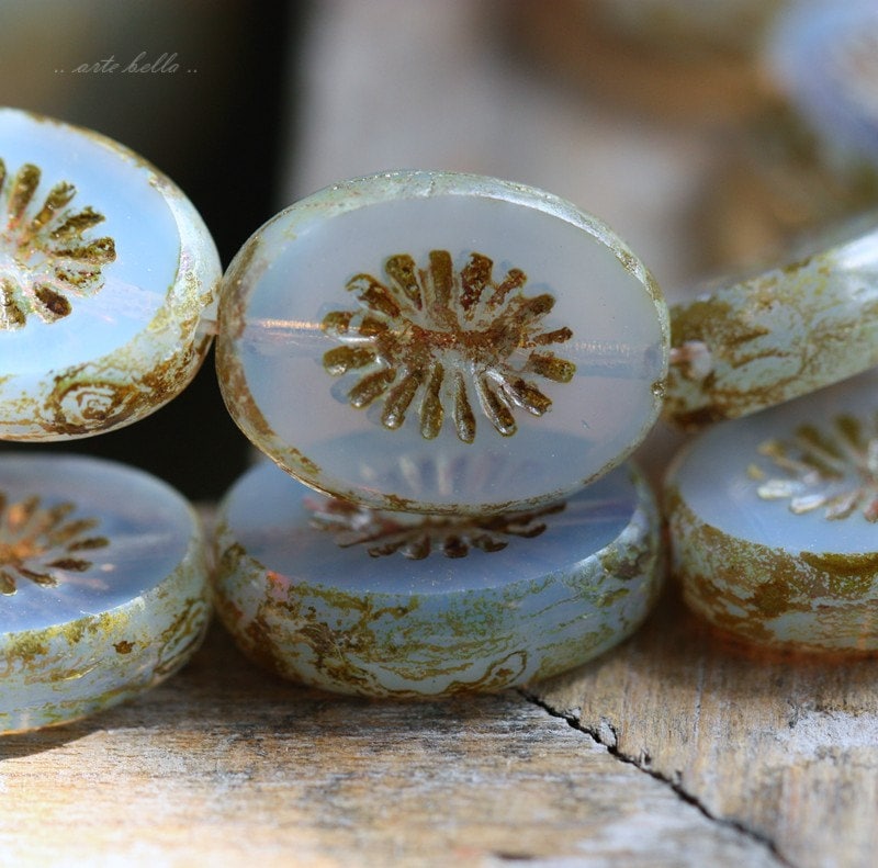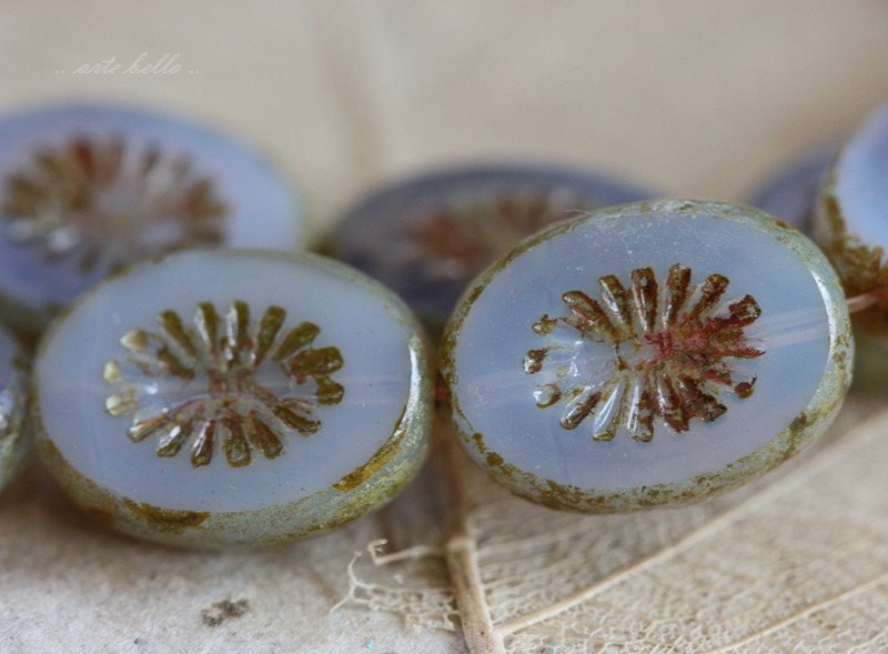 Lightest lilac chunky oval star burst beads with a light Picasso finish. Picasso remains around the edges and the recessed areas, fire polished off on the face of the beads to reveal the gorgeous glass beneath.