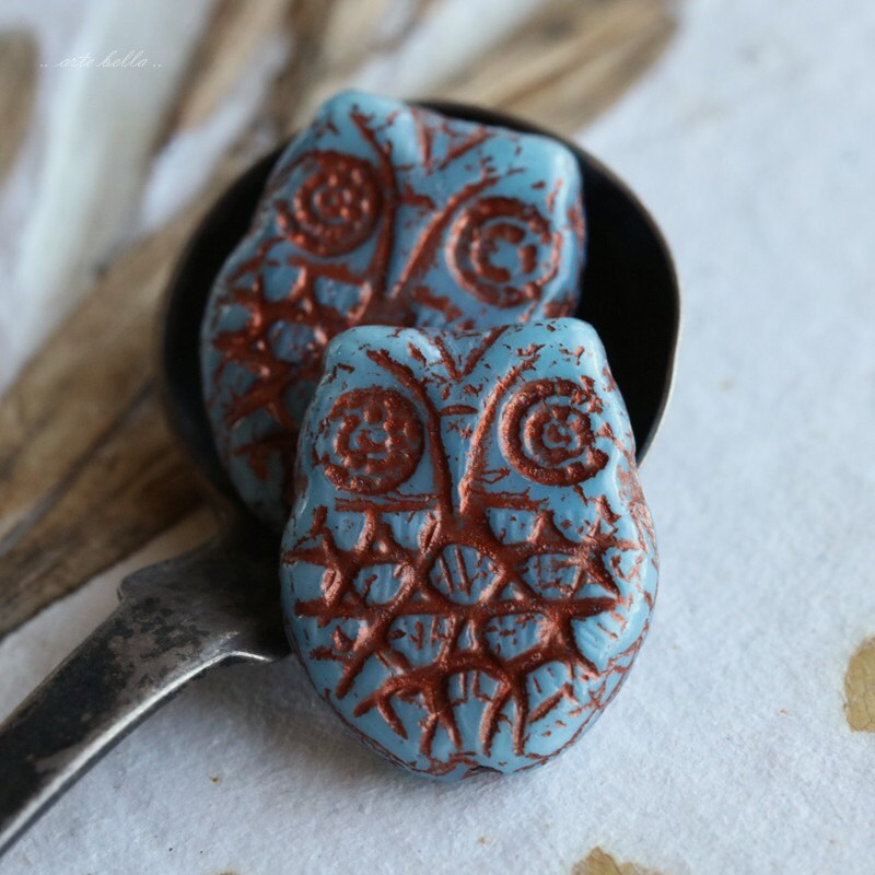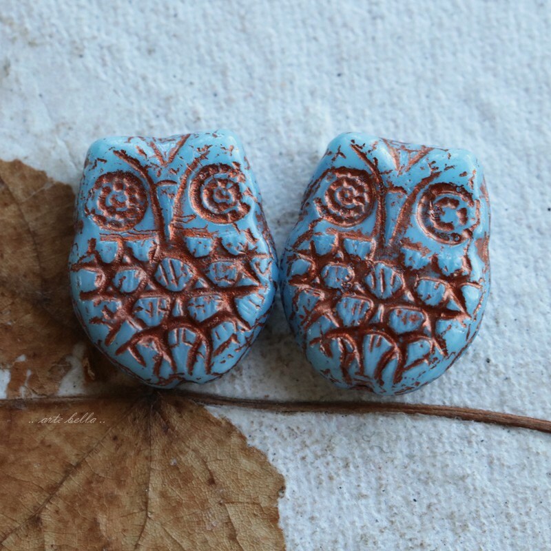 Sky blue base glass coated in copper metallic Picasso finish. **PLEASE NOTE, EVERY OWL IS DIFFERENT AND I CANNOT GUARANTEE YOU WILL RECEIVE A MATCHING PAIR AS THIS IS NEAR IMPOSSIBLE AS YOU CAN SEE FROM MY PICTURES..**
