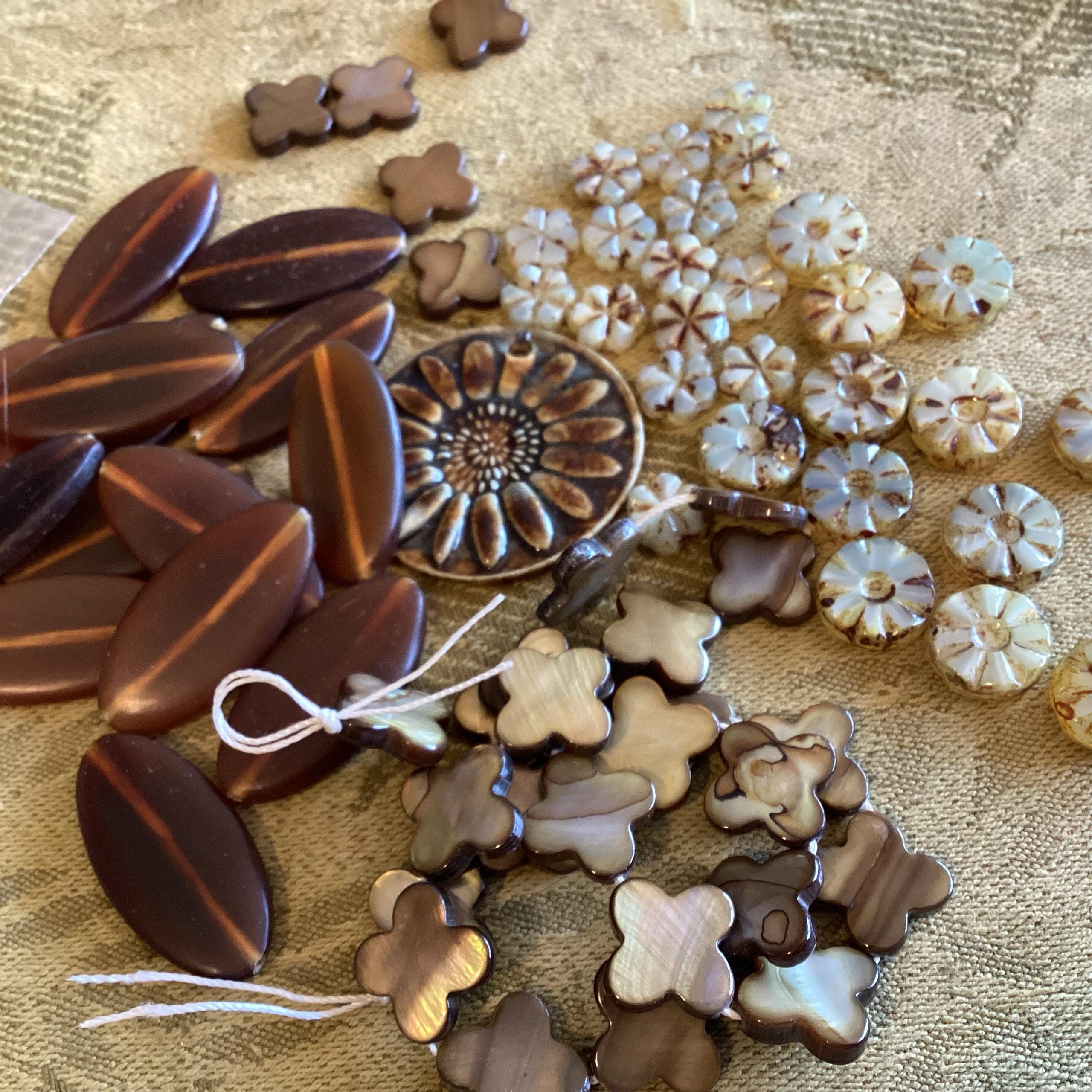 A gorgeous mix of opal and opaque cream glass with an earthy golden brown Picasso finish around the edges and the recessed areas. Fire polished off on the face of the beads to reveal the gorgeous glass beneath.