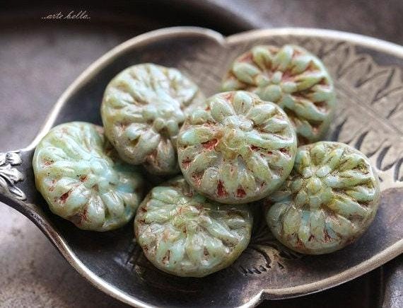 back in stock .. EARTHY SAGE DAHLIAS .. 10 Premium Picasso Czech Glass Dahlia Flower Beads 14mm (5016-st) .. jewelry supplies