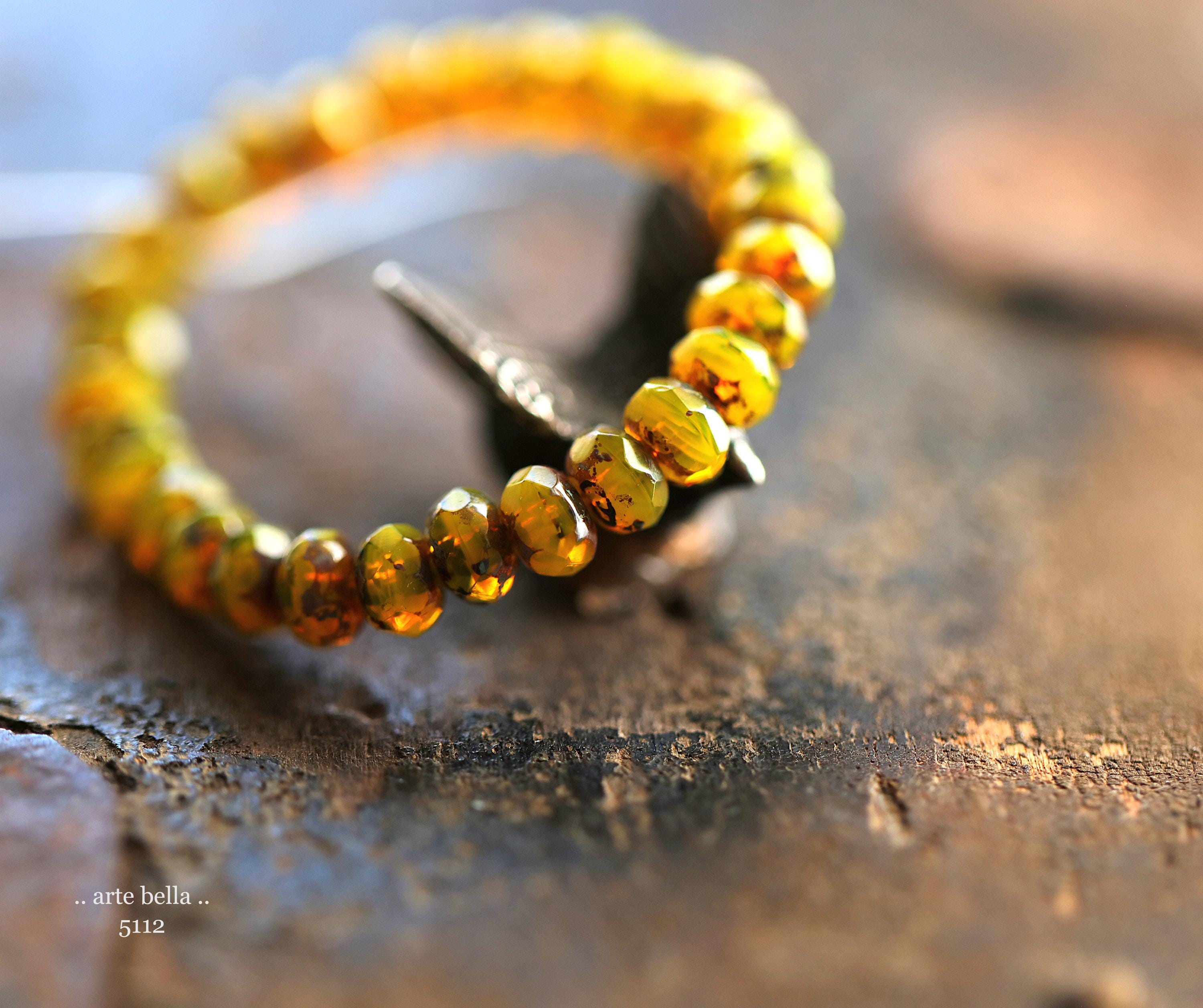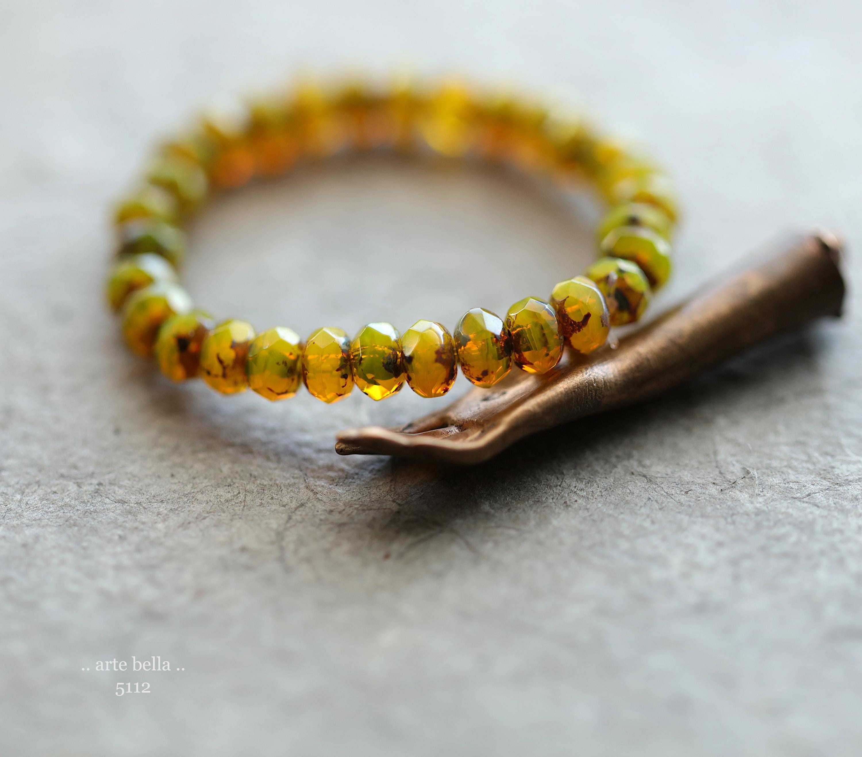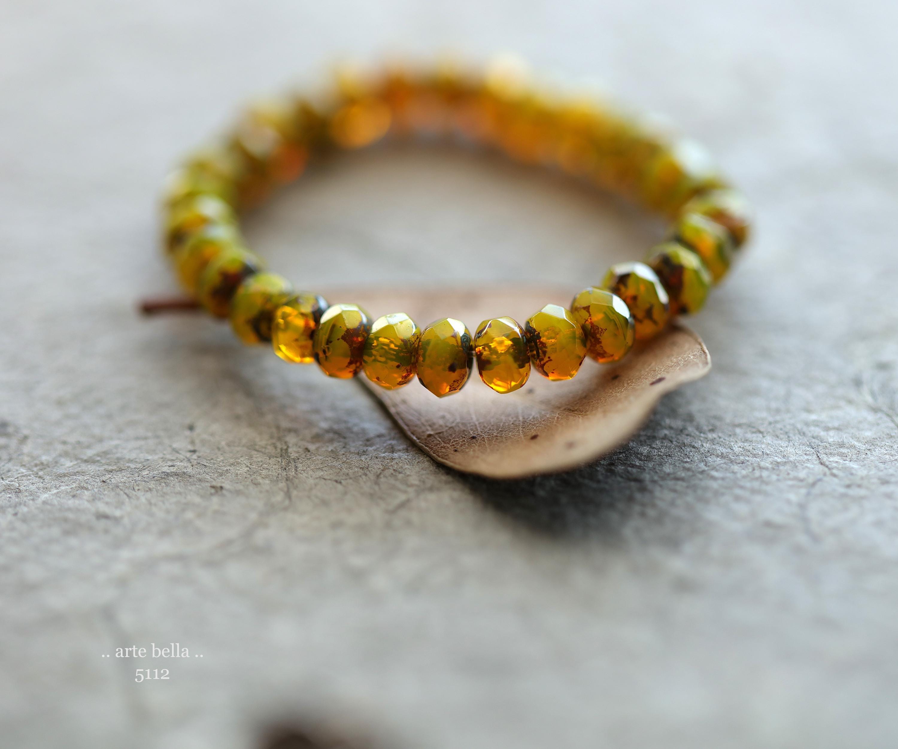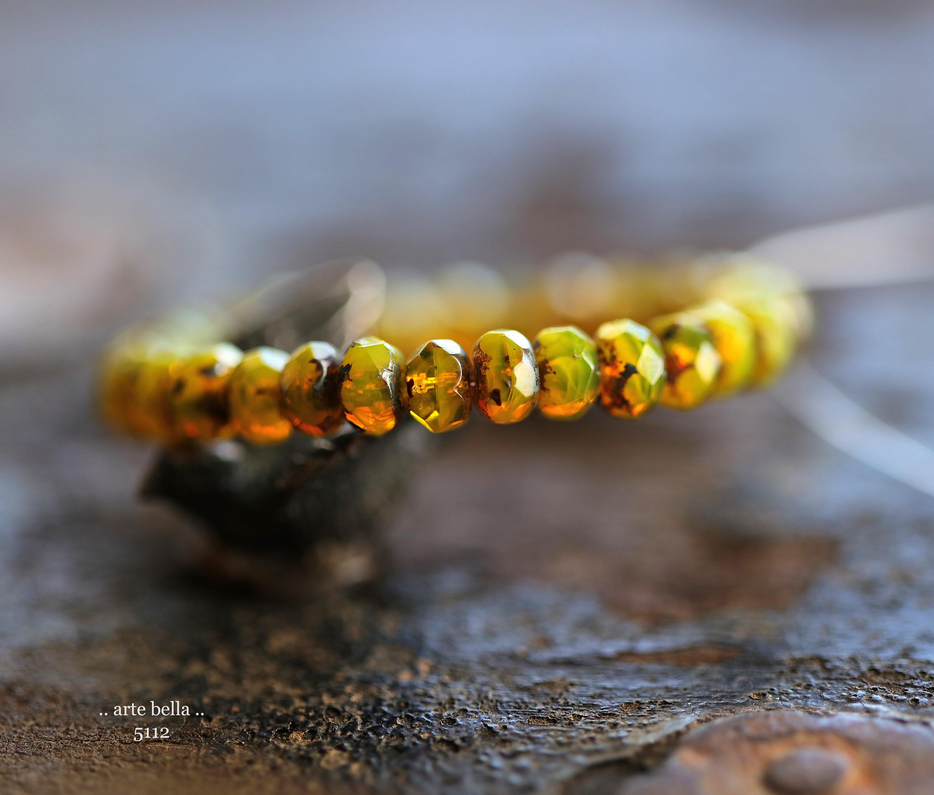 Translucent and milky opal yellow base glass with an earthy Picasso finish, fire polished facets.