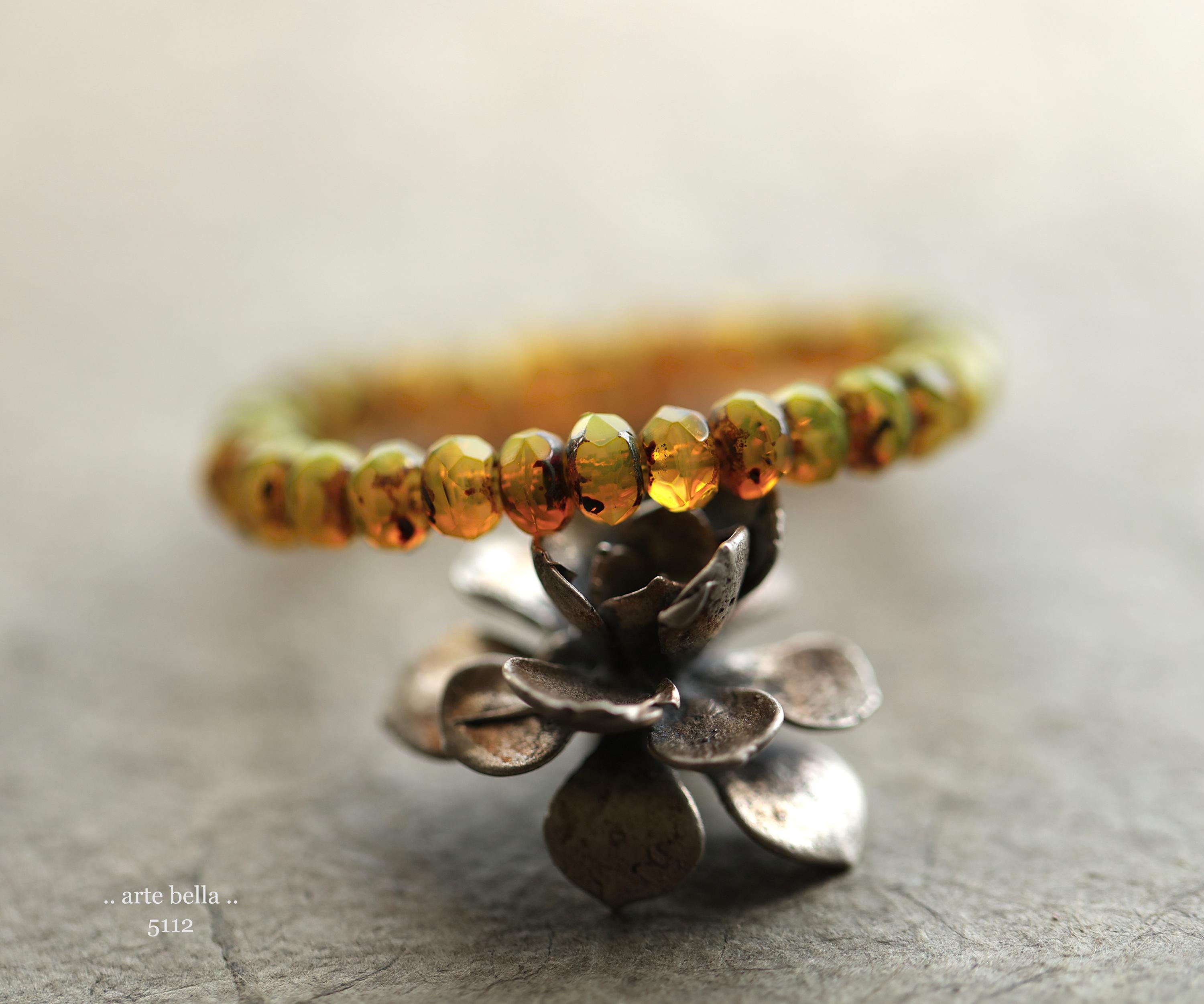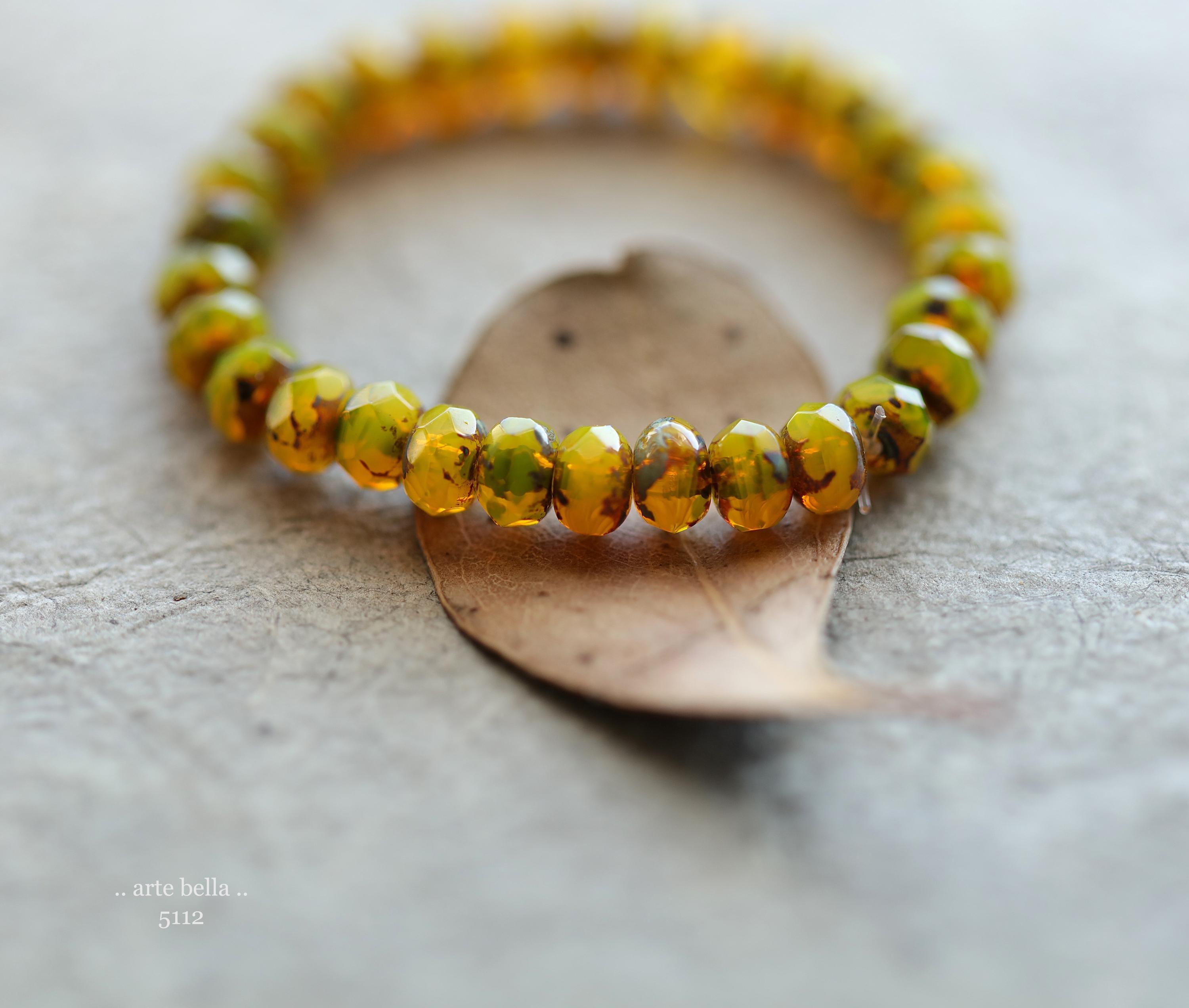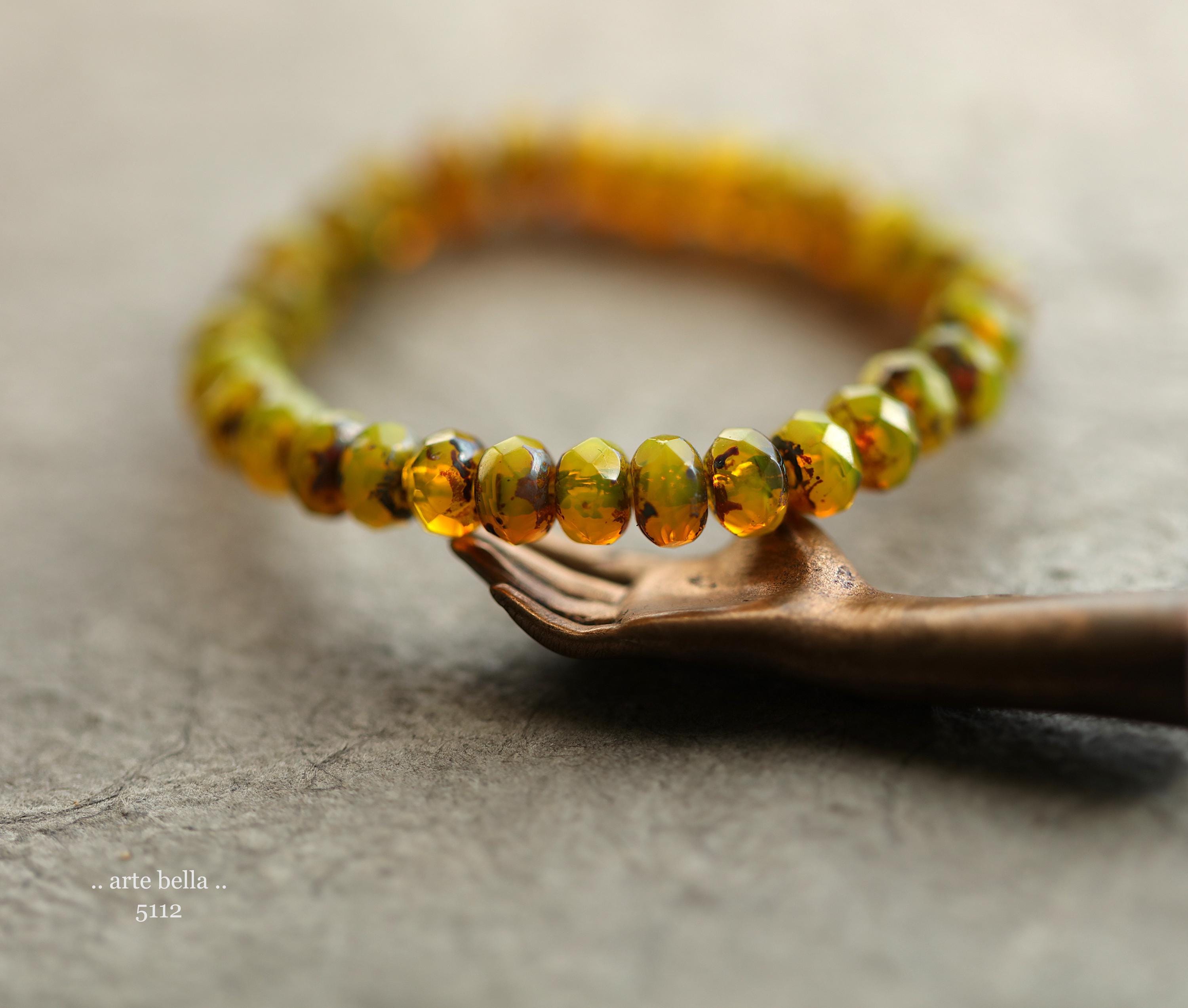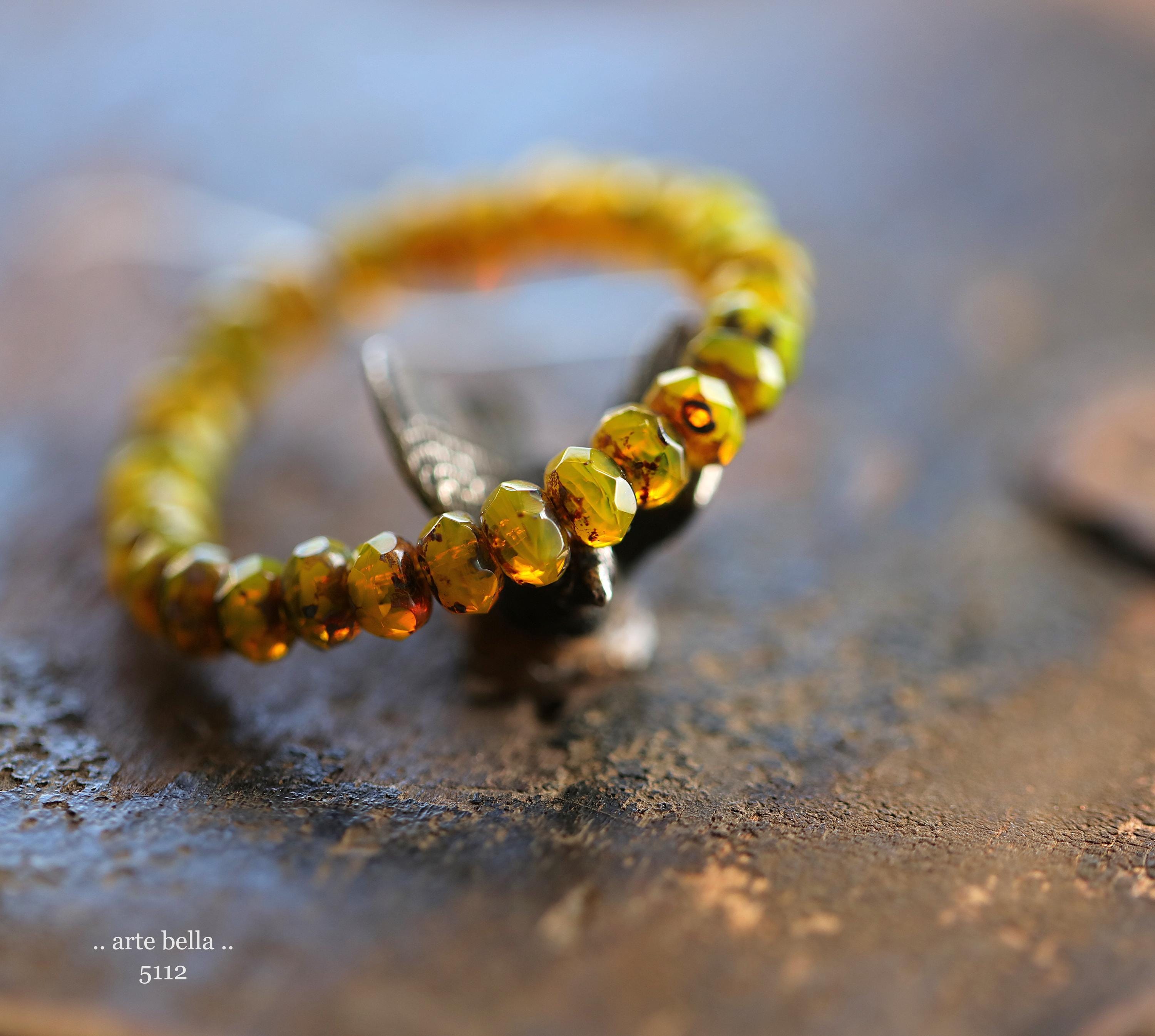 Translucent and milky opal yellow base glass with an earthy Picasso finish, fire polished facets.