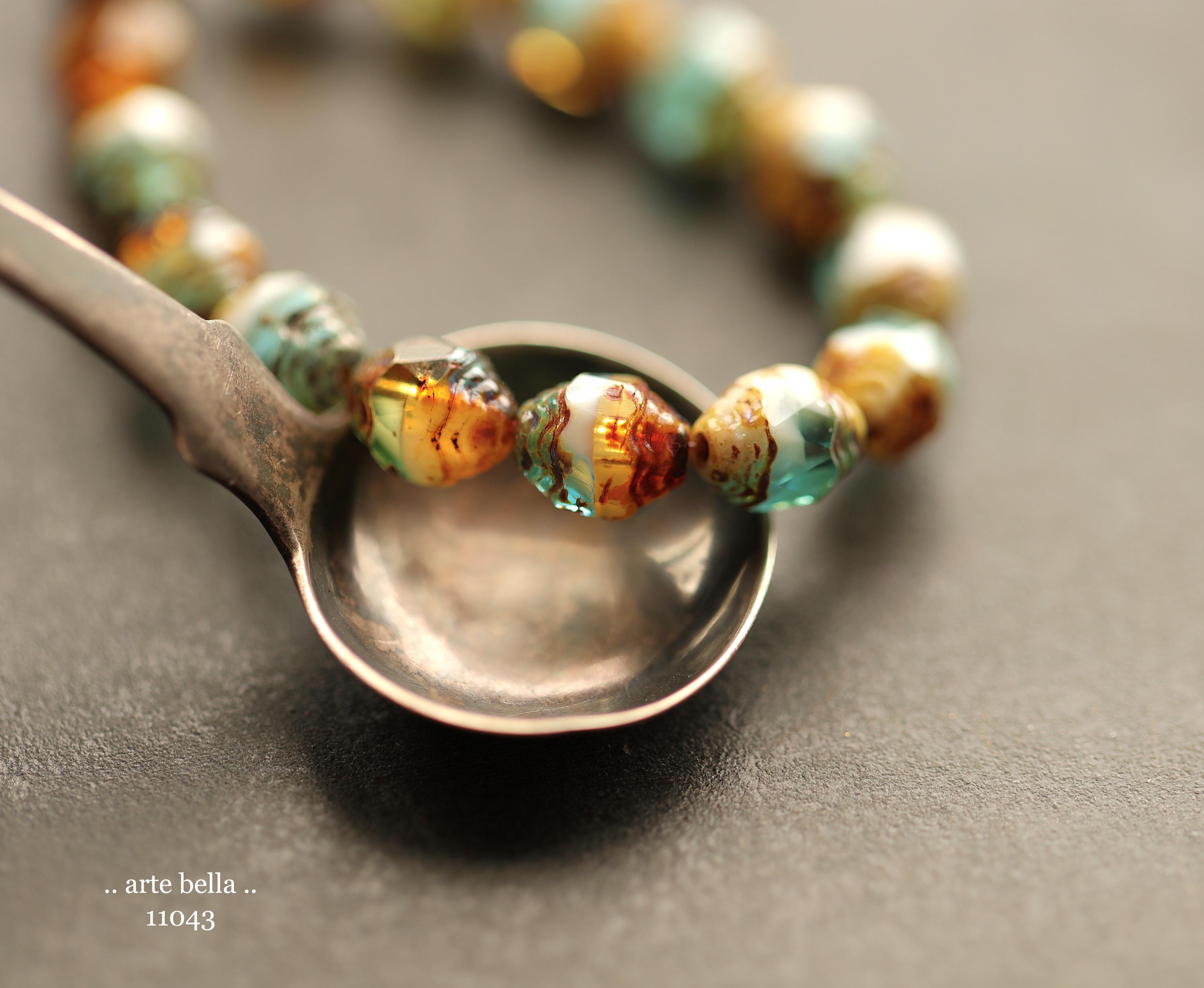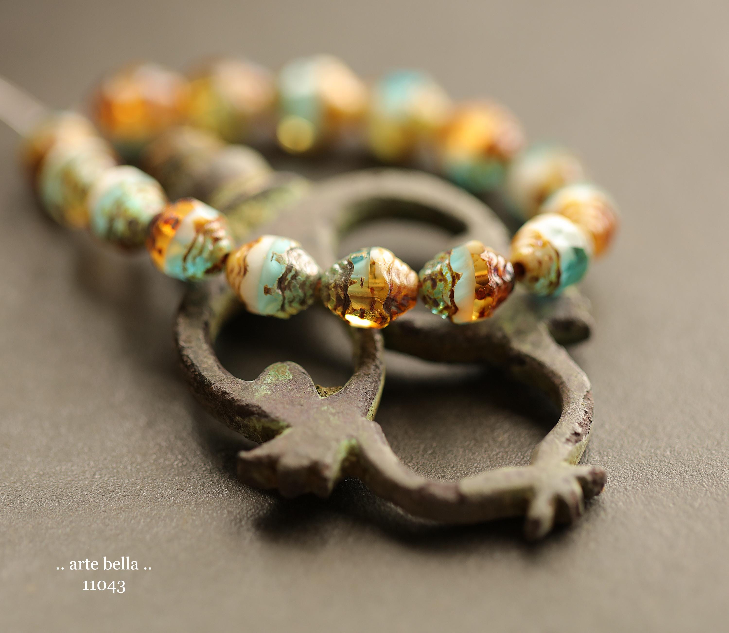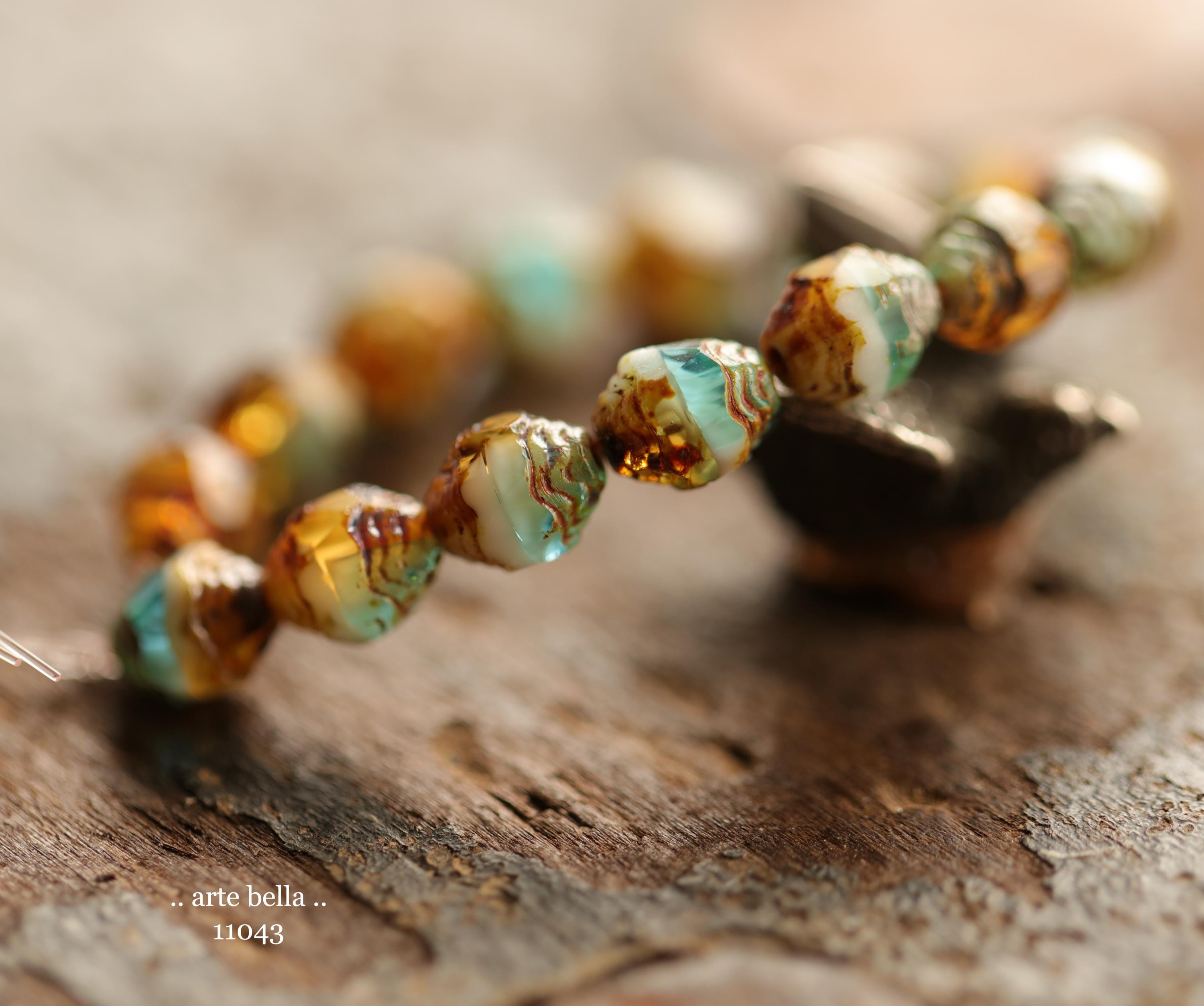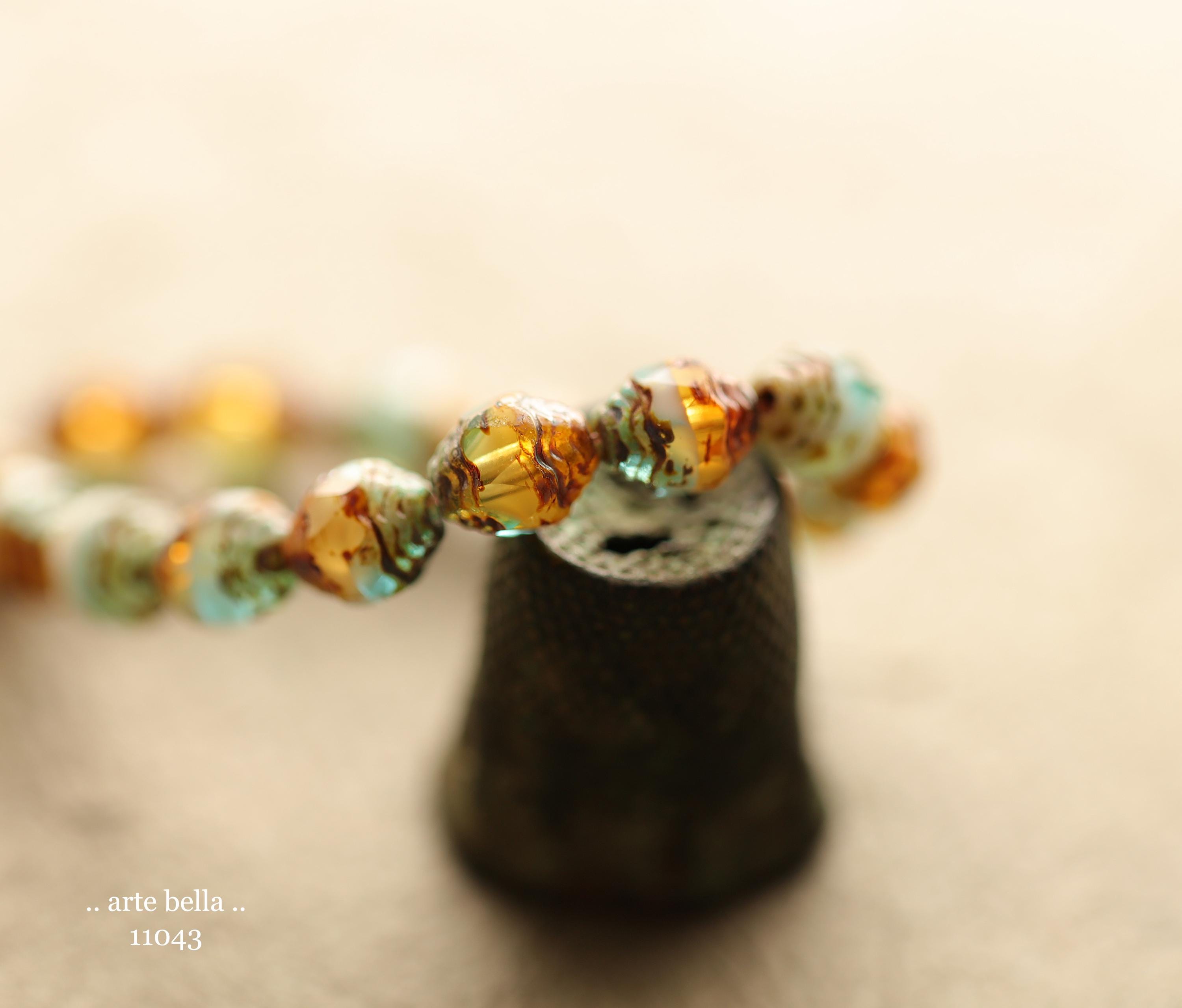 Translucent aqua blue, golden amber and opaque white glass mix with an earthy Picasso finish .. super crisp fire polished facets around the raised center.