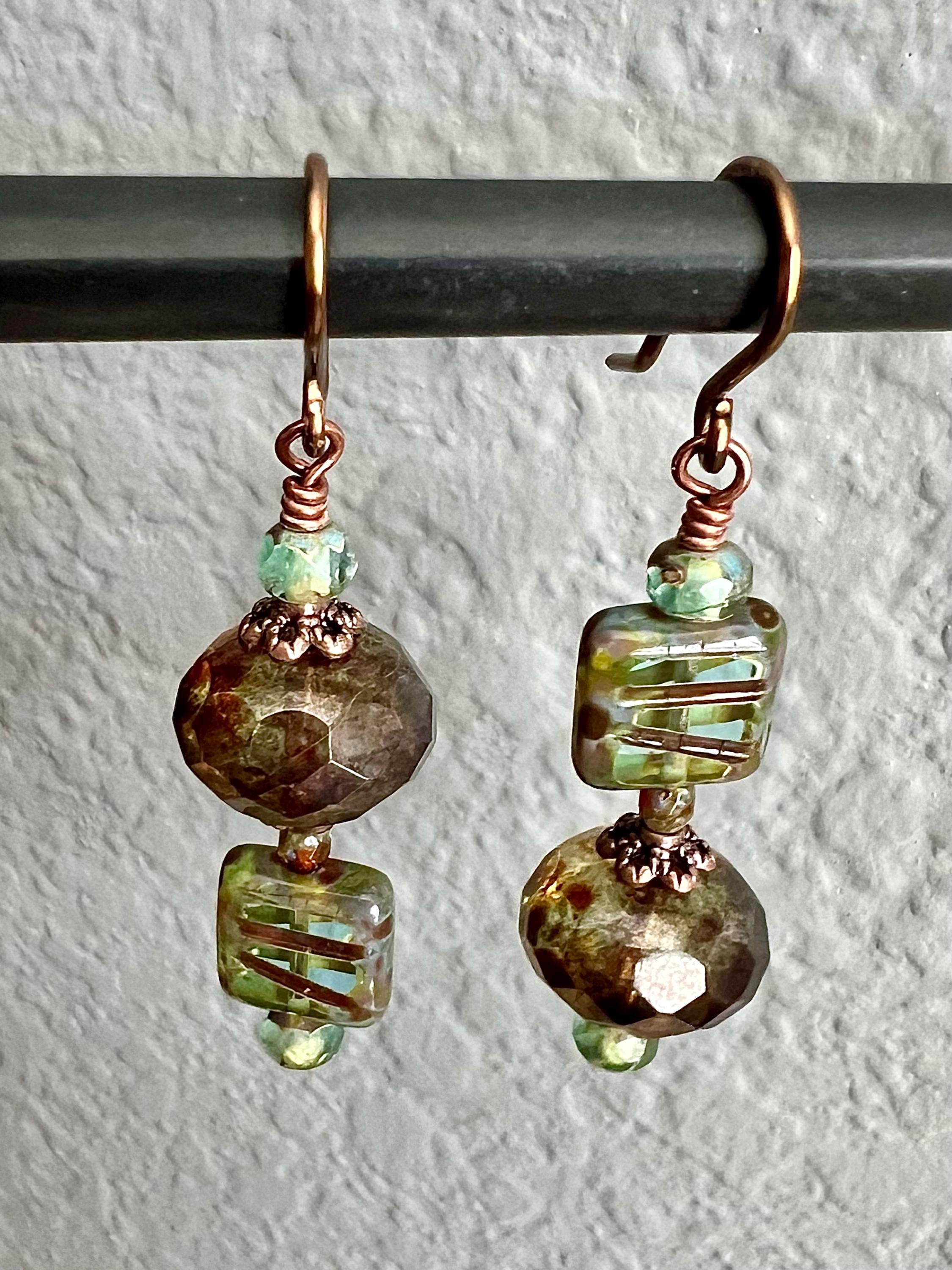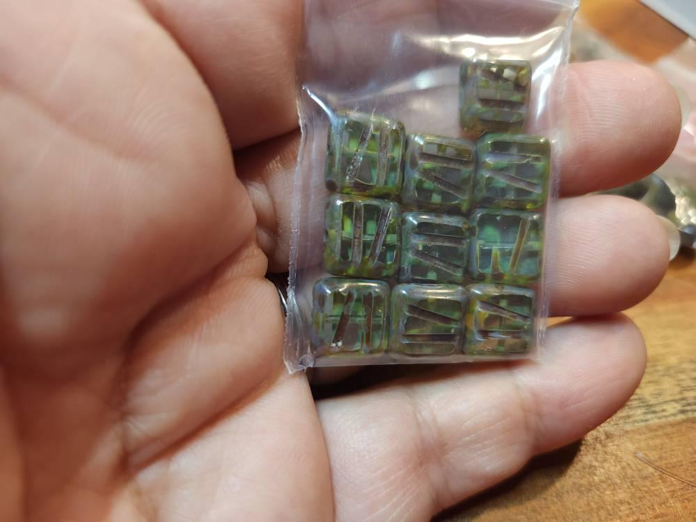NEW .. RIVER GROOVES .. 10 Premium Picasso Czech Glass Square Tile Beads 10mm (11234-10) .. jewelry making supplies