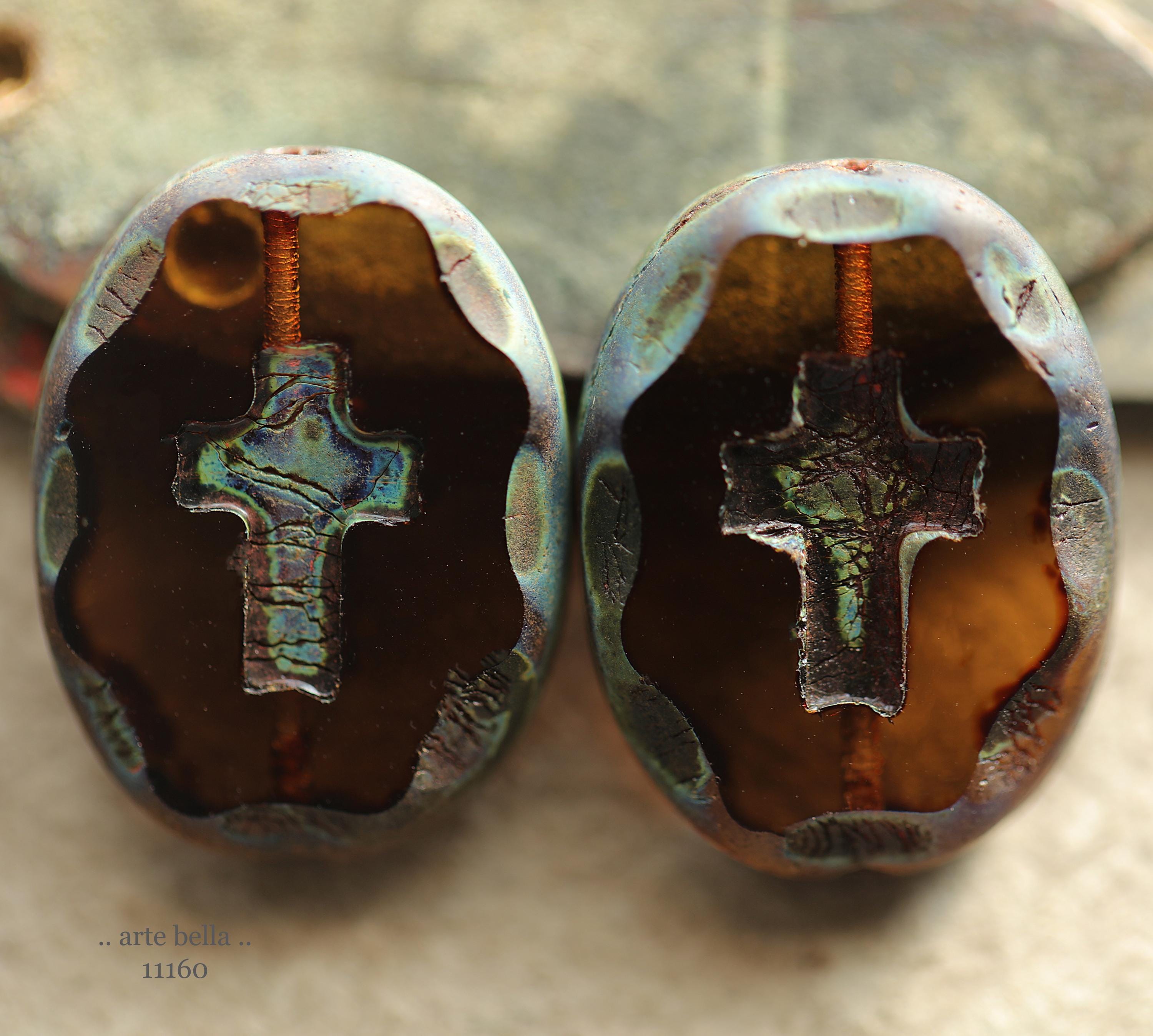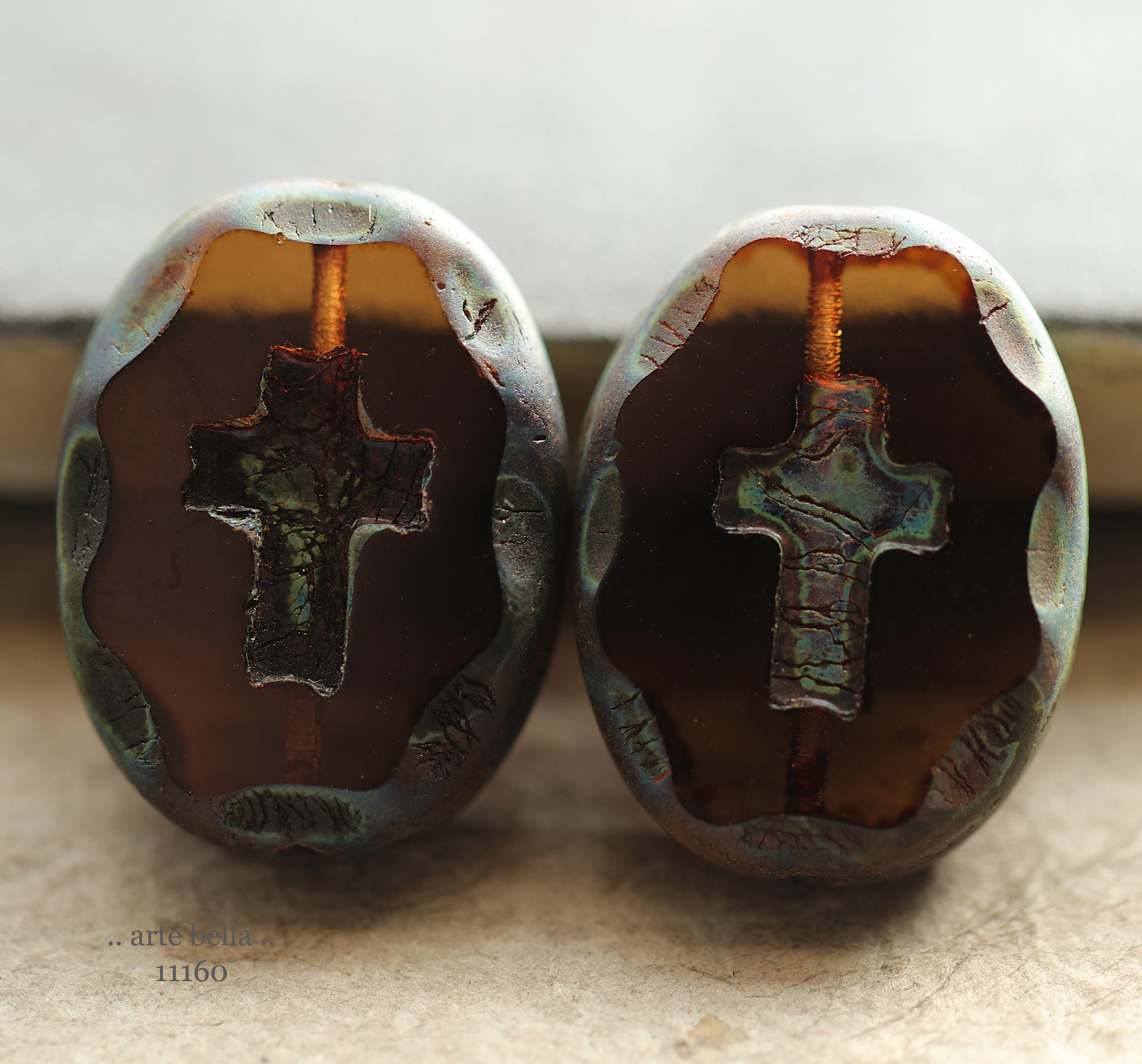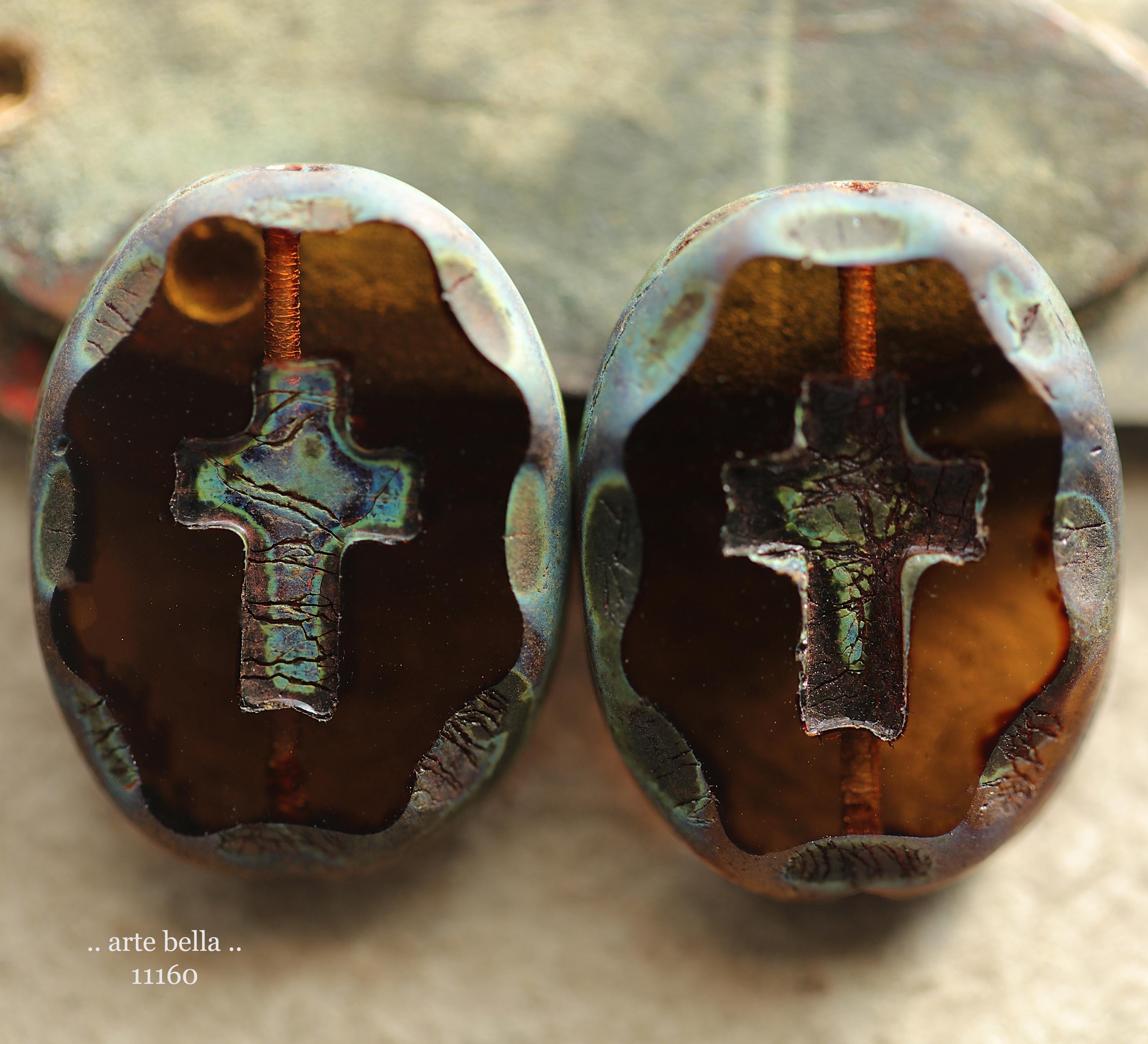 New .. SMOKEY TOPAZ CROSSES No. 1 .. 2 Premium Matte Picasso Czech Glass Oval Cross Bead Mix 25x19mm (11160-2) .. jewelry making supplies