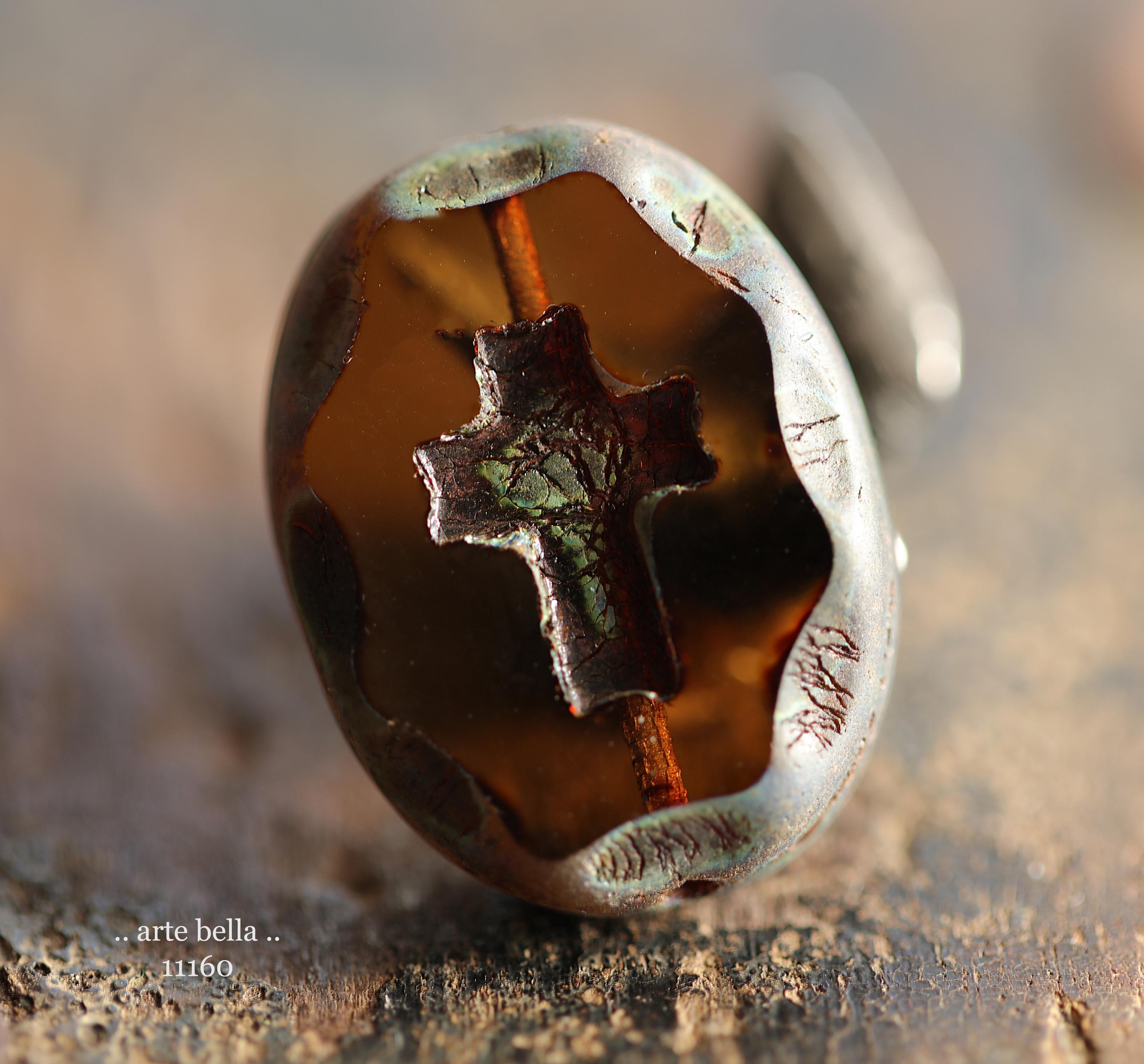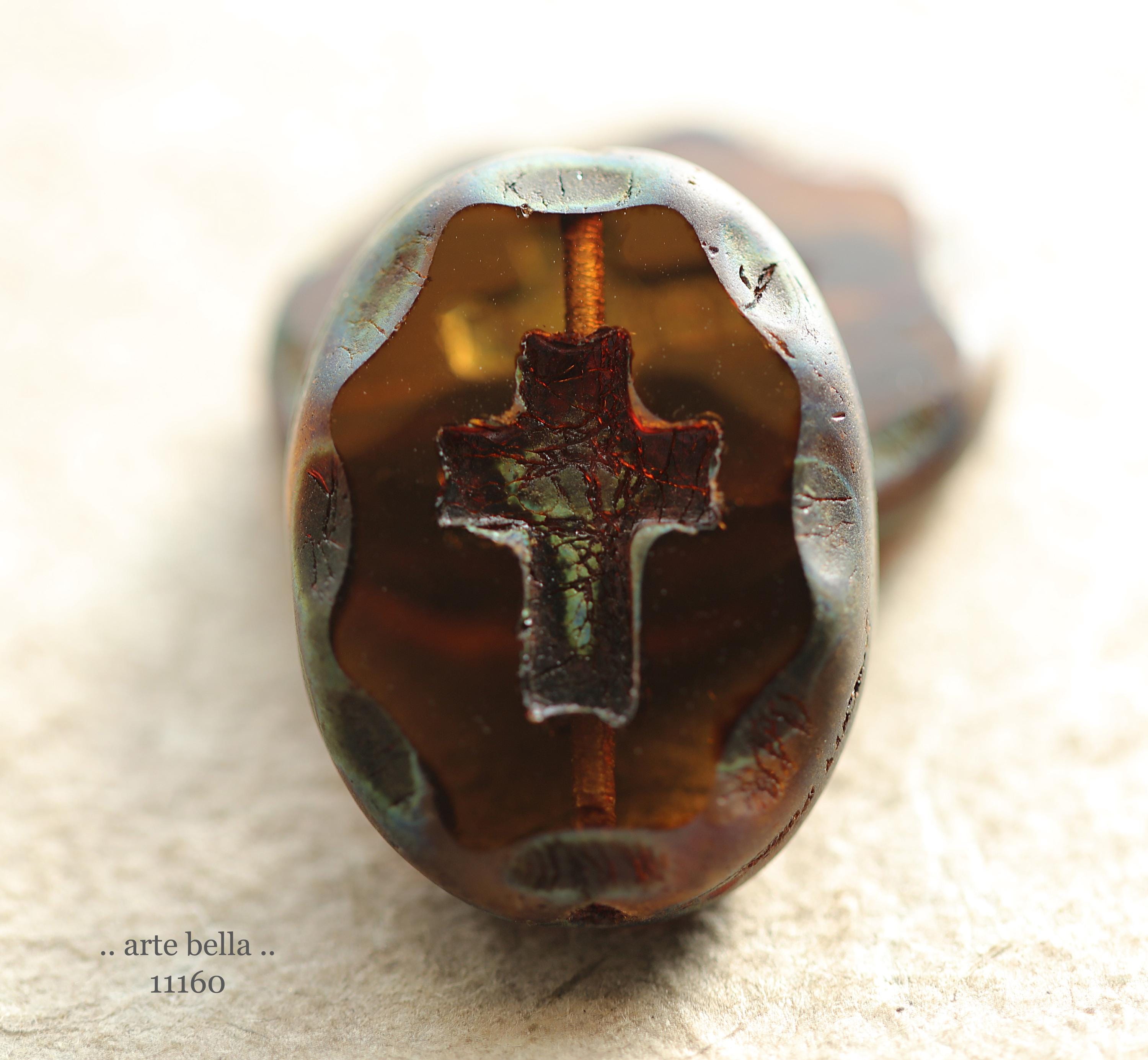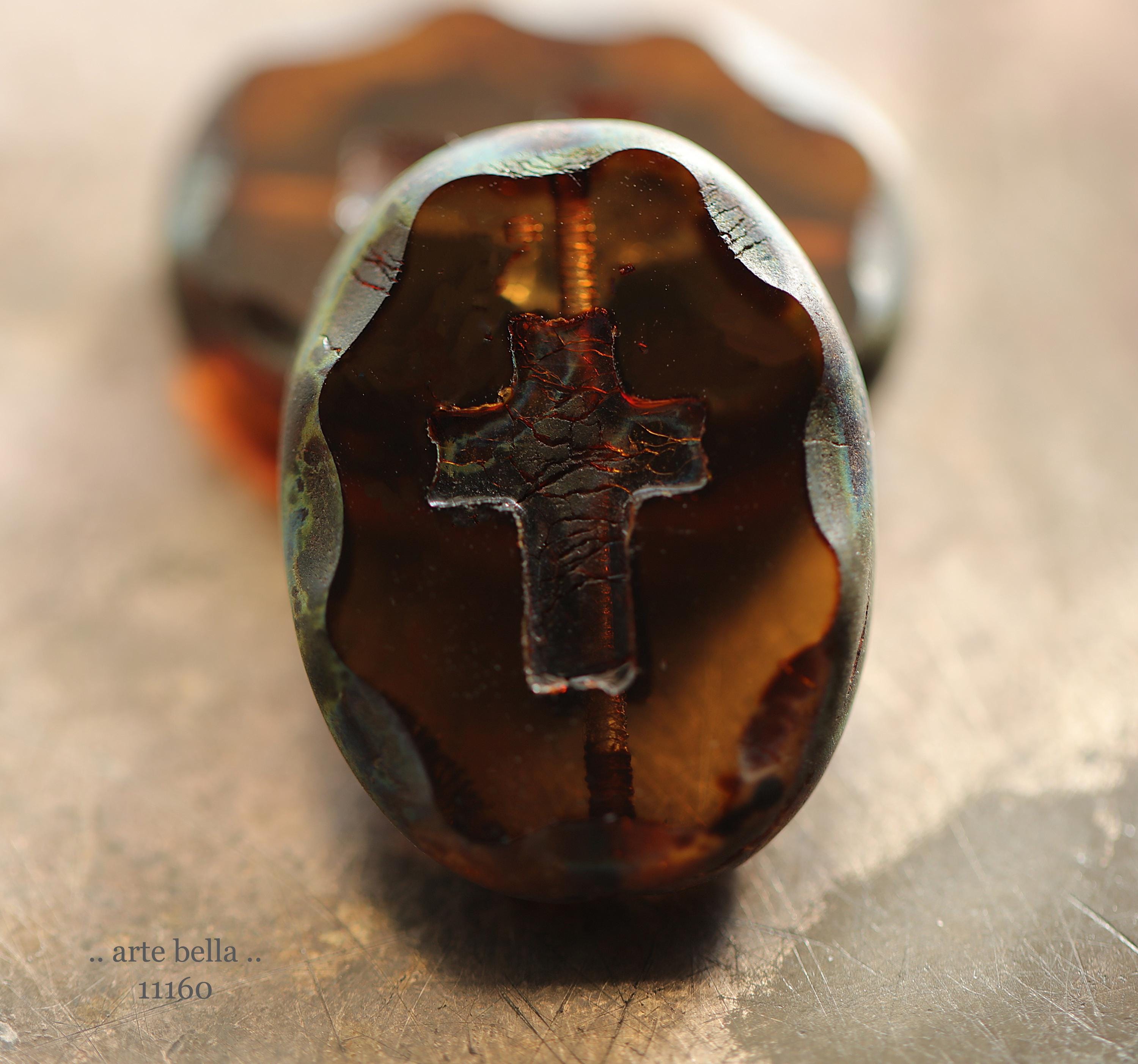 New .. SMOKEY TOPAZ CROSSES No. 1 .. 2 Premium Matte Picasso Czech Glass Oval Cross Bead Mix 25x19mm (11160-2) .. jewelry making supplies