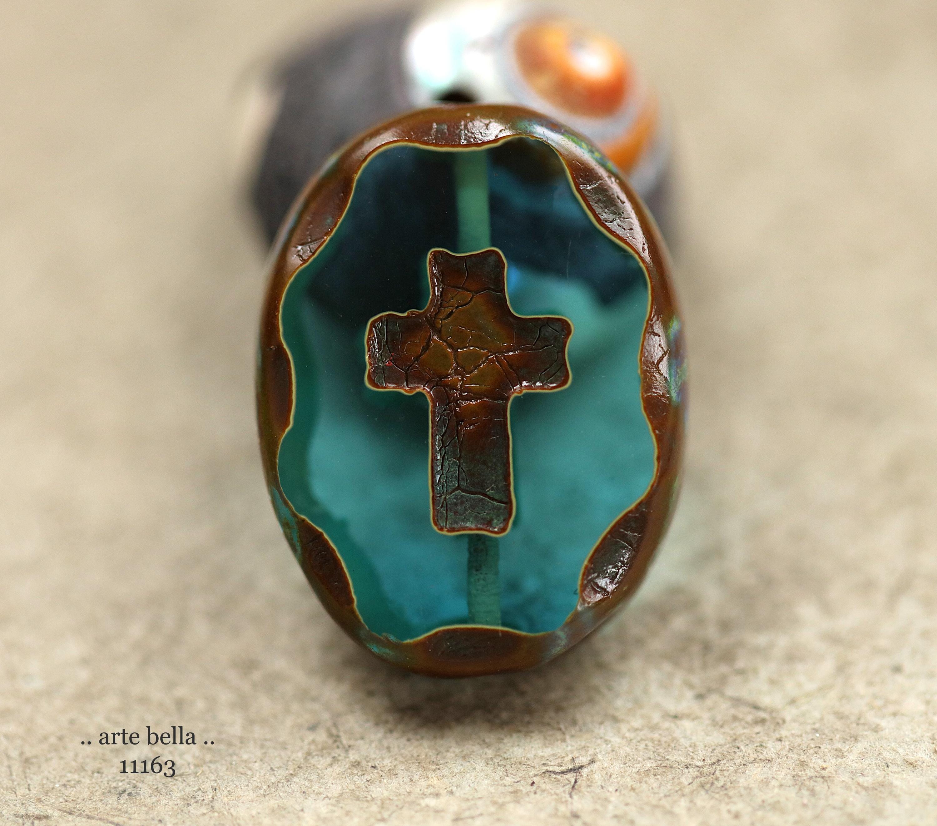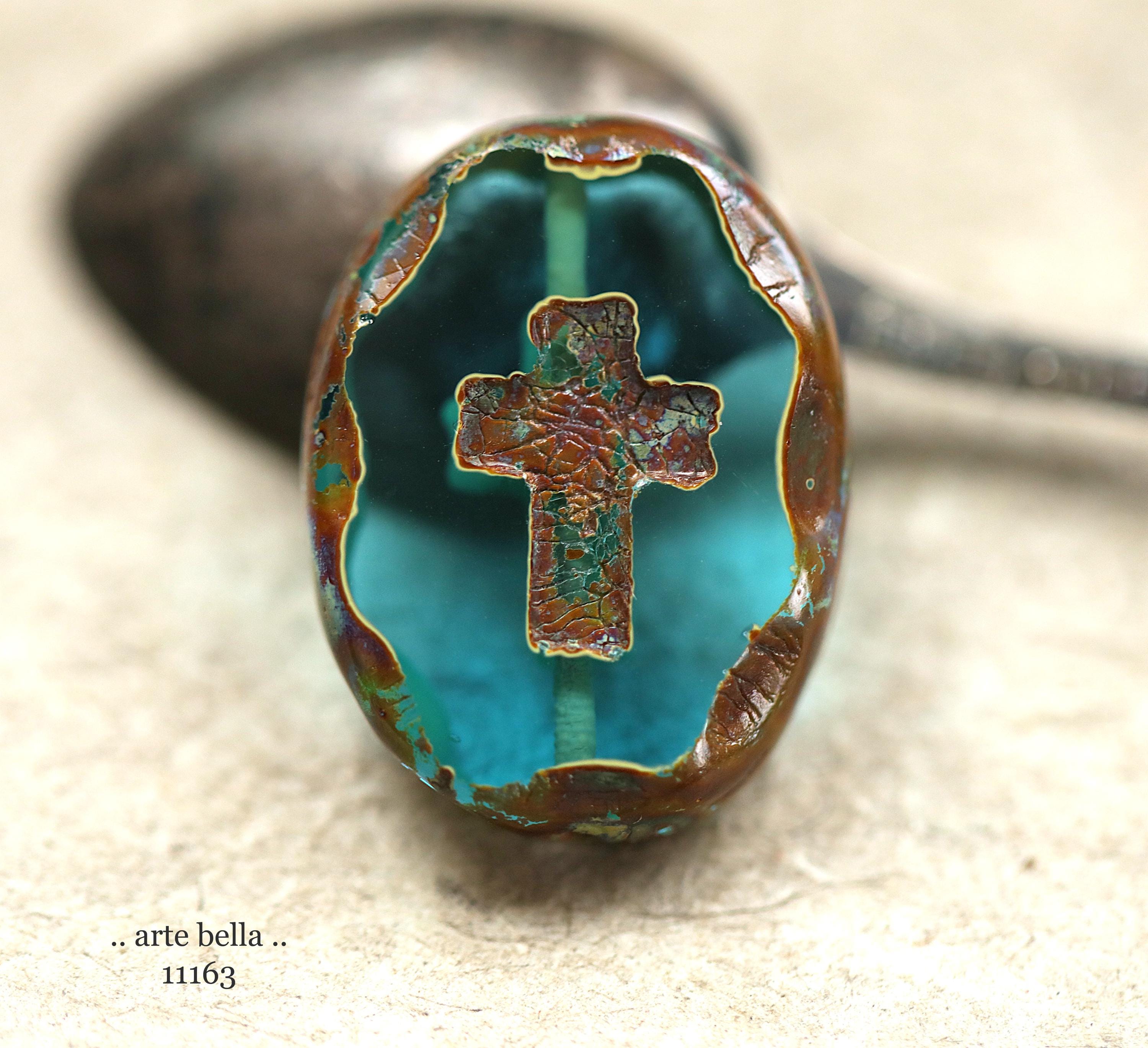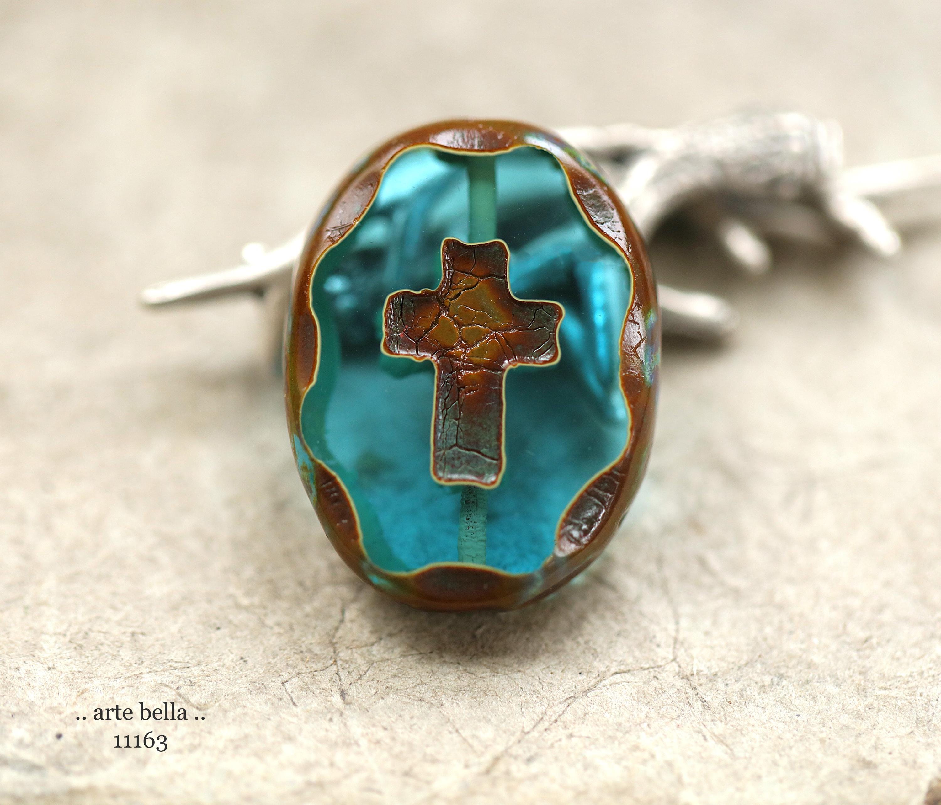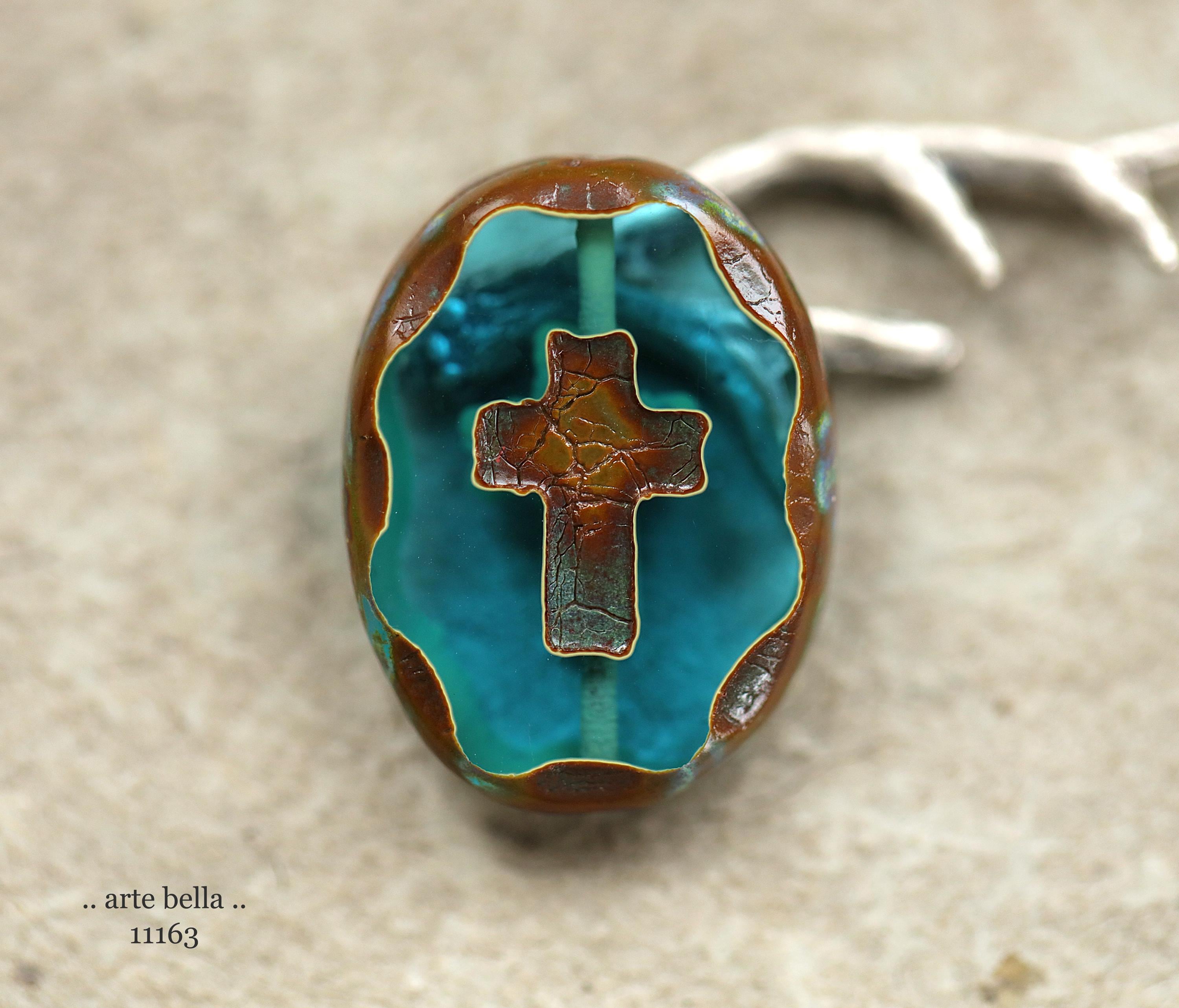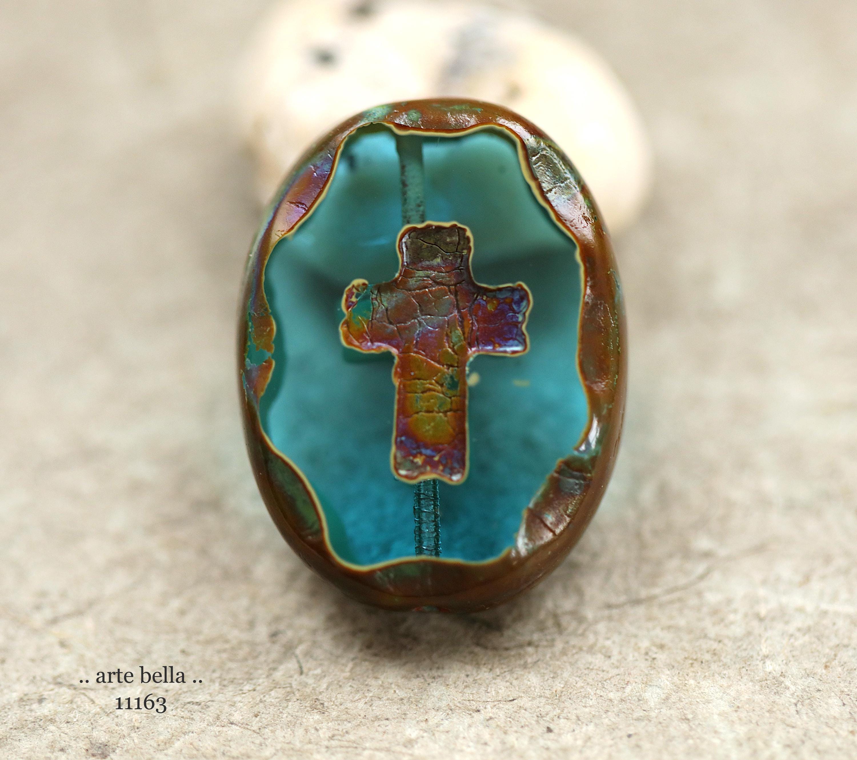 BROWN AQUA CROSSES .. New 2 Premium Picasso Czech Glass Oval Cross Bead Mix 25x19mm (11163-2) .. jewelry making supplies