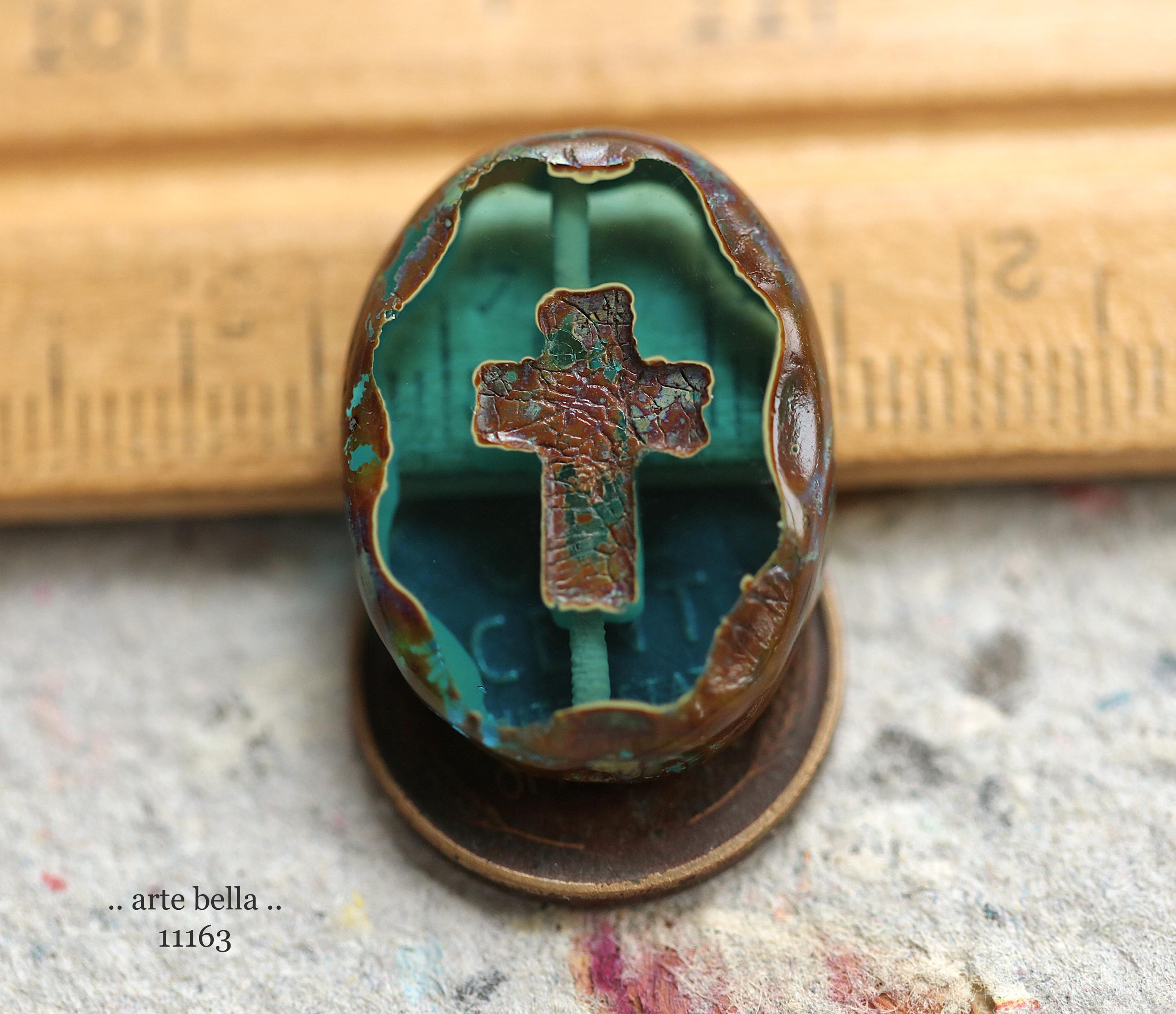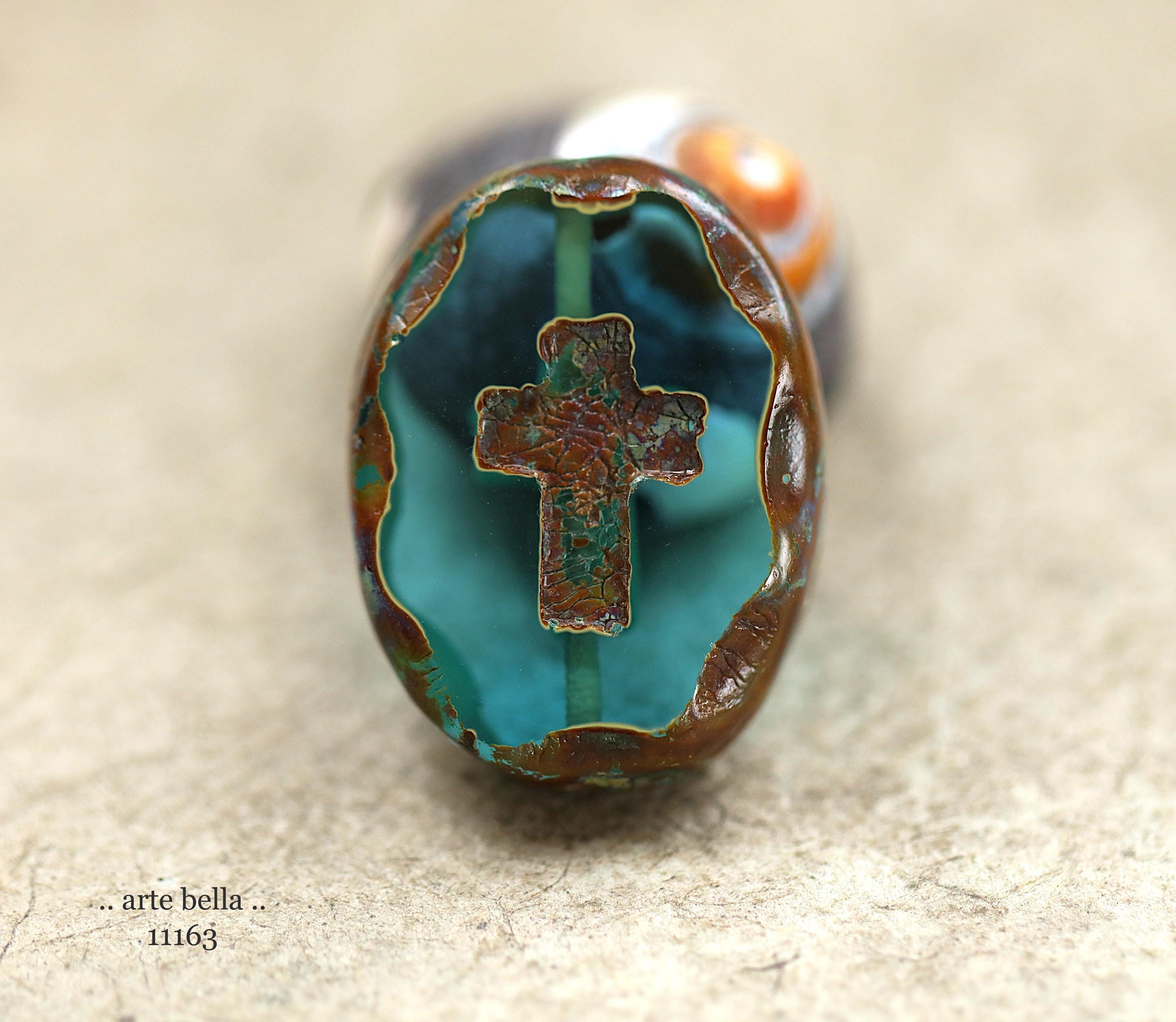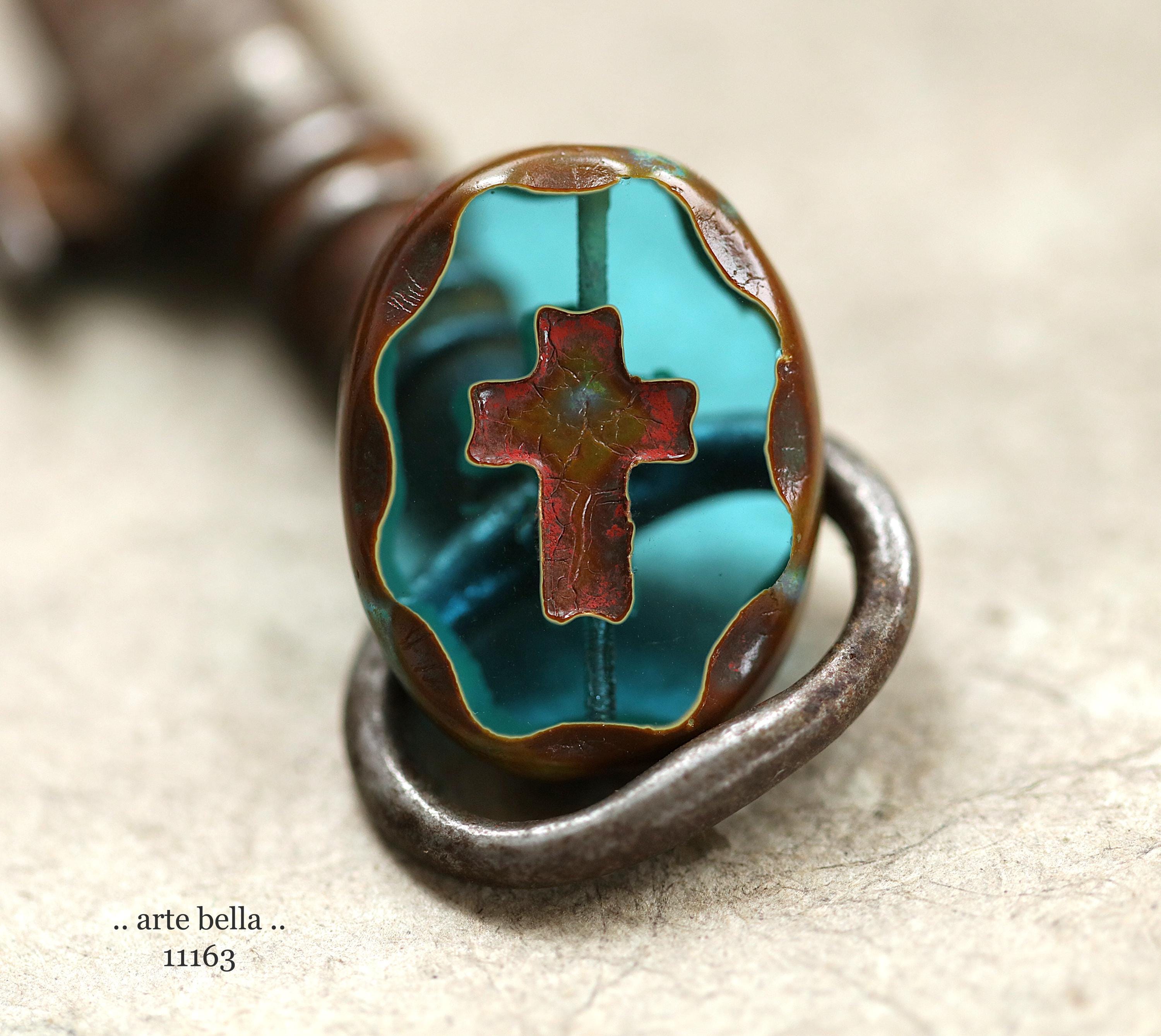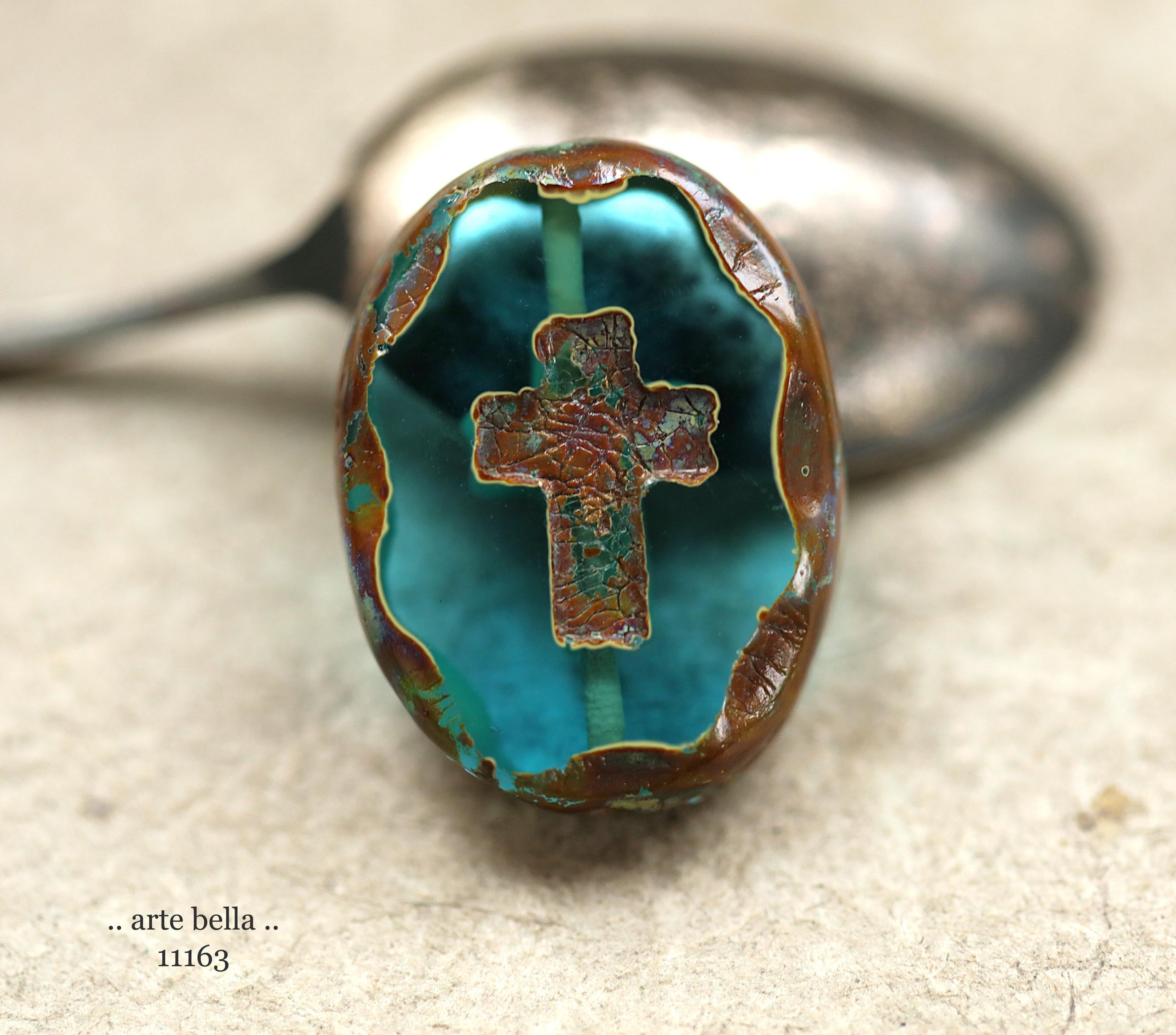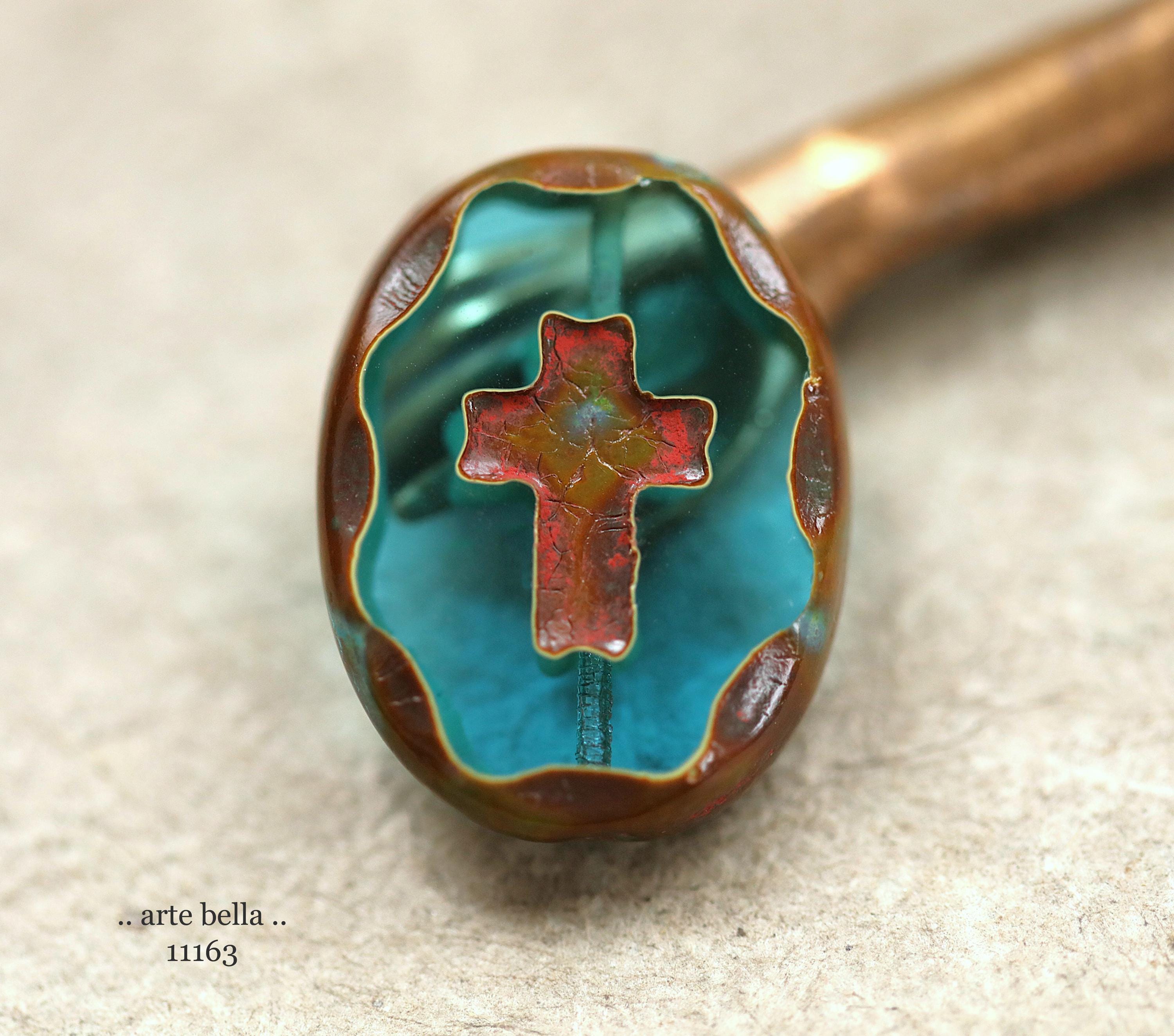BROWN AQUA CROSSES .. New 2 Premium Picasso Czech Glass Oval Cross Bead Mix 25x19mm (11163-2) .. jewelry making supplies