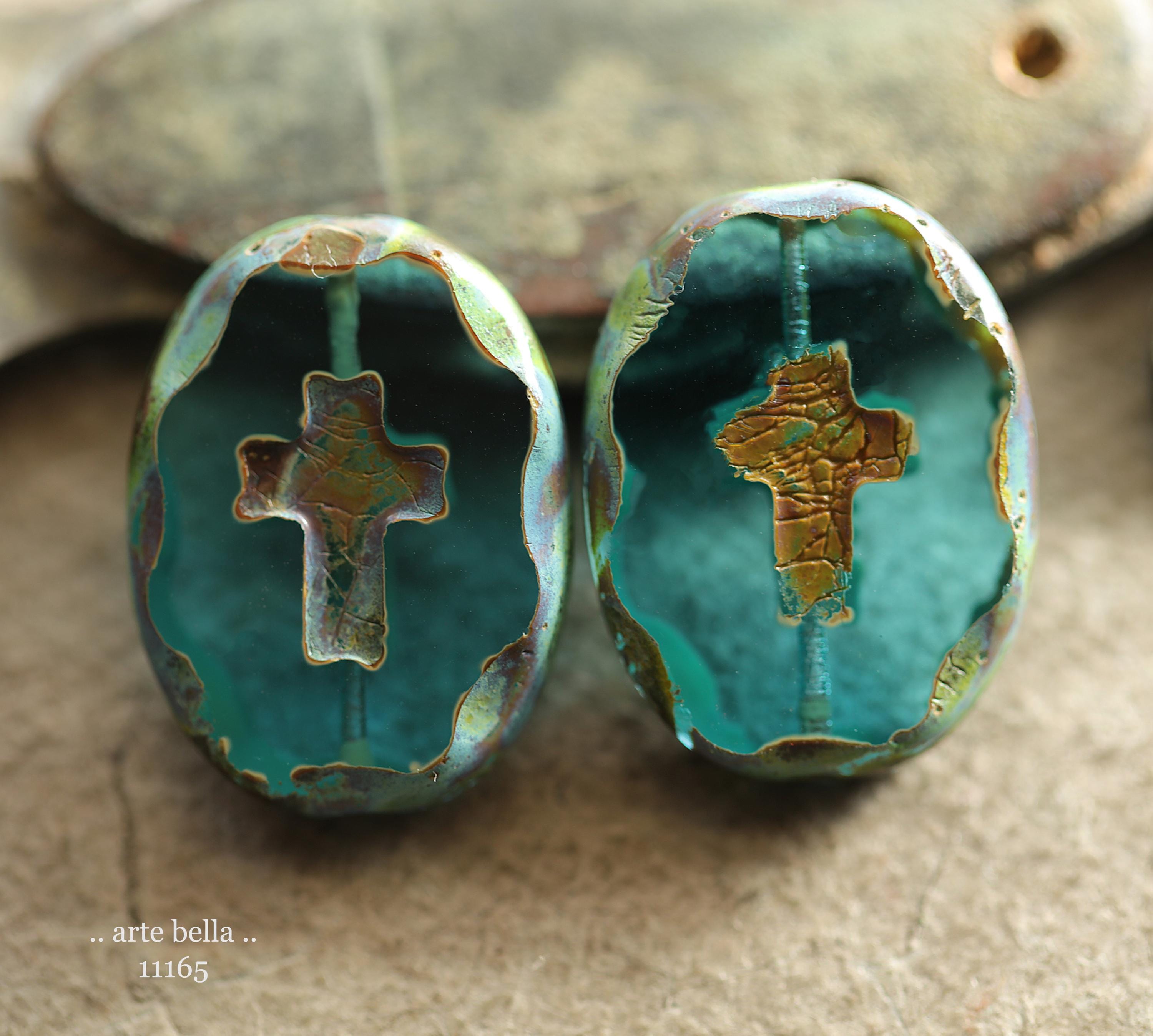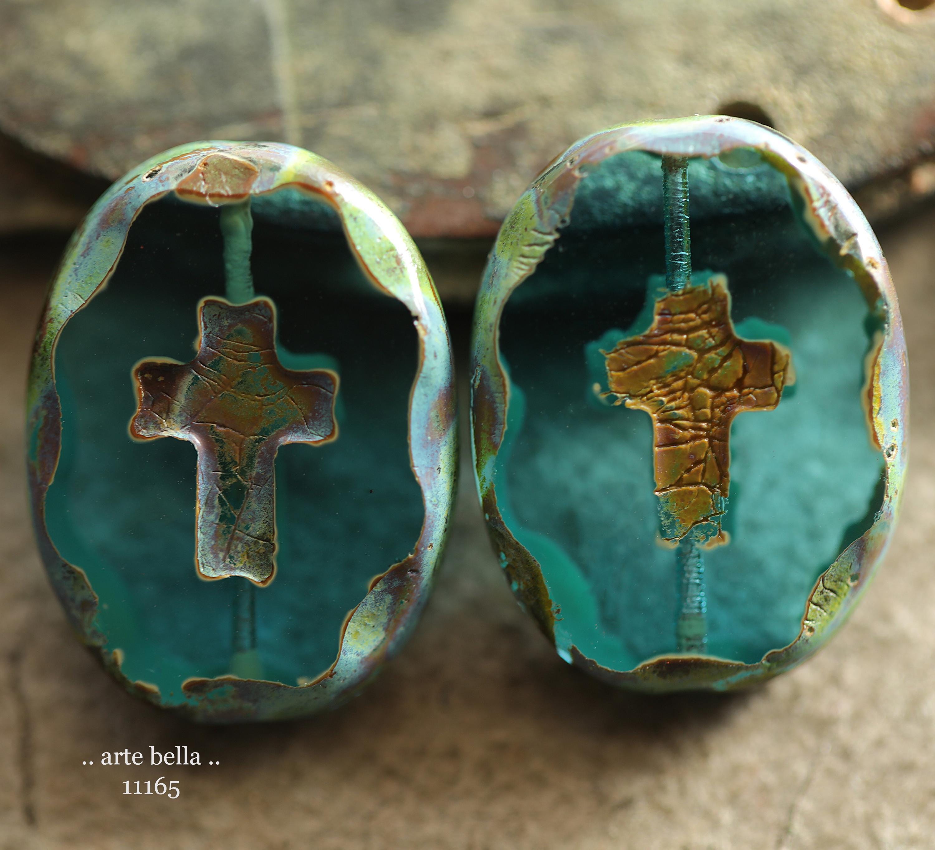 New .. EARTHY AQUA CROSSES .. 2 Premium Picasso Czech Glass Oval Cross Bead Mix 25x19mm (11165-2) .. jewelry making supplies