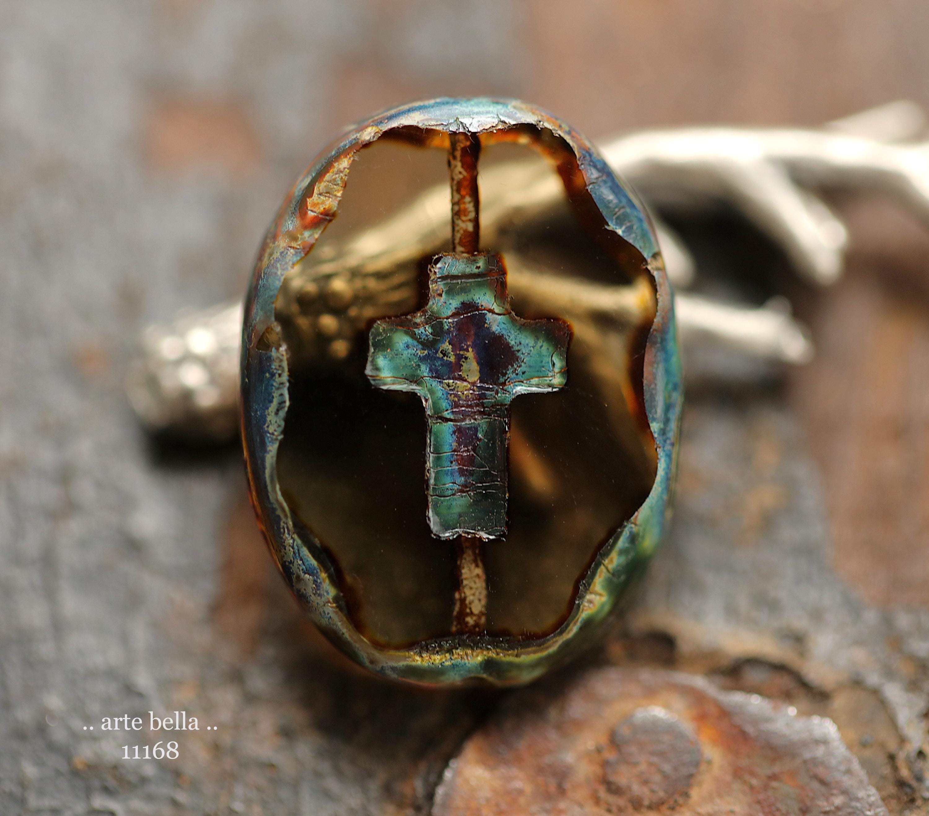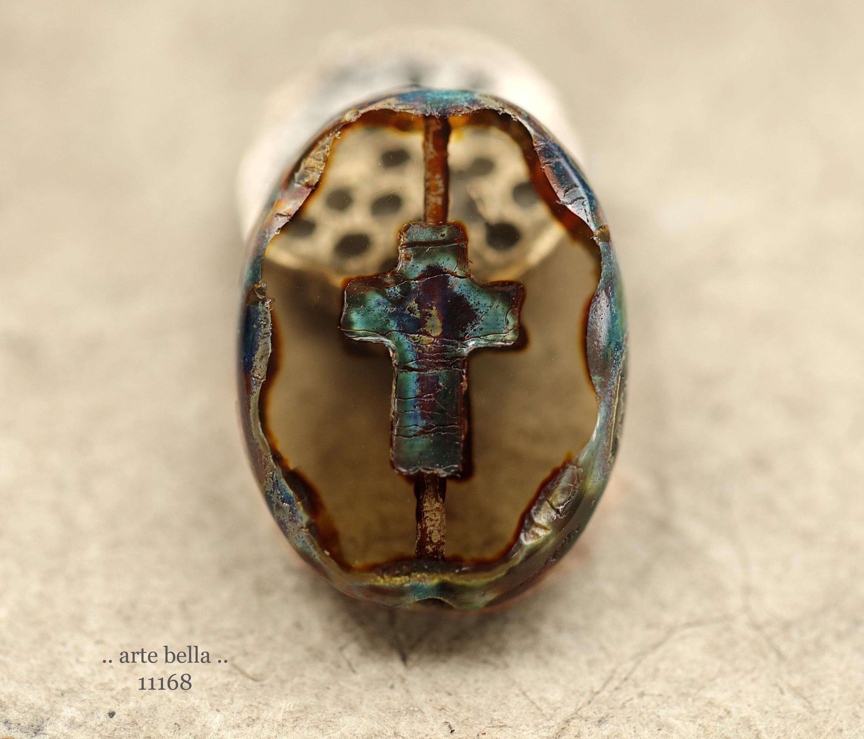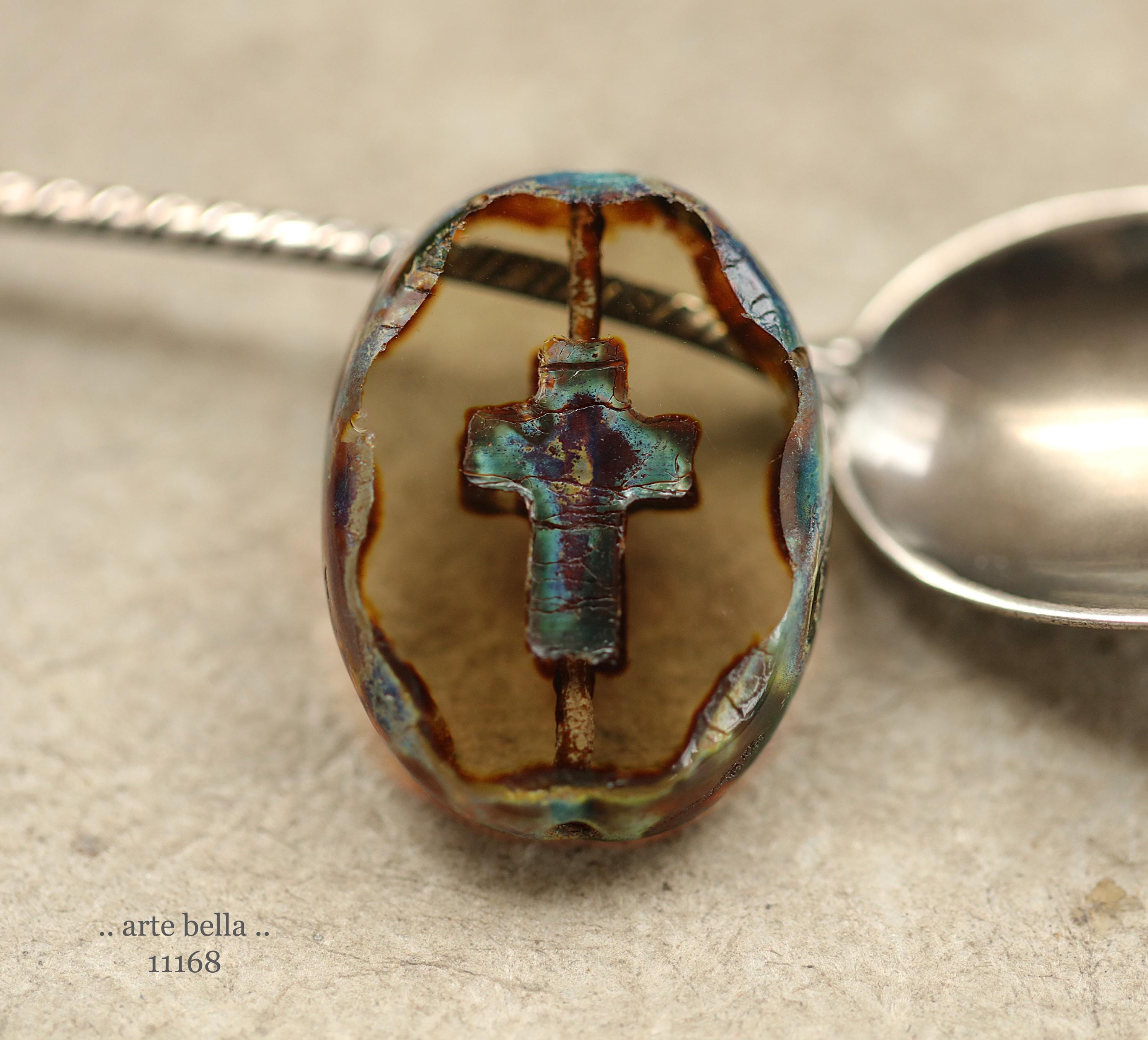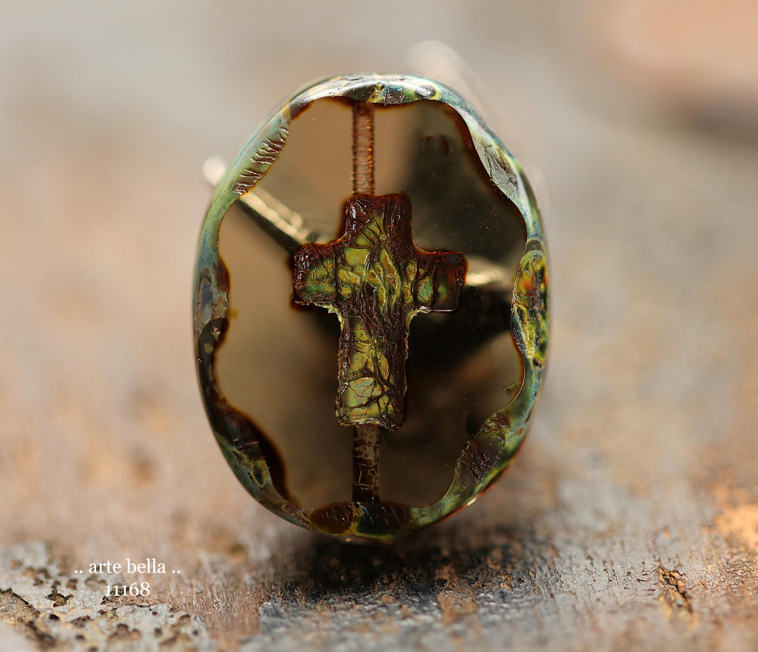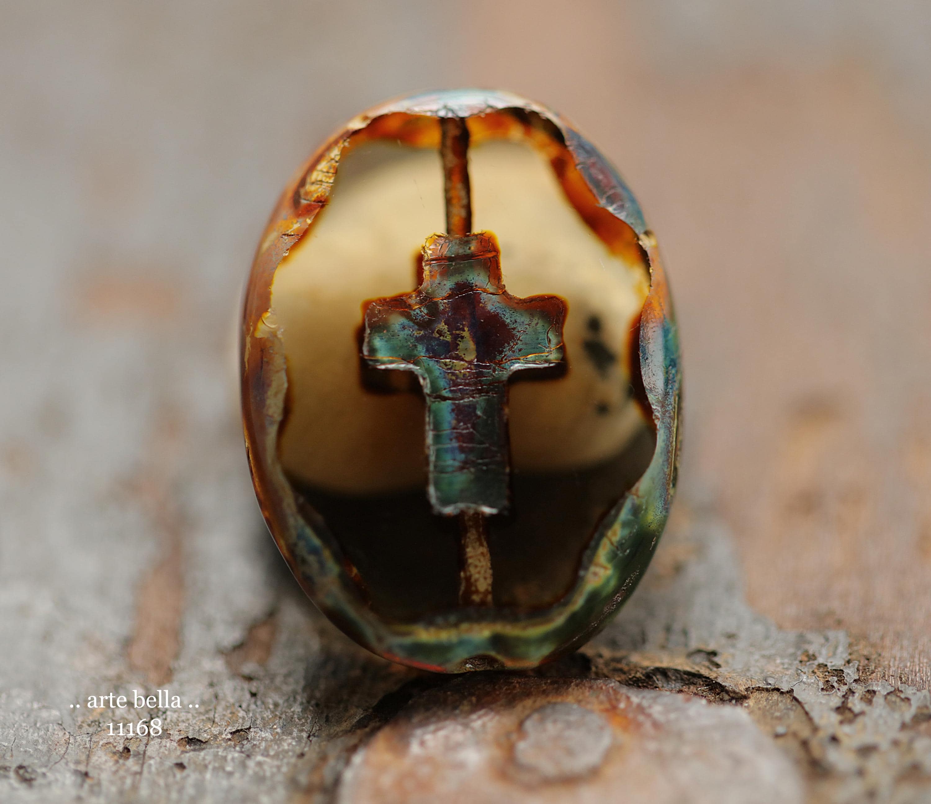 EARTHY FAWN CROSSES .. New 2 Premium Picasso Czech Glass Oval Cross Bead Mix 25x19mm (11168-2) .. jewelry making supplies